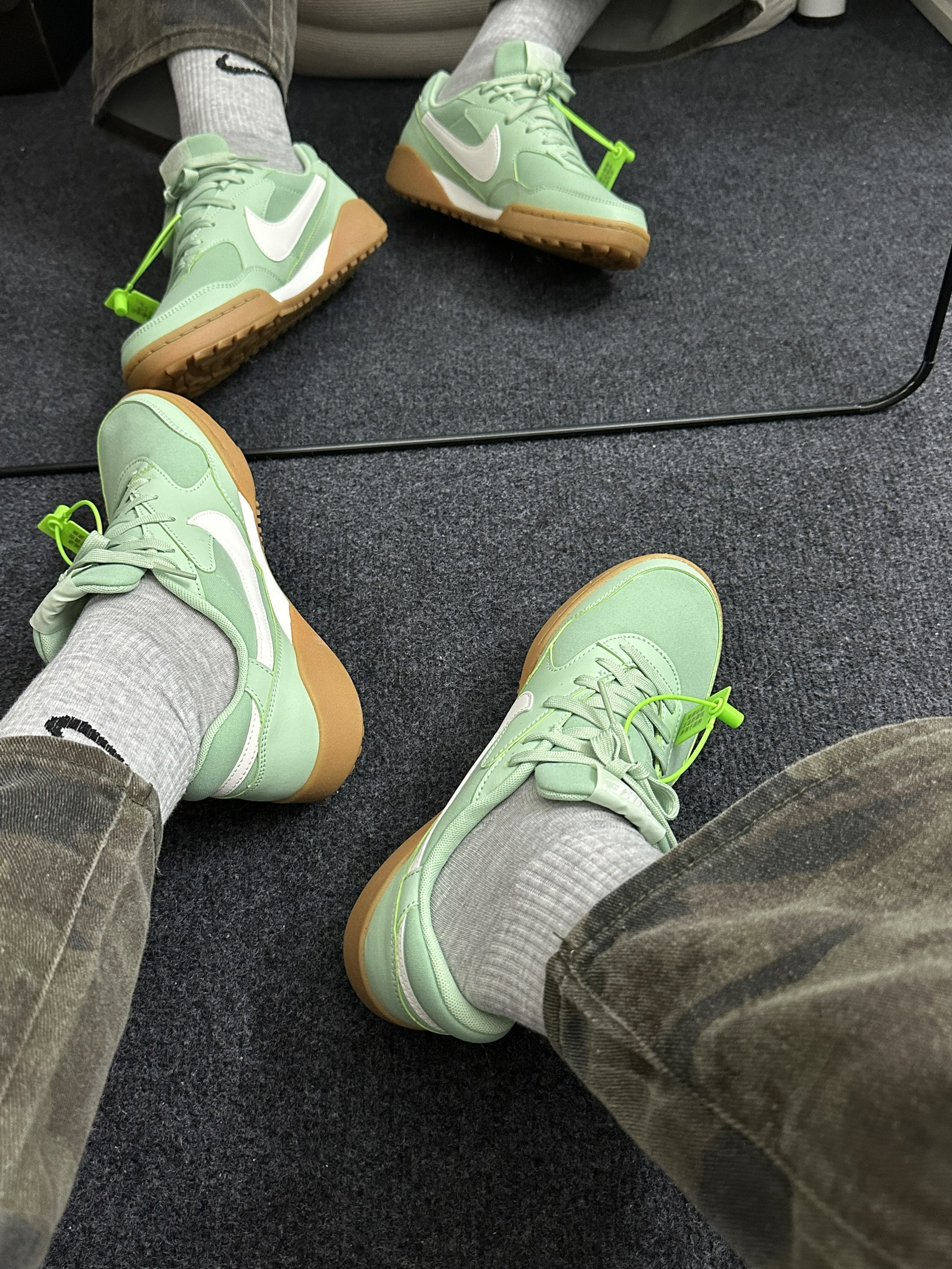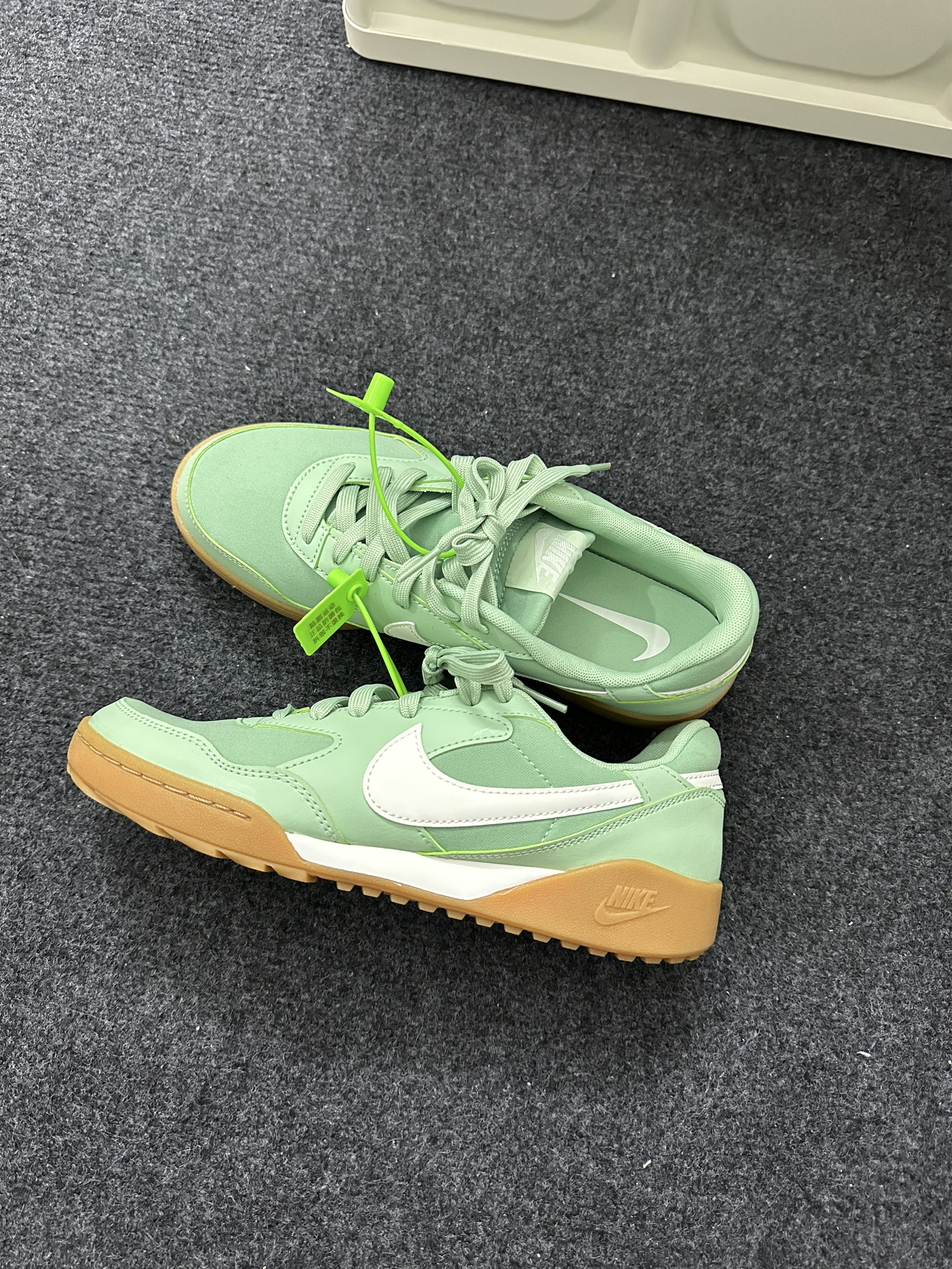 这双是Nike Air Max 1 薄荷绿复古跑鞋。 上脚脚感软弹,中底缓震舒服,久走不累;复古鞋型很显脚小,配色清新温柔,搭配工装裤、牛仔裤都很有氛围感,日常穿颜值和舒适度都在线。