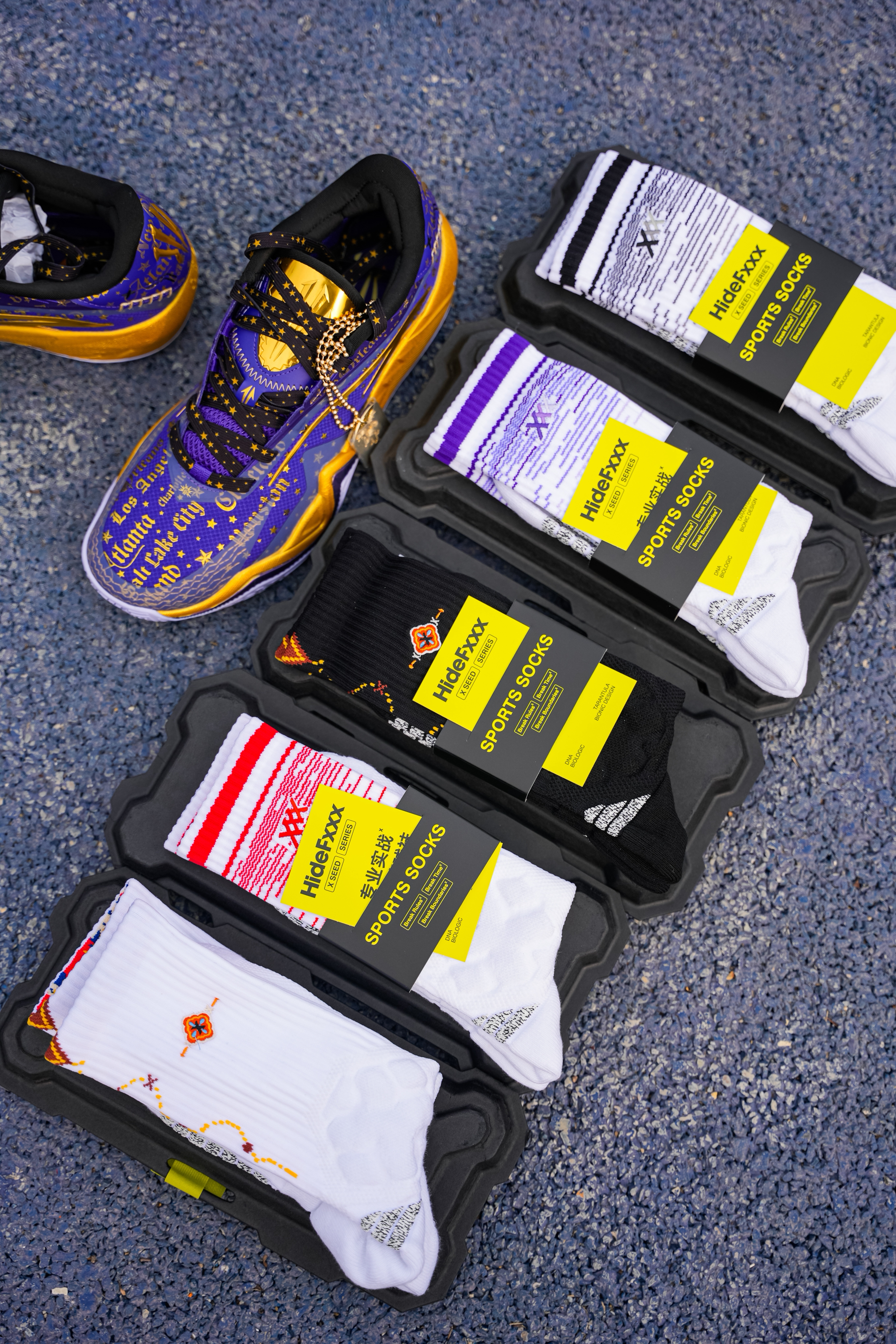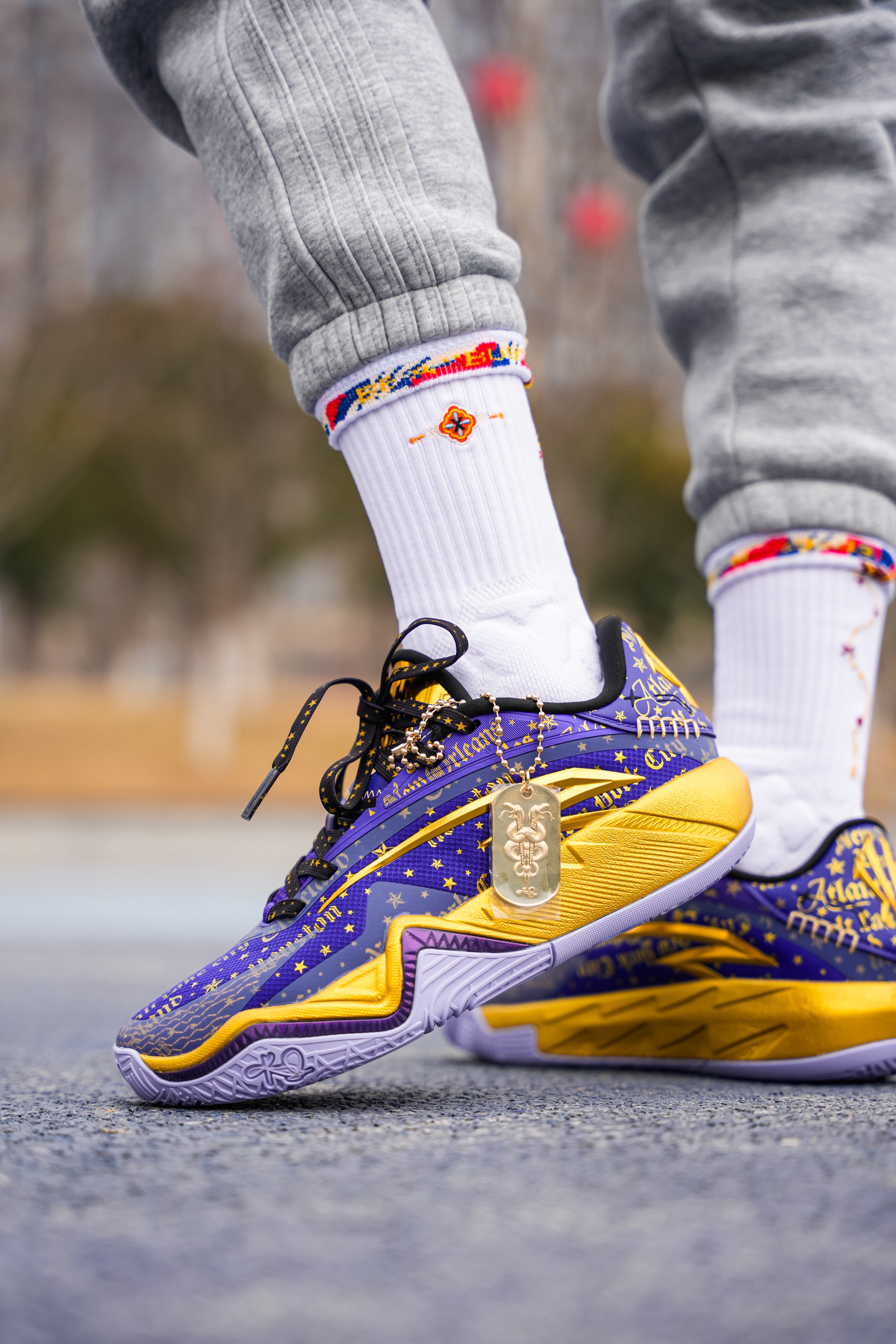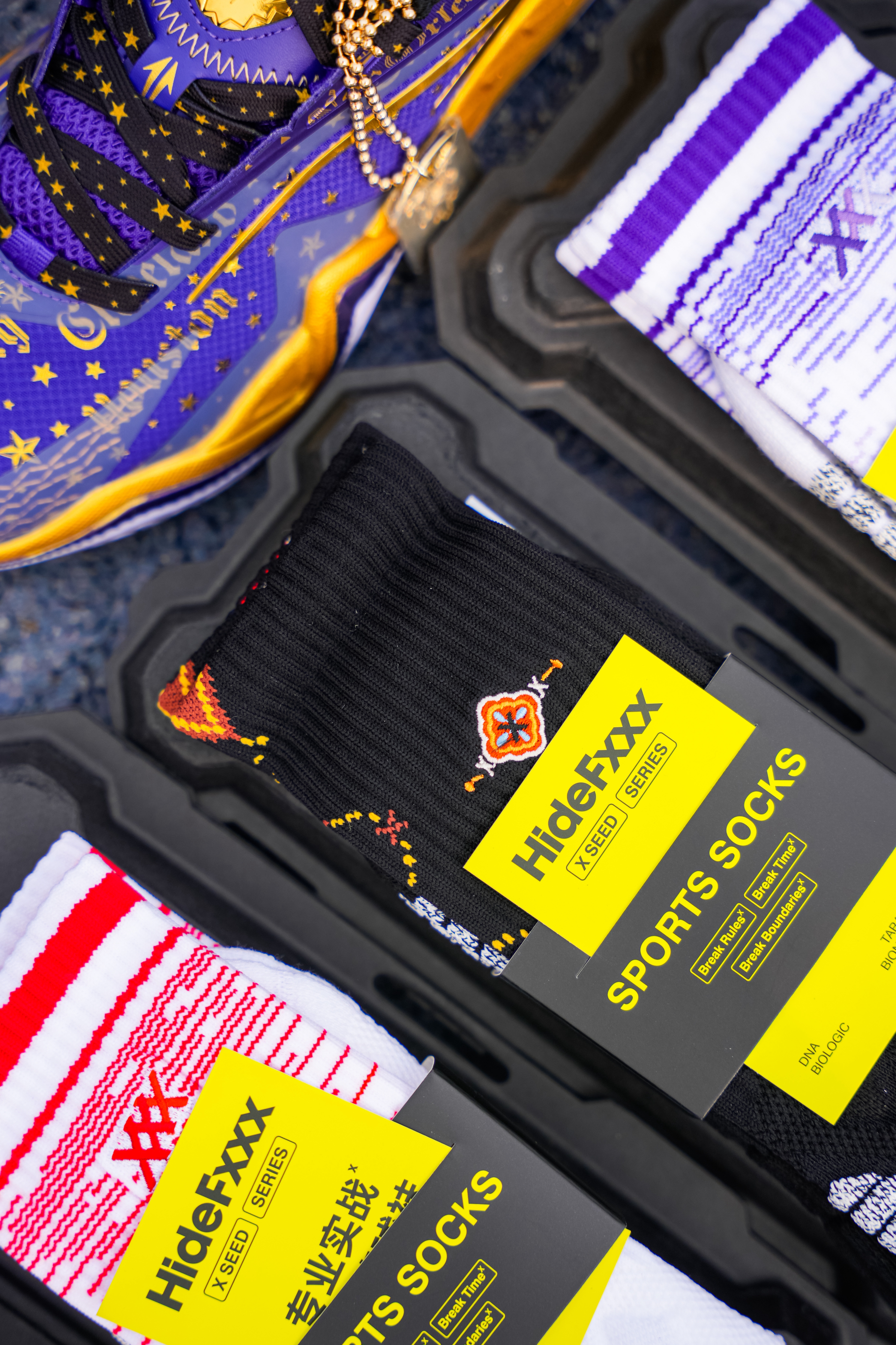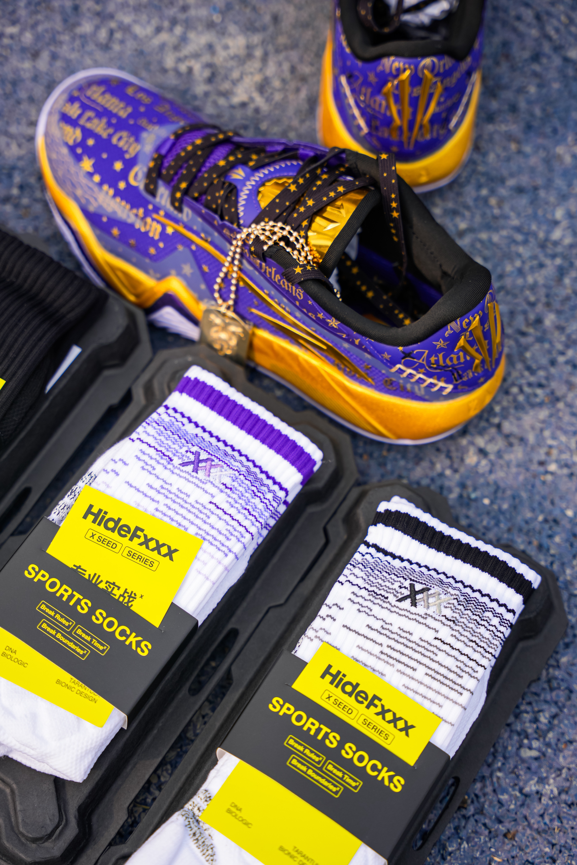 今天上脚这双是欧文三代的星际配色,也可以称为全明星,作为三代的第二个配色 紫金还是自带高级感的❗️ 配色整体以紫色为主,在每一场的的关键得分用了金色点缀,细节感满满! 在鞋盒 随鞋金属吊坠都有设计蛇元素,后跟的金色“盾牌”也是辨识度满满! 我这次是上脚Hidefxxx新品“丝绸之路”球袜,白红设计在新年上脚还是挺不错的,我感觉与这双还挺搭,有黑白两个颜色,质感以及上脚舒适度都可以!同时蓝魔限定球袜...