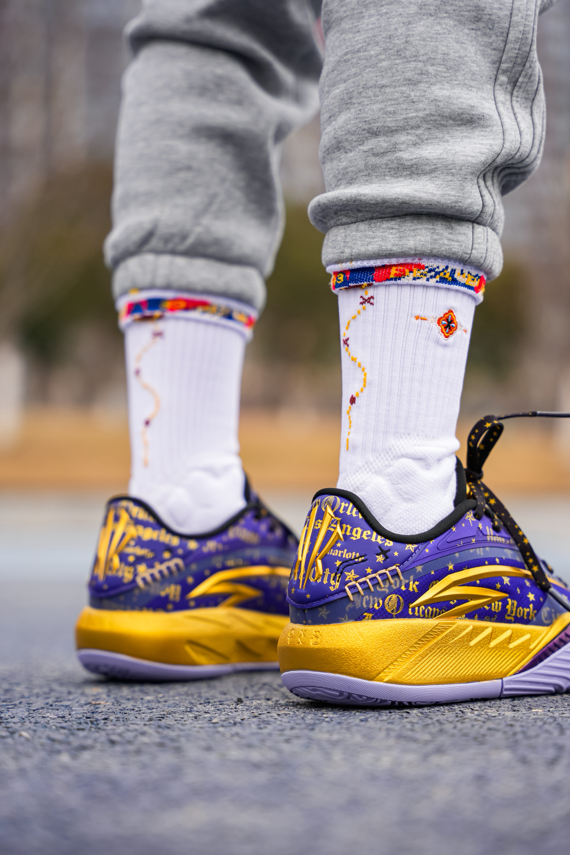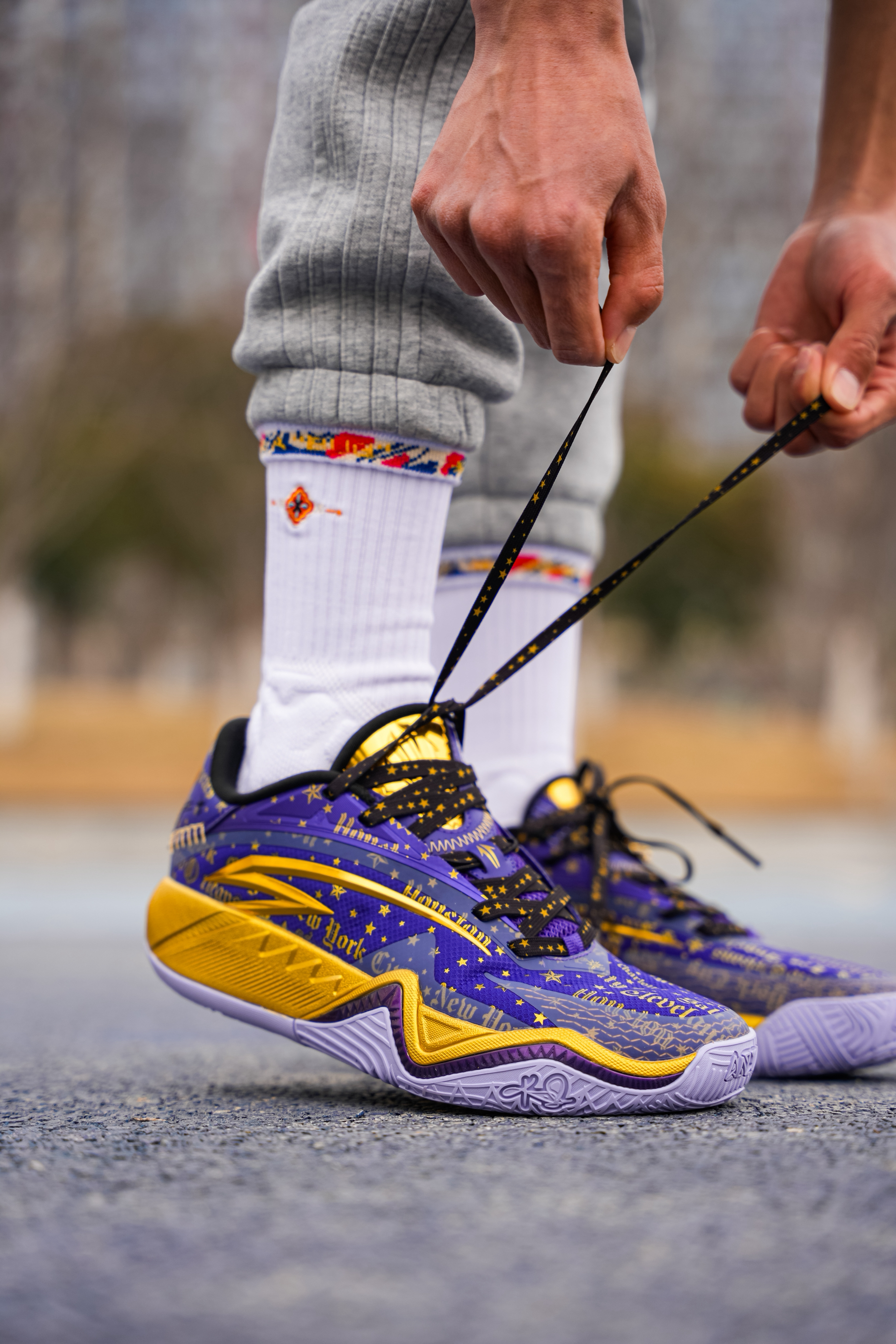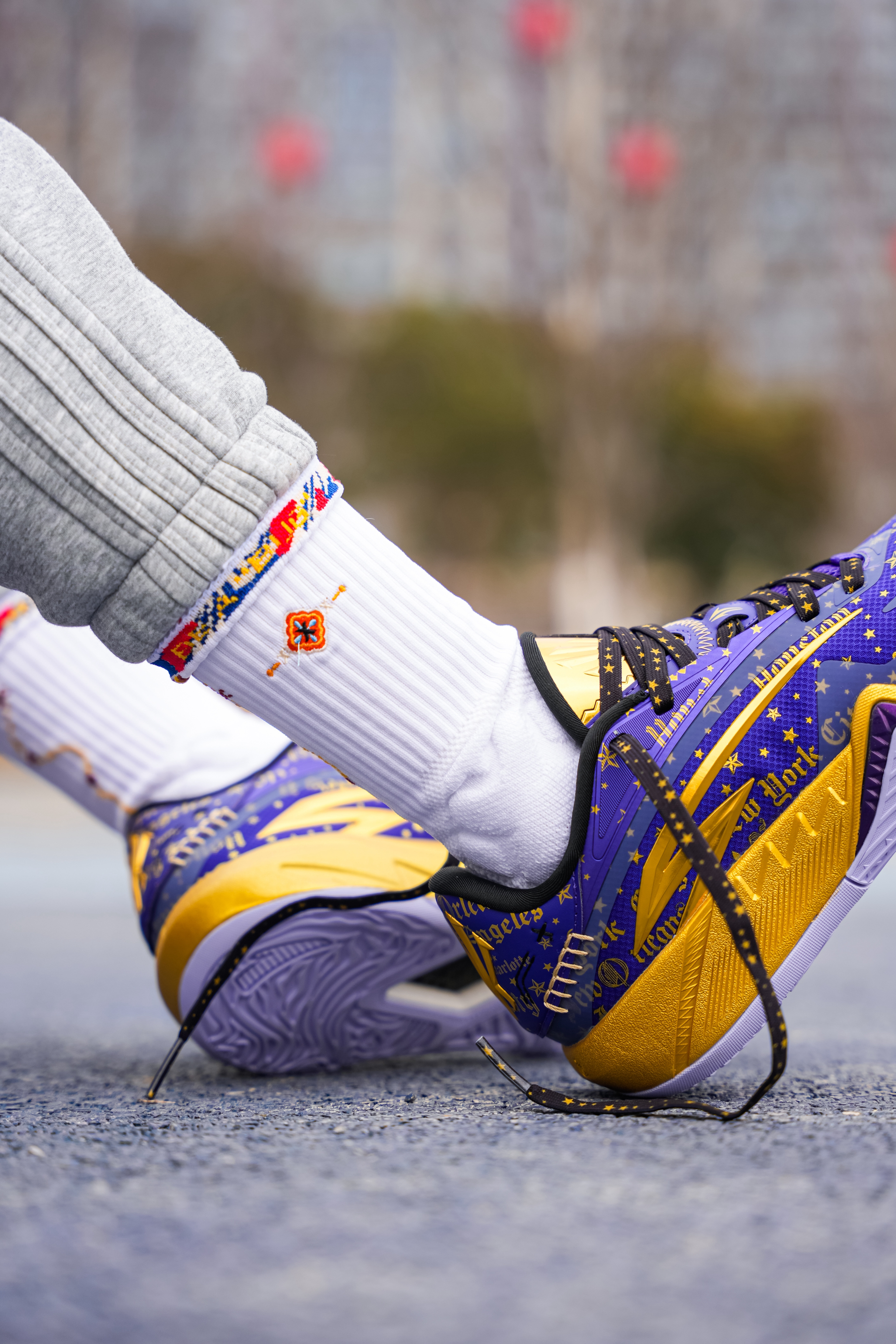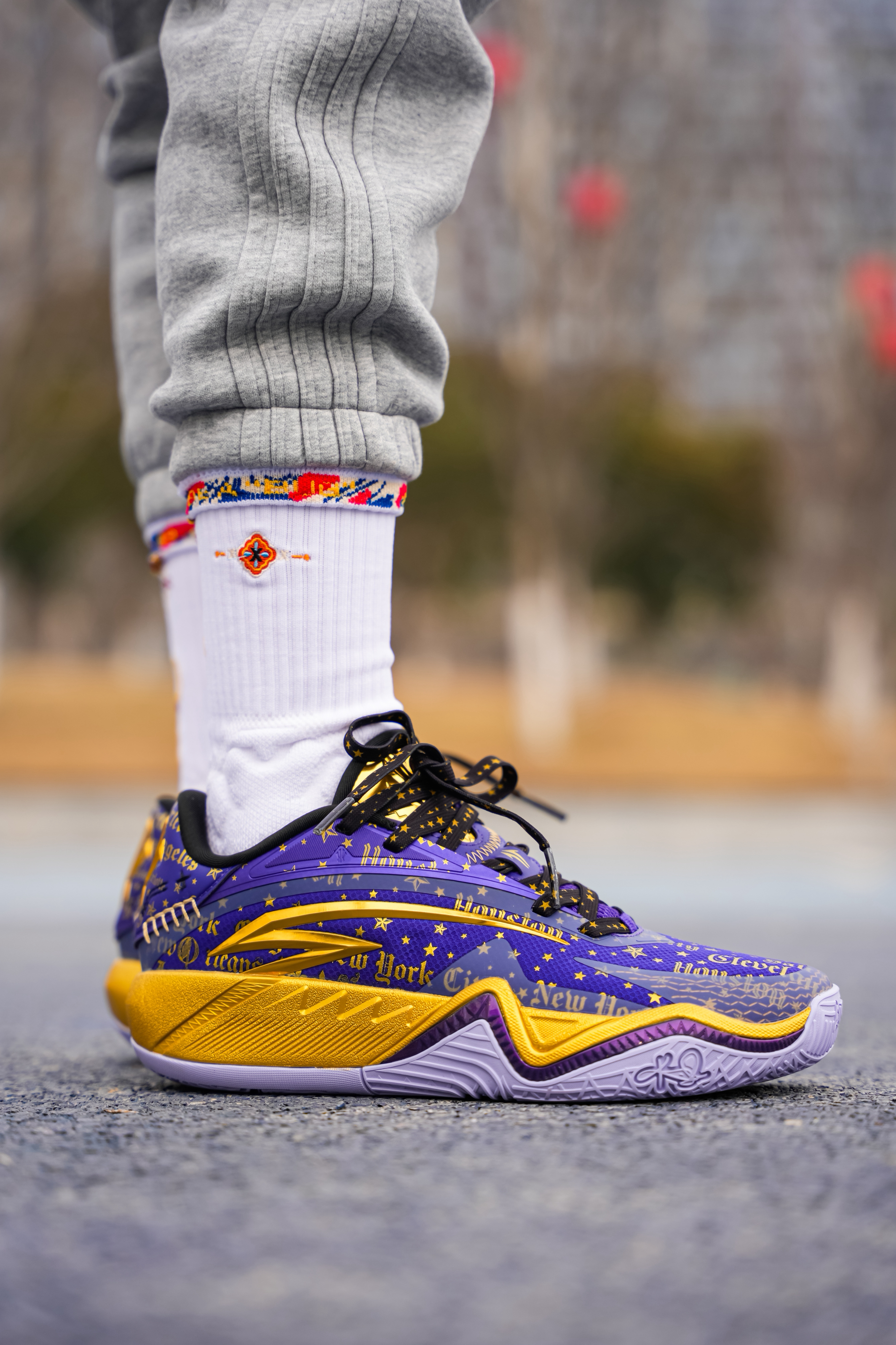 今天上脚这双是欧文三代的星际配色,也可以称为全明星,作为三代的第二个配色 紫金还是自带高级感的❗️ 配色整体以紫色为主,在每一场的的关键得分用了金色点缀,细节感满满! 在鞋盒 随鞋金属吊坠都有设计蛇元素,后跟的金色“盾牌”也是辨识度满满! 我这次是上脚Hidefxxx新品“丝绸之路”球袜,白红设计在新年上脚还是挺不错的,我感觉与这双还挺搭,有黑白两个颜色,质感以及上脚舒适度都可以!同时蓝魔限定球袜...