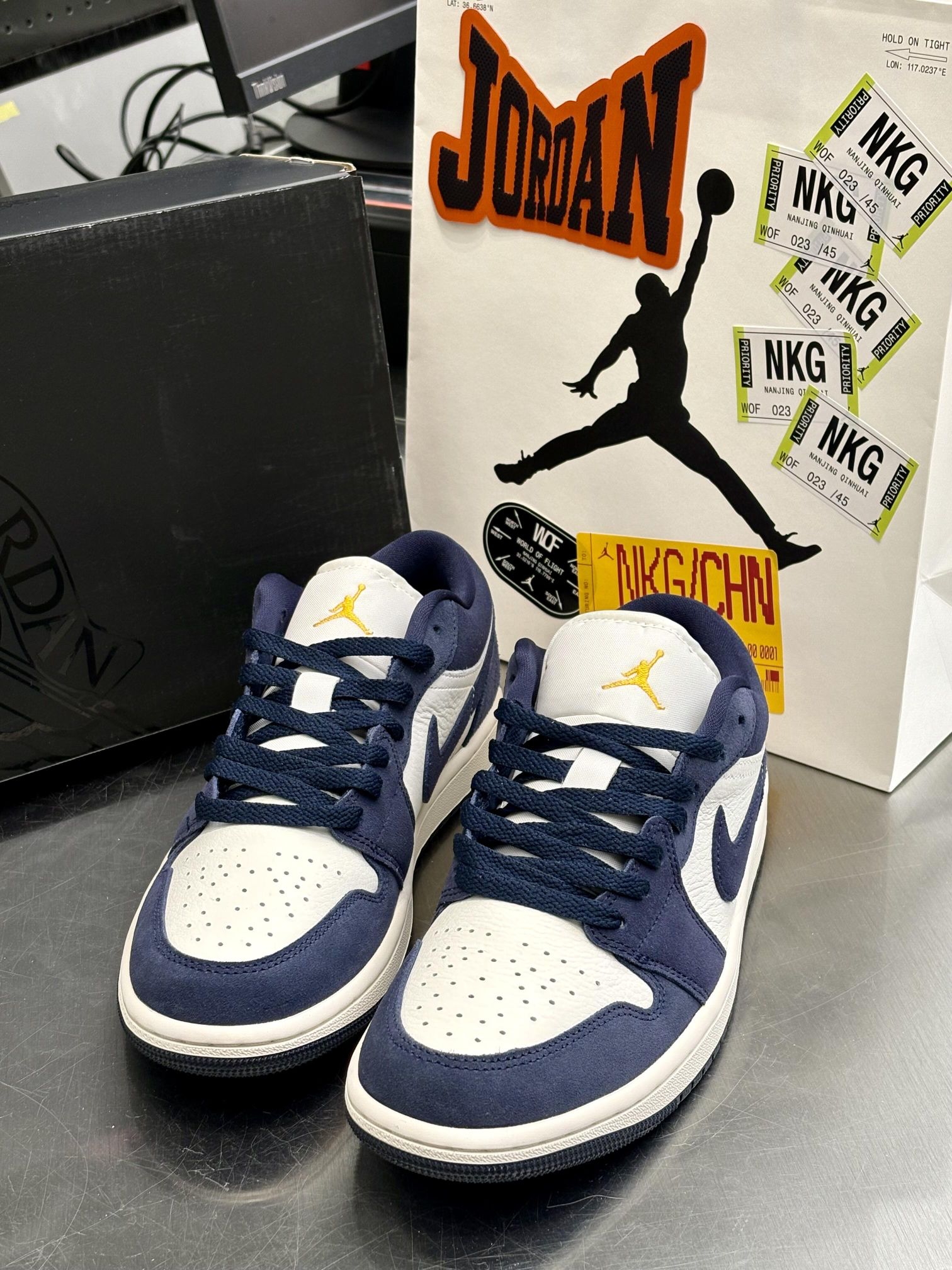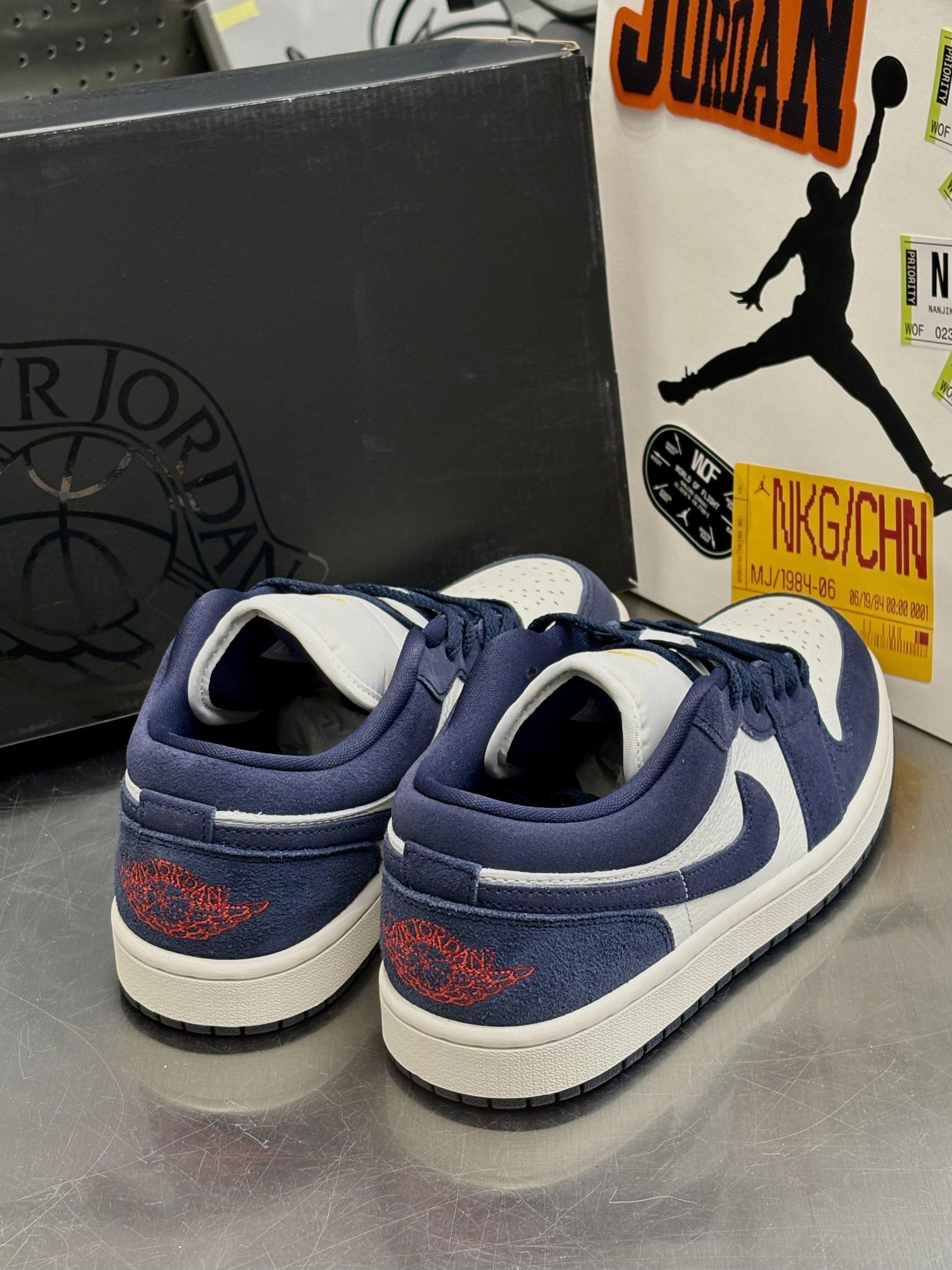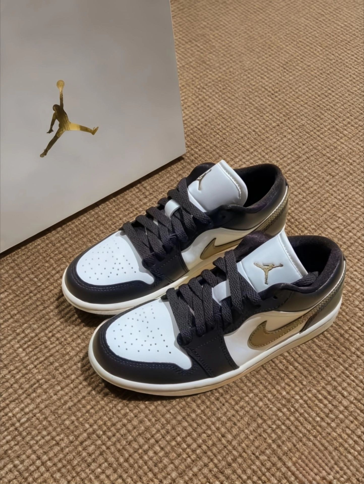🟦🟨这双AJ1 Low 藏蓝金,戳中复古心巴💘 AJ1 Low 藏蓝金真的把复古氛围感拉满了! ✅ 颜值细节 • 藏蓝色麂皮+白色荔枝纹皮革拼接,质感直接拉满 • 鞋舌上的金色飞人Logo点缀,低调又精致 • 配色干净又高级,不管是牛仔裤还是运动裤都能搭出松弛感 ✅ 脚感体验 • 低帮设计对脚踝超友好,日常走路、通勤都不累 • 经典Air Sole气垫,缓震够用,复古和实用我全都要! 🔖 搭配灵...