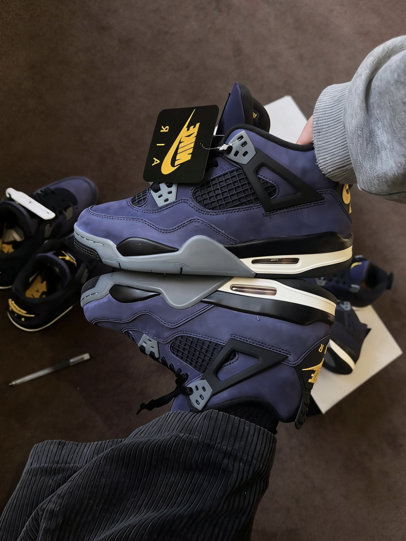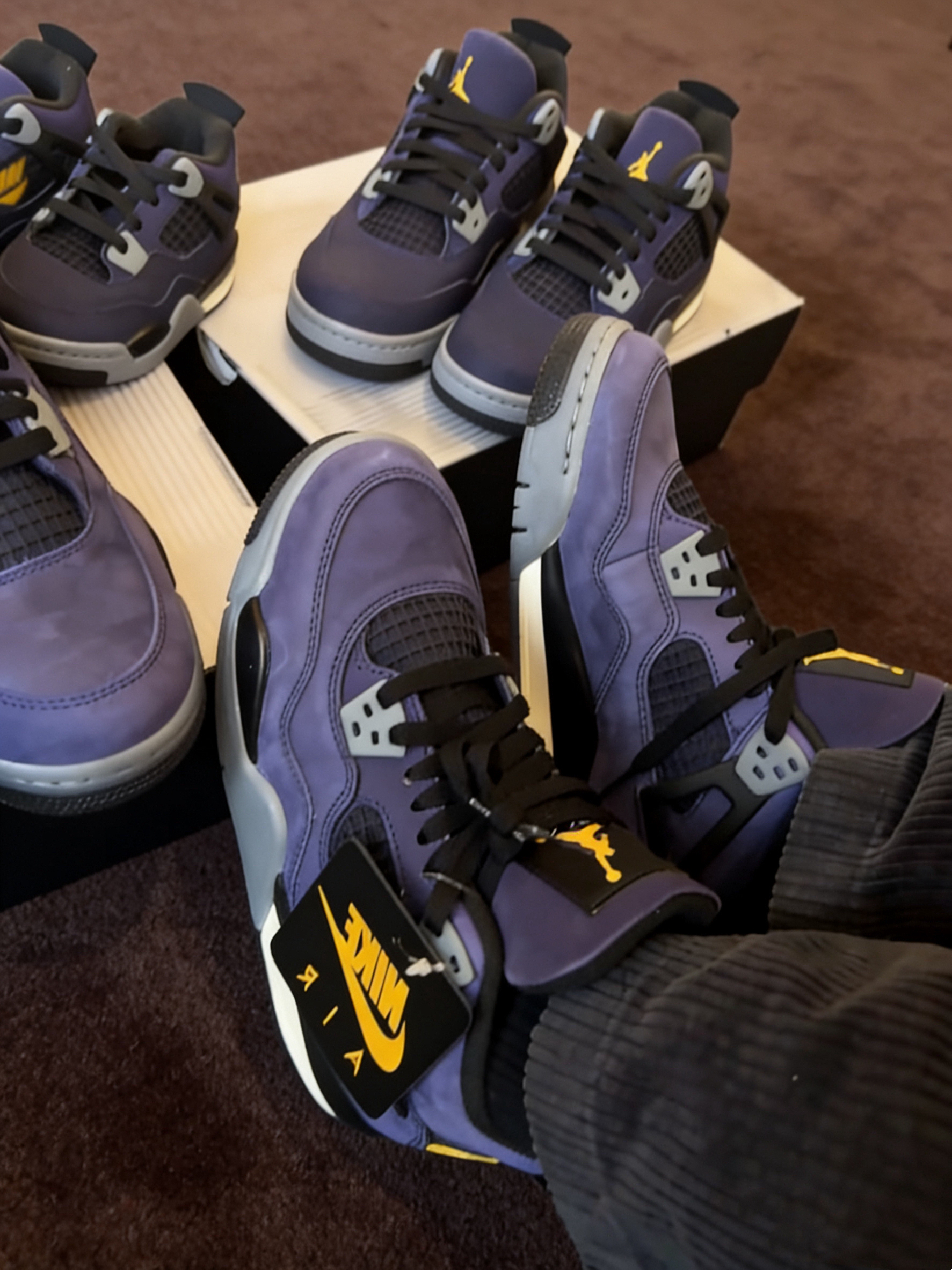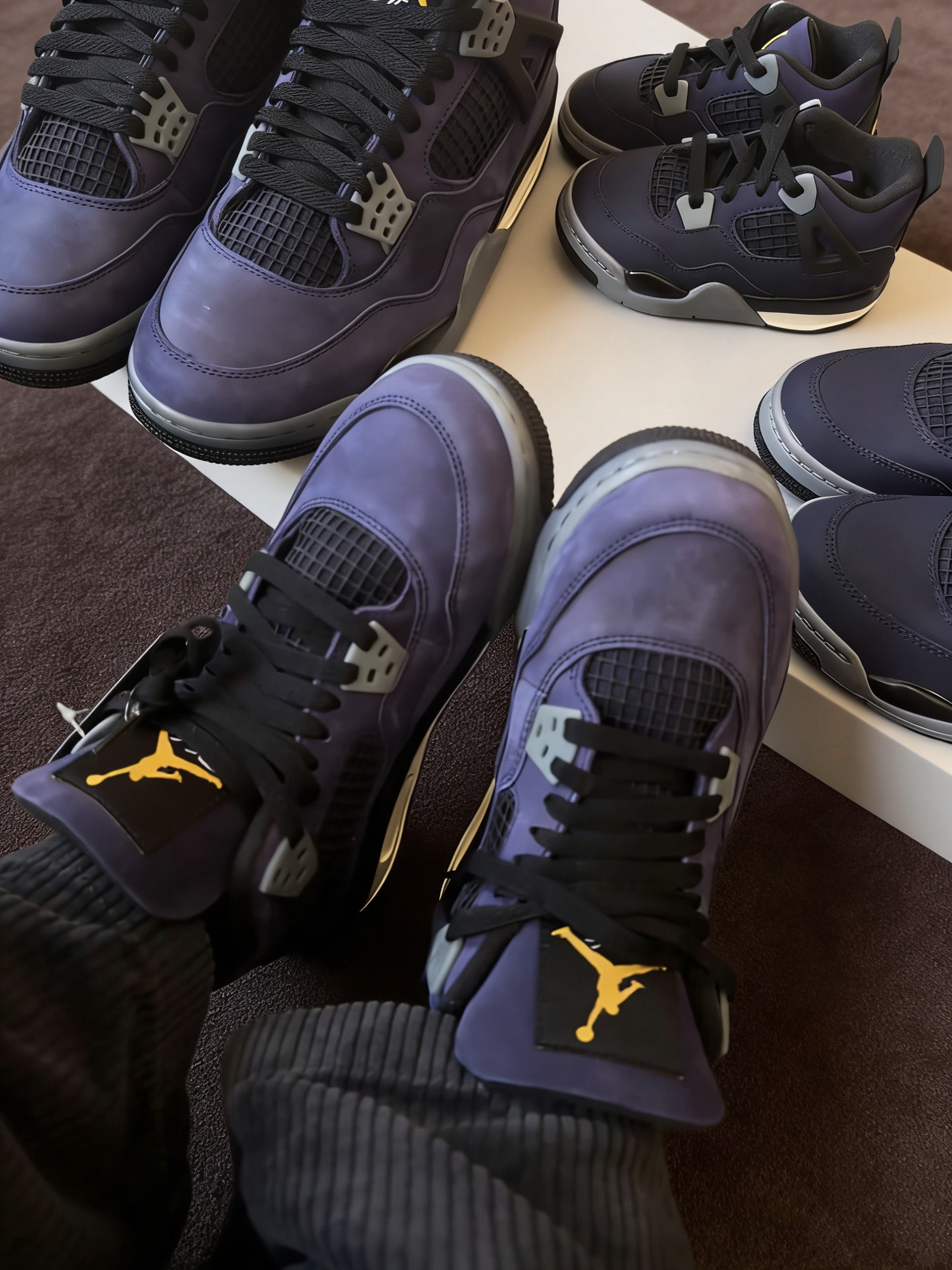 整鞋大面积采用细腻的深紫色麂皮材质,摸上去绒感十足,完全没有廉价感,上脚自带显贵buff,低调又藏不住的高级感直接拉满。正到极致的帝王紫调,不挑皮不挑性别,男生上脚气场拉满,女生搭甜酷风也毫无违和感。经典的AJ4鞋型轮廓硬朗利落,黑色网眼格栅、浅灰鞋带孔点缀恰到好处,后跟亮眼的黄色飞人logo打破沉闷,再加上半透明的水晶外底收尾,整体配色层次分明,复古氛围感直接拉满,不管是拿在手里细看质感,还是上...