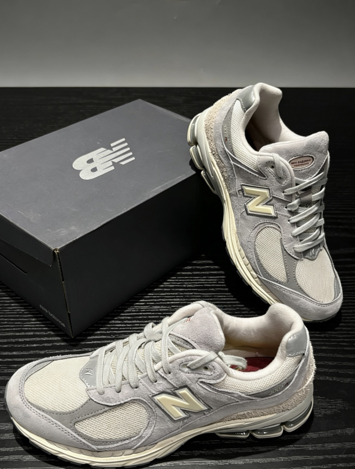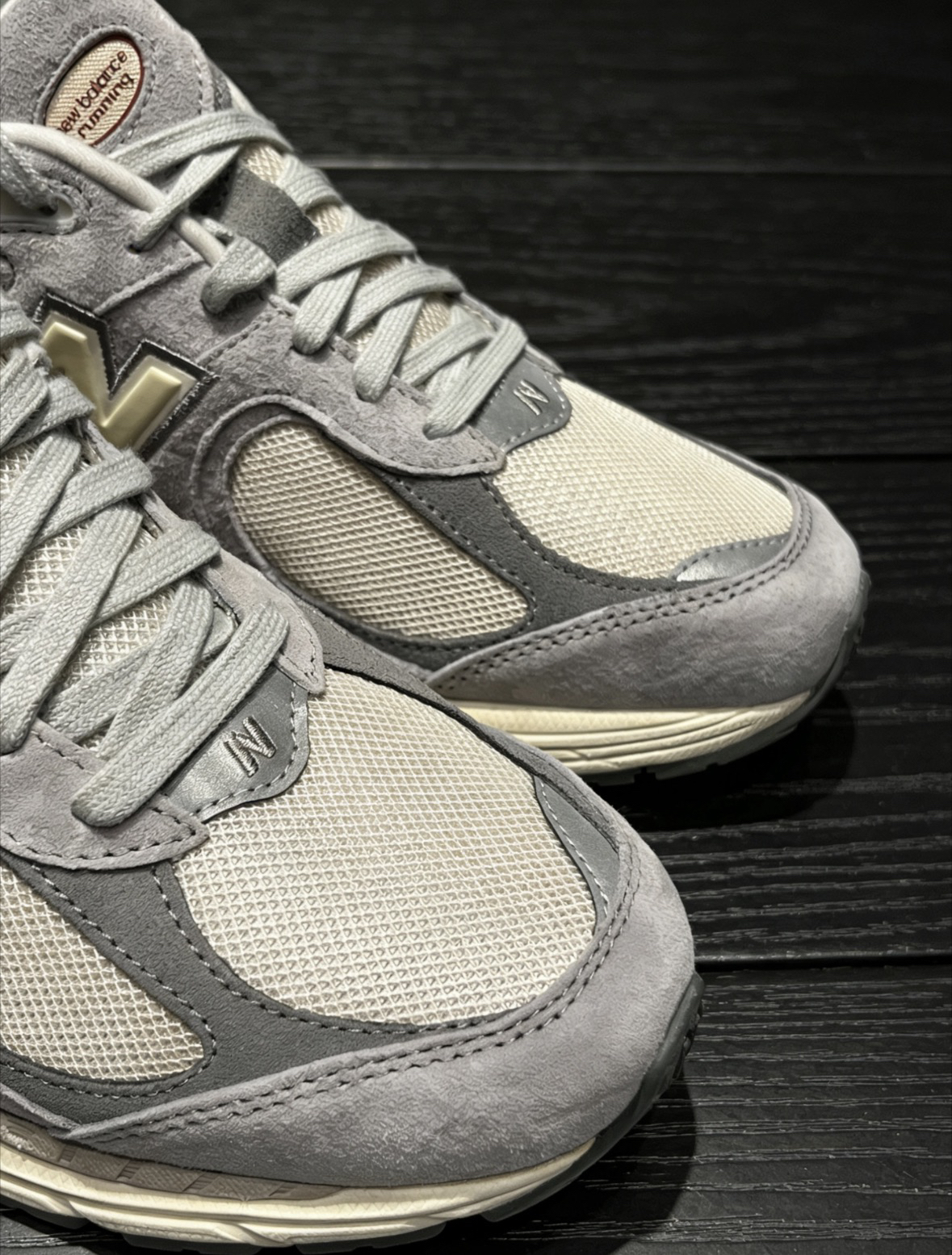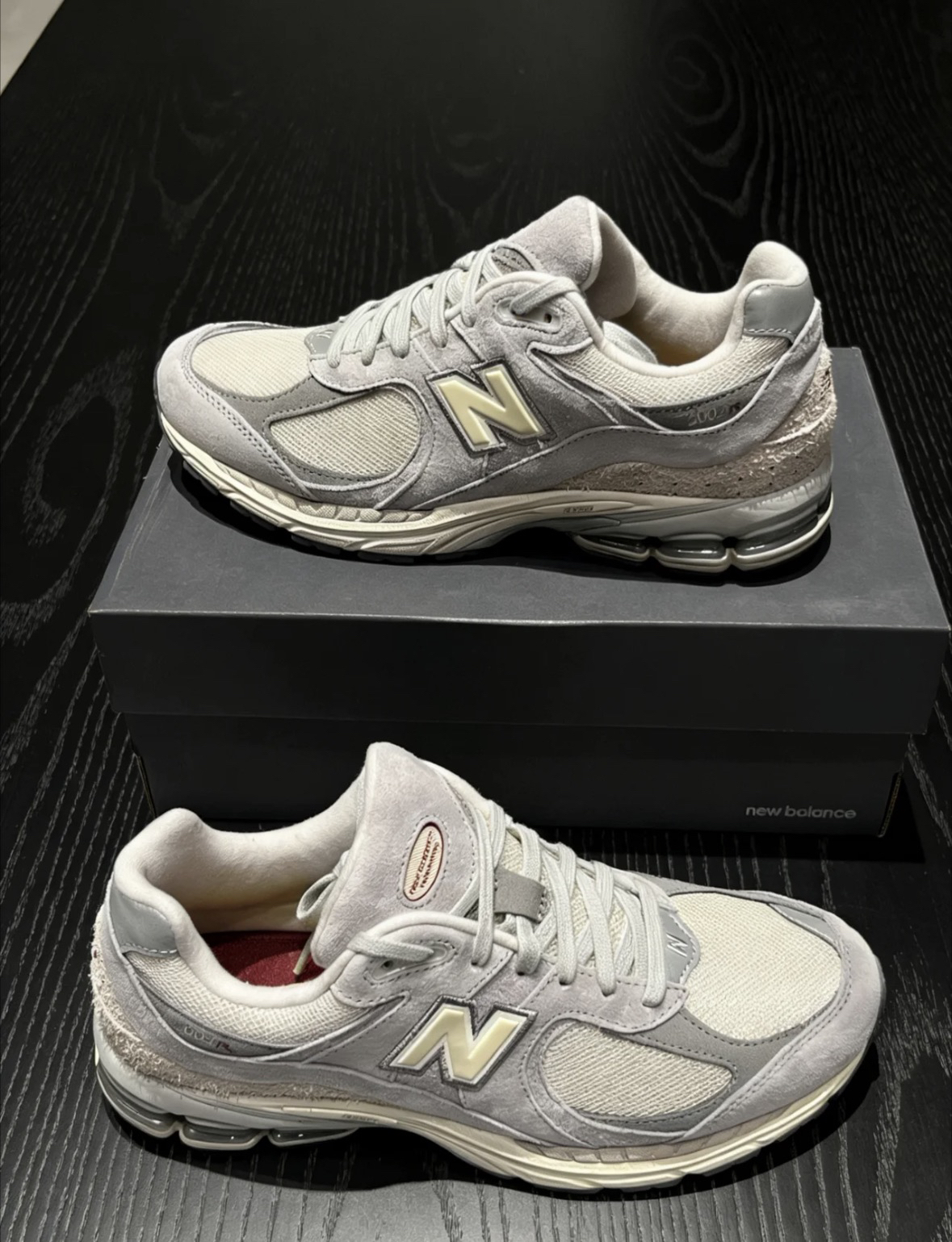 NB 2002R这鞋型确实经典,怎么搭都好看,让你出门首选,这双浅米灰配色看着很干净,也没什么攻击性。鞋面是麂皮拼网眼的🌴,摸起来质感不错,透气也在线。中底有缓震设计,平时穿出去逛街压马路走久了也不累脚。随便搭条卫裤或者牛仔裤,复古感一下就出来了,过年穿这双既舒服又有面儿!👟☁️