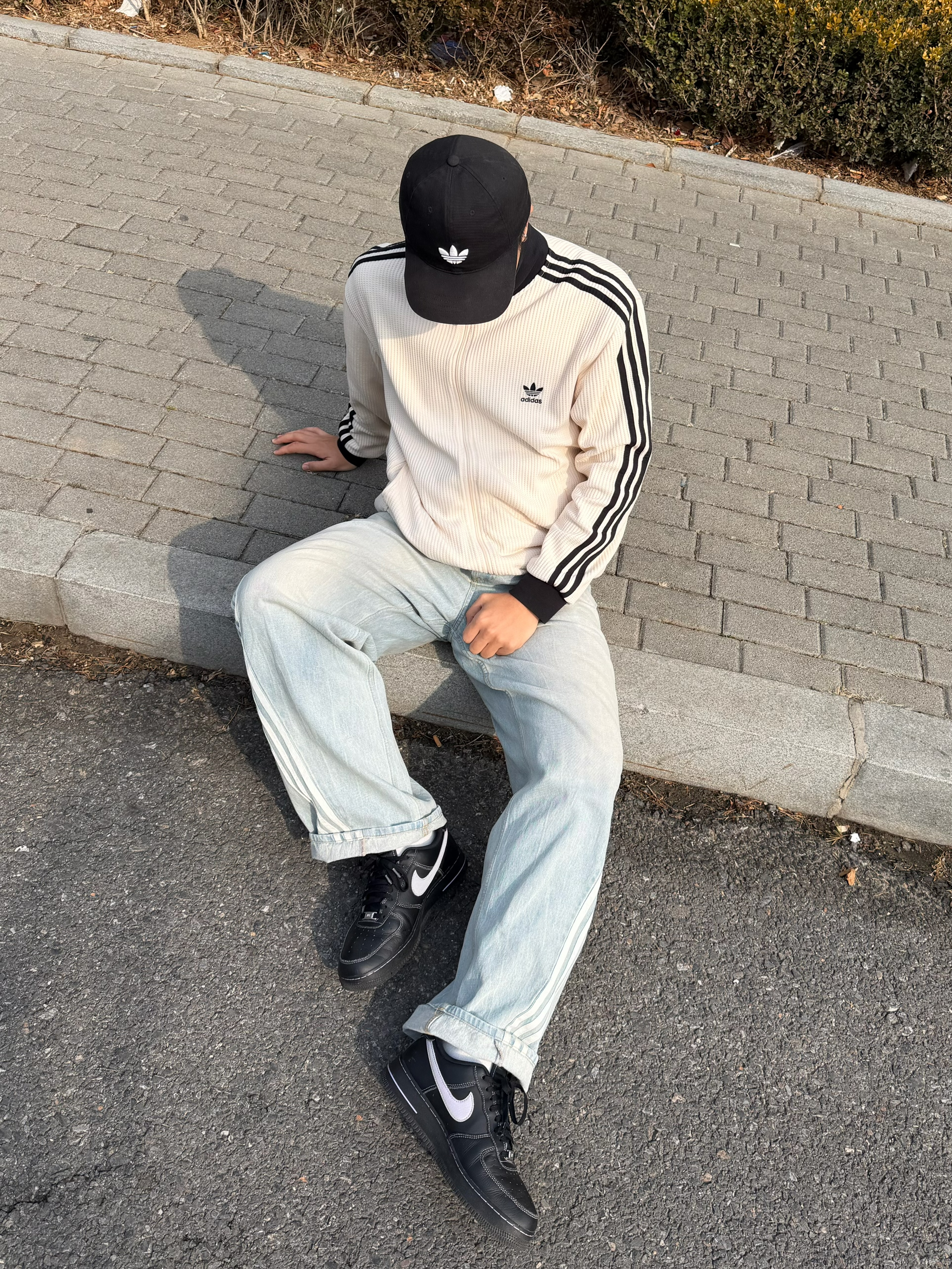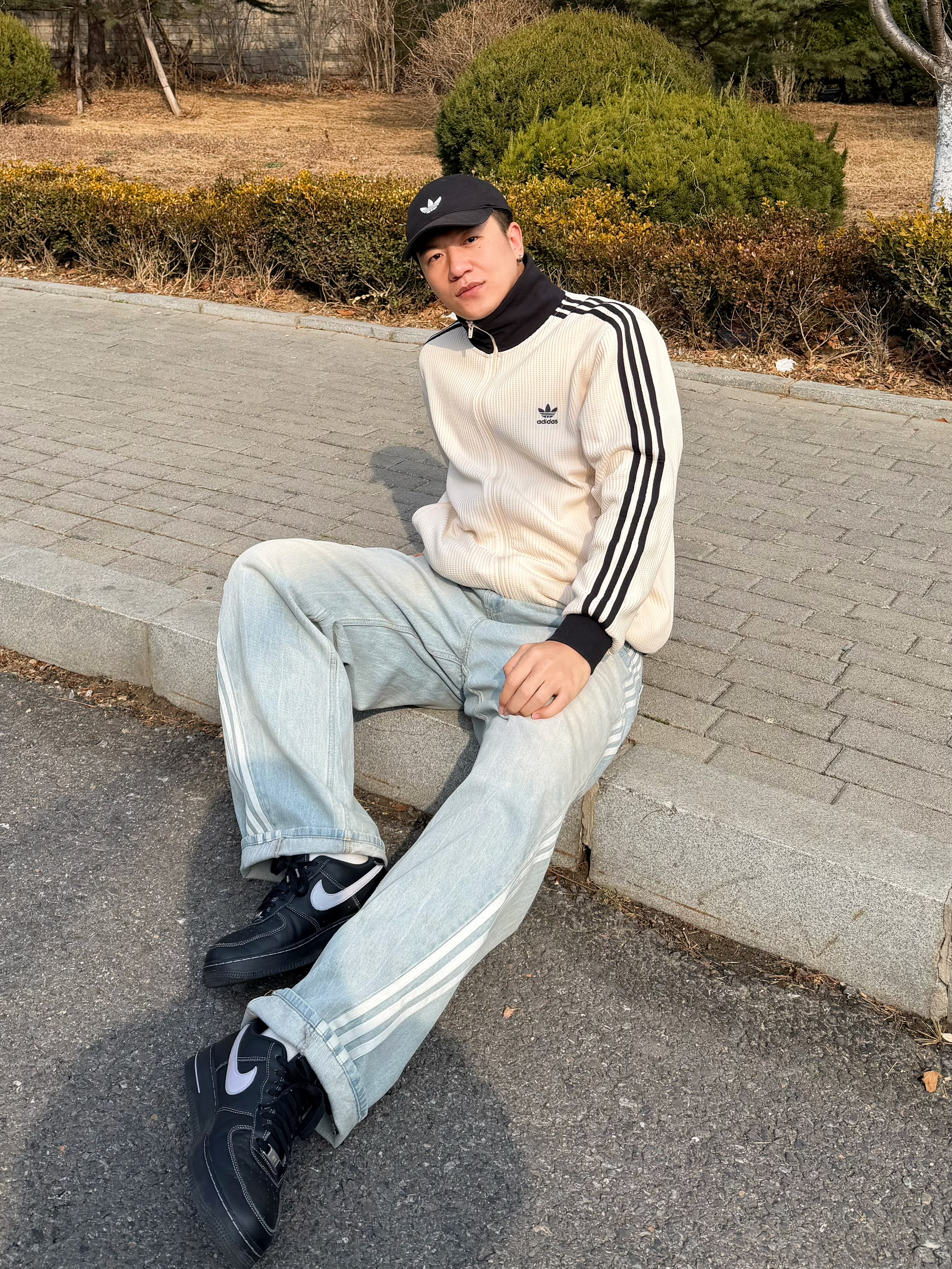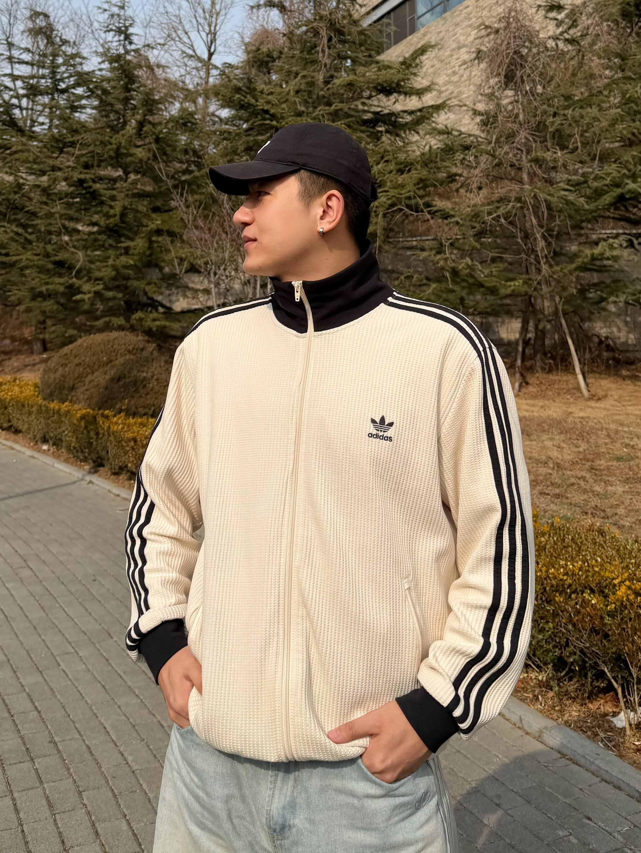 不用叠穿那么麻烦🧥 我直接套上这件阿迪华夫格 黑色立领干净利落 奇妙白耐看又百搭 搭配浅蓝牛仔 宽松慵懒感拿捏住了👖 脚上踩双黑板鞋 整体就是舒服又精神 个人感觉这一身 早春出门刚好 不冷也不闷 刚刚好的温度🌤️