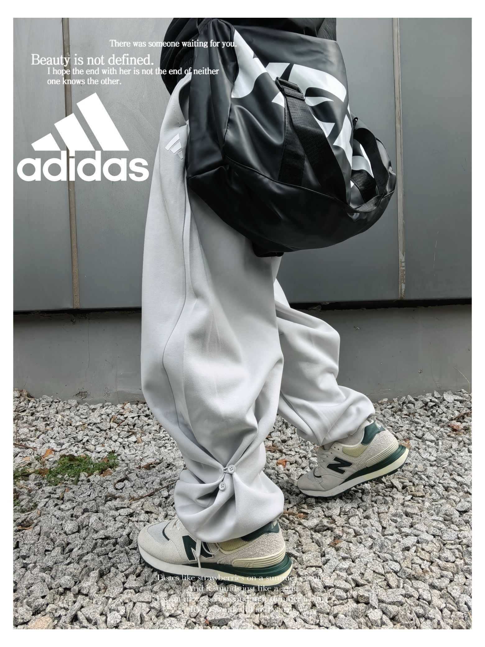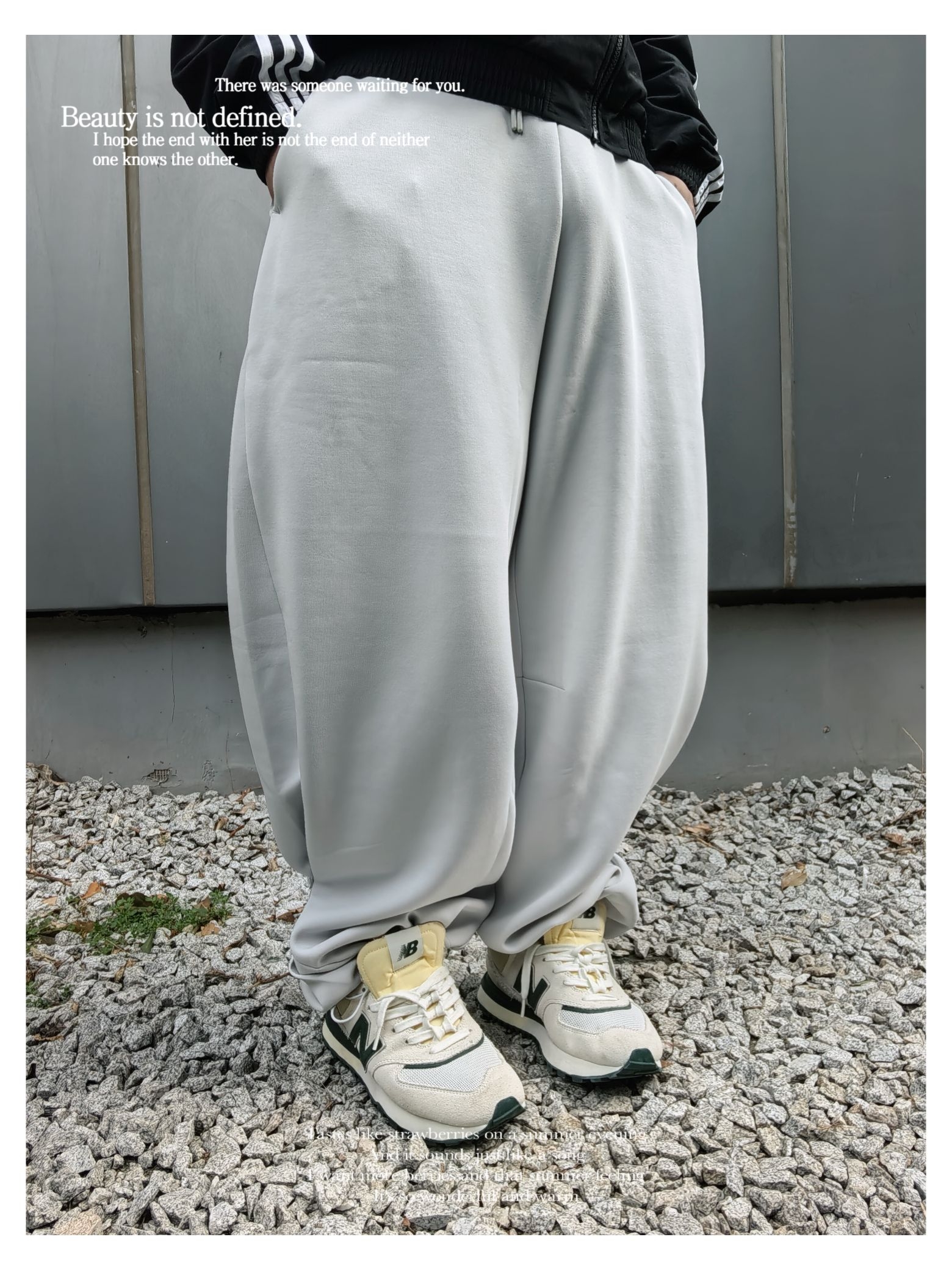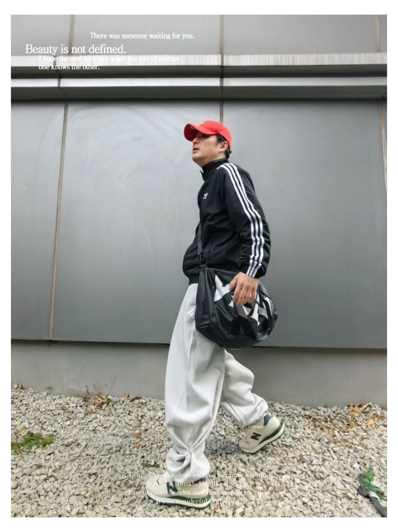 时髦 休闲运动风 通勤出街穿搭 上衣:黑色系 adidas 明星同款 立领条纹logo 开衫休闲夹克 下装:纯色系 adidas 宽松运动裤 鞋子:nb574复古休闲跑鞋