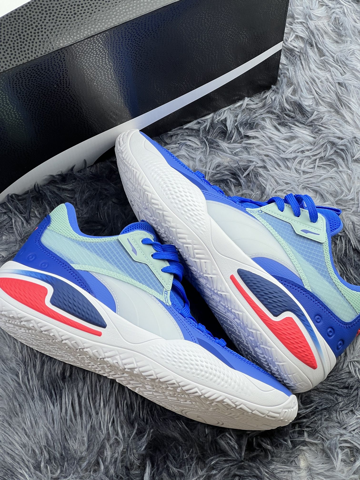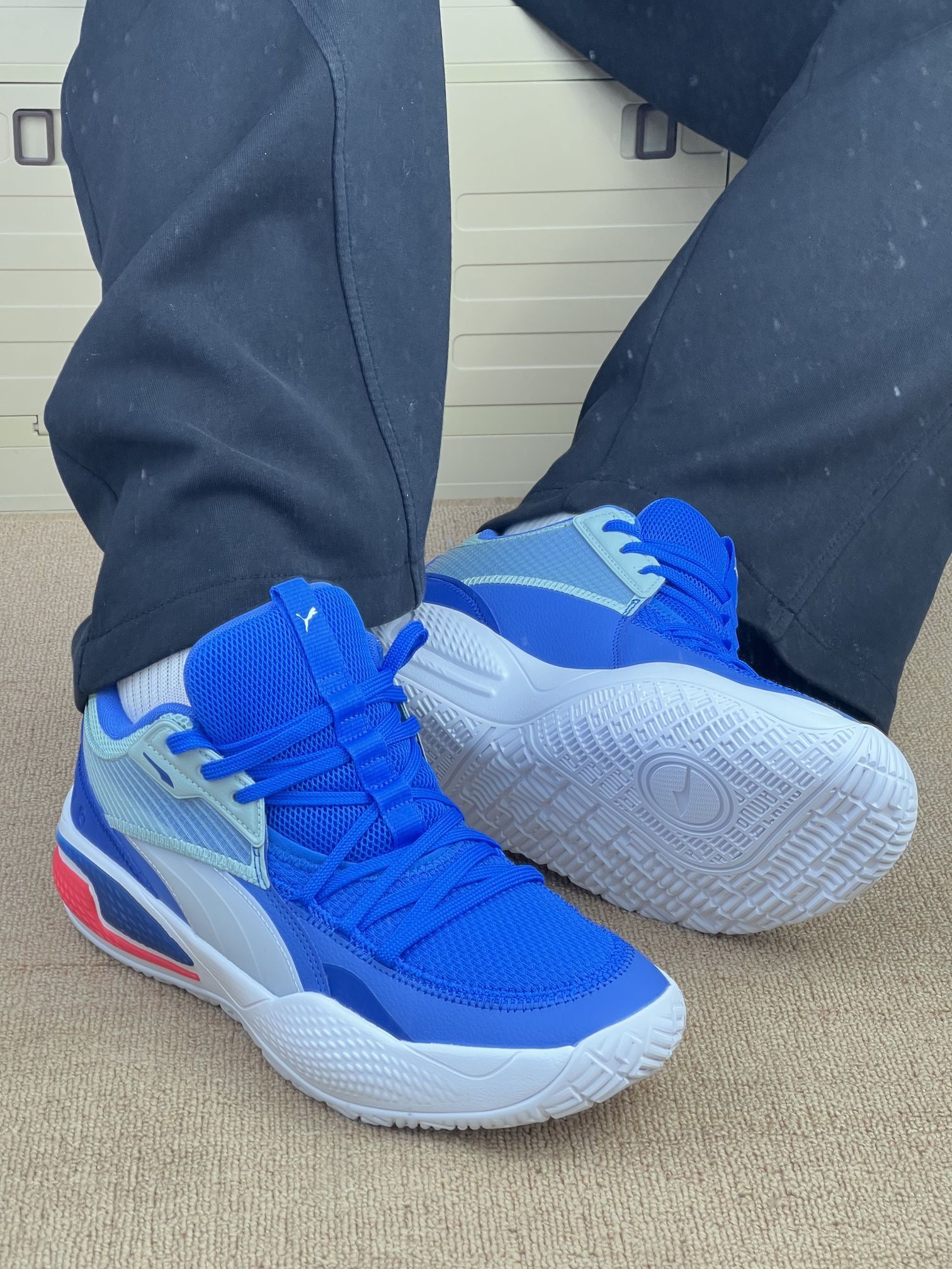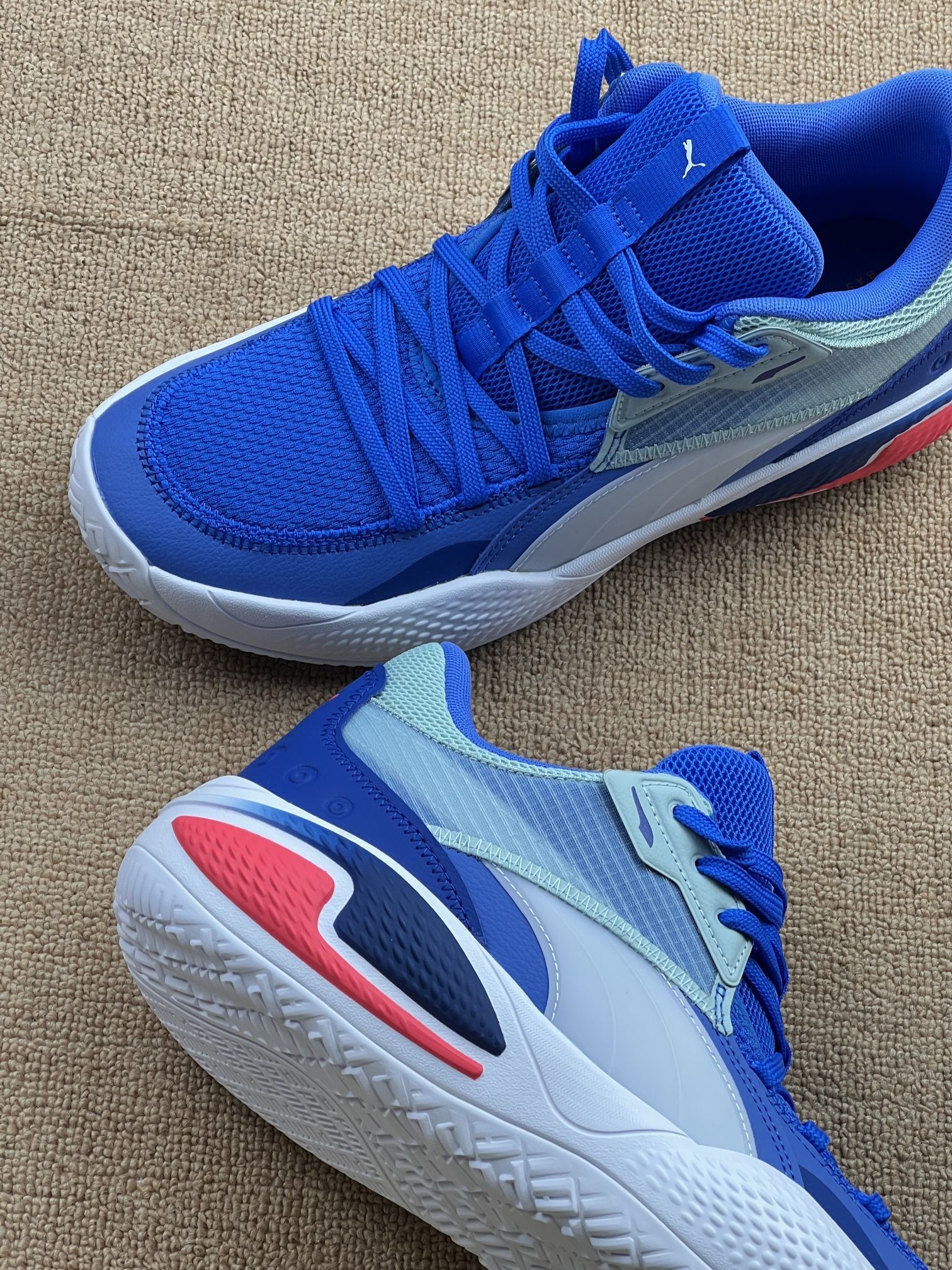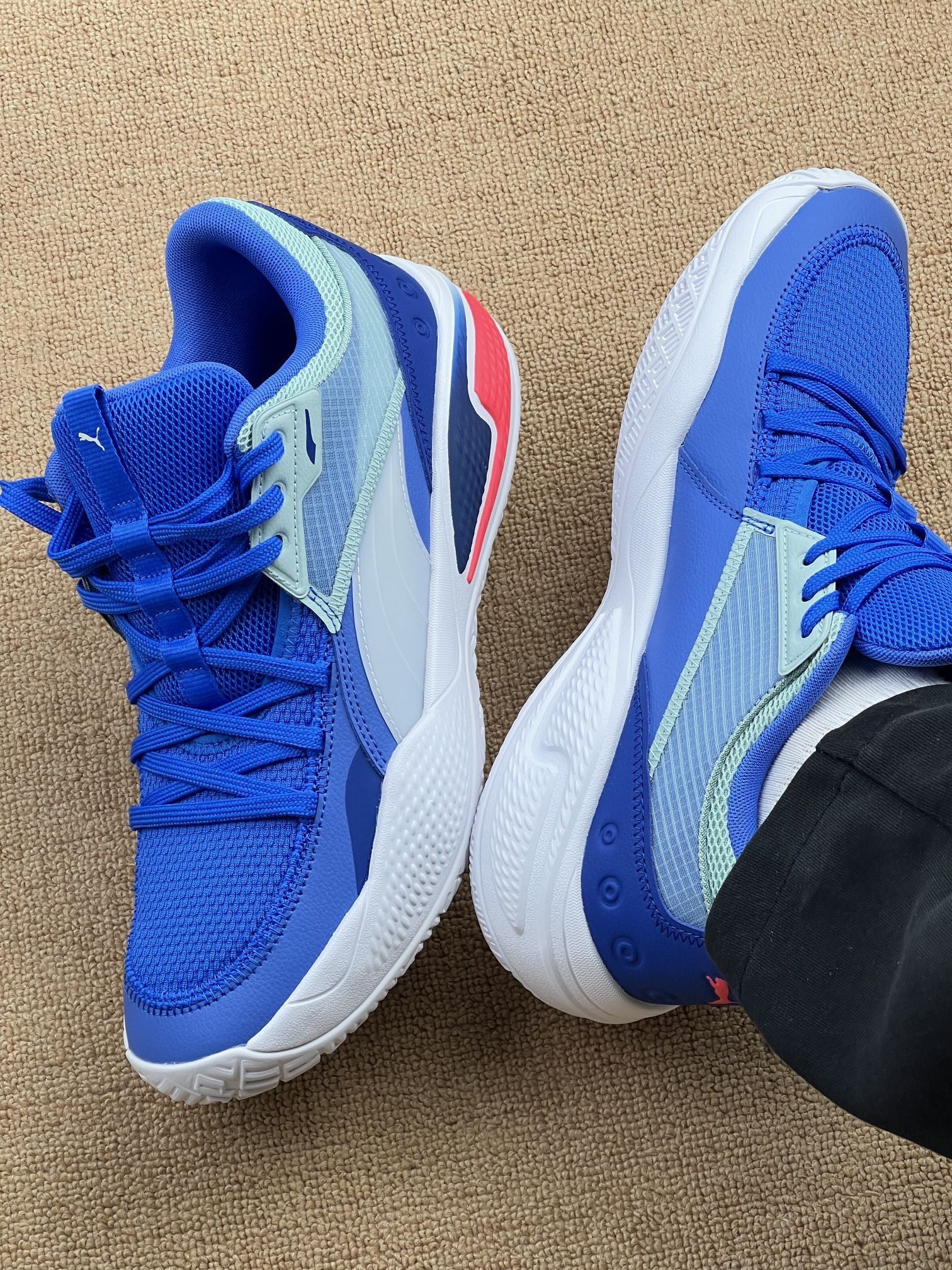 这双蓝绿拼色的PUMA球鞋到手第一感觉是配色很清爽,上脚脚感偏软,日常压马路或者轻度活动都挺舒服,网面材质透气性也不错,不会闷脚。 但也有明显缺点:鞋帮处的支撑感一般,做大幅度变向时稳定性稍欠缺;后跟的红色装饰虽然亮眼,但材质偏硬,长时间走路会有点磨脚踝;中底的回弹速度偏慢,打高强度运动时能明显感觉到拖沓。 整体来说,日常穿搭和休闲走路很合适,想用来实战打球的话,这些缺点会比较影响体验。