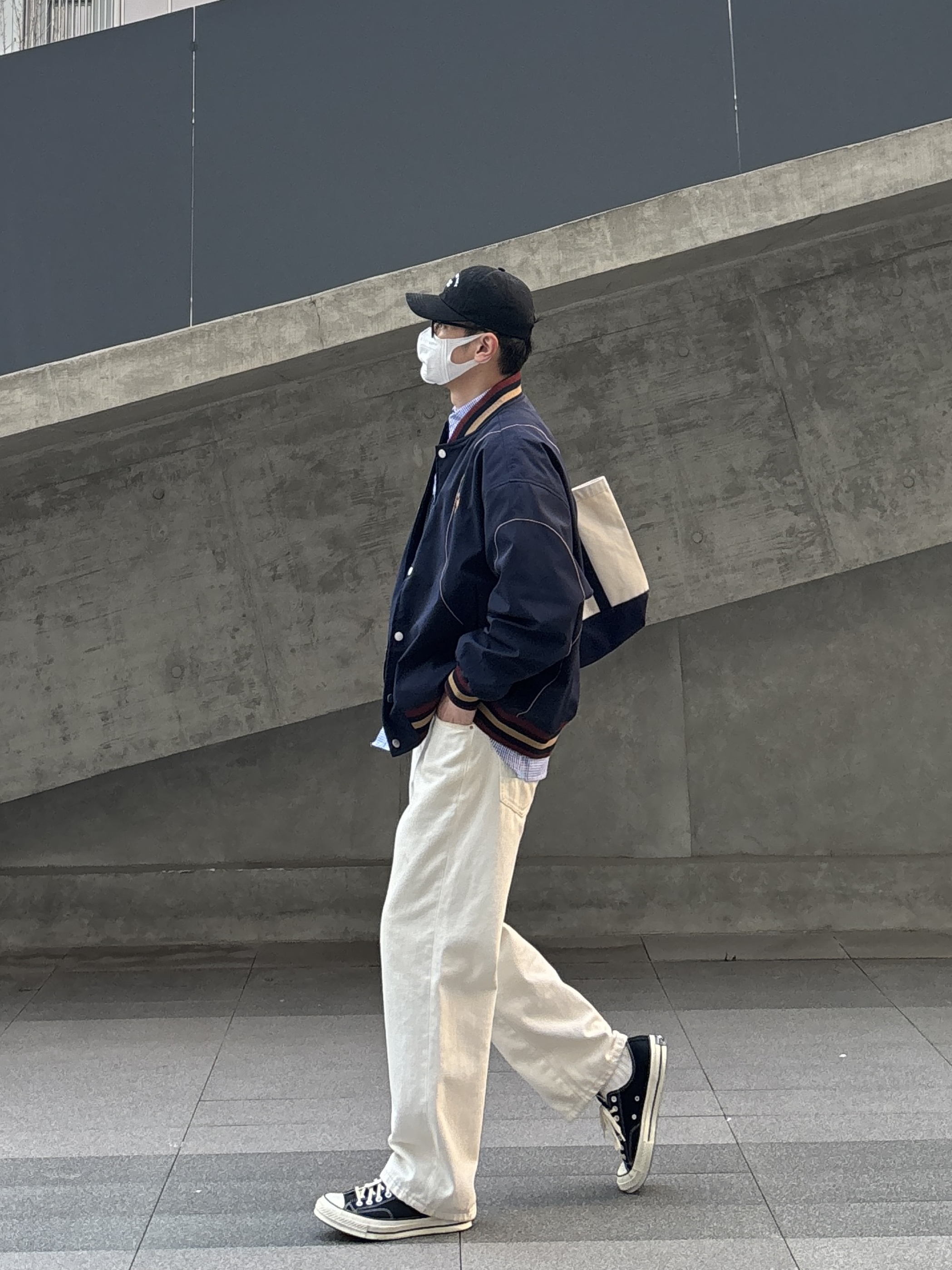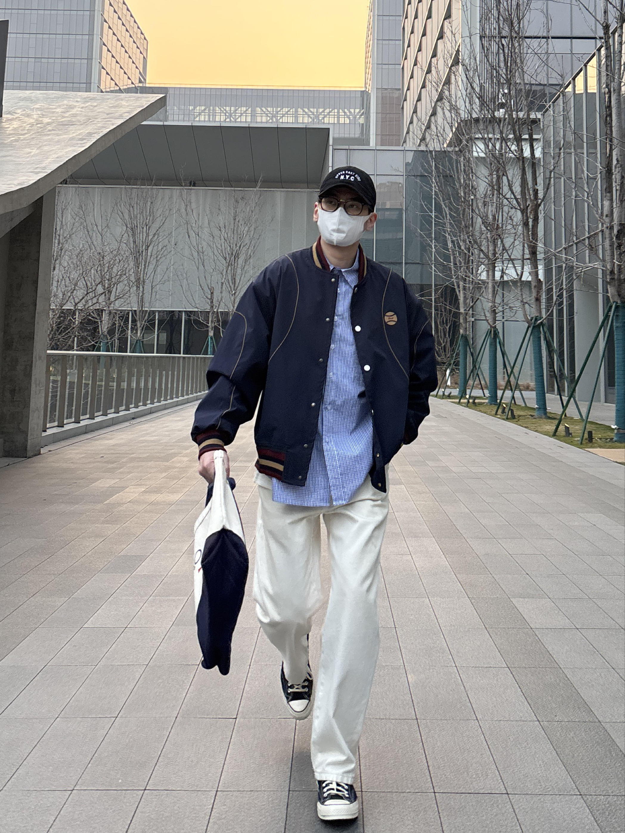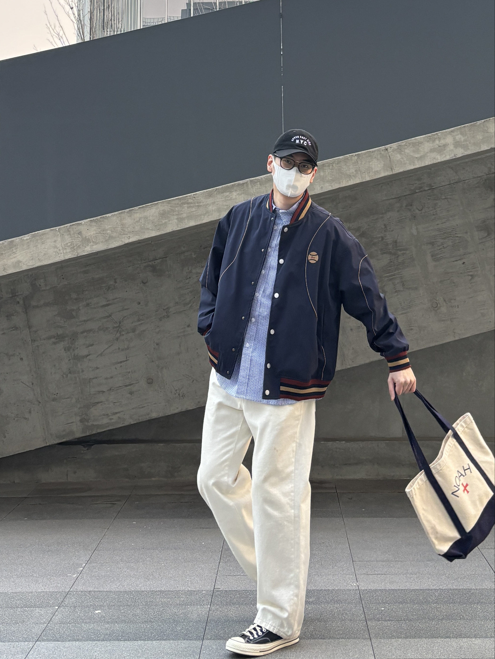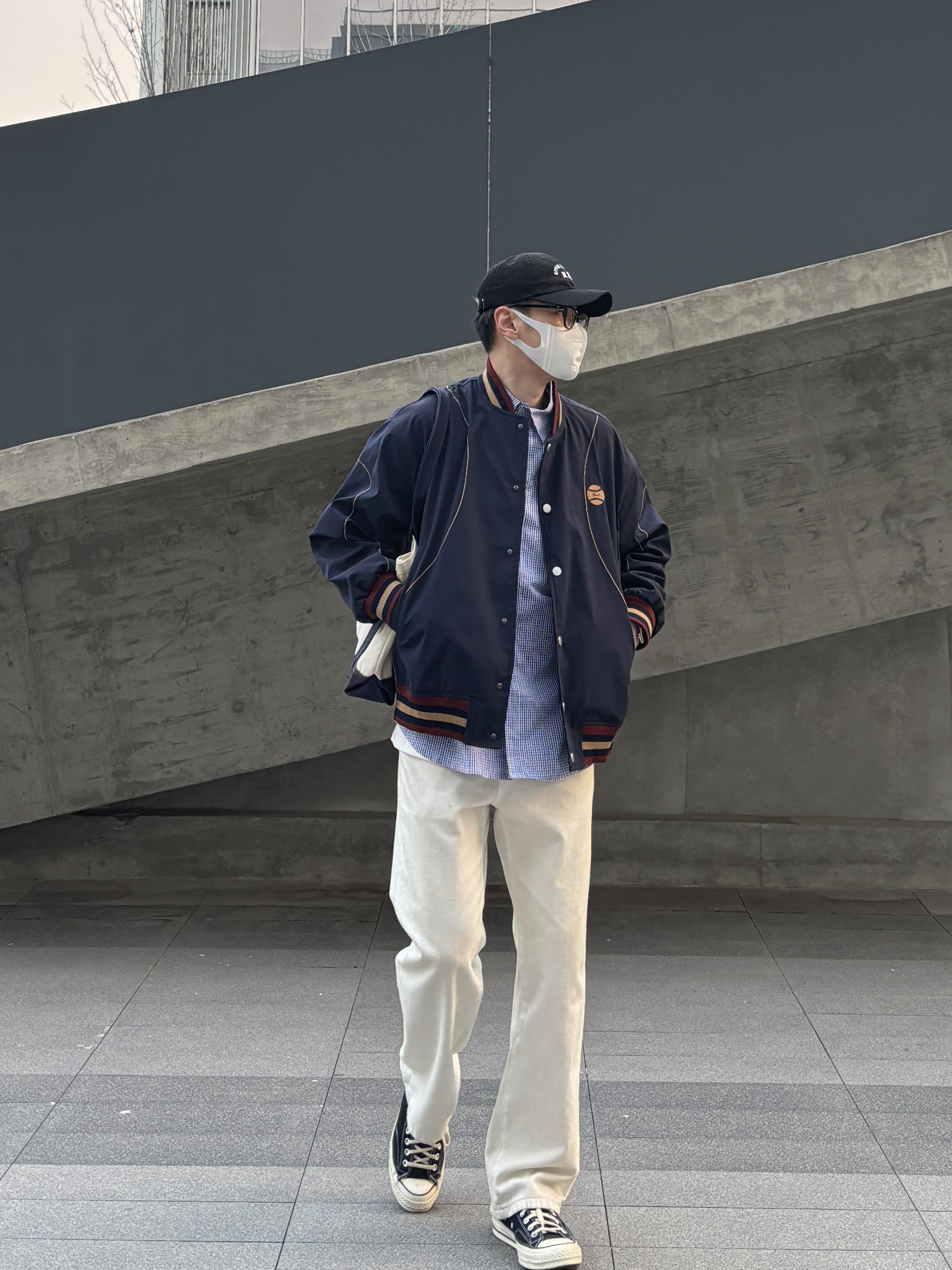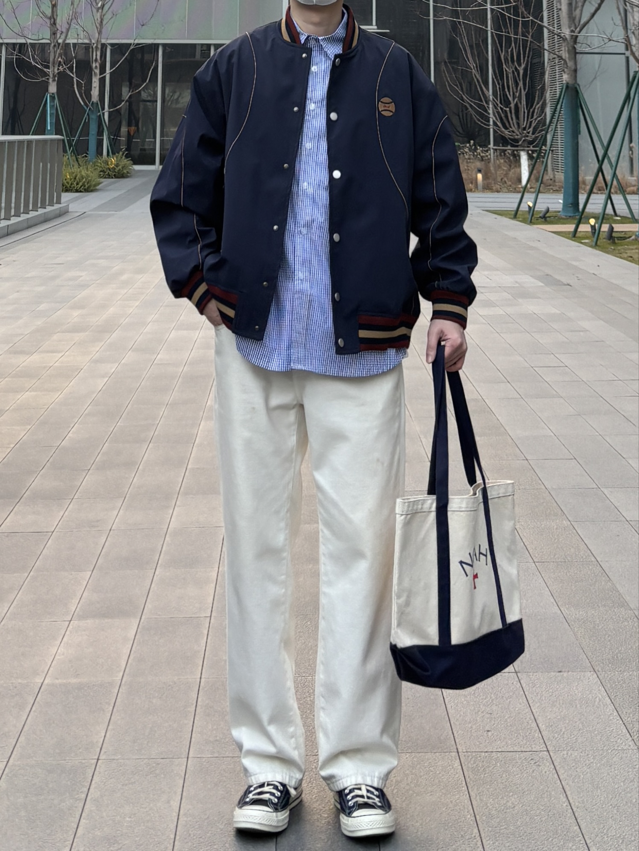 今天这套look清爽又高级 通勤上学都不会出错👌 藏青色棒球服是永不出错的经典 搭配蓝色格纹衬衫,若隐若现的层次感超绝 下装选择白色直筒牛仔裤和黑白帆布鞋 宽松版型中和上装利落,松弛感这不就来了嘛🙋♂️ 这身穿搭重点就是「简而不寡」 基础款叠穿出层次,配色干净又协调 再用棒球帽和托特包点睛,轻松拿捏少年感~ - 今日搭配 衣服裤子:NICE LILI 鞋子:匡威1970s黑白