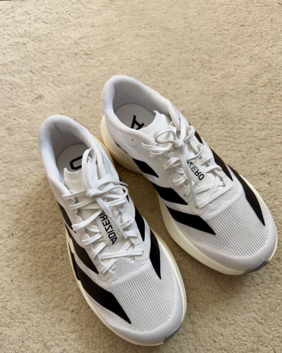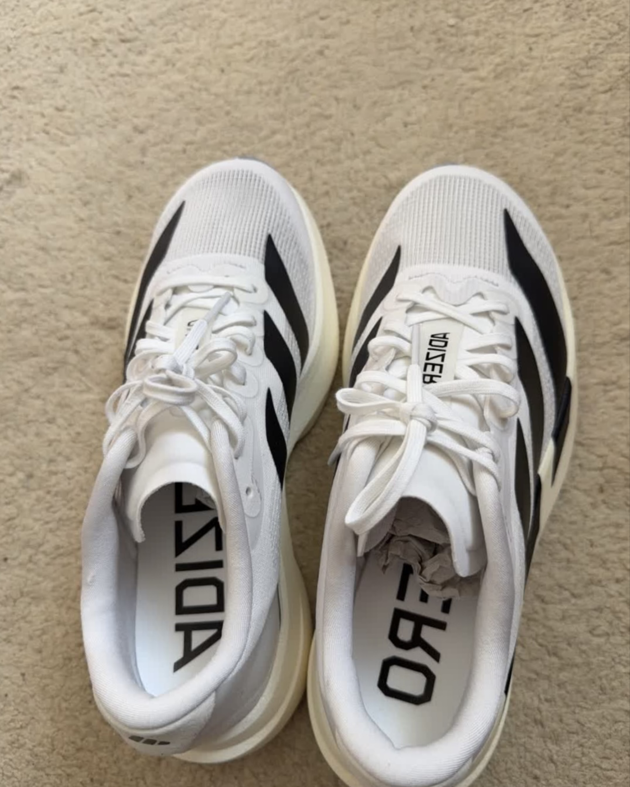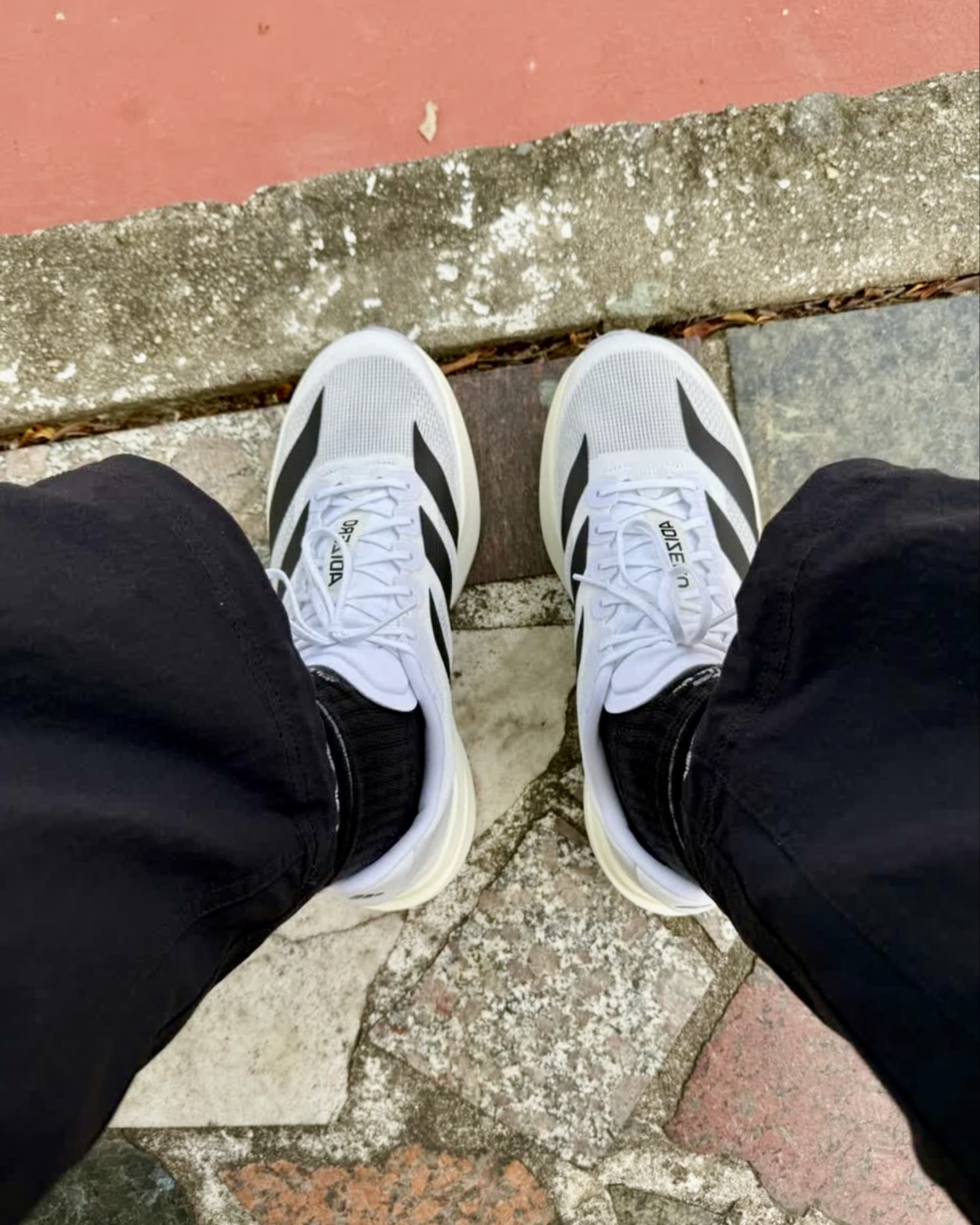 (适配跑步党/日常通勤党,真实优缺点不吹不黑) ✨ 颜值与设计|专业感拉满的「白月光」 • 经典黑白三条杠:流线型鞋身+标志性三条杠,白黑配色干净利落,不管是跑场还是日常通勤都能搭,运动风+极简感直接戳中审美点。 • 轻量化外观:单只约210-225g(42码),上脚几乎「零负重」,视觉上也显脚瘦,对想兼顾颜值和性能的跑者太友好。 • 细节质感:工程网布鞋面+Lightstrike Pro...