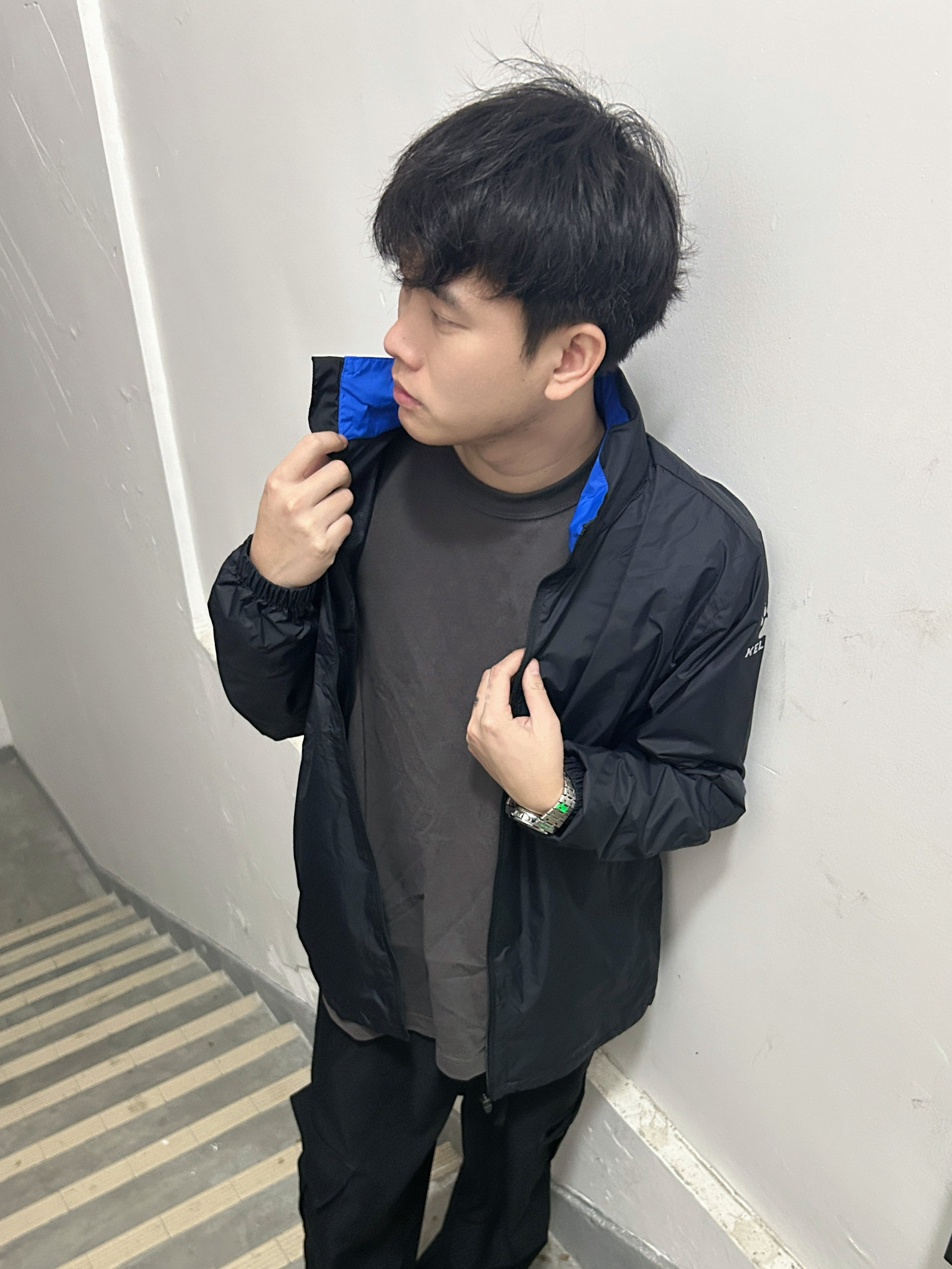这件KELME的黑色防风外套,我最近通勤穿得最多。 面料是那种滑滑的尼龙材质,风大的时候穿特别挡风,里面搭一件深灰T恤就够了,不会显得臃肿。早上赶地铁的时候,风灌不进来,这点真的很省心。 裤子选了黑色工装裤,鞋子配白鞋,整体就是简单的黑灰配色,不挑人也不挑场景,上班、下楼买咖啡都挺合适。我平时懒得想搭配,就直接这么一套,看着干净利落。 版型是偏宽松的,我177穿M码刚好,不会太紧绷,抬手、走...