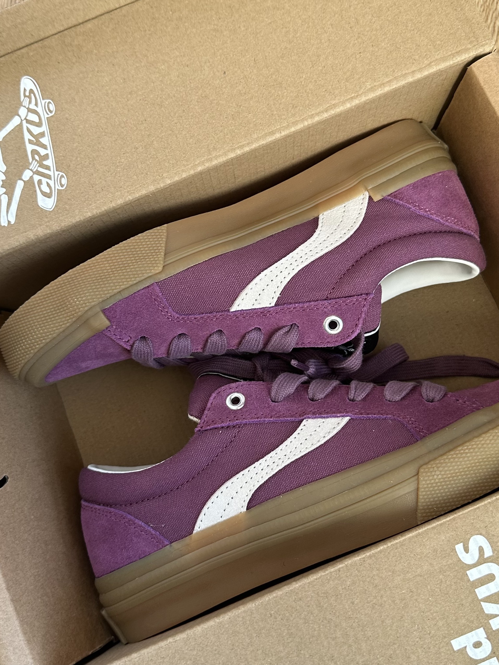 谁能拒绝这种软fufu的葡萄紫啊✨ 一眼就被CIRKUS这双鞋戳中了! 低饱和的灰调紫+奶白侧边条,温柔又带点甜酷感,生胶底自带复古滤镜,不管是搭牛仔裤、工装裤还是小裙子,都能秒变美式复古辣妹,日常出街、滑板都超吸睛~
