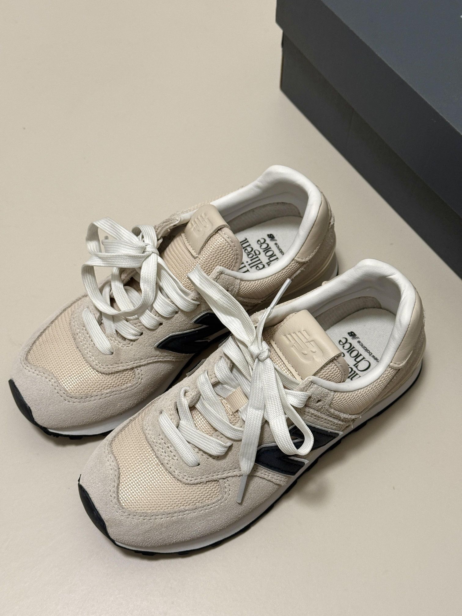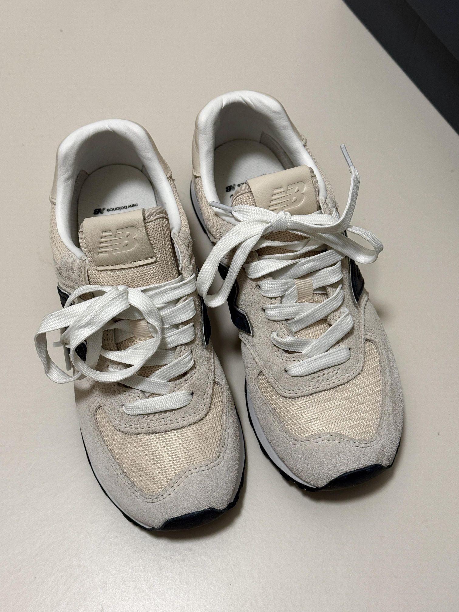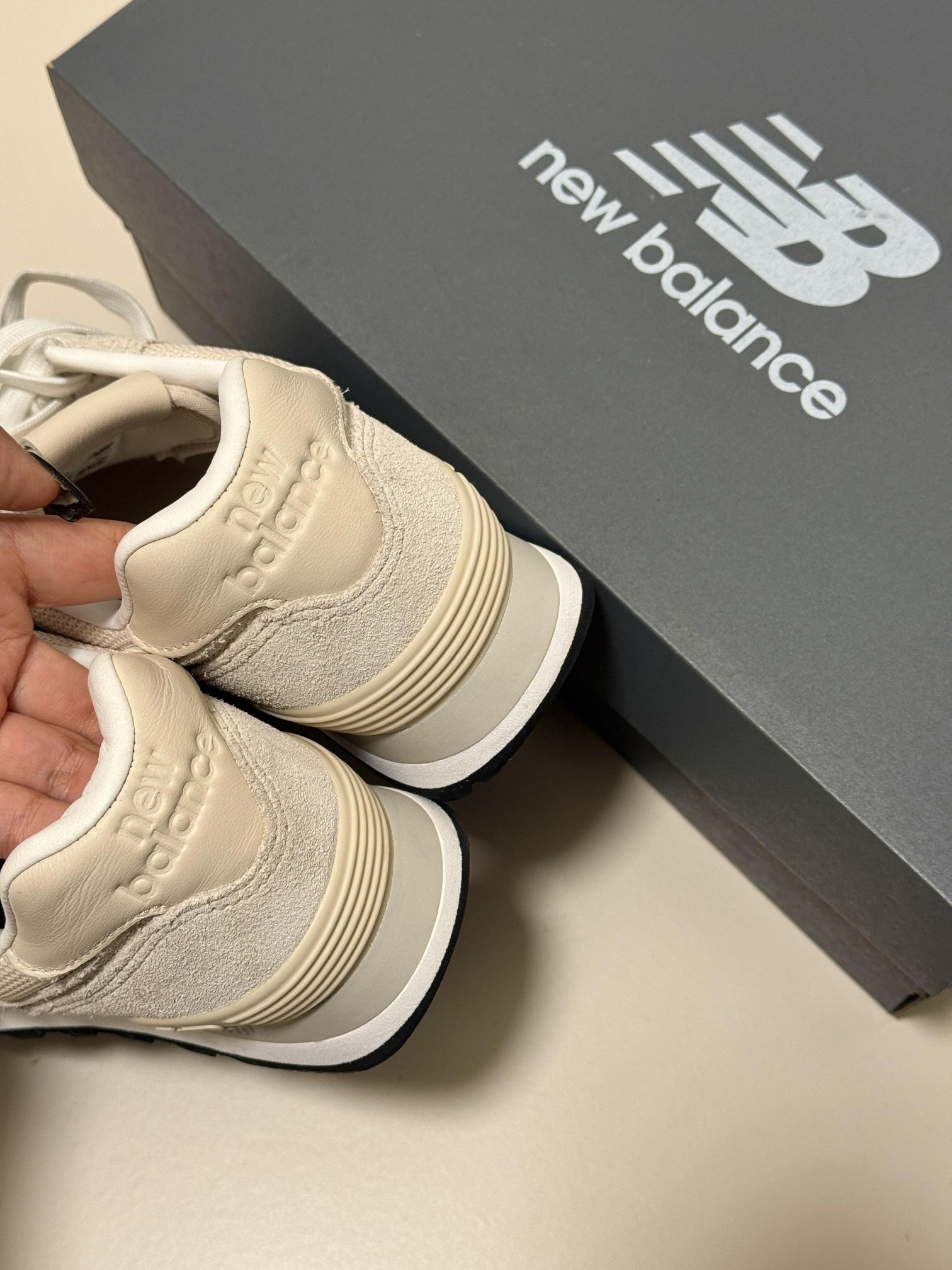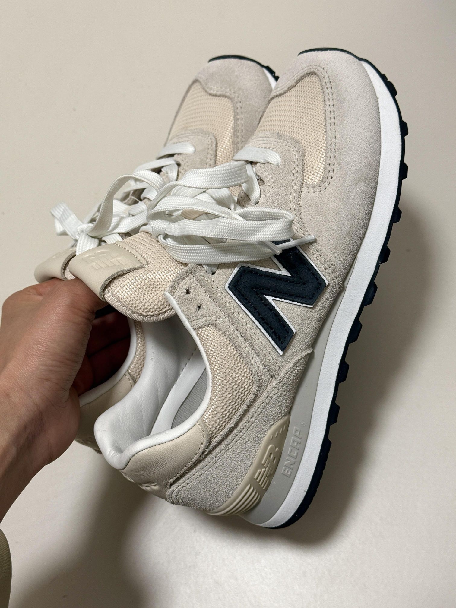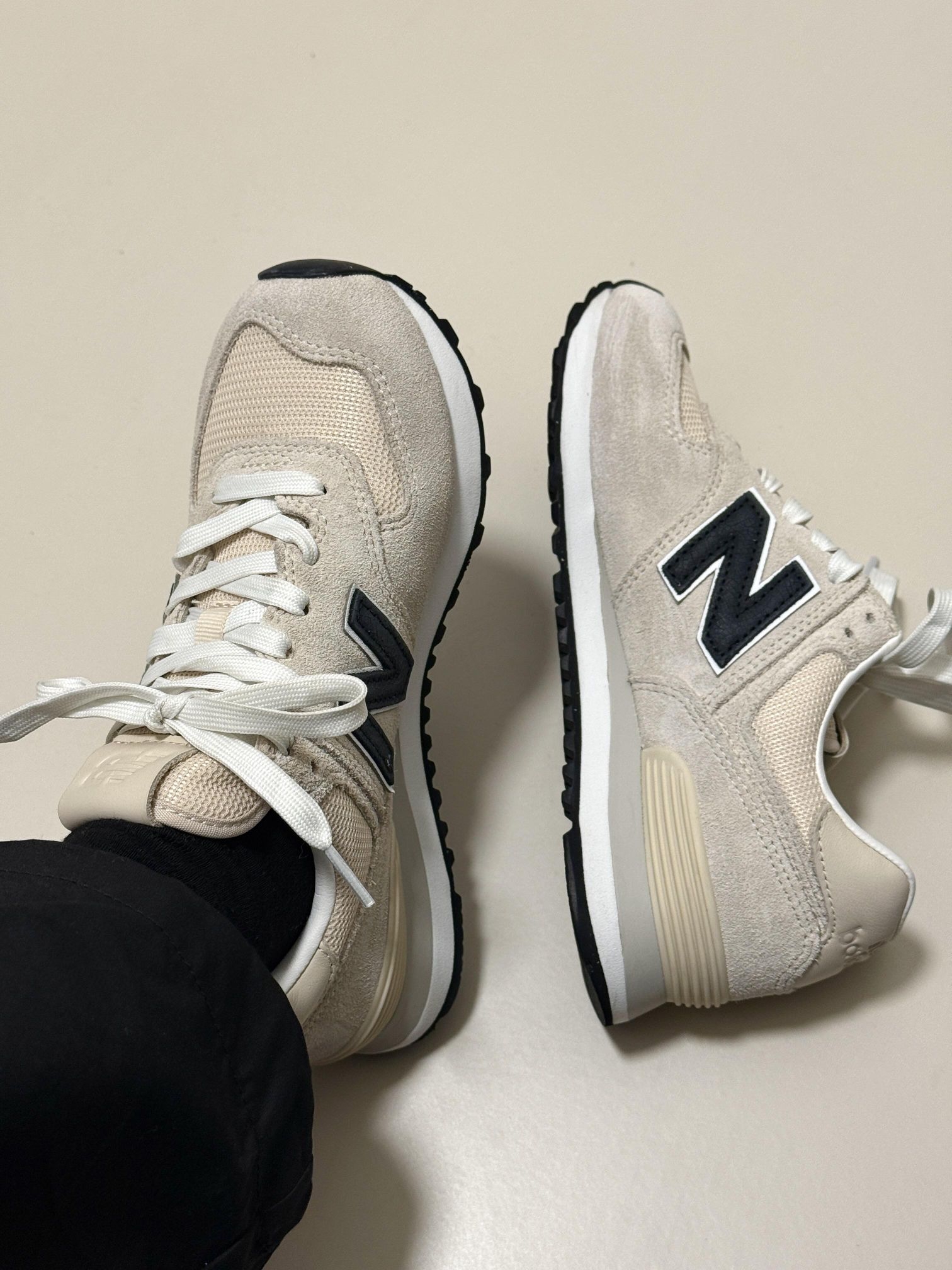 - 这双NB574真的是我近期鞋柜里的“劳模 我的“万能搭配神鞋”NB574 米白色的 很耐看 简约又百搭 脚感很舒服 逛街通勤都不累脚 用来搭配黑裤子、运动裤、小裙子都好看 麂皮质感很好,