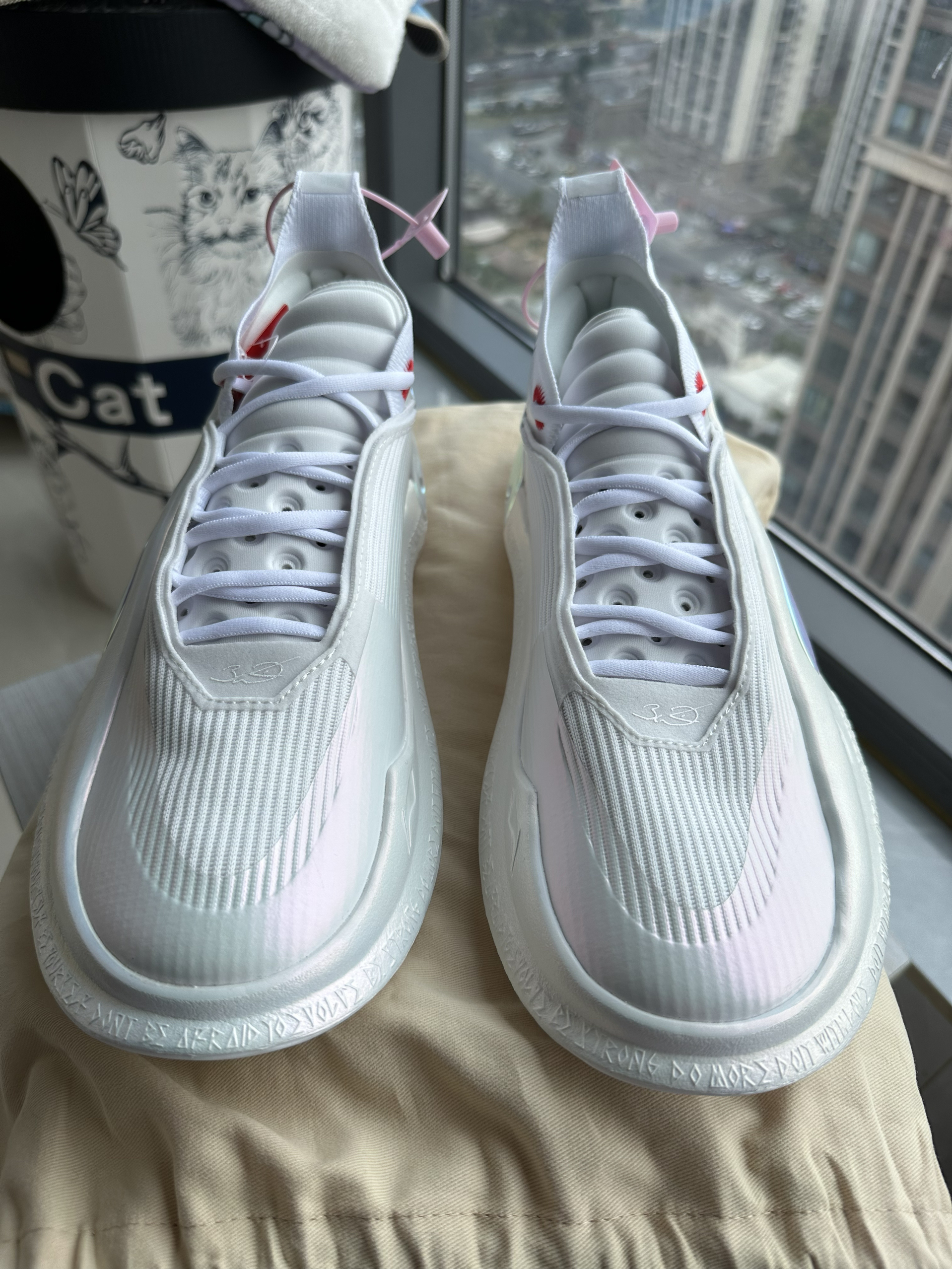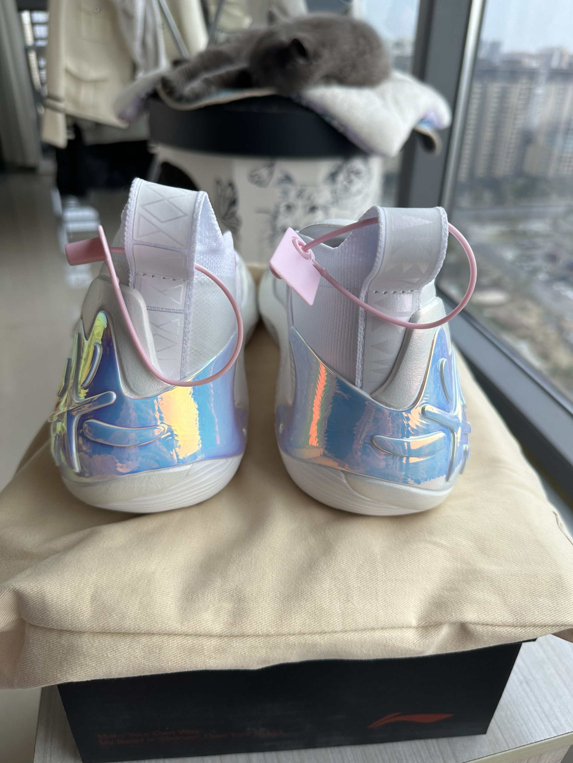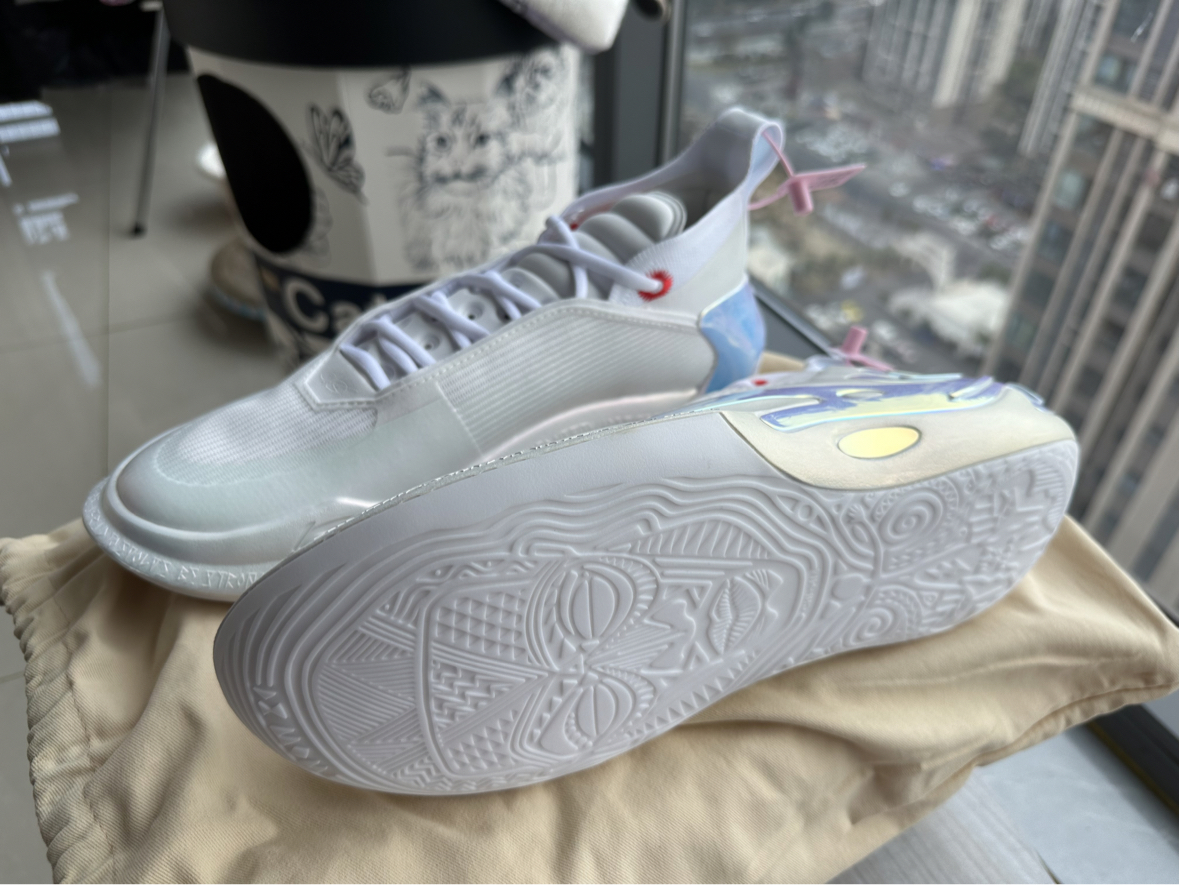 这双WOW11整体采用干净利落的纯白鞋身,搭配后跟炫彩镭射TPU,在光线下质感拉满,流线型鞋身极具速度感,辨识度超高。夸张的防侧翻结构和强力支撑线,让稳定性和保护性直接拉满,实战安全感十足,目前的价格性价比非常能打。唯一小缺点是鞋面偏紧致,对高脚背不太友好,穿着会有压脚背的情况,建议选购时直接拍大半码,舒适度会提升很多。