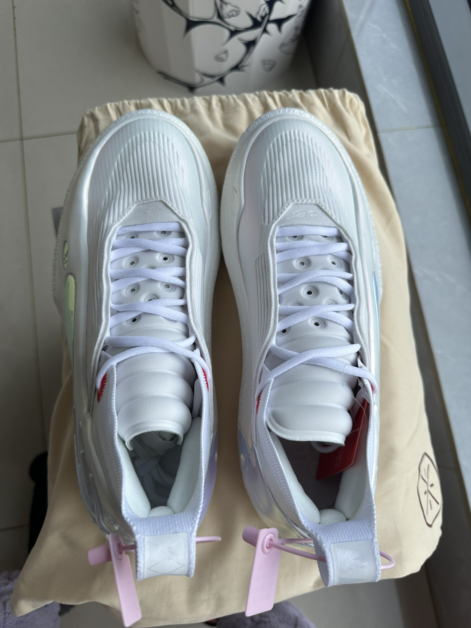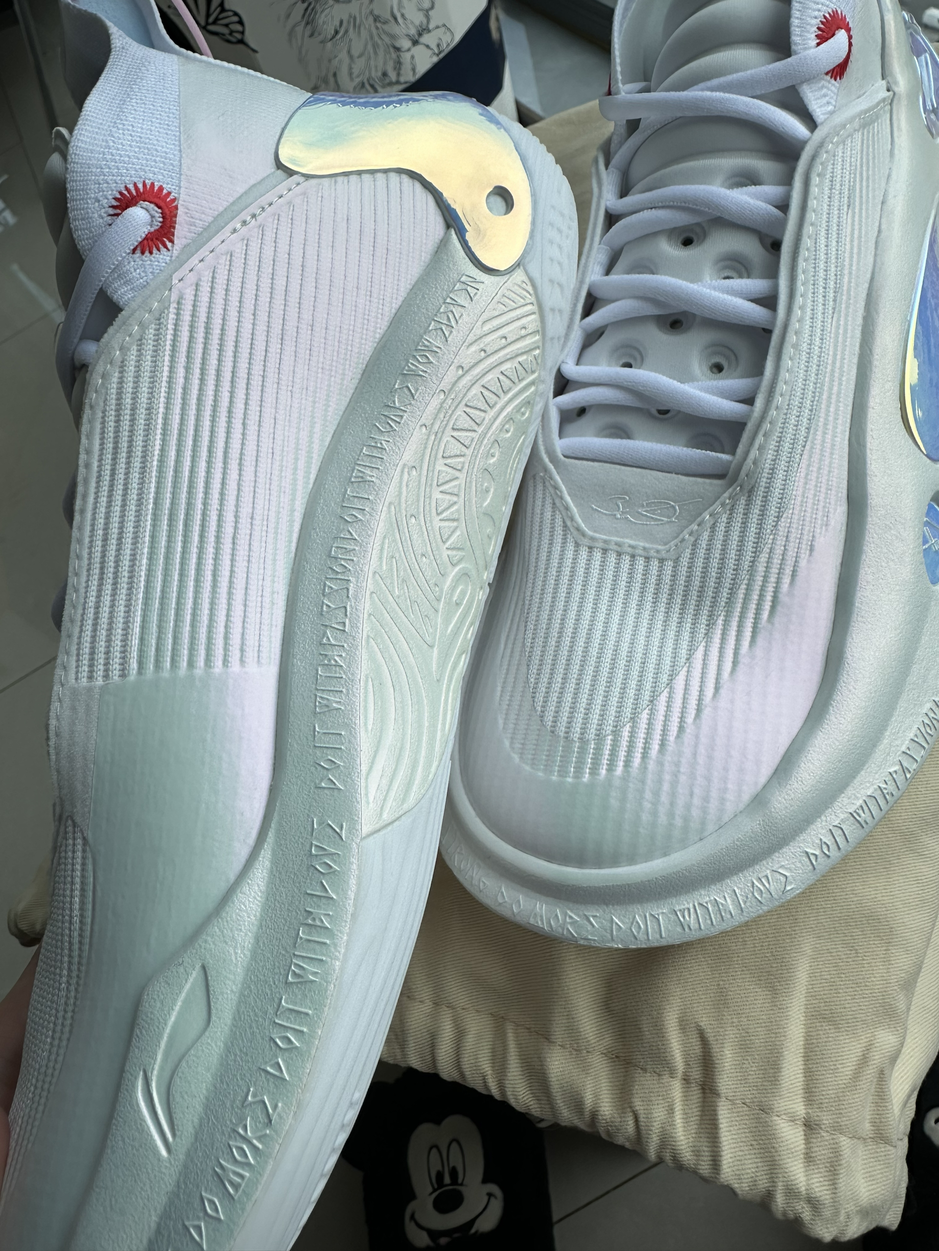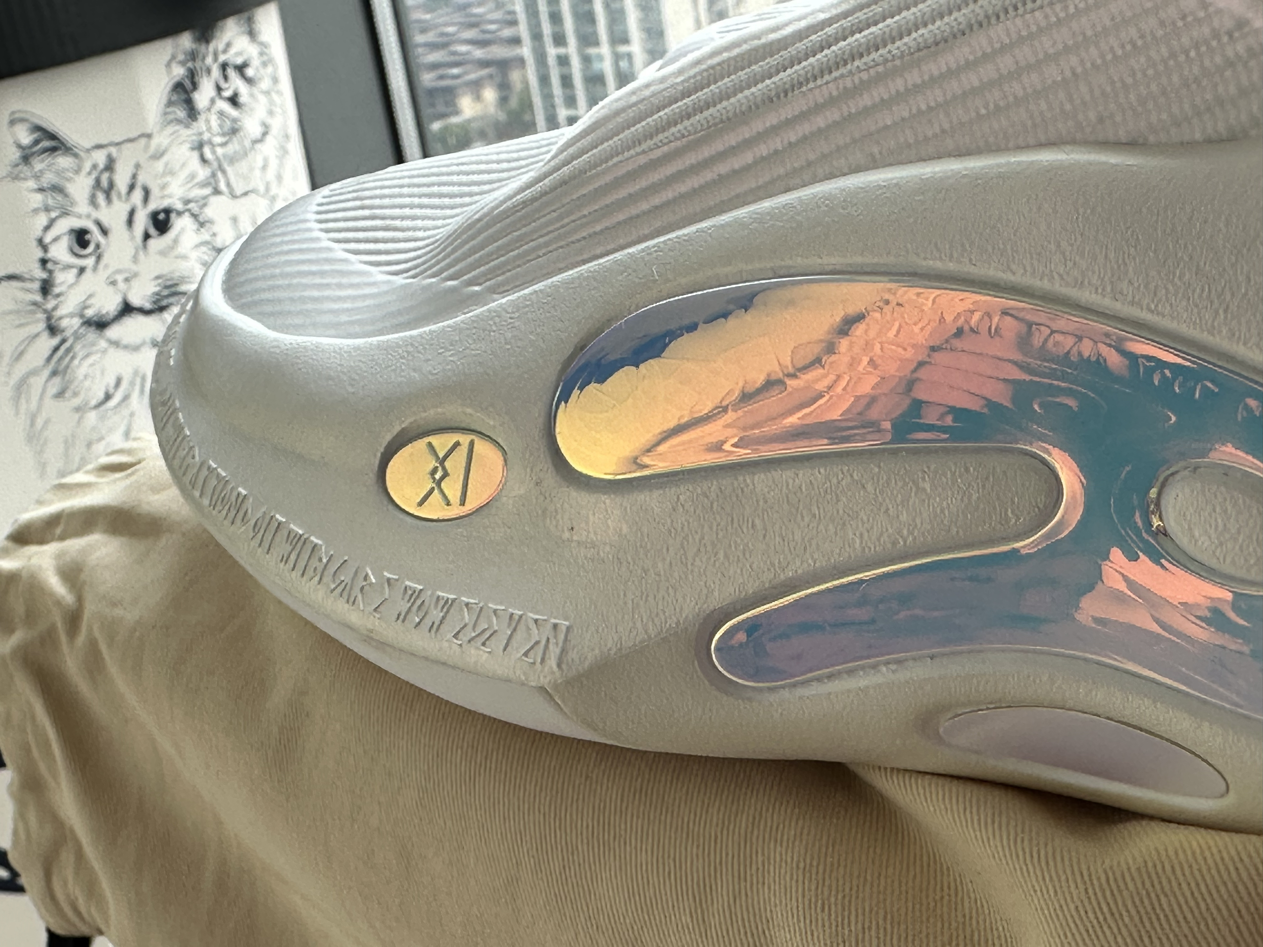 这双WOW11整体采用干净利落的纯白鞋身,搭配后跟炫彩镭射TPU,在光线下质感拉满,流线型鞋身极具速度感,辨识度超高。夸张的防侧翻结构和强力支撑线,让稳定性和保护性直接拉满,实战安全感十足,目前的价格性价比非常能打。唯一小缺点是鞋面偏紧致,对高脚背不太友好,穿着会有压脚背的情况,建议选购时直接拍大半码,舒适度会提升很多。