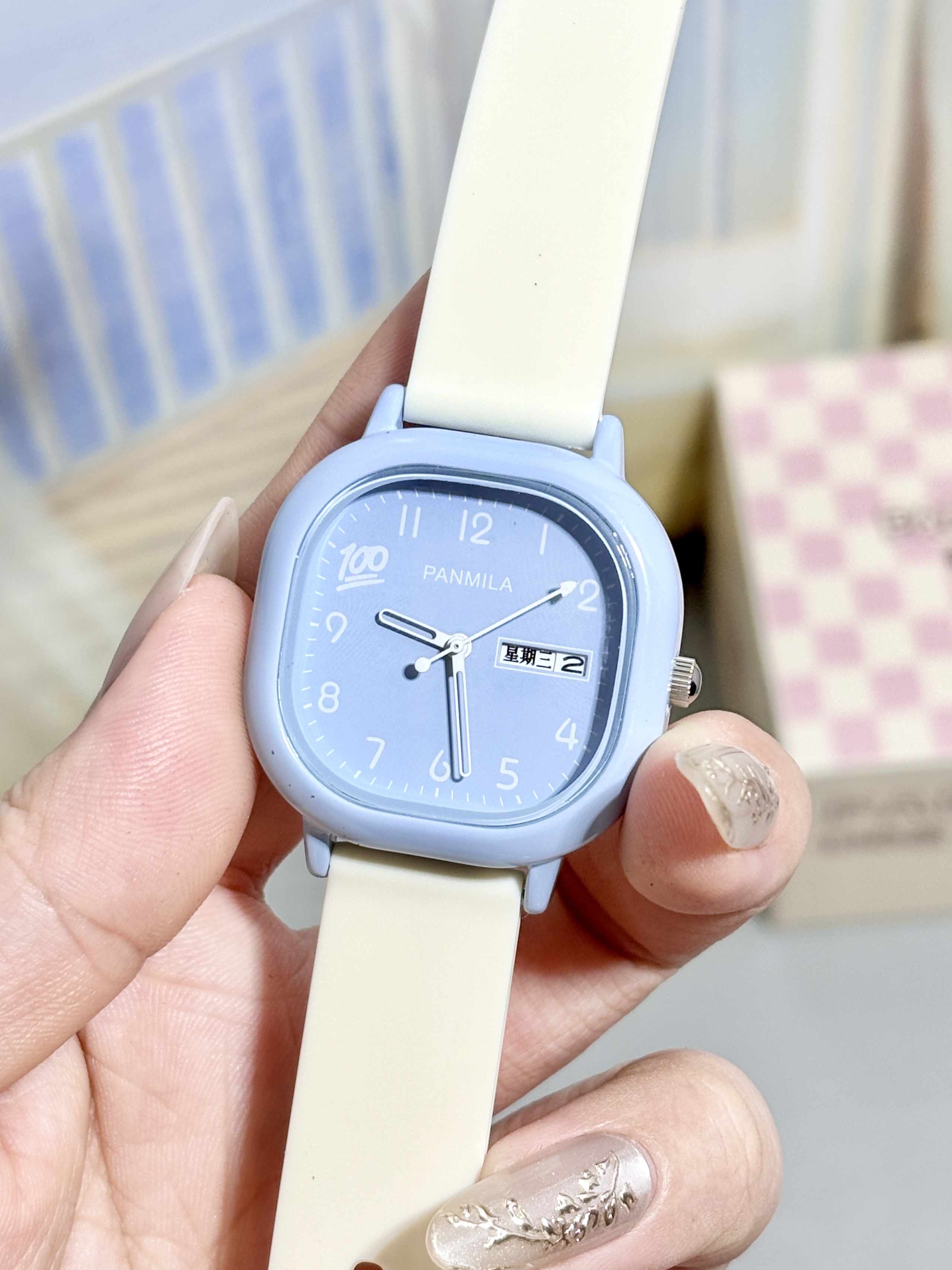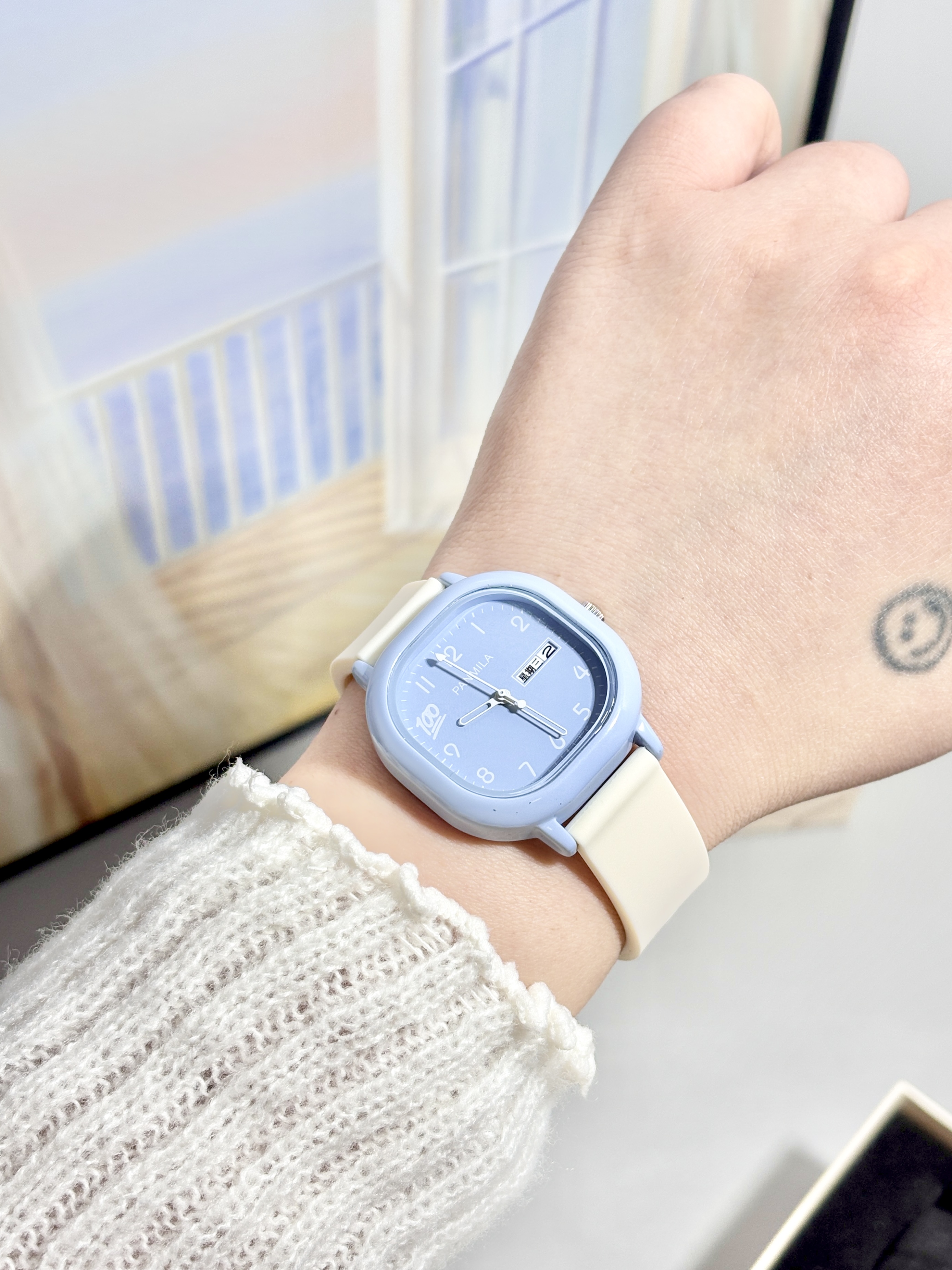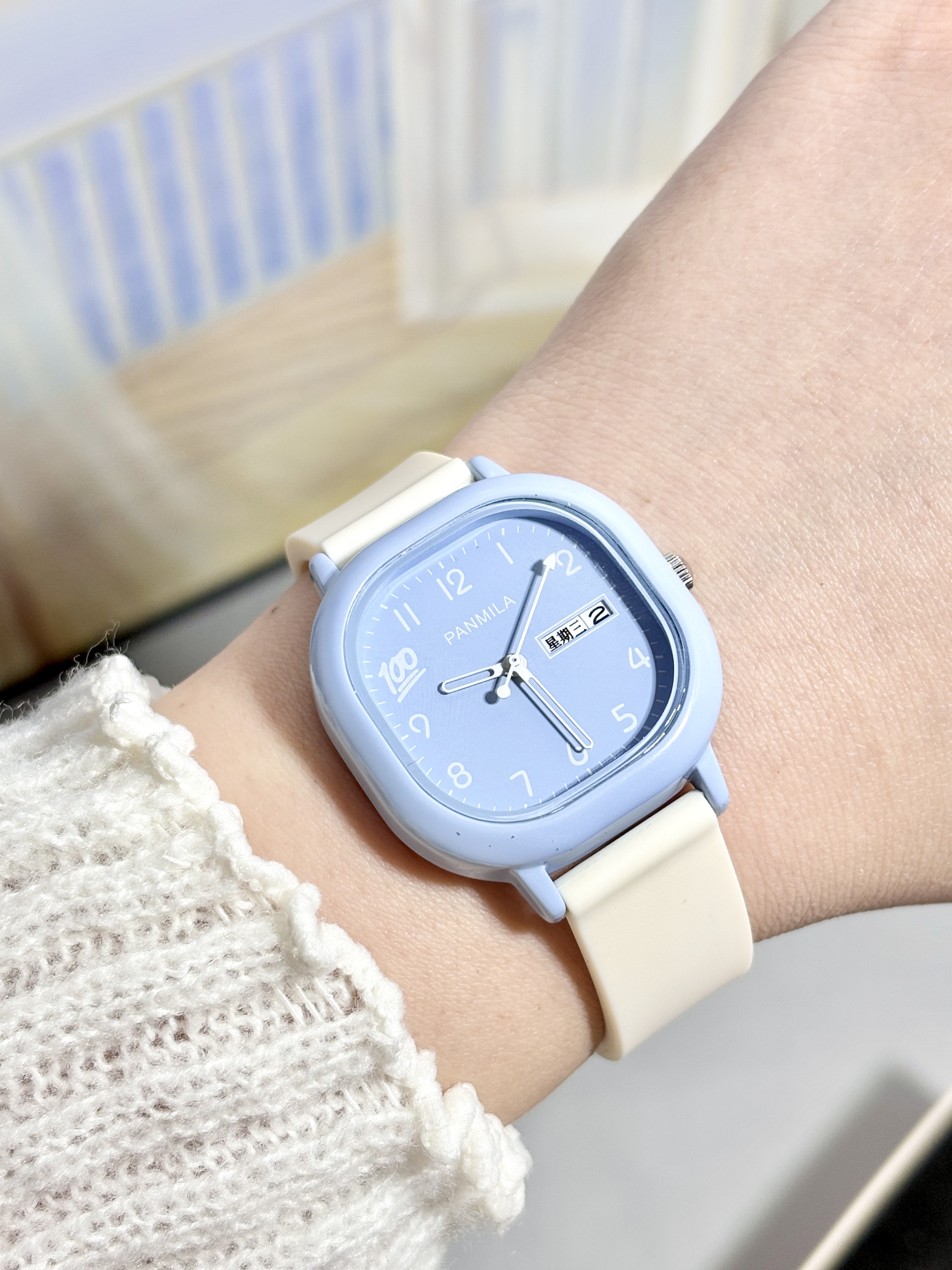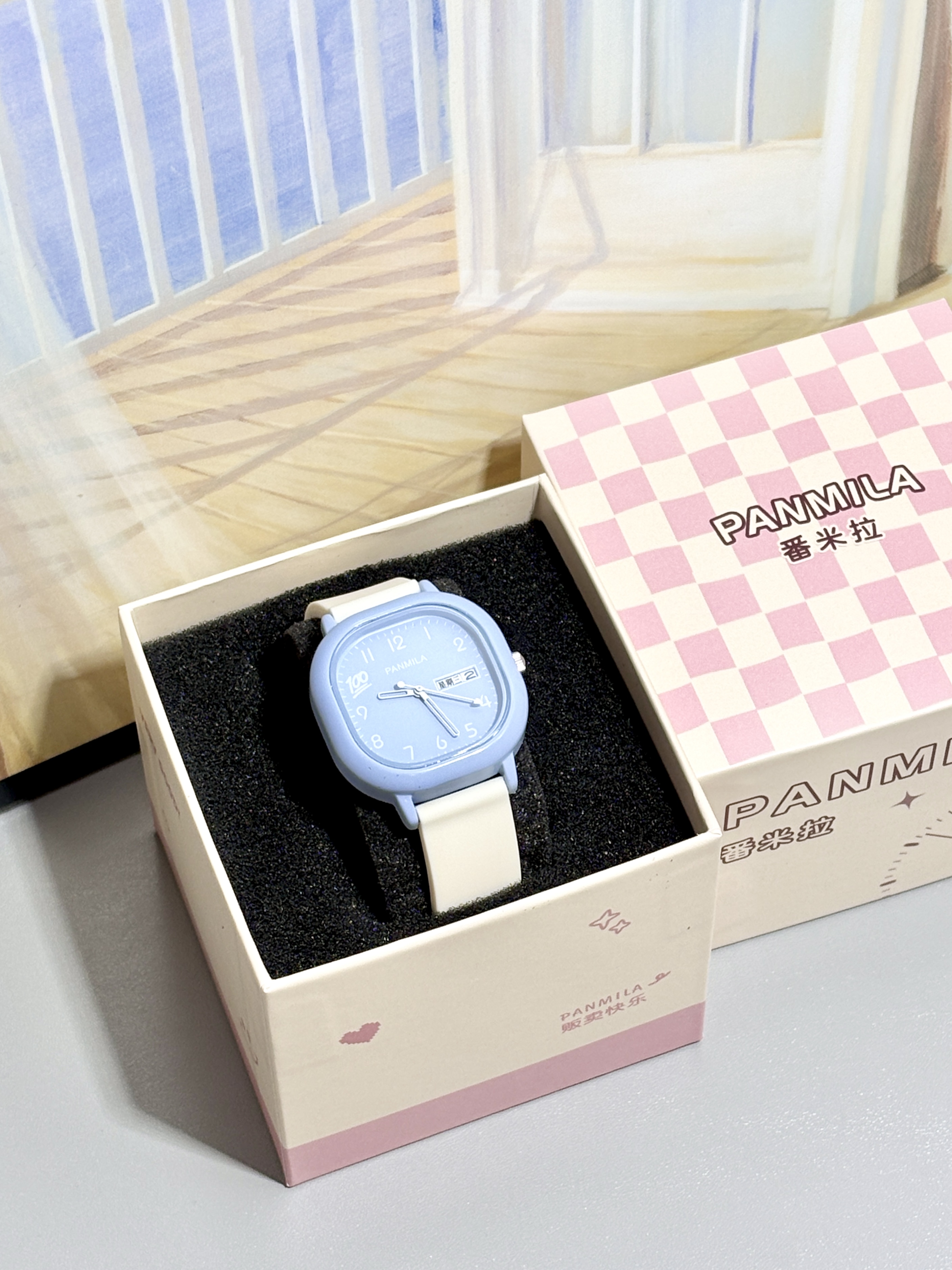 番米拉这块手表一眼就爱上了 奶蓝色的简约设计 干净又治愈 硅胶表带软软糯糯的 戴着hin舒服 长时间戴也不会勒手腕 它还带双日历功能 日常实用 数字刻度清晰 看时间一目了然 颜色敲显白 配校服卫衣很有青春感 平价耐看 自戴或送朋友都合适