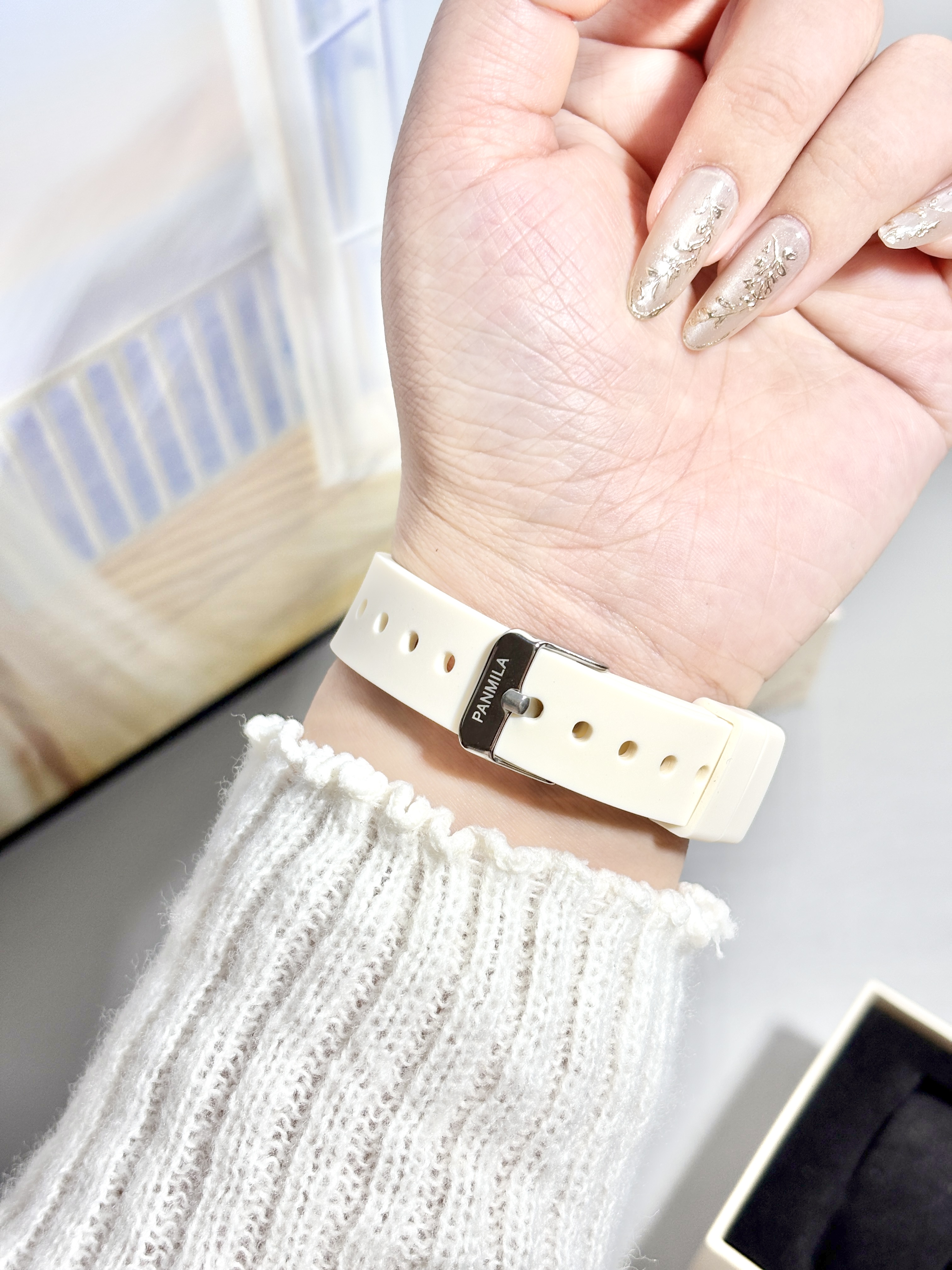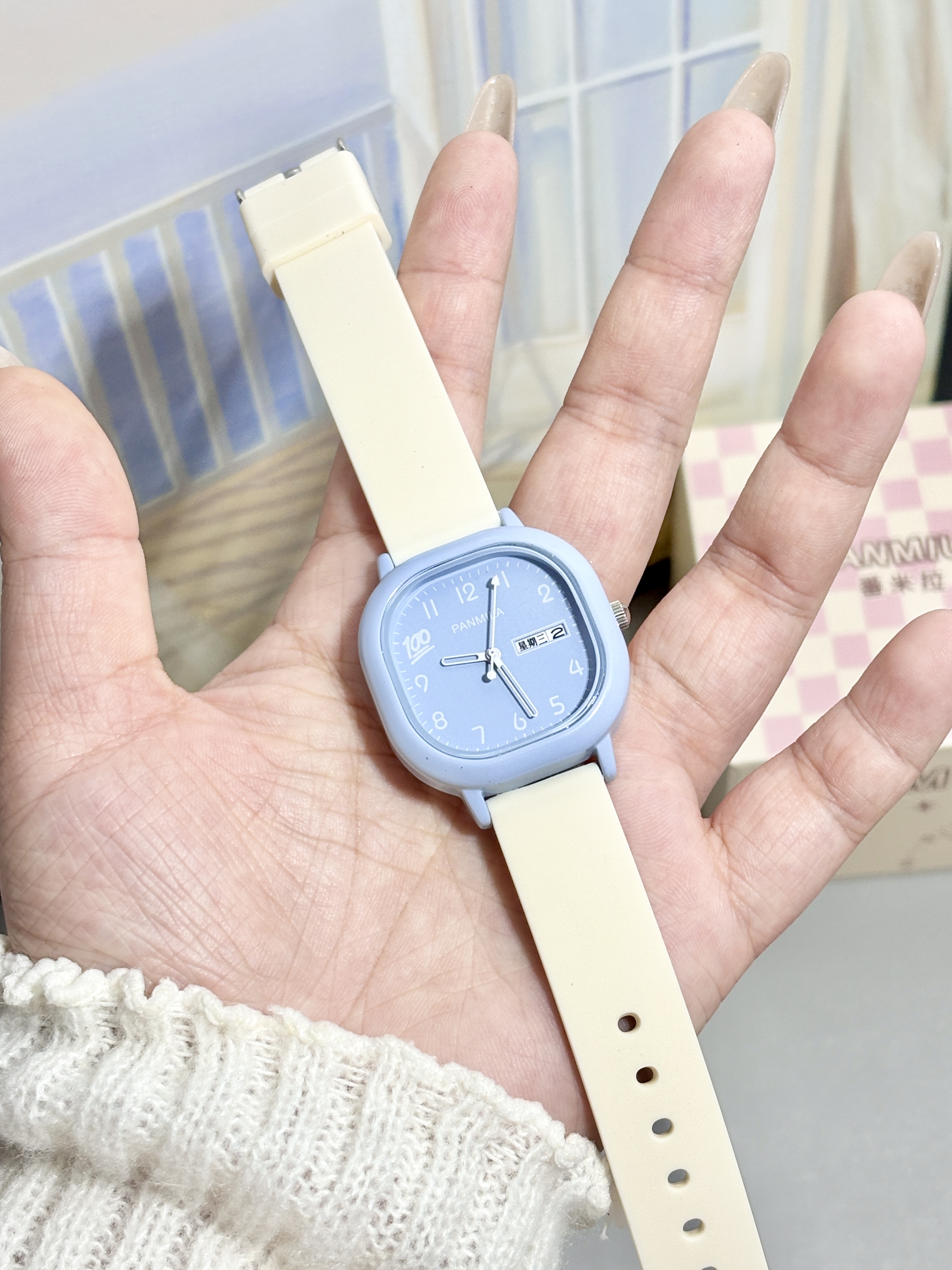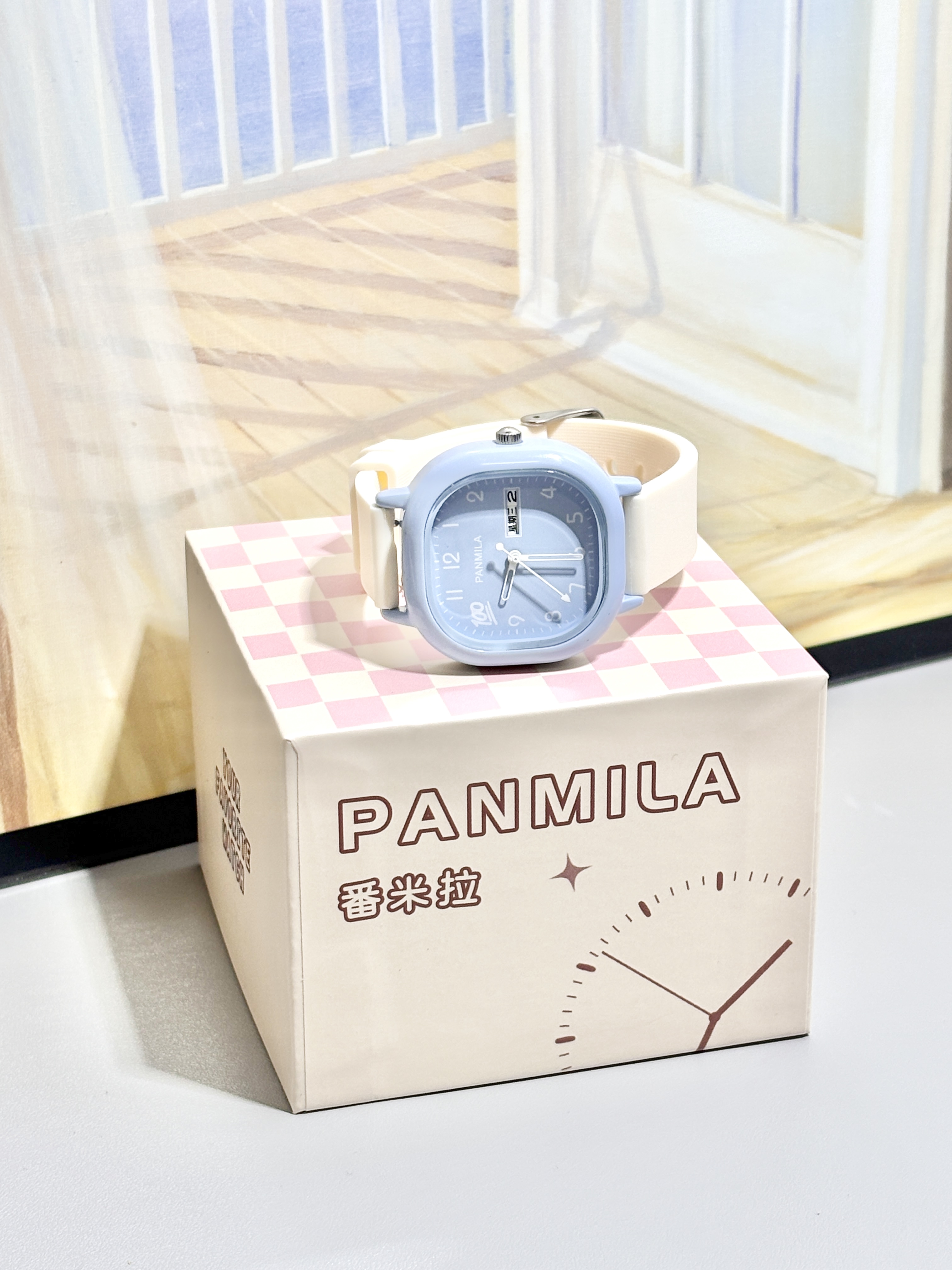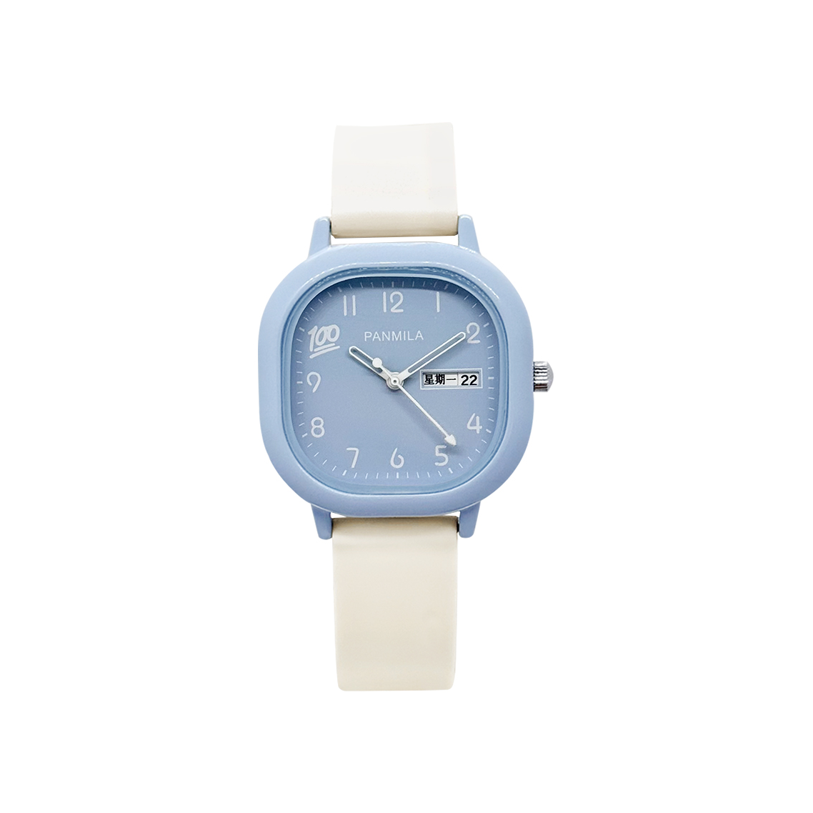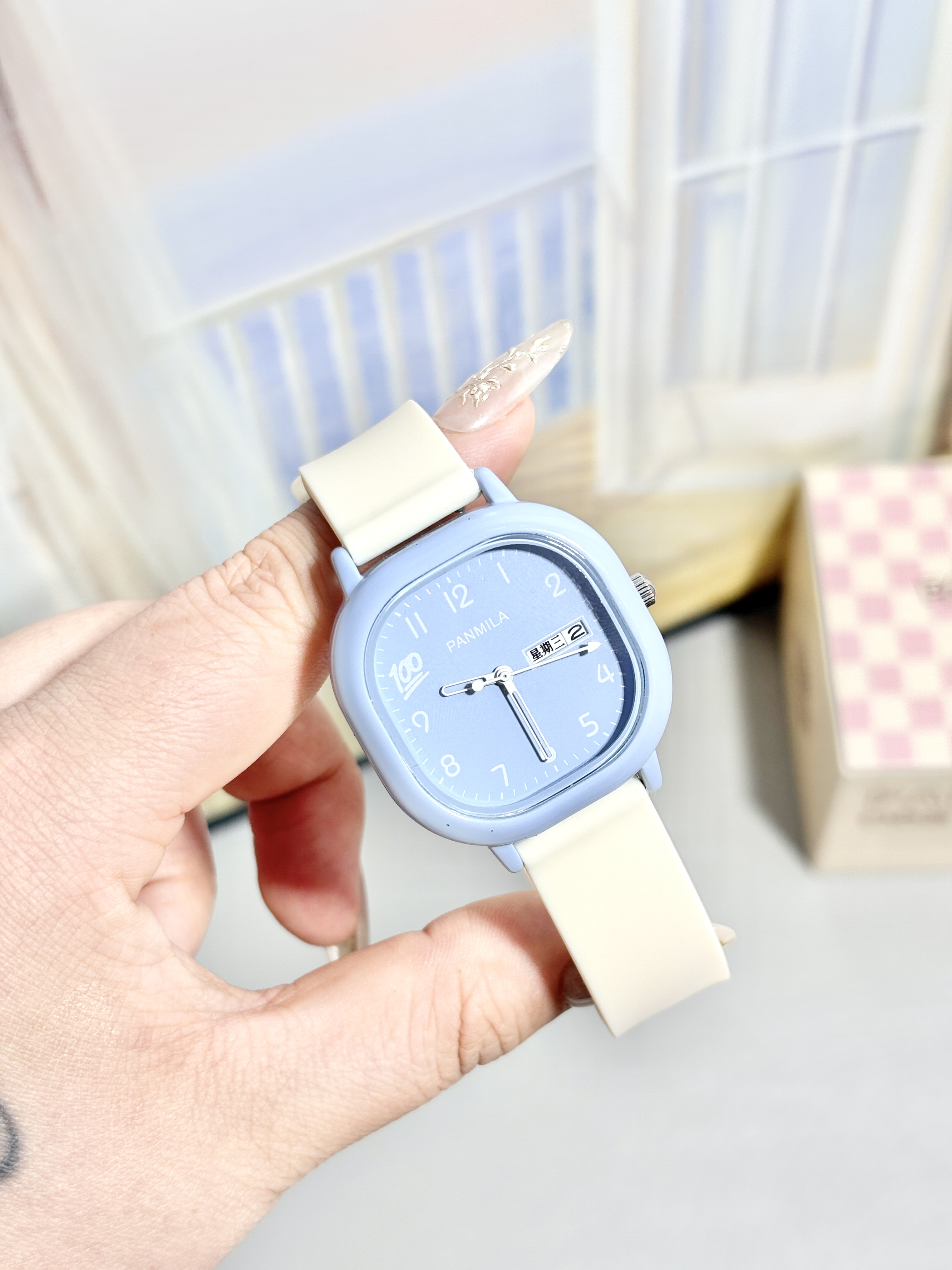 番米拉这块手表一眼就爱上了 奶蓝色的简约设计 干净又治愈 硅胶表带软软糯糯的 戴着hin舒服 长时间戴也不会勒手腕 它还带双日历功能 日常实用 数字刻度清晰 看时间一目了然 颜色敲显白 配校服卫衣很有青春感 平价耐看 自戴或送朋友都合适