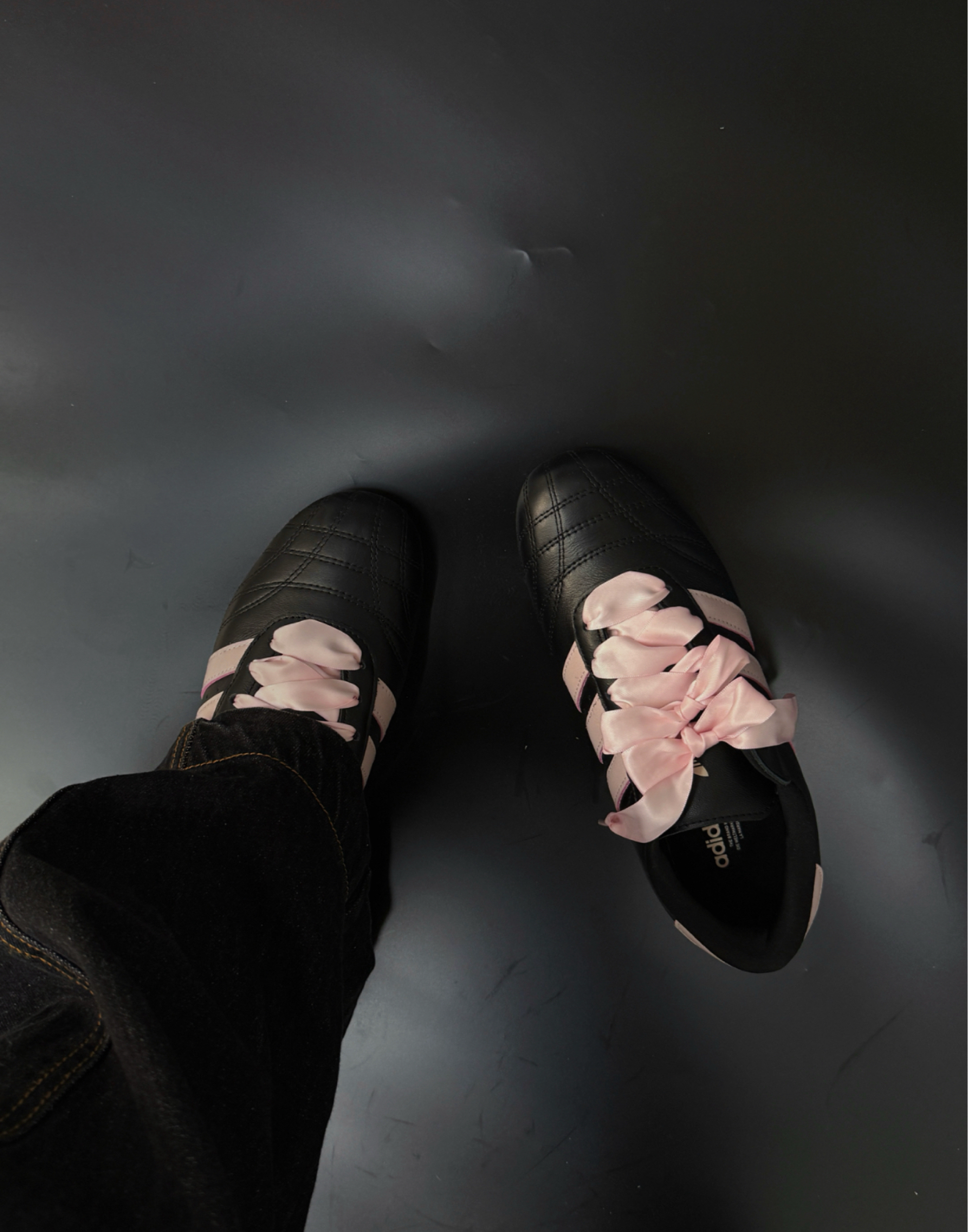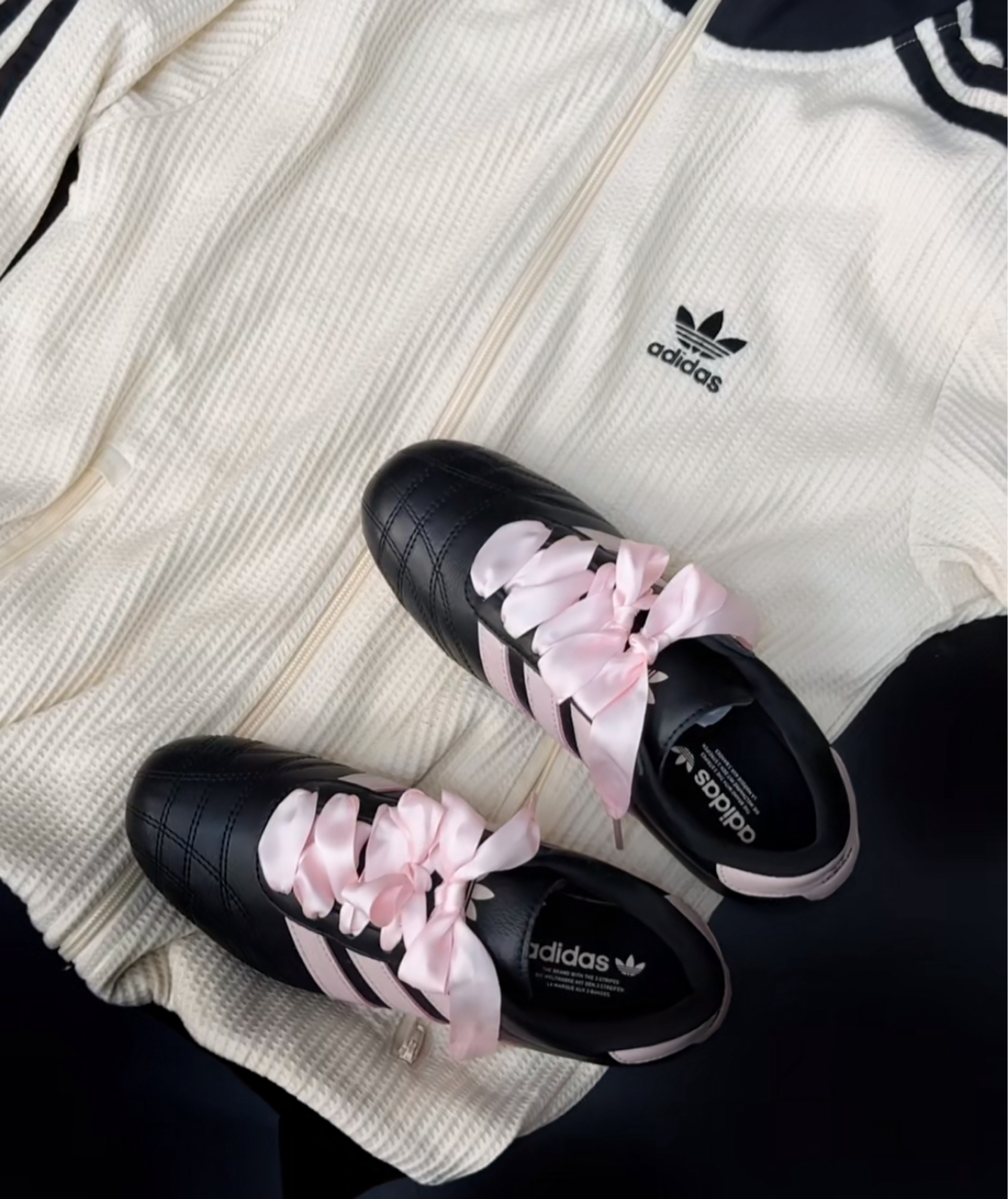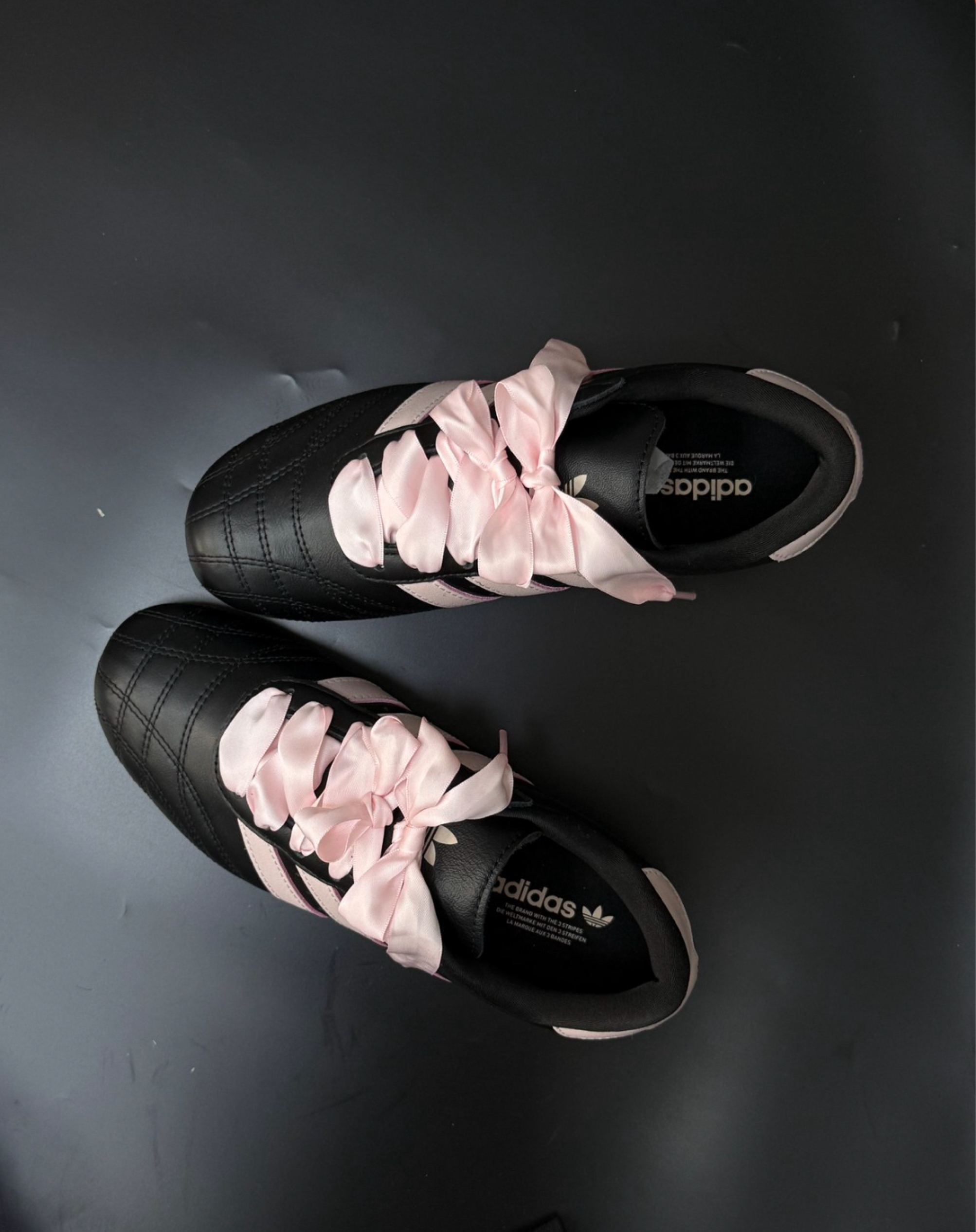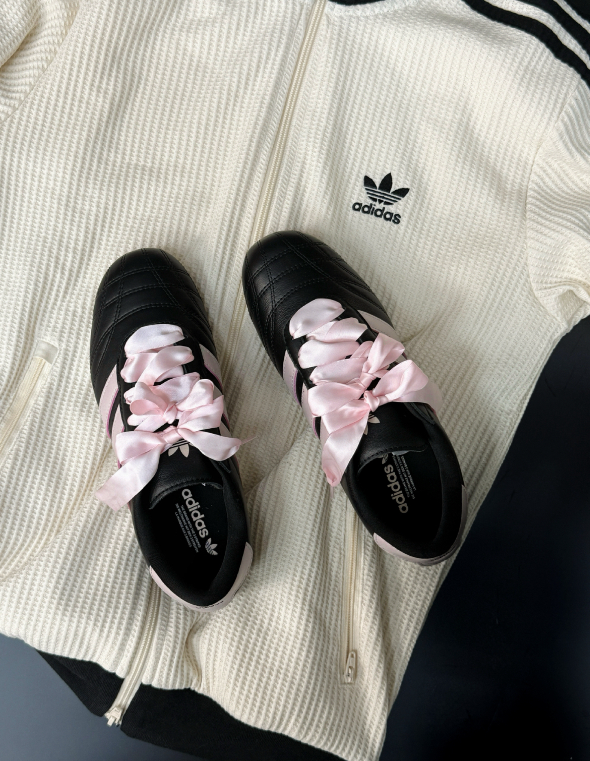 看到Jennie街拍穿搭中的跆拳道鞋后 瞬间就被种草了! 对比了黑白和黑粉,还是更喜欢这双🖤 主要是粉色的绸缎感鞋带真的很难拒绝! 上脚也很有质感🎀 喜欢这个皮质的光泽感~