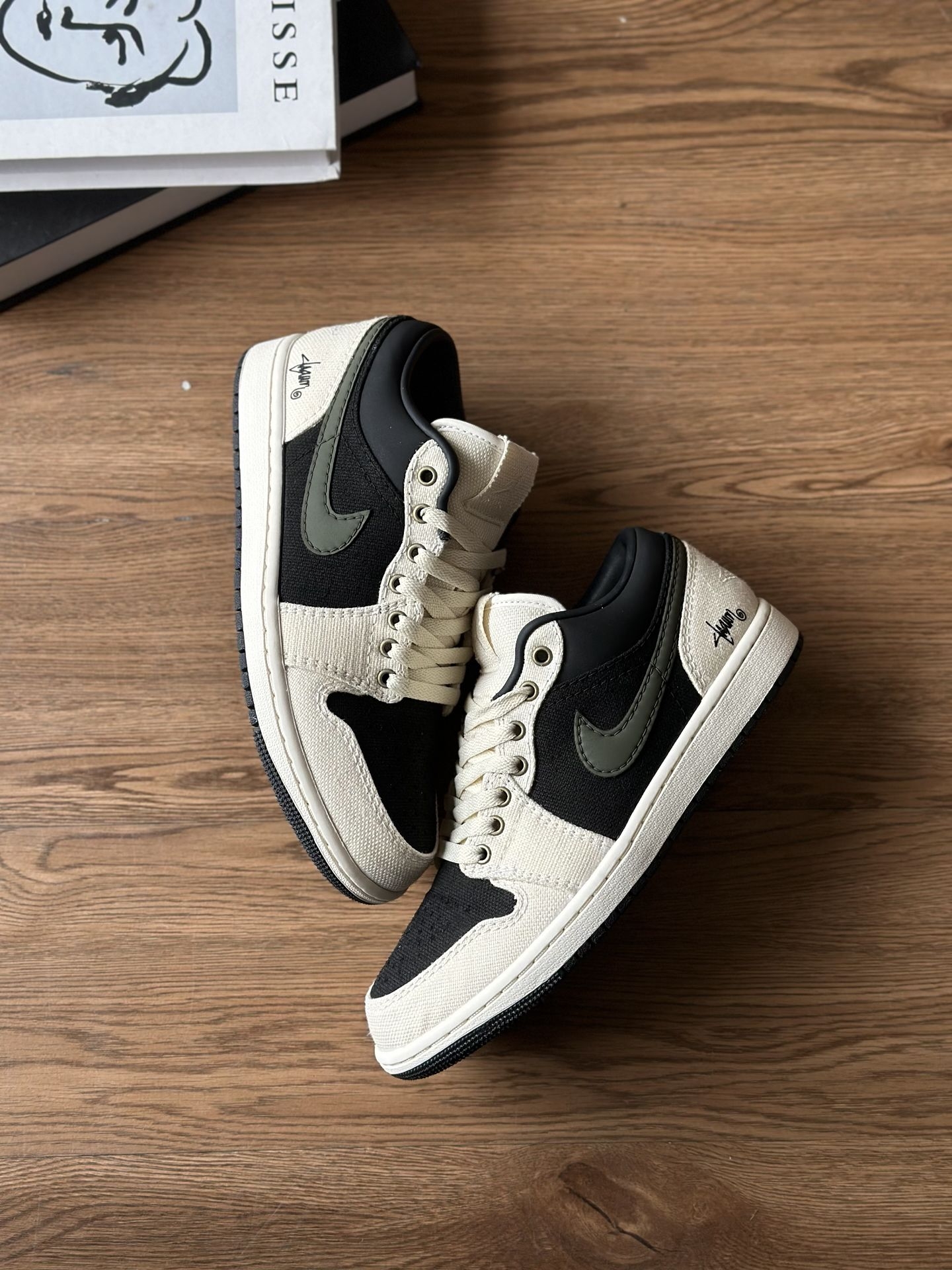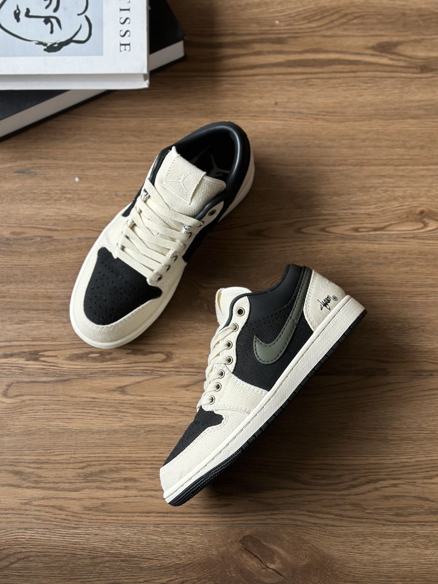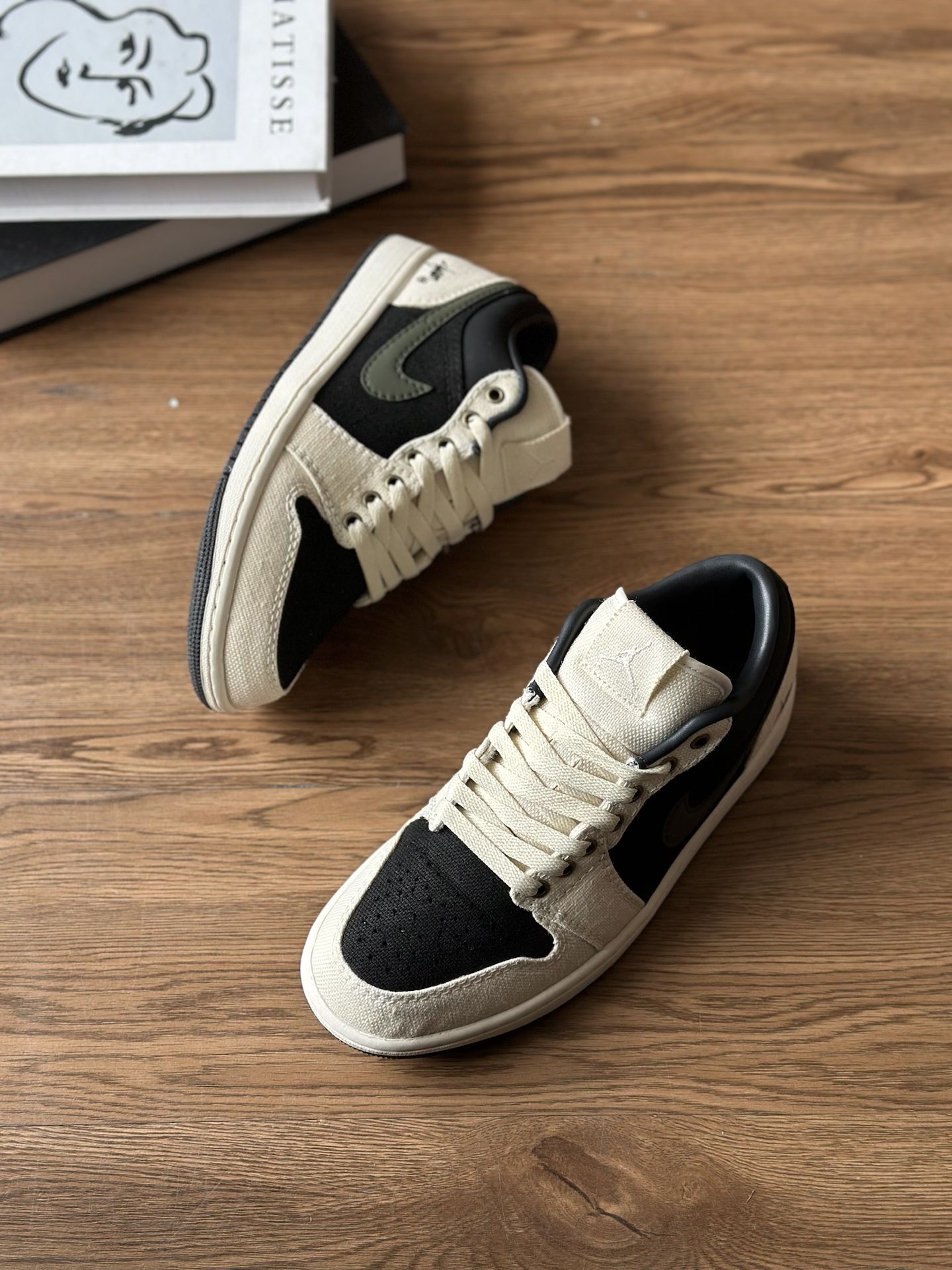 一看到就被戳中——米白帆布+黑块拼接,像把简约潮感揉进了细节里,鞋舌的飞人标低调又有辨识度,透气孔设计还藏着实用小心思。 鞋面是软而挺括的帆布材质,脚感轻便不闷脚,低帮版型衬得脚踝纤细,小个子穿也不拖沓。最妙的是适配度,搭牛仔裤显随性,配工装裤添利落,随便一蹬就能让穿搭“潮得毫不费力”。