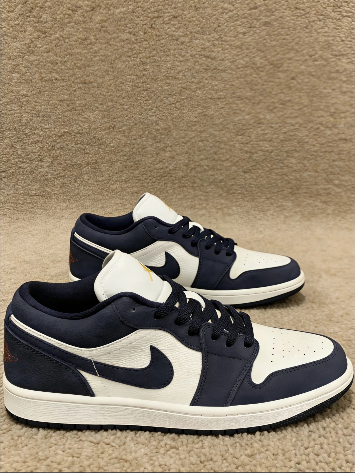 这双aj 1海军蓝棘皮和白皮质的拼接很有复古感,我40码的脚上脚后鞋型显得挺利落,不会很笨重,包裹感也比较强,日常搭配T恤,牛仔裤,工装裤都很合适,走路包裹感也不错,出街挺舒服的
