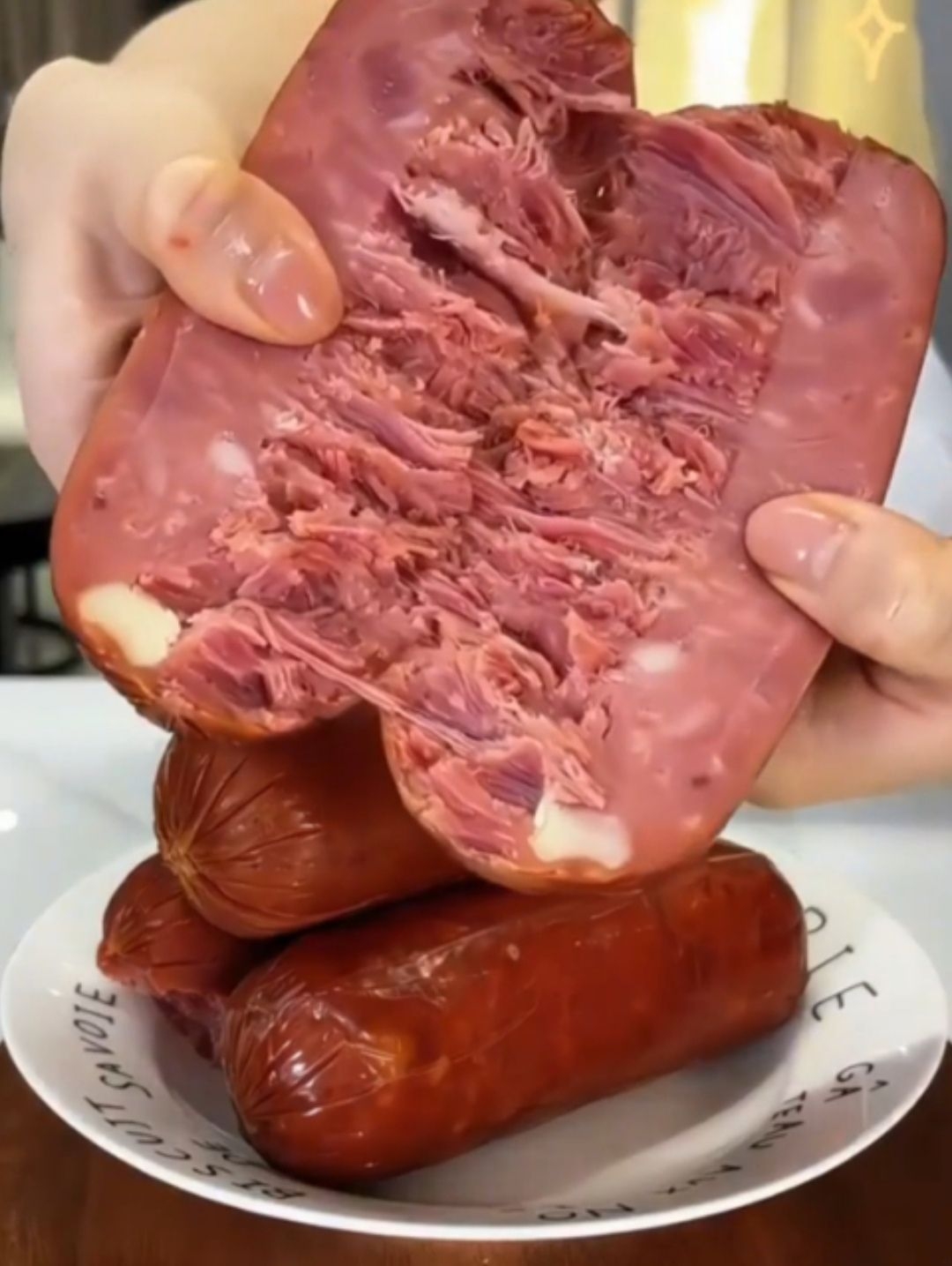快听我说啊姐妹们!! 这根青岛老火腿~~ 直接颠覆我对火腿的认知! 掰开瞬间肉香混着果木香扑面而来 里面全是丝丝分明的猪腱子肉! 纹理清晰到能看到肉筋交织 完全不是那种粉乎乎的口感! 非遗工艺真的藏不住匠心! 用果木明火熏烤 外皮烤得微微焦脆 咬下去先尝到果木的清甜焦香 接着是紧实弹牙的肉质!! 越嚼越香,咸淡刚好一点不齁 配料表超干净~~ 第一位就是猪腱子肉 没有乱七八糟的防腐剂!! 给孩子吃、...