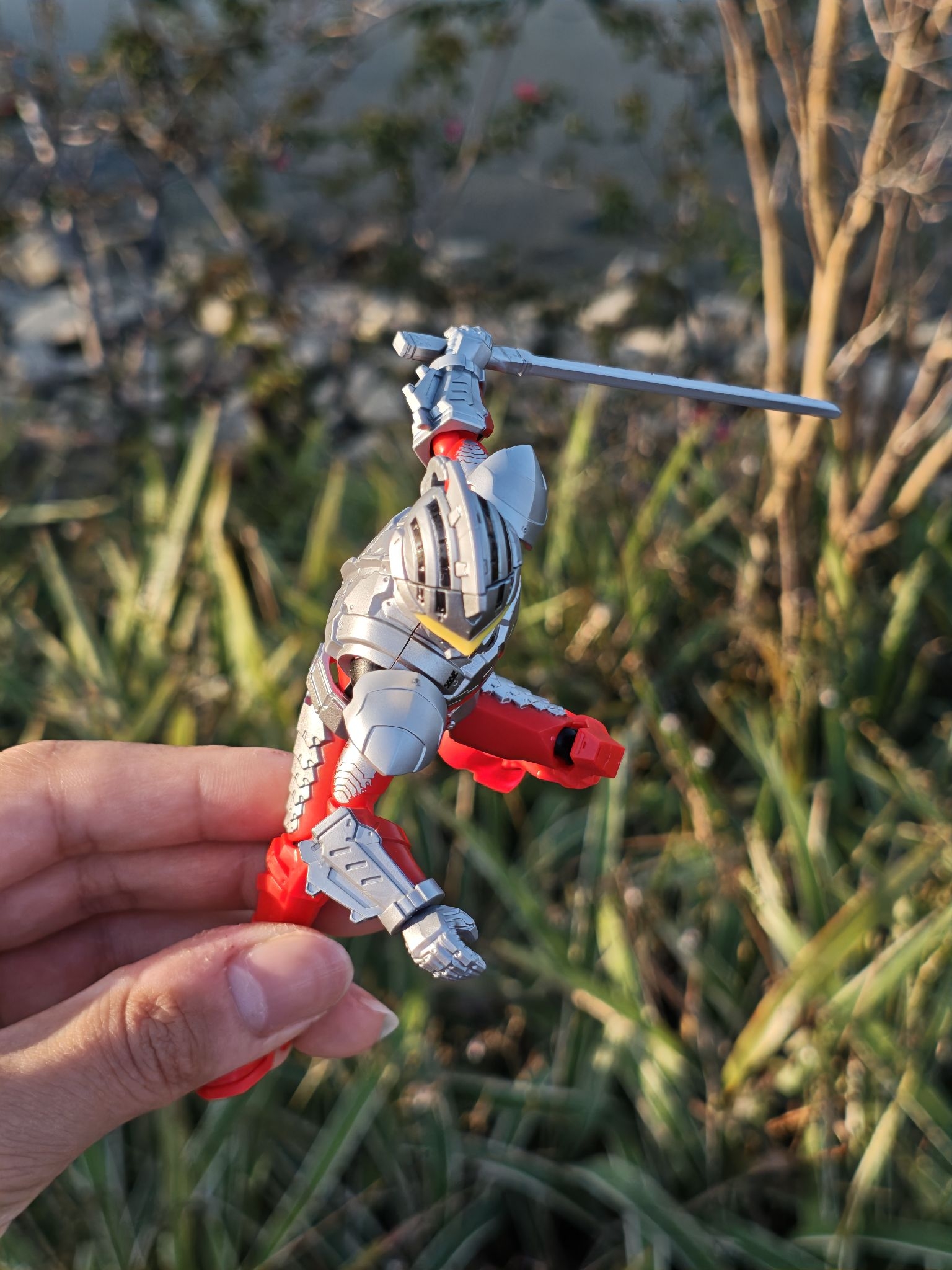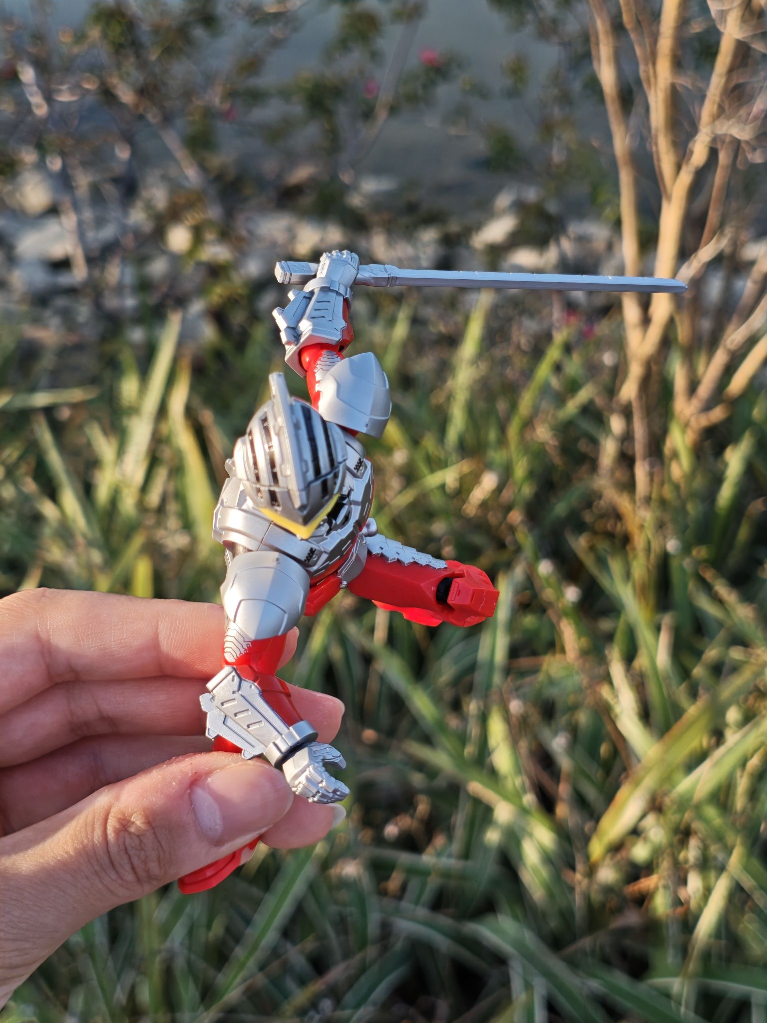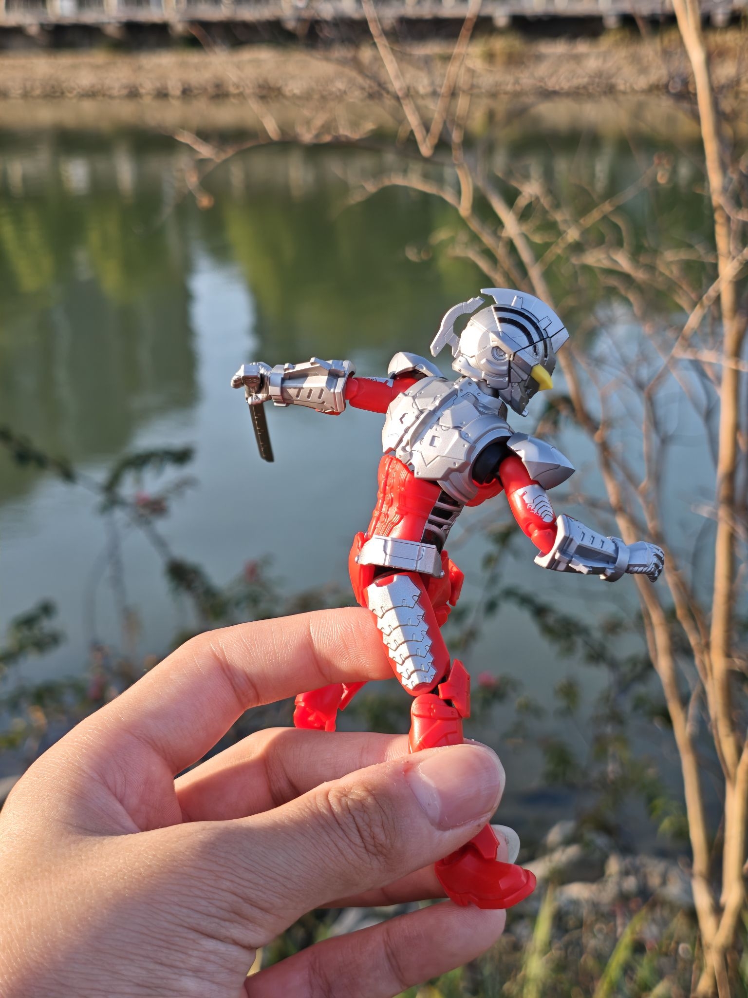 带着我的布鲁可机动赛文出来晒晒太阳🌞 湖边的风一吹,连机甲都变得温柔起来。 红银配色在春日绿意里格外亮眼。