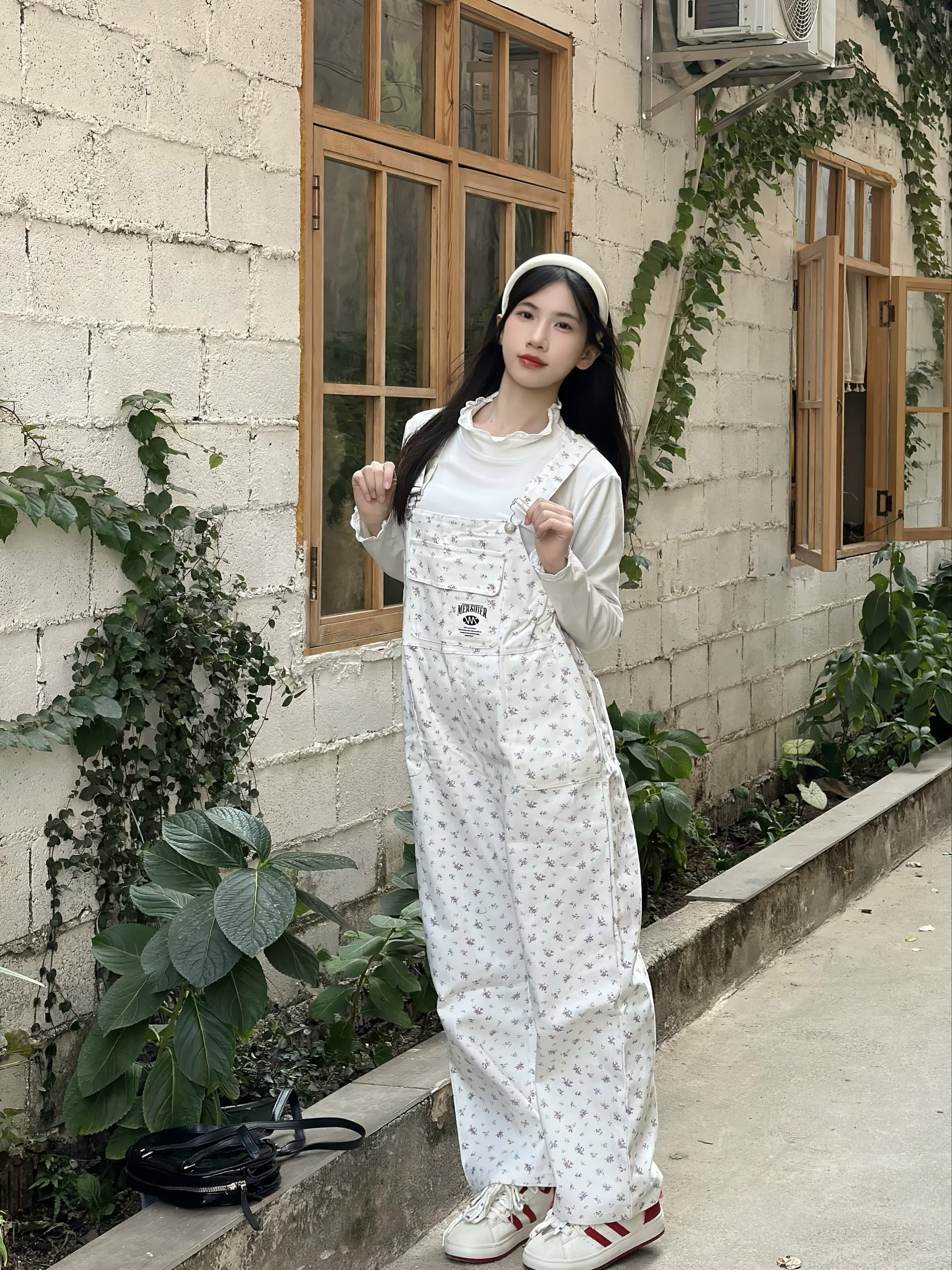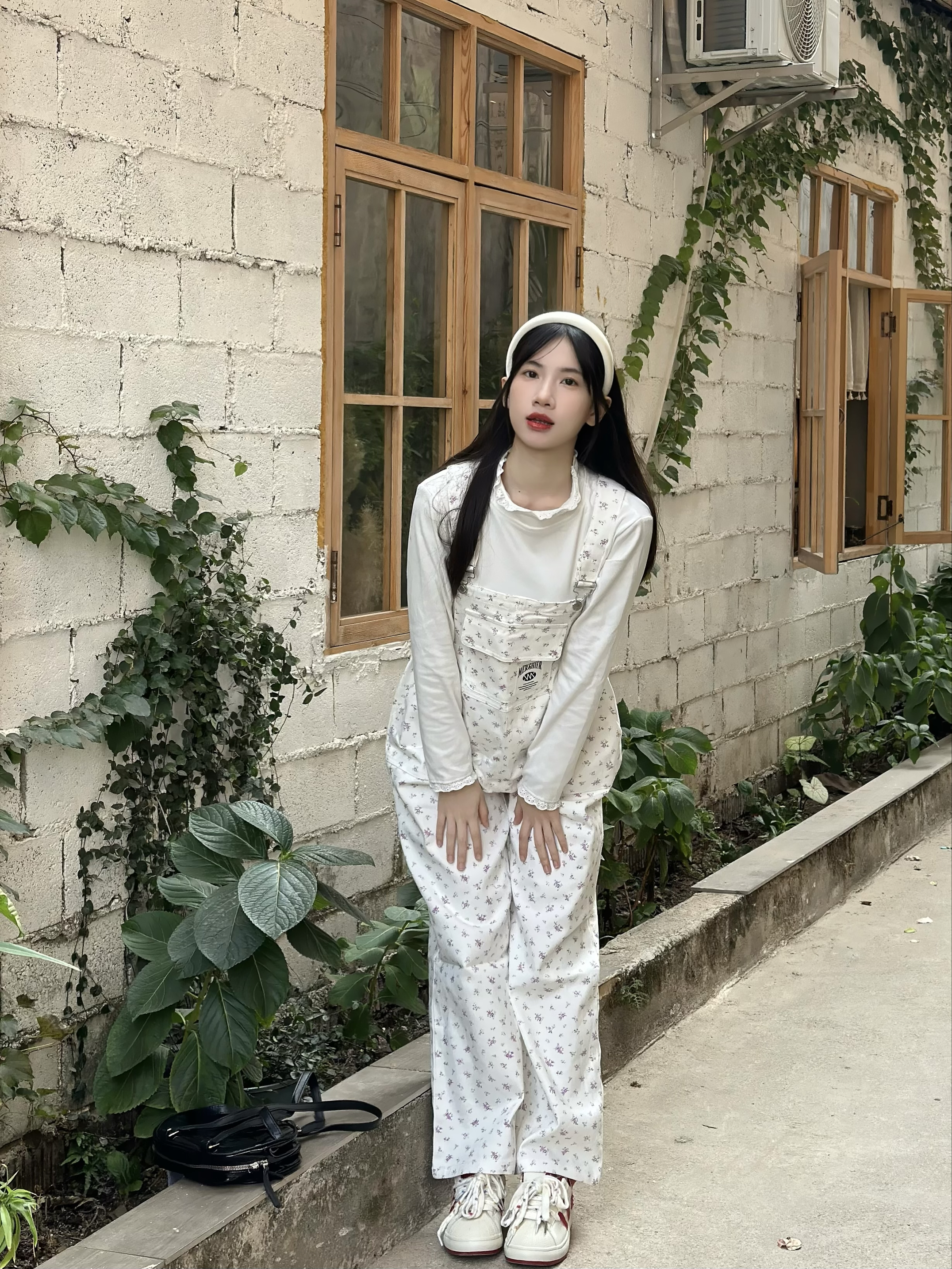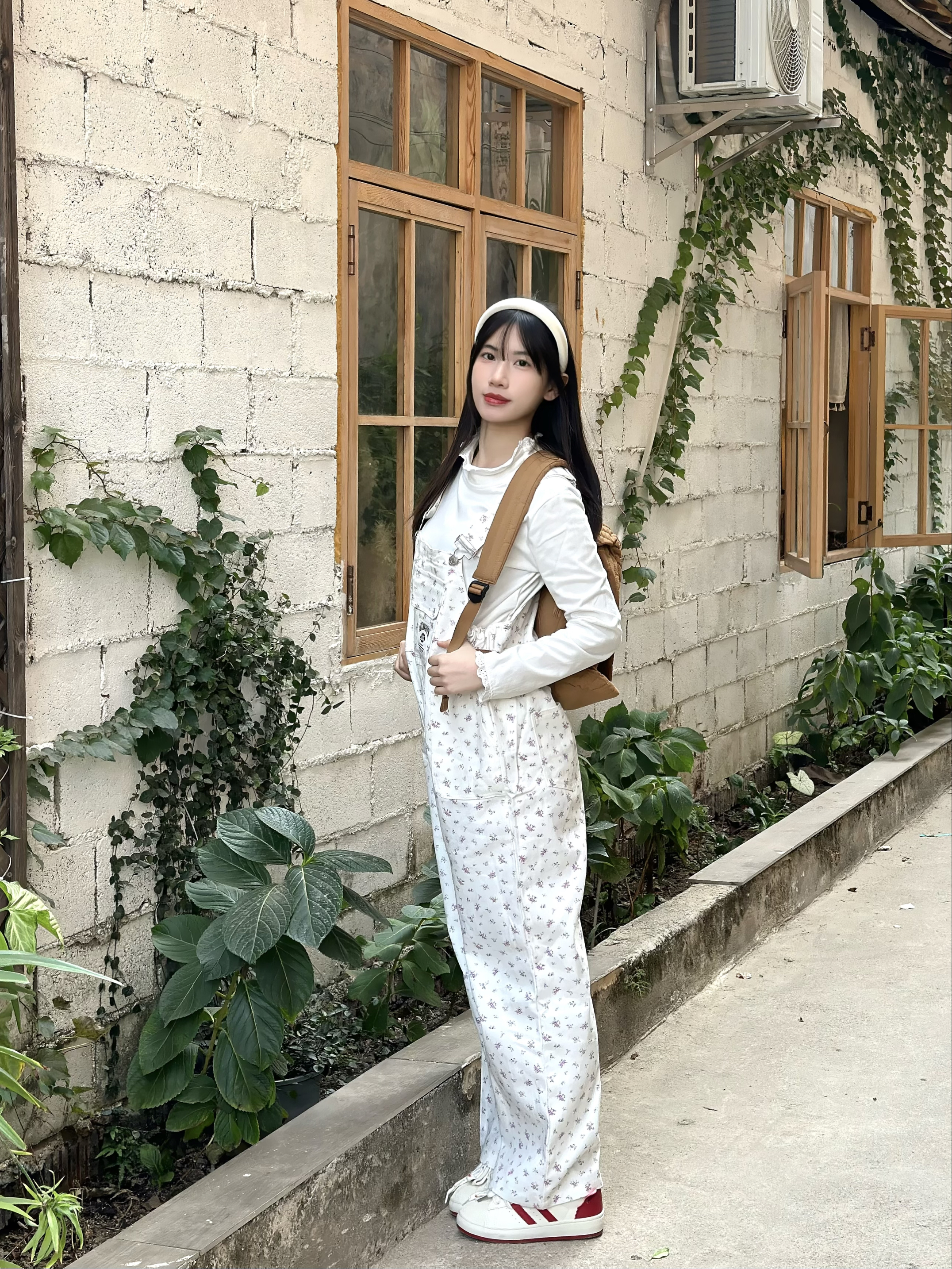 软乎乎的碎花背带裤太适合春天啦 米白底+细碎小碎花 温柔又减齢 阔腿版型藏肉显瘦对梨形身材超友好~ 内搭木耳边白打底叠戴白色发箍 再配红白条纹德训鞋 整套日系感拉满 出门逛街/探店都很出片