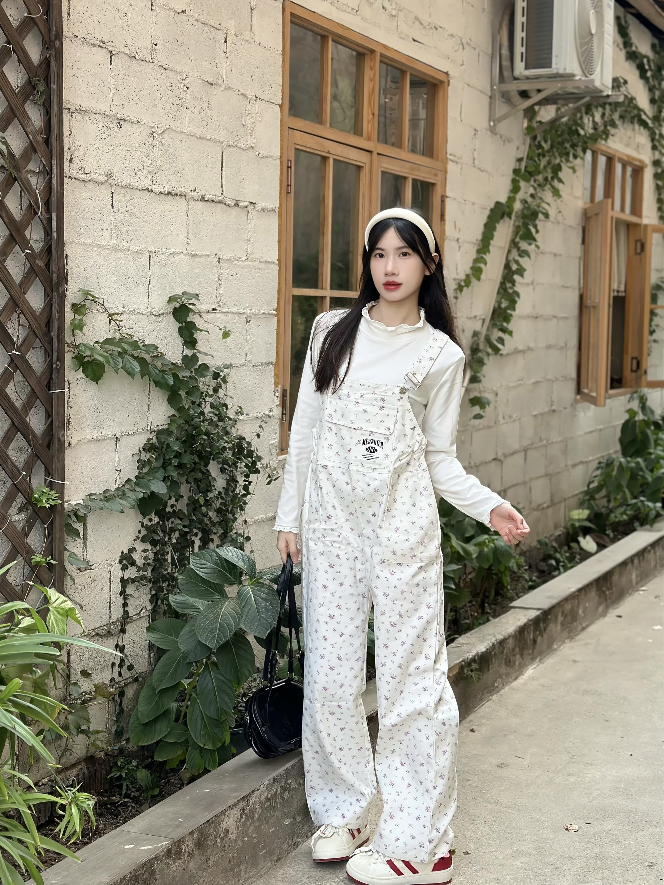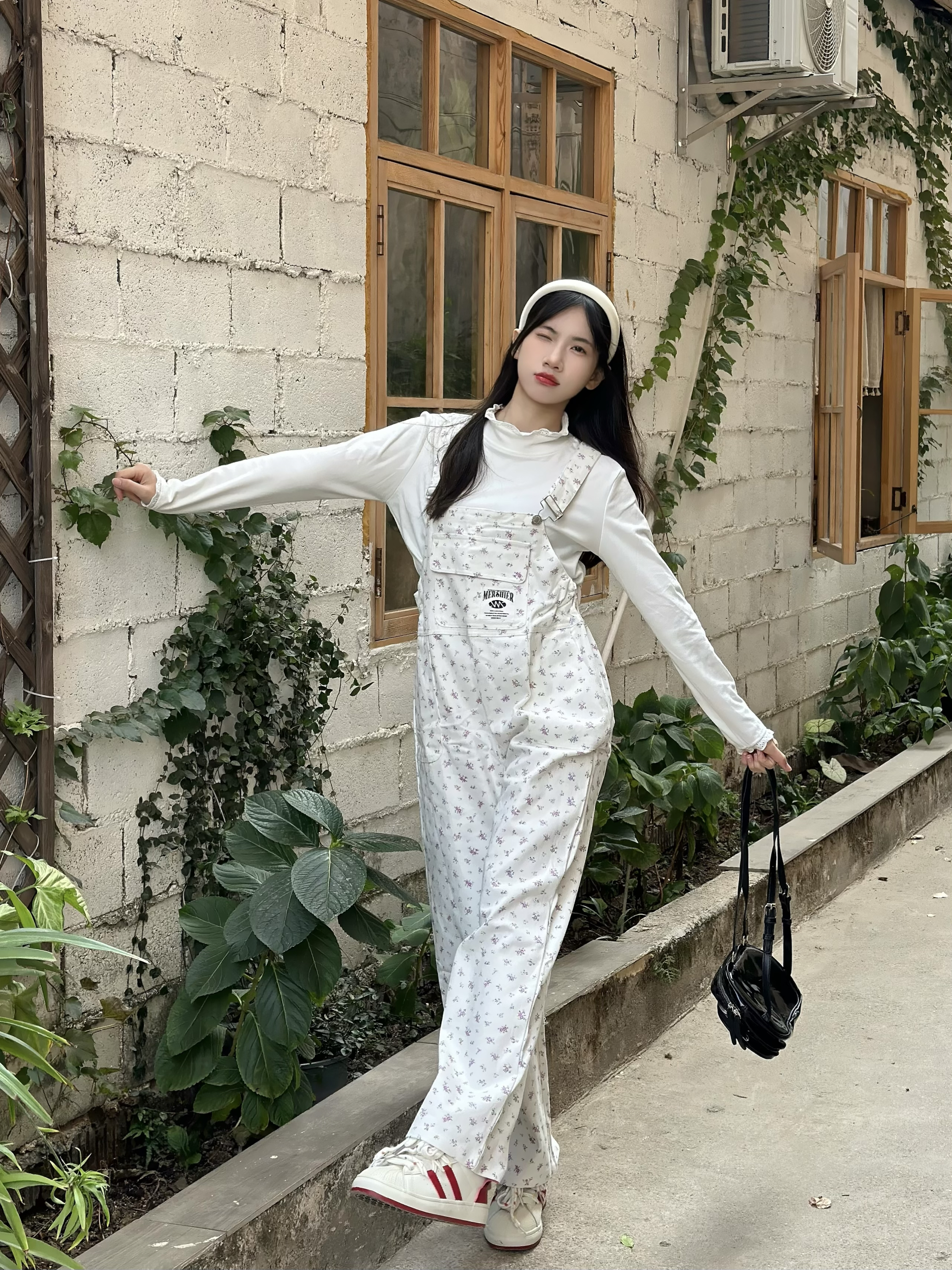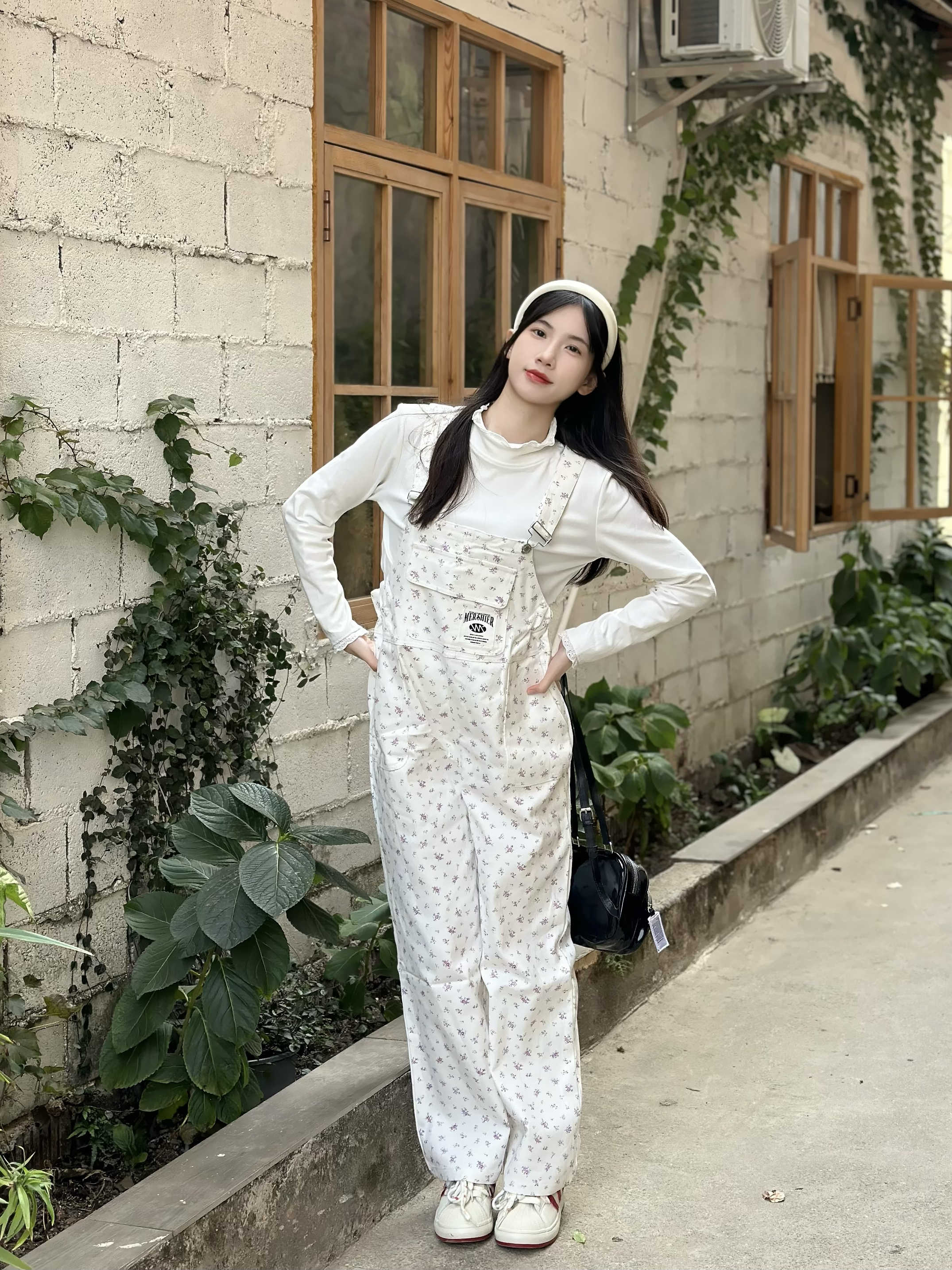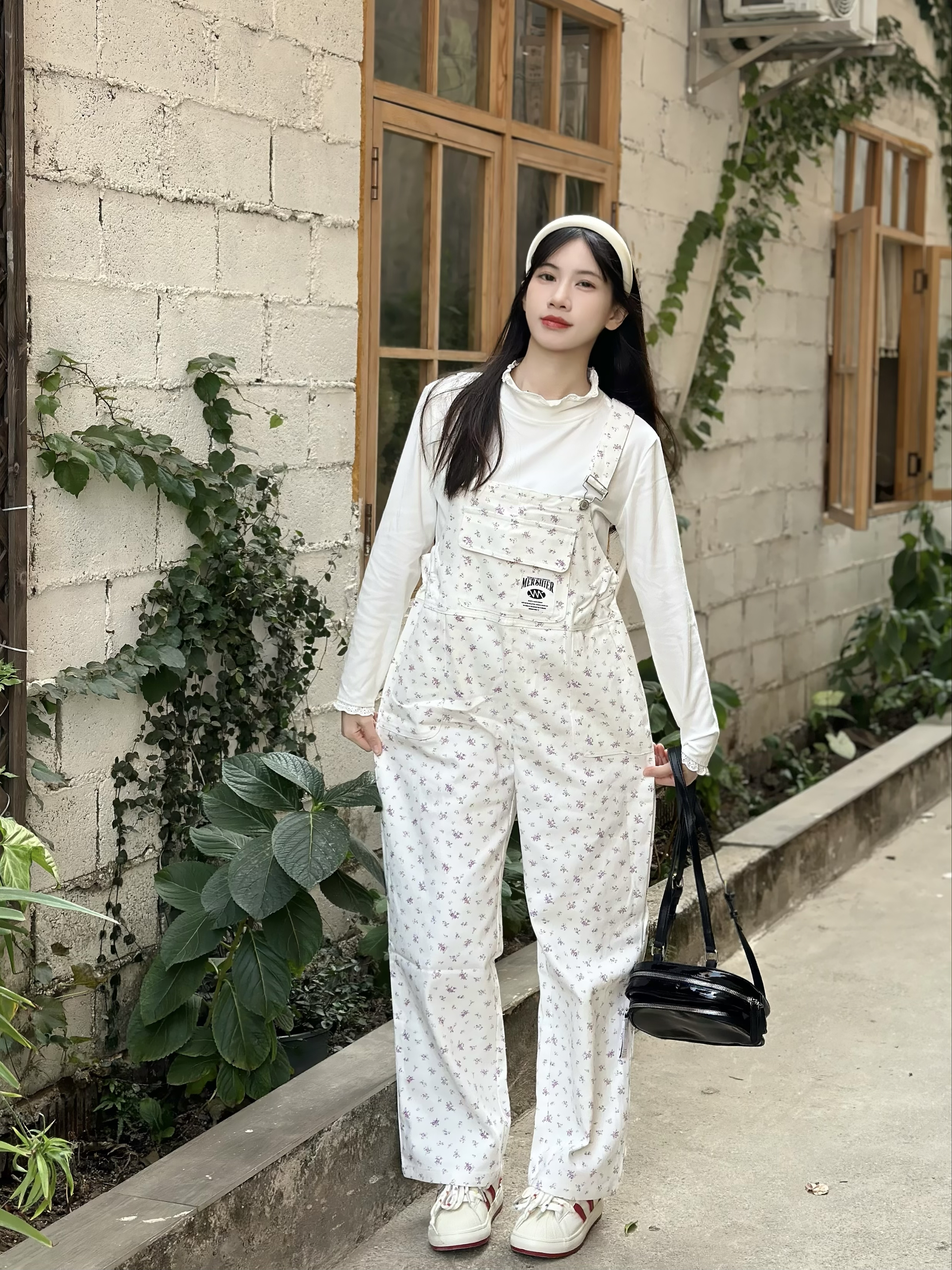 软乎乎的碎花背带裤太适合春天啦 米白底+细碎小碎花 温柔又减齢 阔腿版型藏肉显瘦对梨形身材超友好~ 内搭木耳边白打底叠戴白色发箍 再配红白条纹德训鞋 整套日系感拉满 出门逛街/探店都很出片