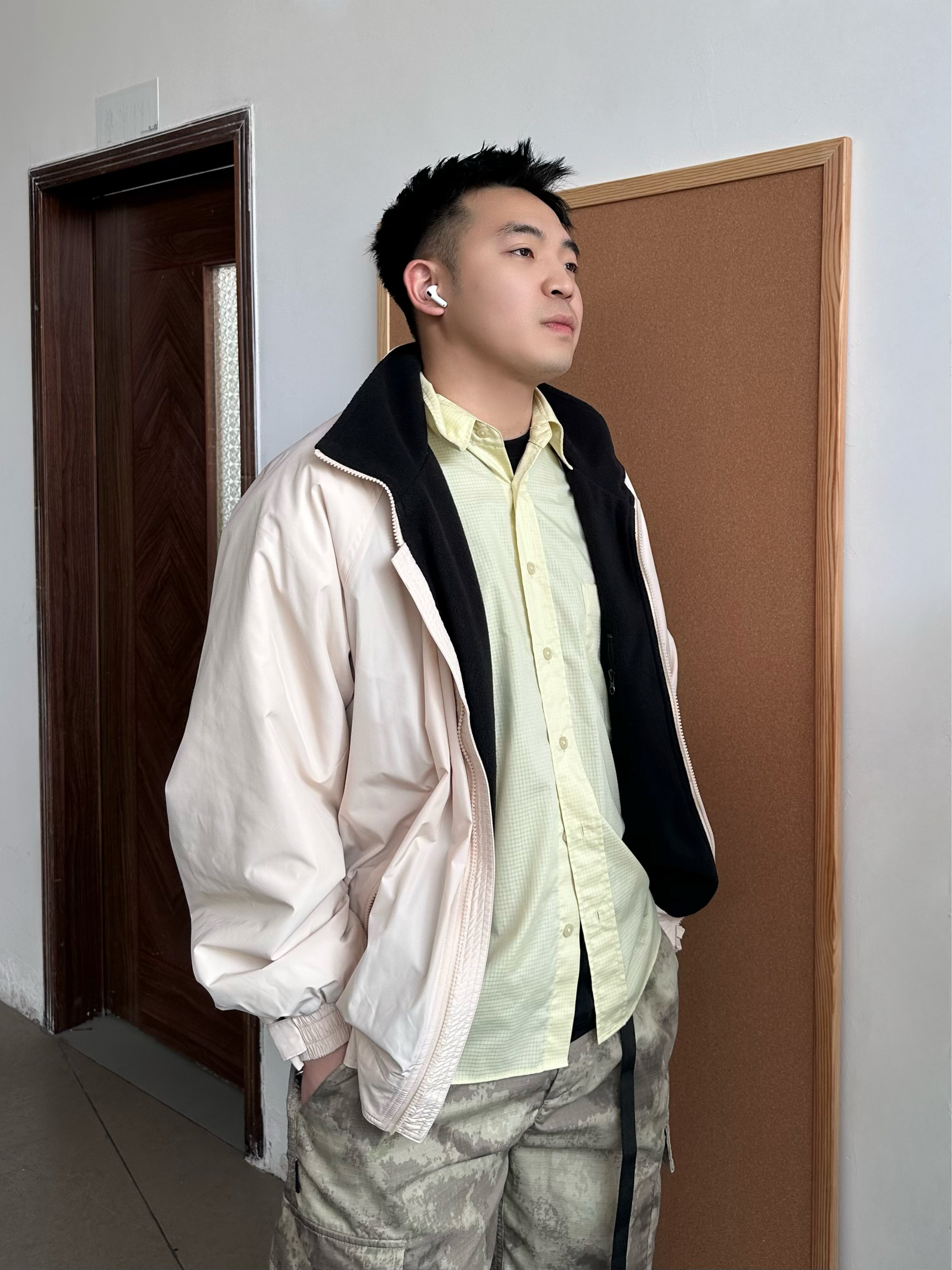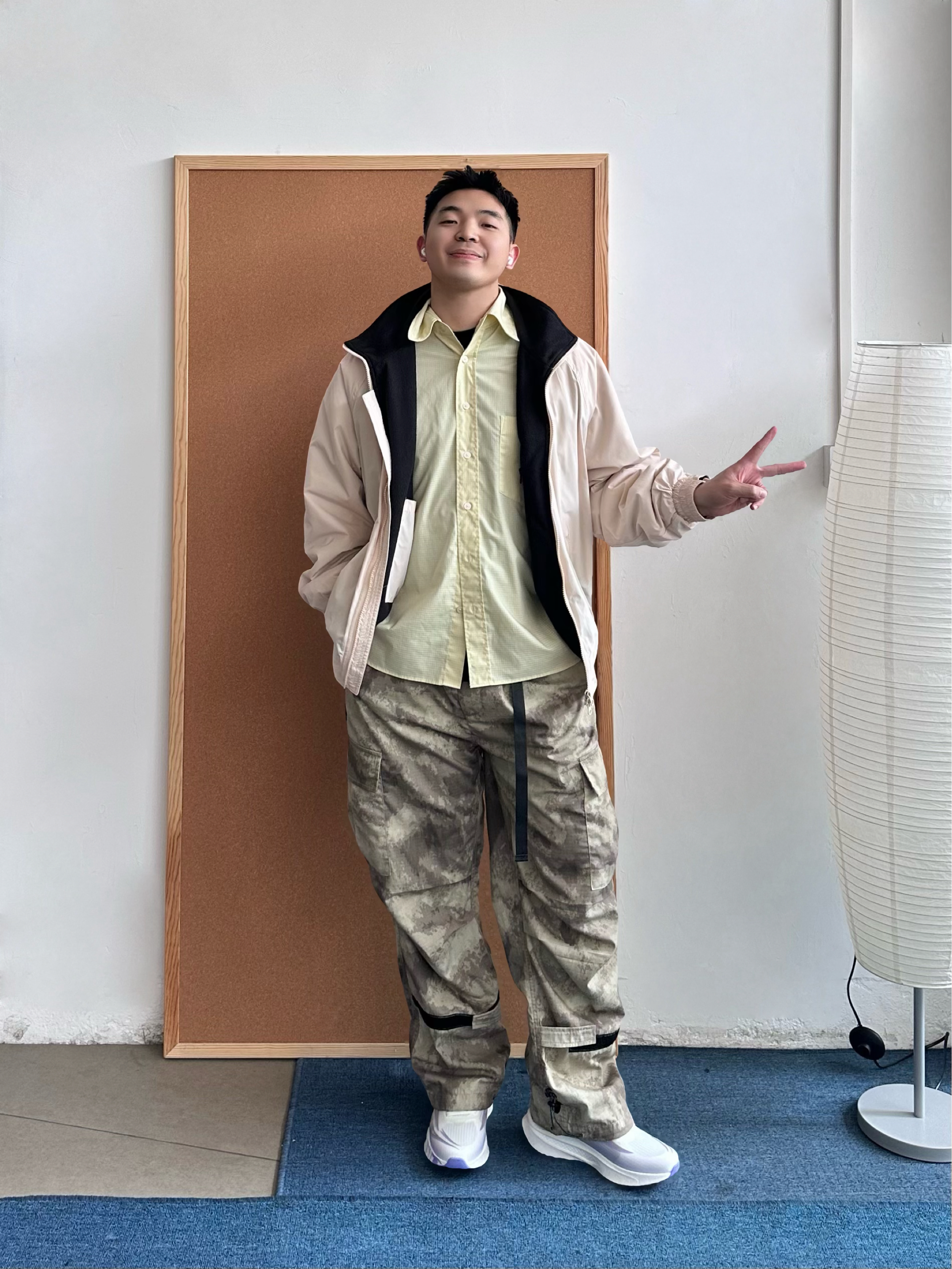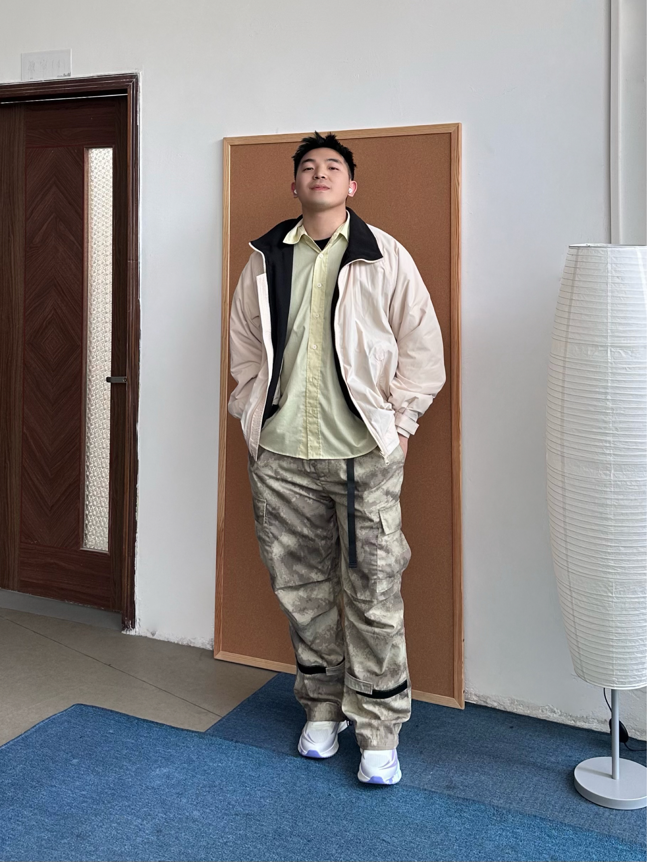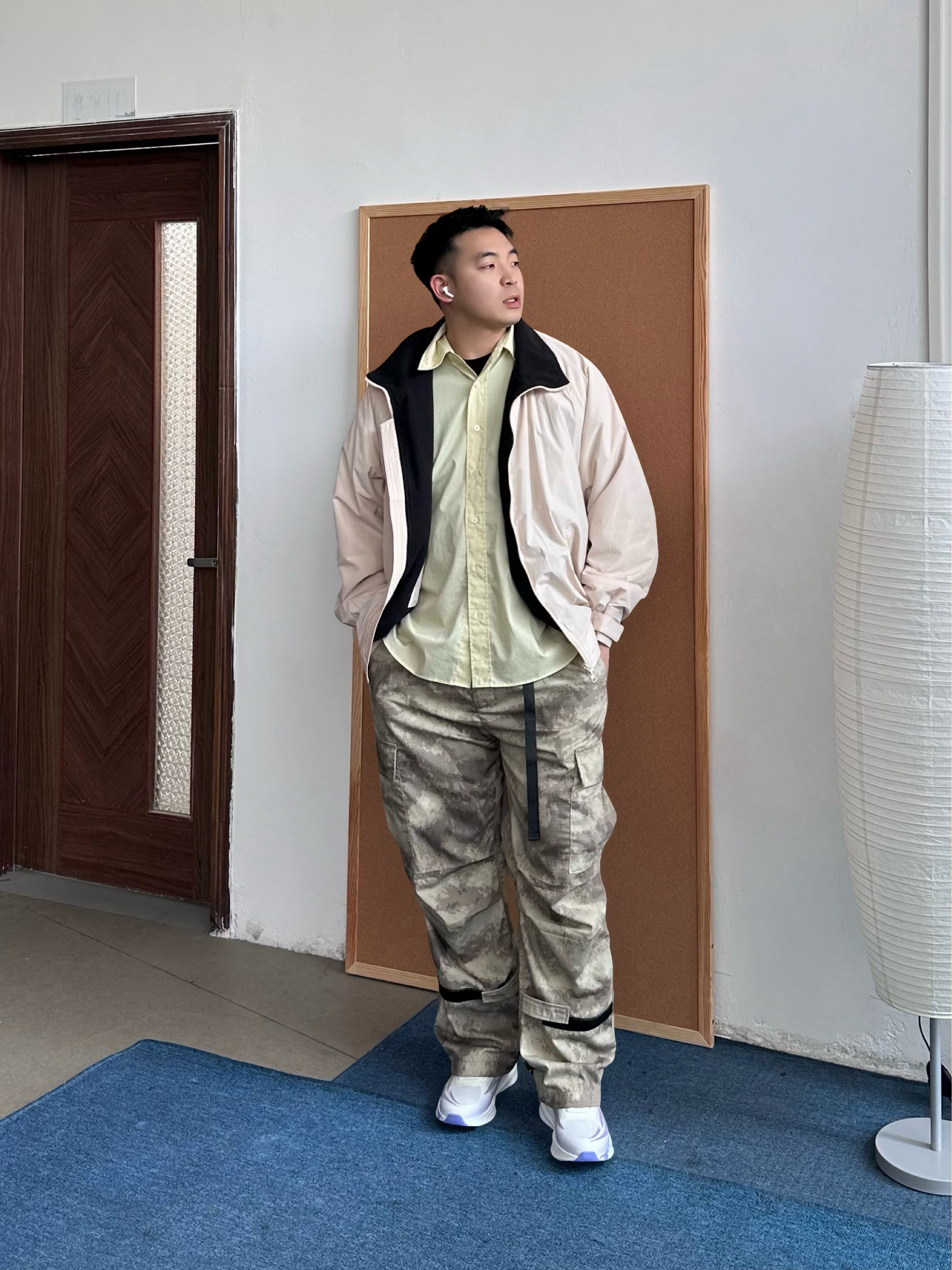 👔 内搭:我里面先穿了一件浅黄色衬衫,颜色很柔和,早春穿不会太沉闷,还能给整套搭配加一点清爽感。 🧥 外套:外面叠一件米色外套,版型干净利落,和浅黄色衬衫属于同一温柔色系,看起来会更协调。 👖 下装:裤子我选了一条浅迷彩工装裤,迷彩图案自带街头感,也是整套里最吸睛的单品。 👟 鞋子:脚上搭一双紫白色透气跑鞋,颜色稍微跳一点,但和迷彩搭在一起反而更有活力。