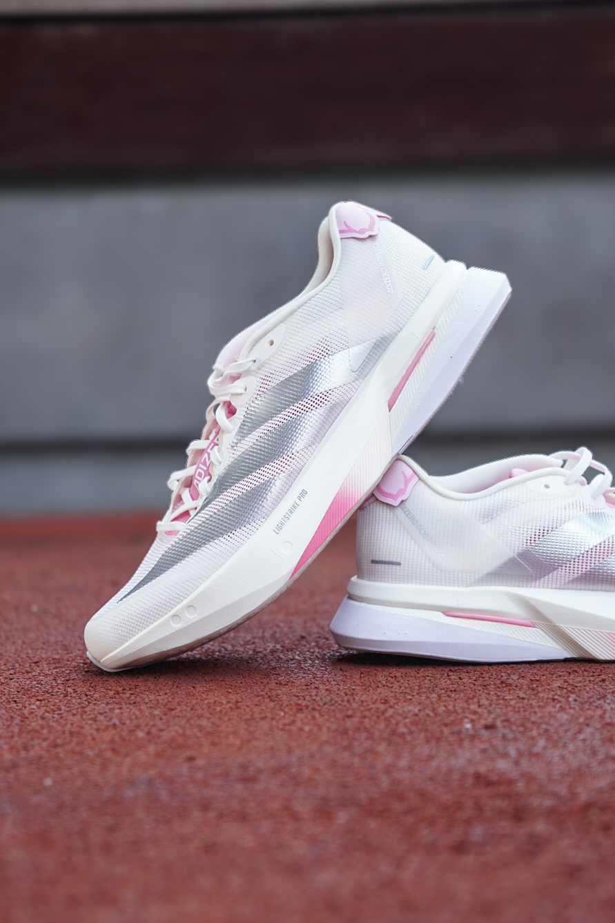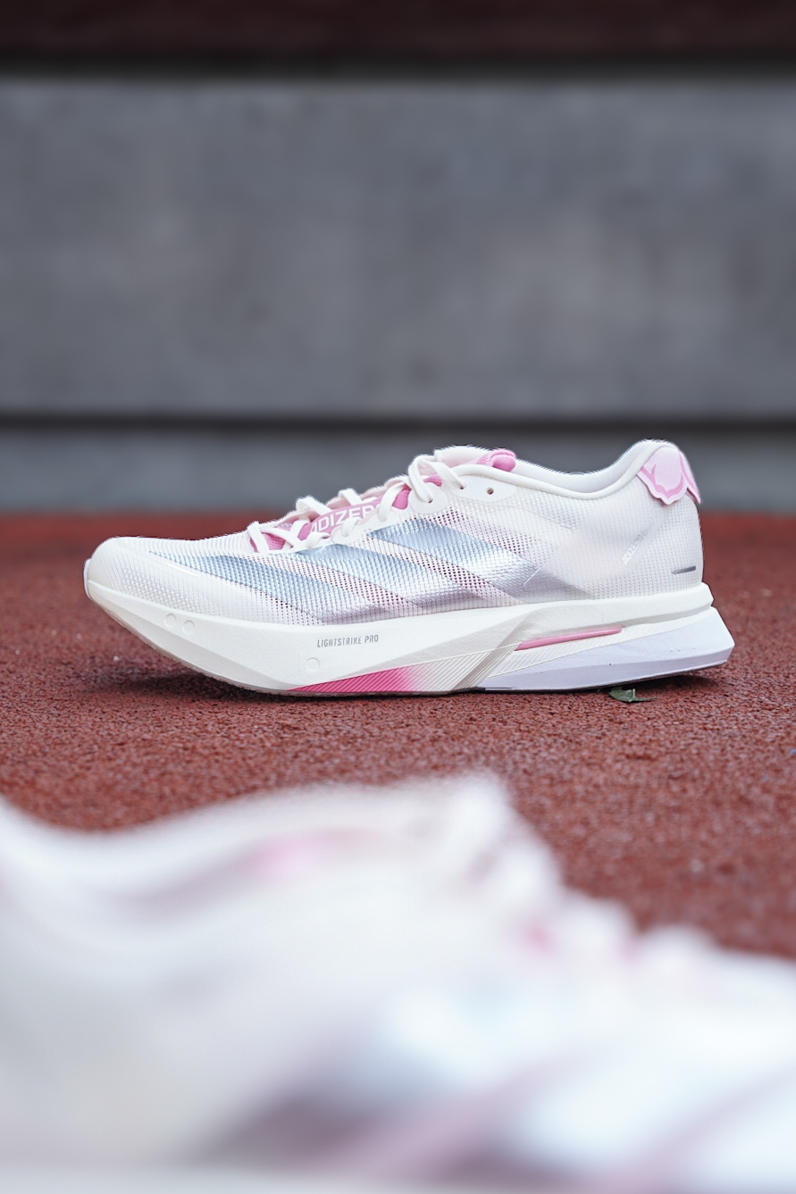 当春天万物复苏,告别沉闷的跑鞋搭子,今天分享一双当樱花粉撞上专业碳板跑鞋,而这双“樱花限定”直接把春日氛围感拉满。 首先主色调是干净的米白+柔粉渐变,鞋舌、后跟点缀樱花粉,三条杠用银灰色线条勾勒,鞋面是半透明的工程网布,轻薄透气,能隐约看到内部结构,夏天穿也不会闷脚。 LIGHTSTRIKE PRO泡棉+前掌嵌入碳板,脚感是偏韧弹的而非很直接的软塌,但是对于我这种后掌落地的来说,后跟落地的时候...
