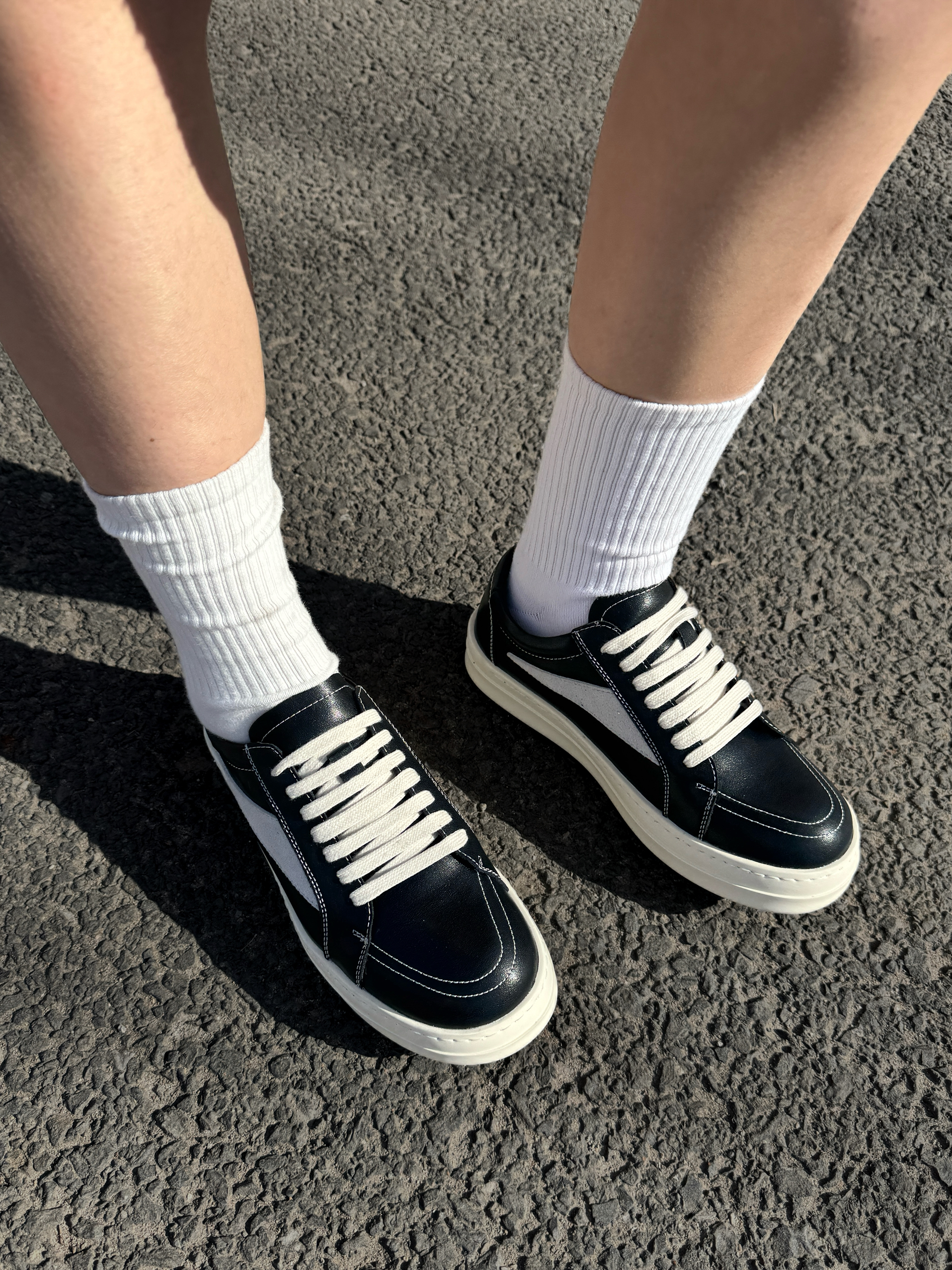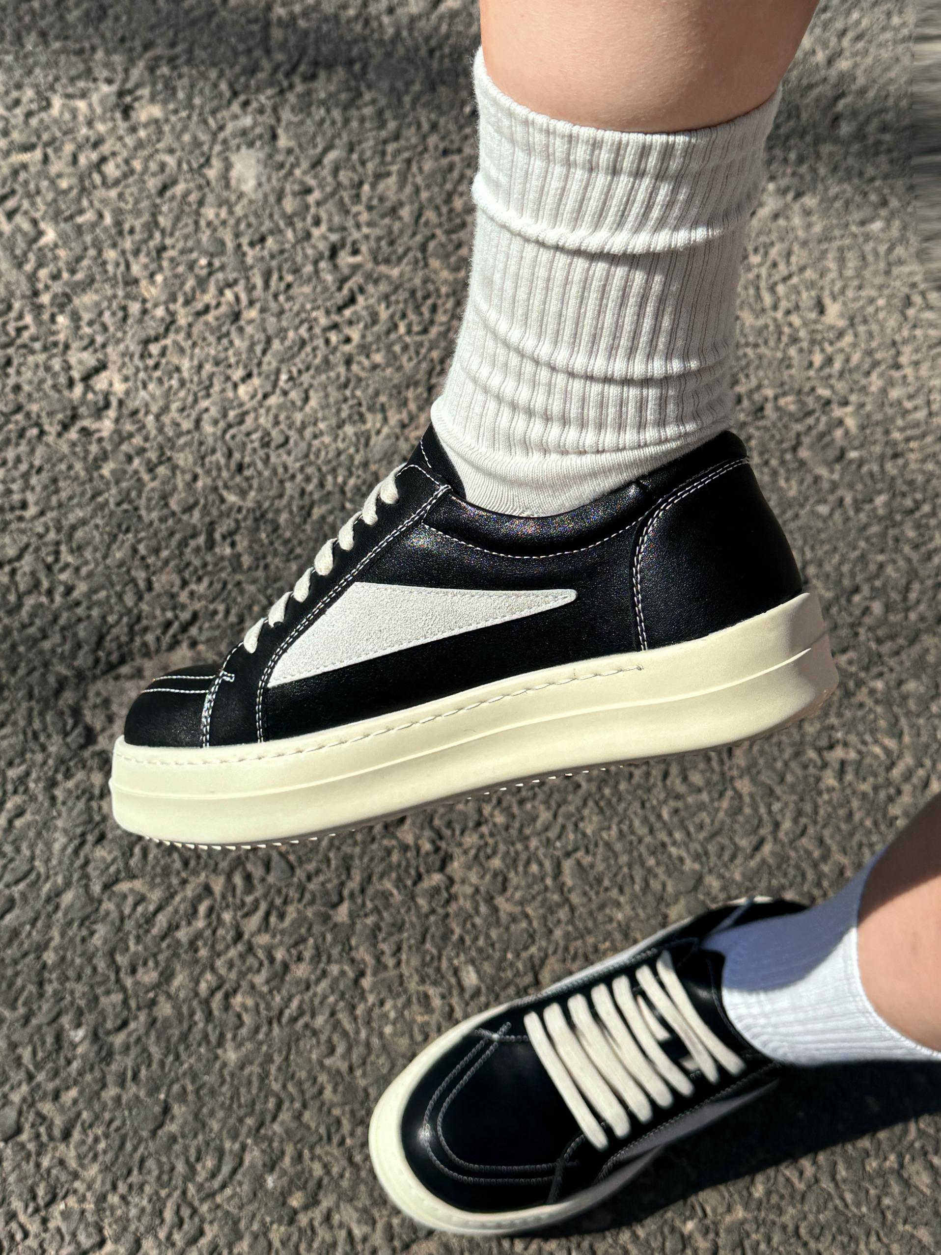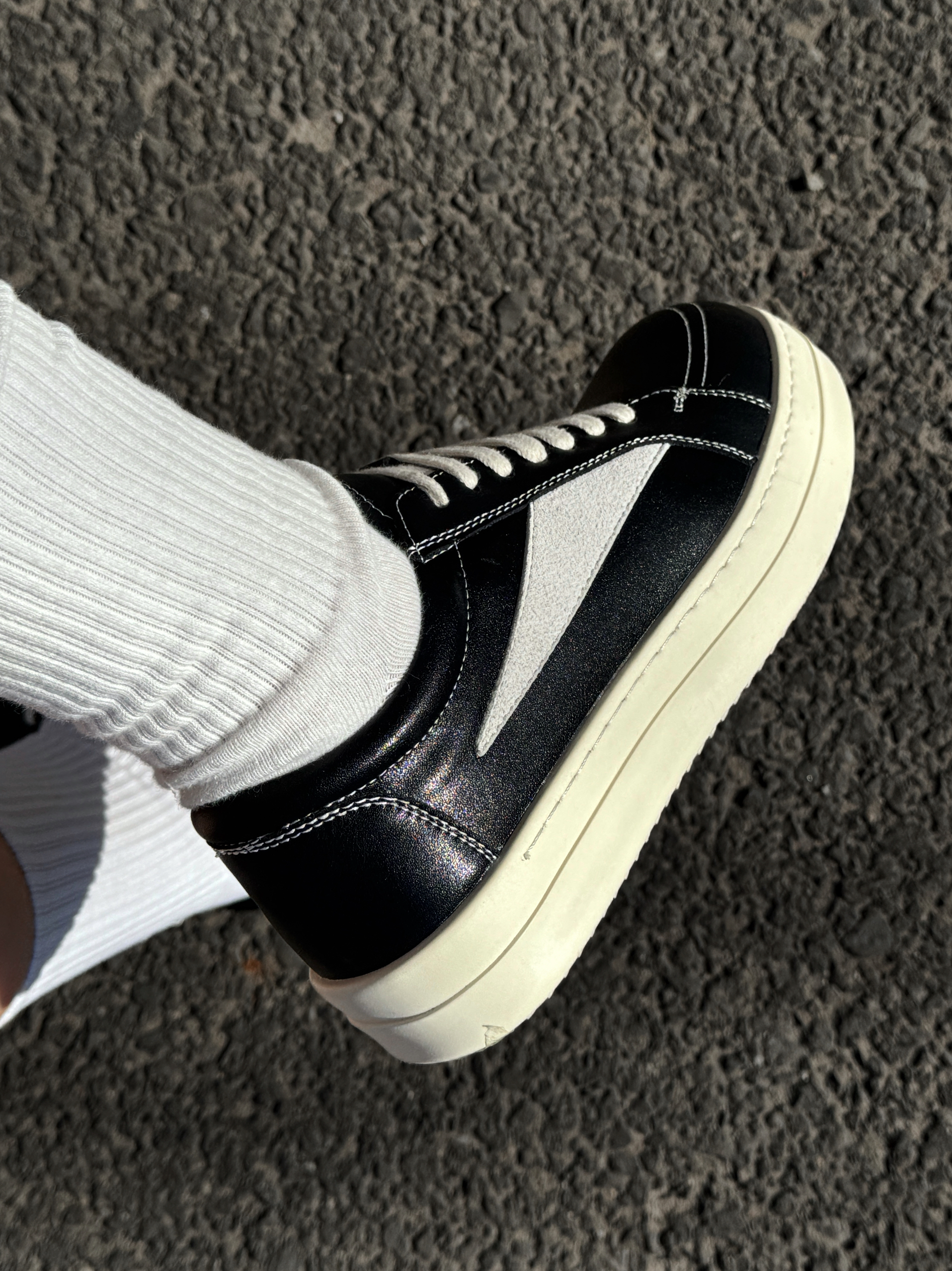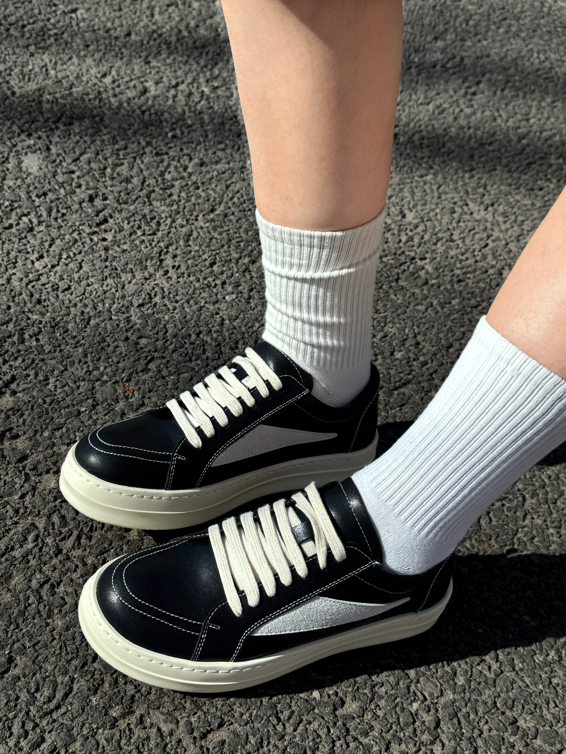 最近对增高鞋很有兴趣 其实主要是因为它可以拉长我的腿部线条 视觉上可以更好地展示比例✨ 看起来也会更有气场一些 这双板鞋黑白碰撞很是经典 今天我用它来搭配了我的短裤 复古感一下就上来了 鞋子可能有点偏大 我穿了一个厚的袜子🧦 但是鞋子很软 是那种弹弹的软,而且包裹性很好👌 让我的脚满满安全感🙈 最近一直都很喜欢这种复古松弛感🖤