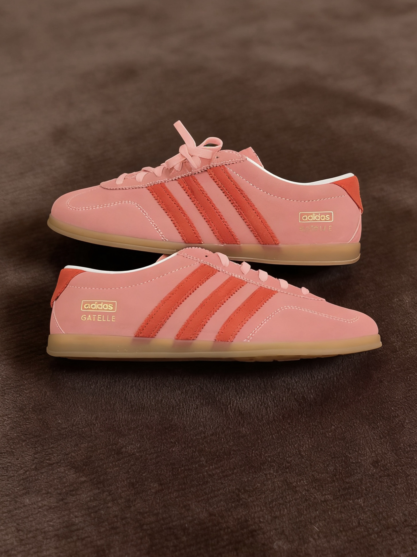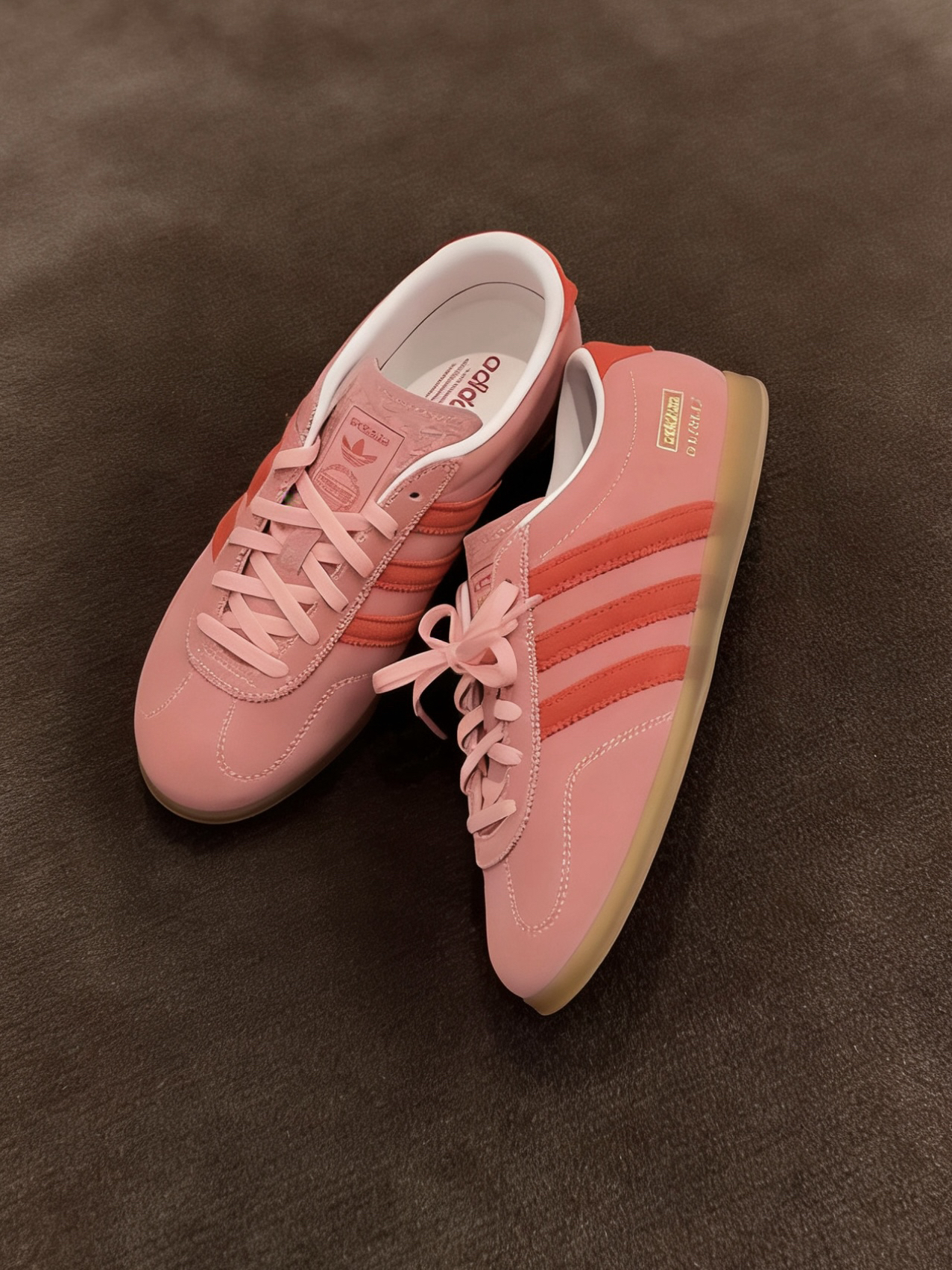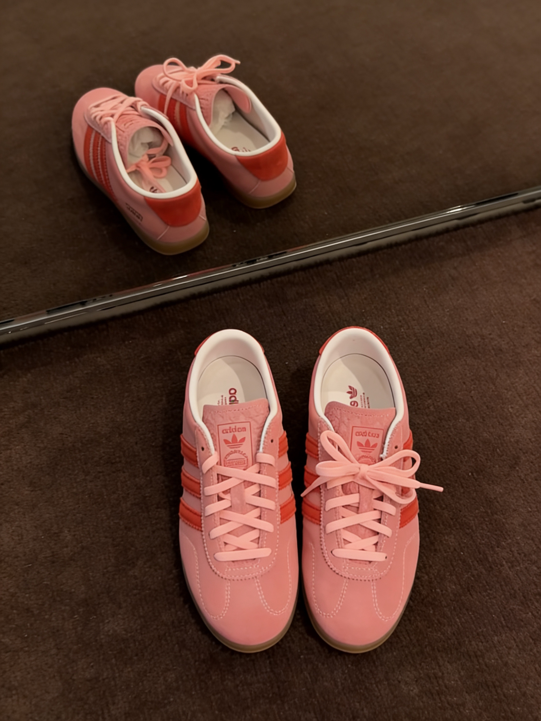 低饱和的柔雾粉麂皮鞋身,完全不是显黑的死亡芭比粉,黄黑皮姐妹上脚也毫无压力,温柔又不甜腻。鞋身的正红三条杠撞色真的太点睛了,中和了粉色的软萌,多了几分美式复古的松弛感,后跟的金色GAZELLE烫金标,细节控直接狂喜,低调又有辨识度,完全没有廉价感。