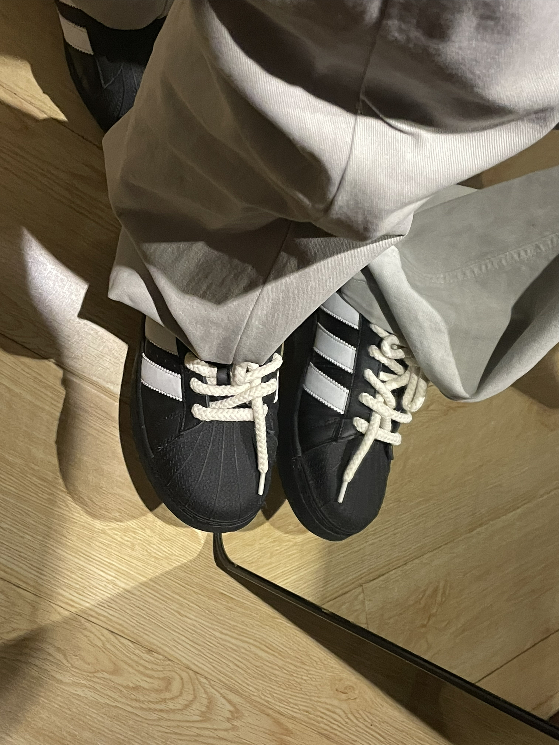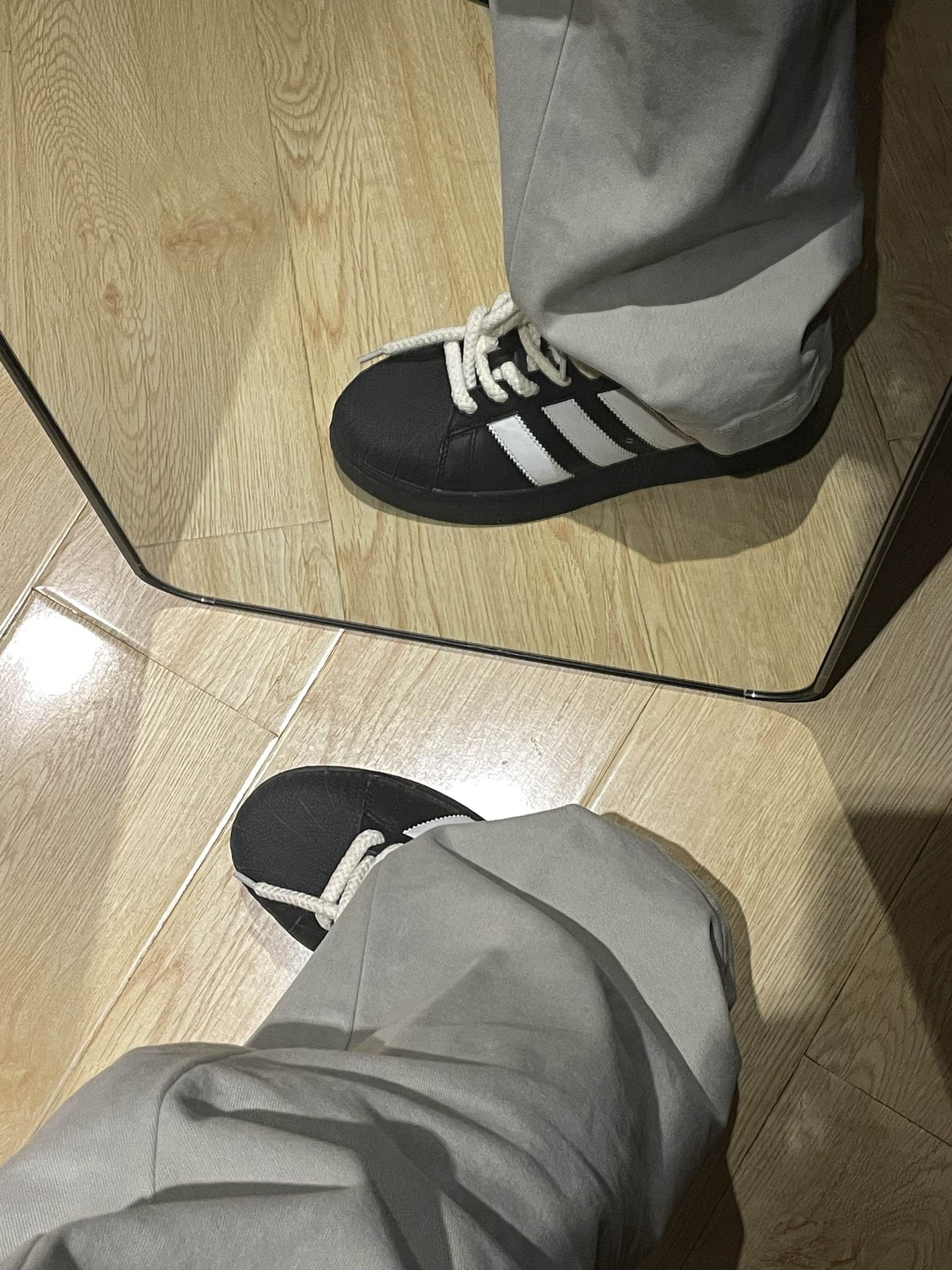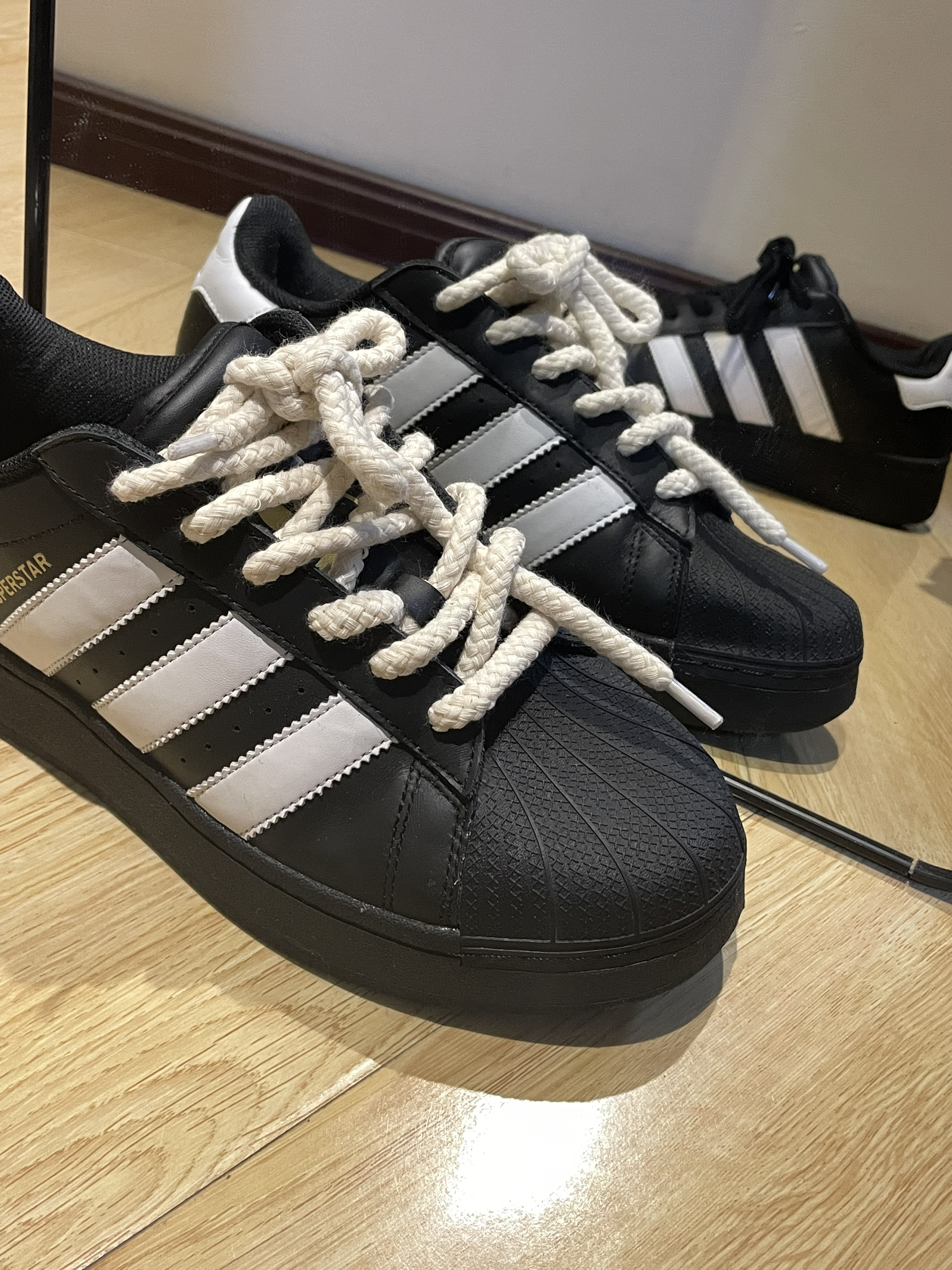 把黑贝壳换了双粗麻绳鞋带,感觉丑帅丑帅的,低成本get到了换新鞋的快乐!