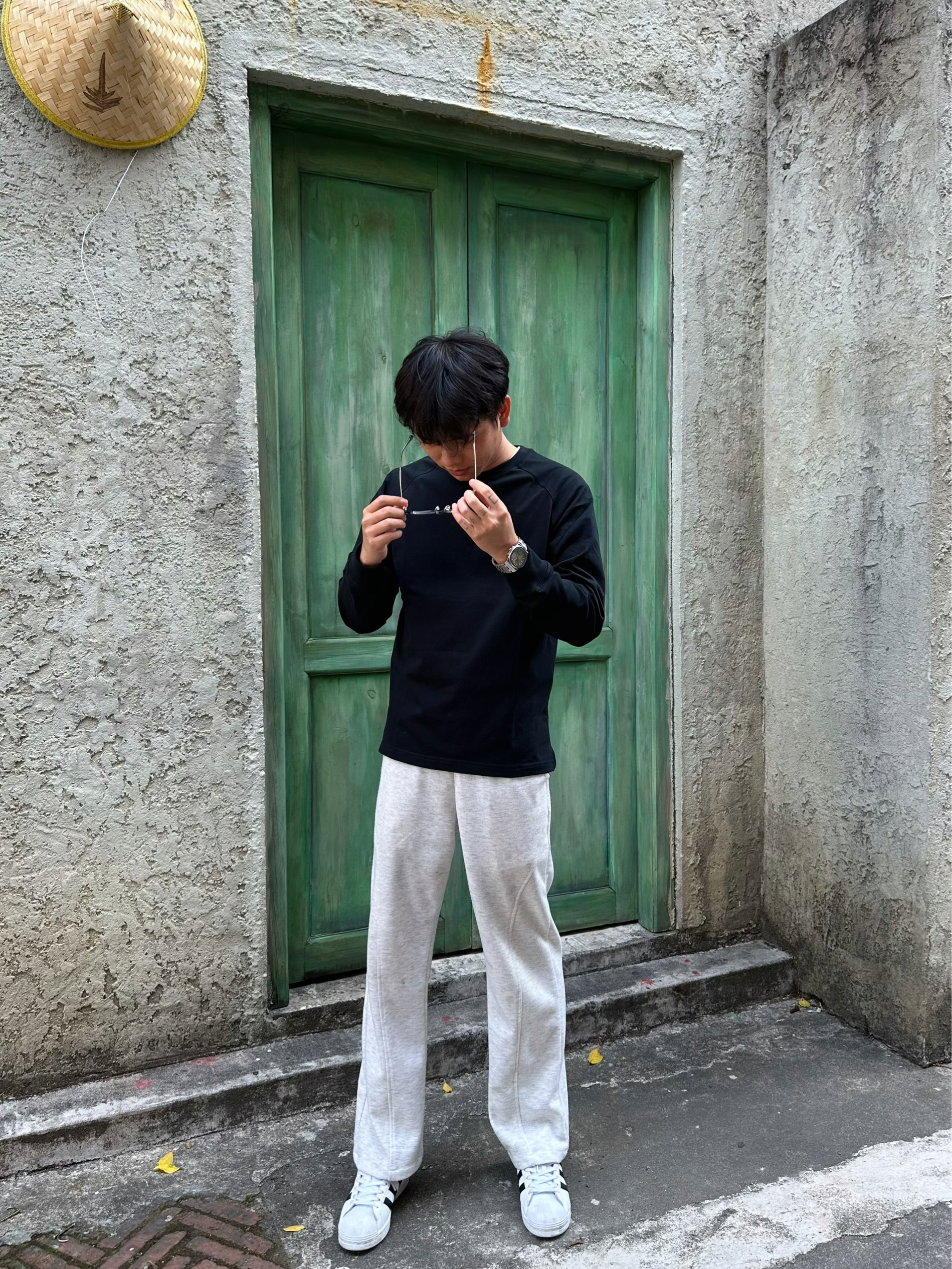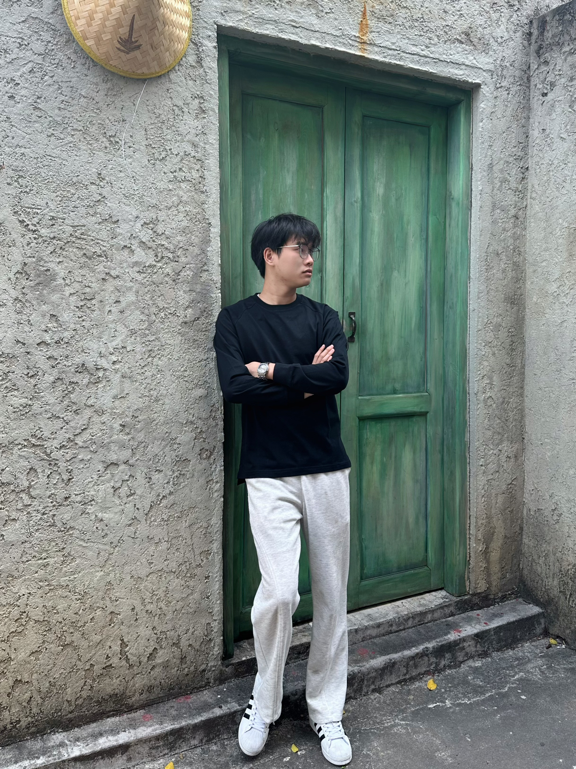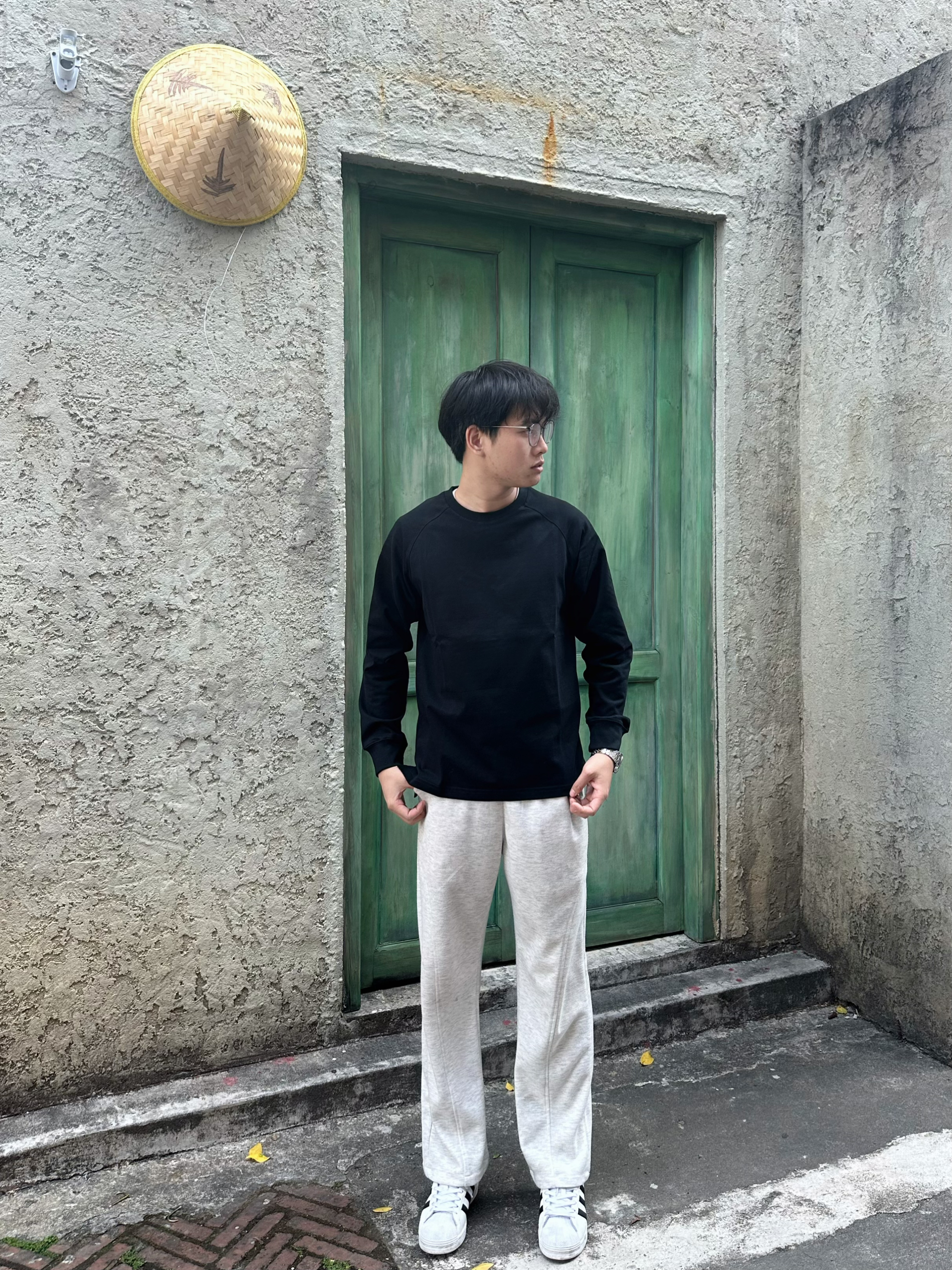 就是日常出门随便抓的一套,没特意凹造型。黑长袖是有点厚度的棉,摸着软但挺括,插肩袖的剪裁刚好贴合肩线,不会显臃肿,而且版型设计很修身,那怕有小肚腩也盖住了 浅灰卫裤是那种糯糯的面料,垂感不错,裤型是微收的,不会贴腿也不会垮,配白鞋就很协调。整体是修身休闲挂,不挑场合,上课、逛巷子里的小店都能穿,舒服又利落,属于穿很久都不会腻的基础款