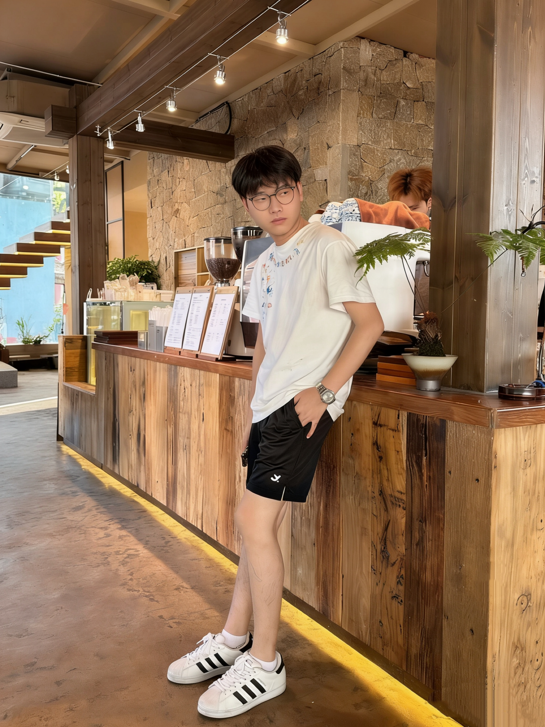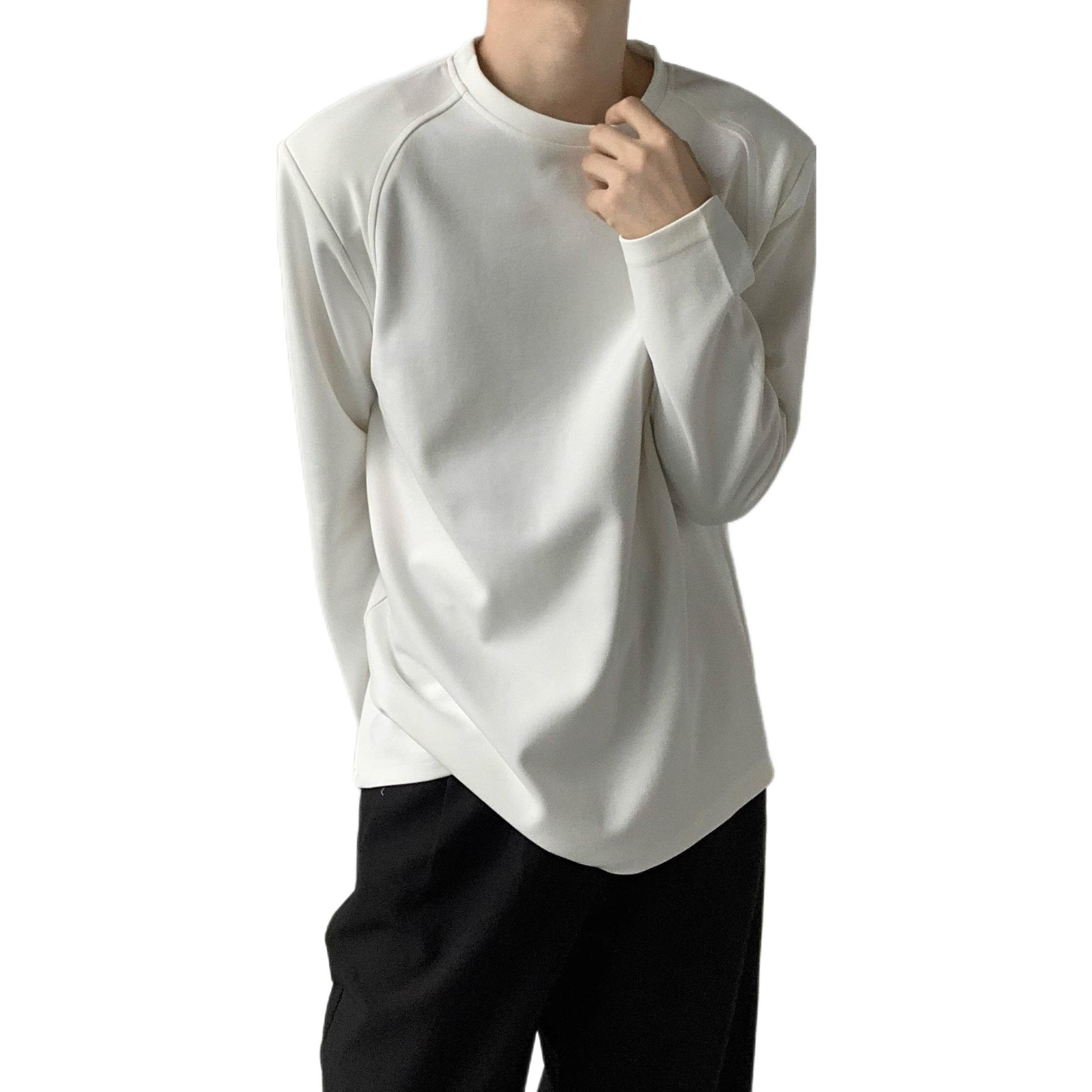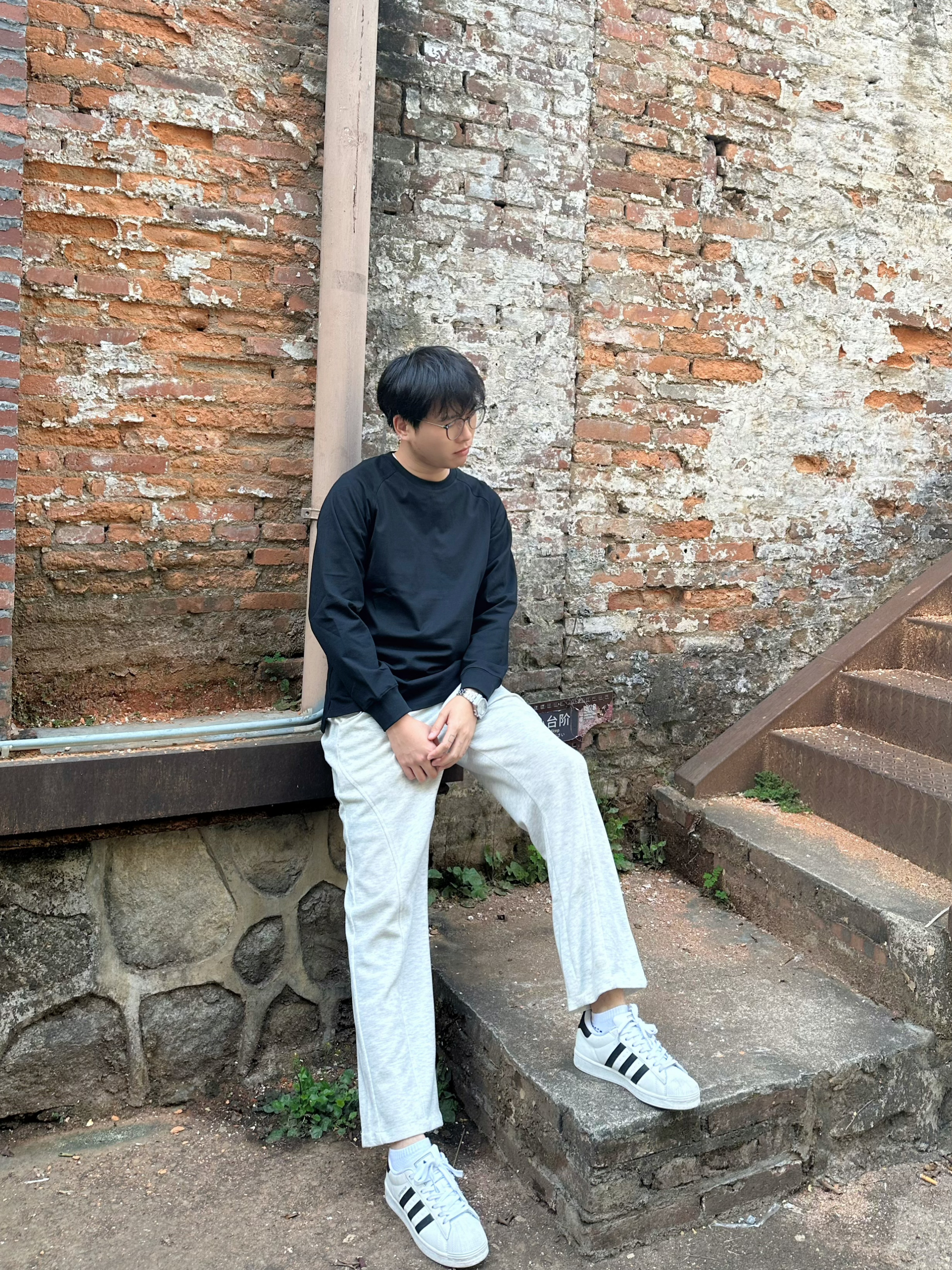 就是日常出门随便抓的一套,没特意凹造型。黑长袖是有点厚度的棉,摸着软但挺括,插肩袖的剪裁刚好贴合肩线,不会显臃肿,而且版型设计很修身,那怕有小肚腩也盖住了 浅灰卫裤是那种糯糯的面料,垂感不错,裤型是微收的,不会贴腿也不会垮,配白鞋就很协调。整体是修身休闲挂,不挑场合,上课、逛巷子里的小店都能穿,舒服又利落,属于穿很久都不会腻的基础款