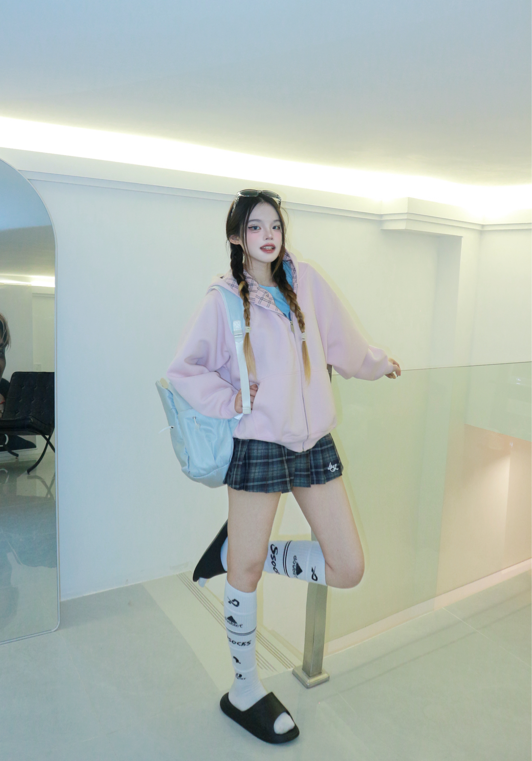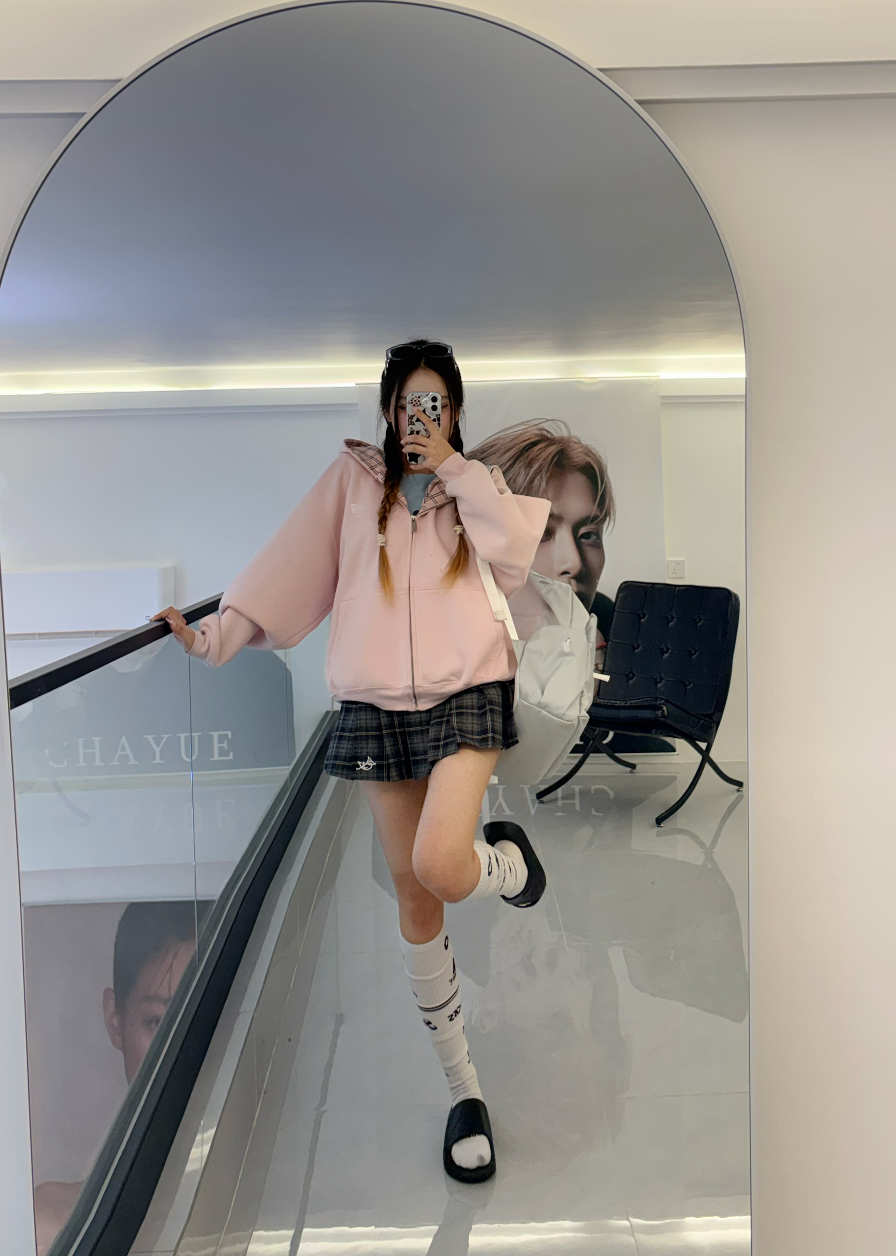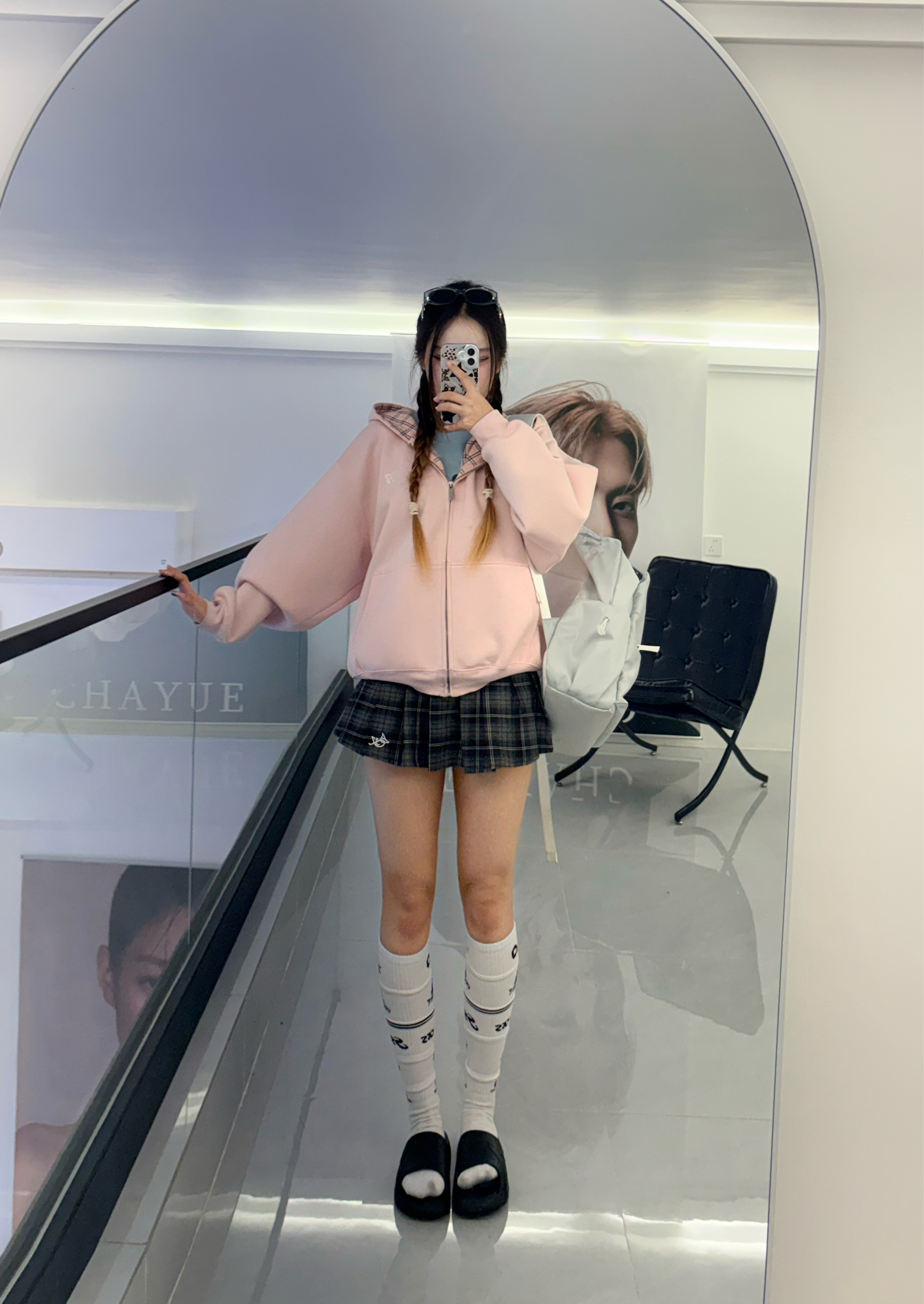 论这双拖鞋和日常穿搭的适配度 我一到夏天就喜欢穿拖鞋出门☀️ 粉紫连帽卫衣+格纹百褶裙,自带韩系软感 而这双黑色拖鞋,就是整套look的点睛之笔。🖤 搭配长筒运动袜,既保留了少女感,又多了几分随性自在✨ 不管是逛店还是日常出街,都舒服又上镜,💗 这才是我想要的韩系日常感呀~ 我37码穿着很合适