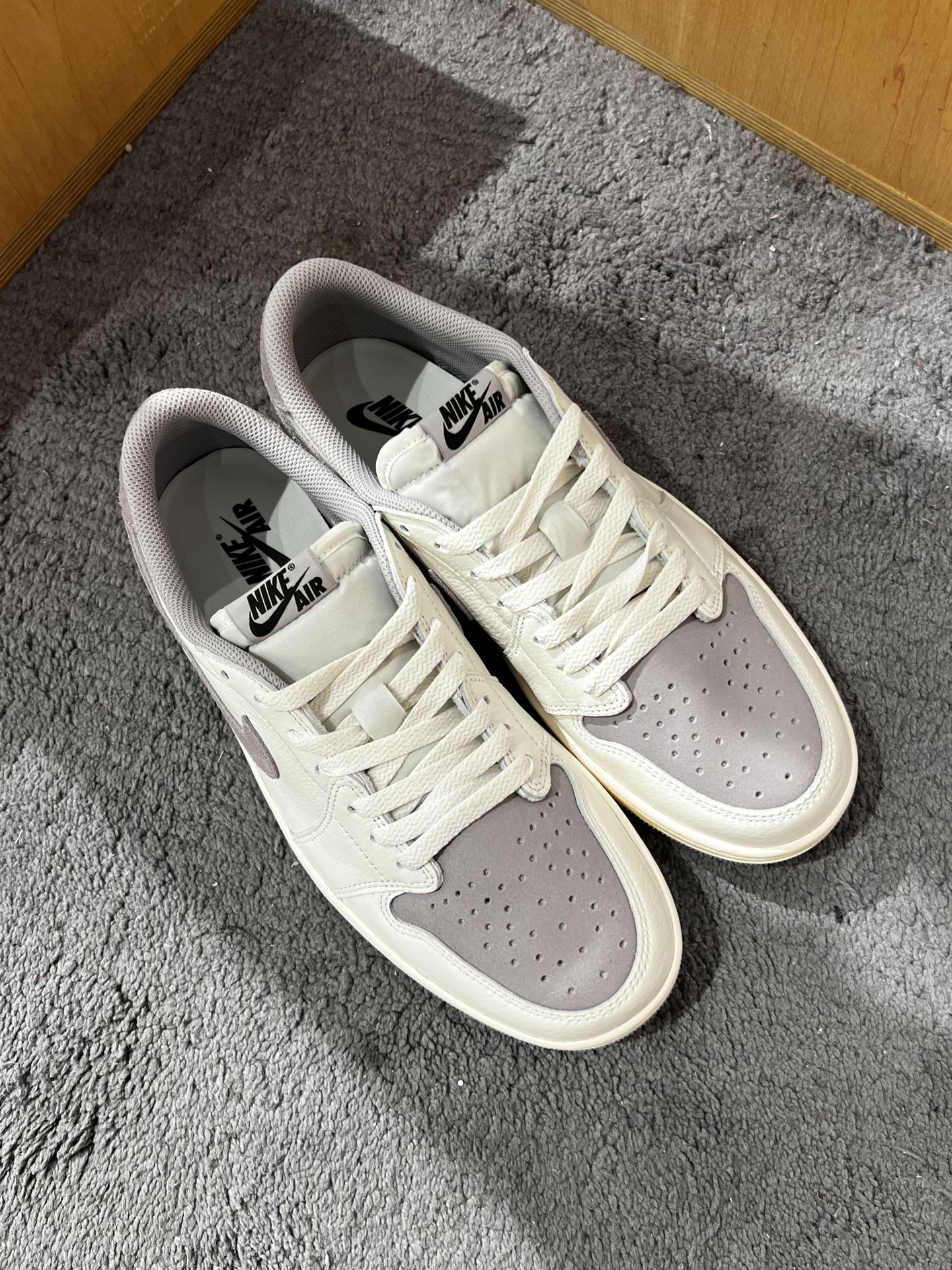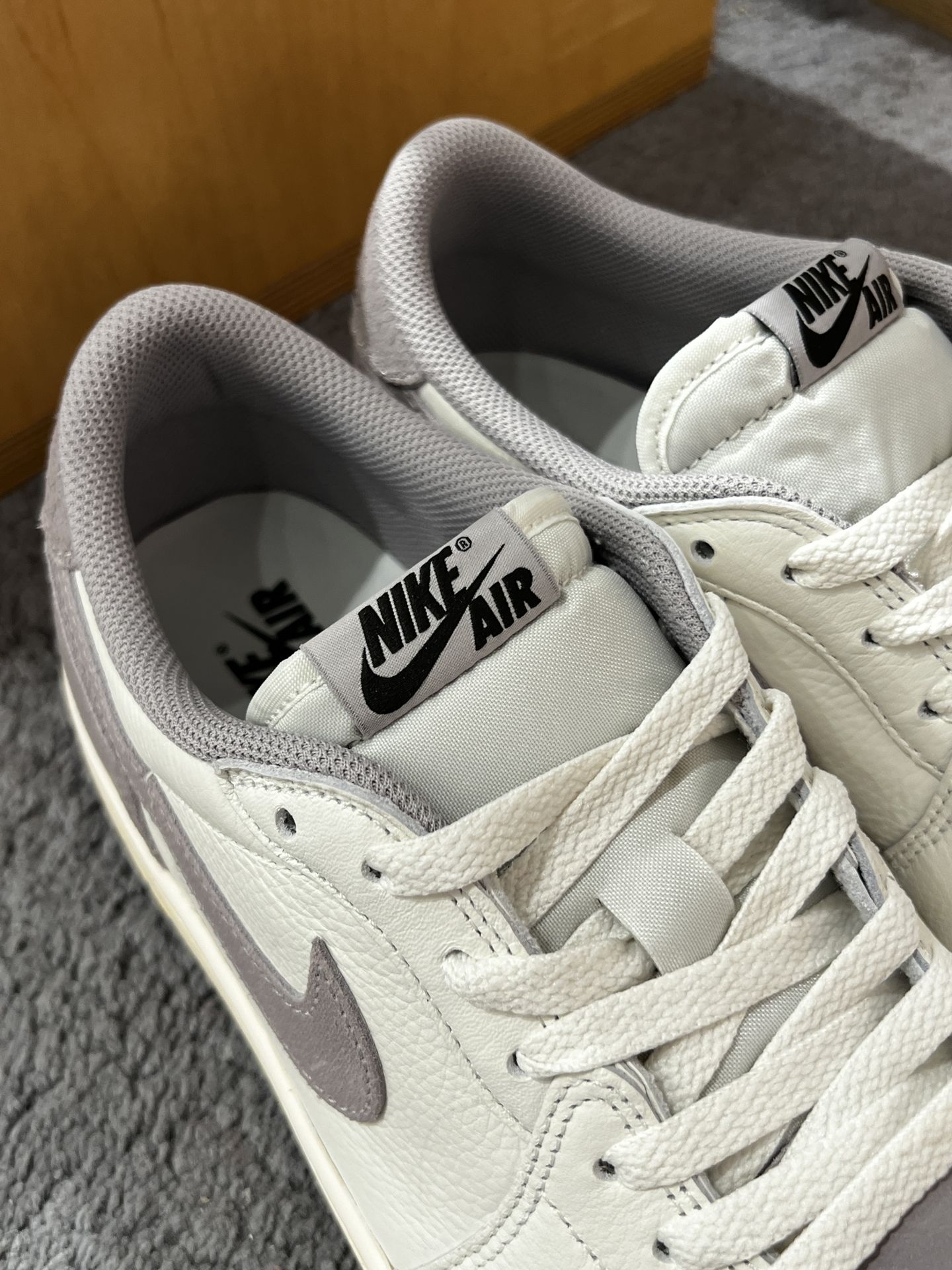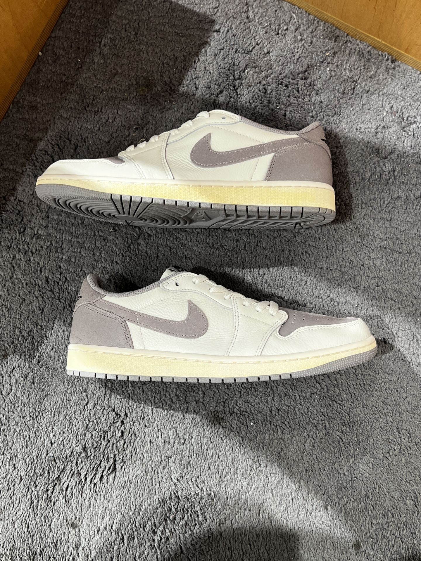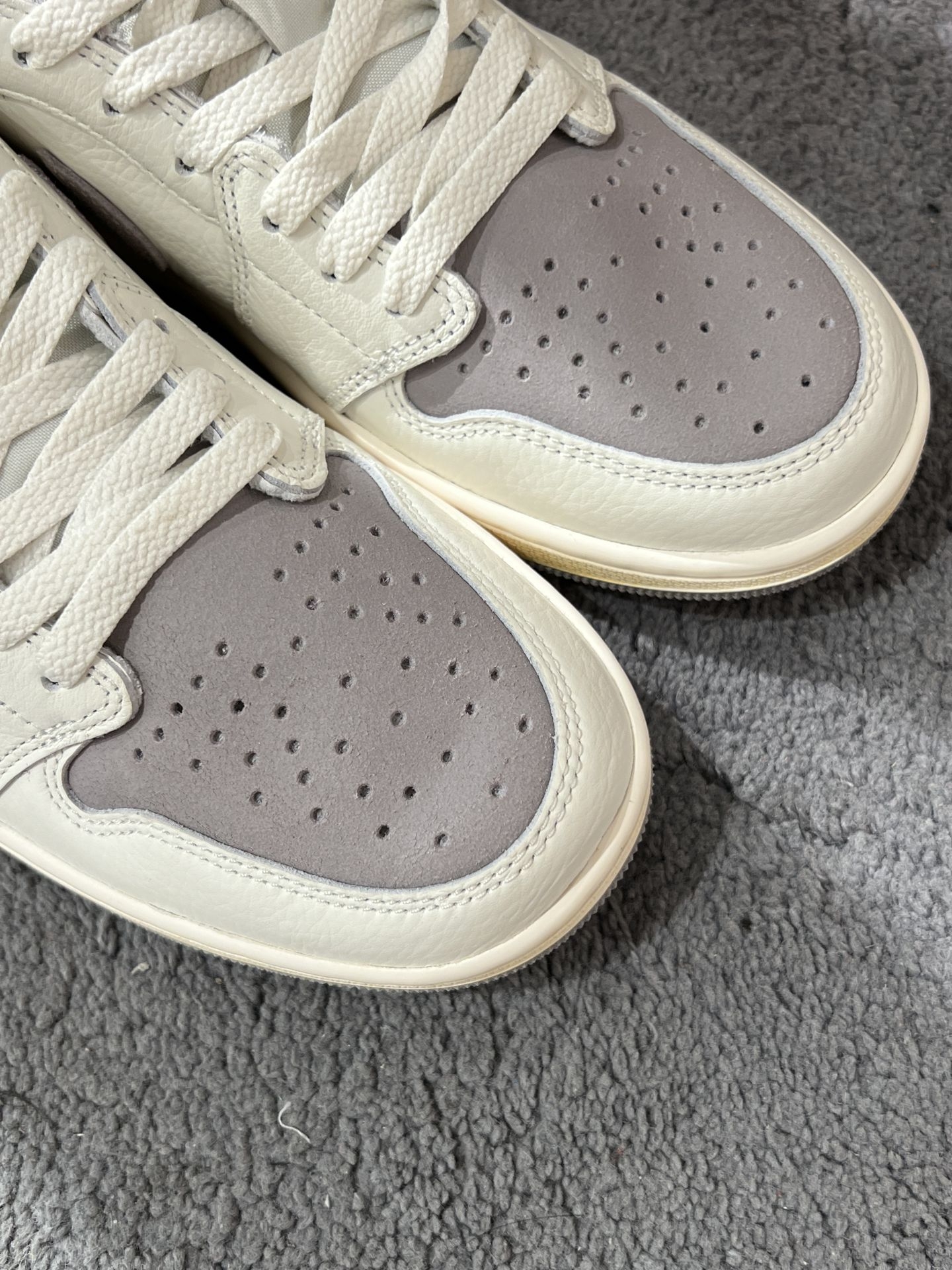 Air Jordan 1 Low OG奶油灰以其独特的外观和质感,成为了众多鞋迷的心头好。鞋身白色部分采用了柔软质地的荔枝皮,这种皮料质感细腻,富有弹性,为鞋子带来了舒适的感觉。而灰色的麂皮部分则做了龟裂做旧的处理,中底部分加了氧化做旧,设计这种处理方式为鞋子增添了一份复古感,同时也赋予了鞋子一种自然磨损的效果,让人感到十分真实。