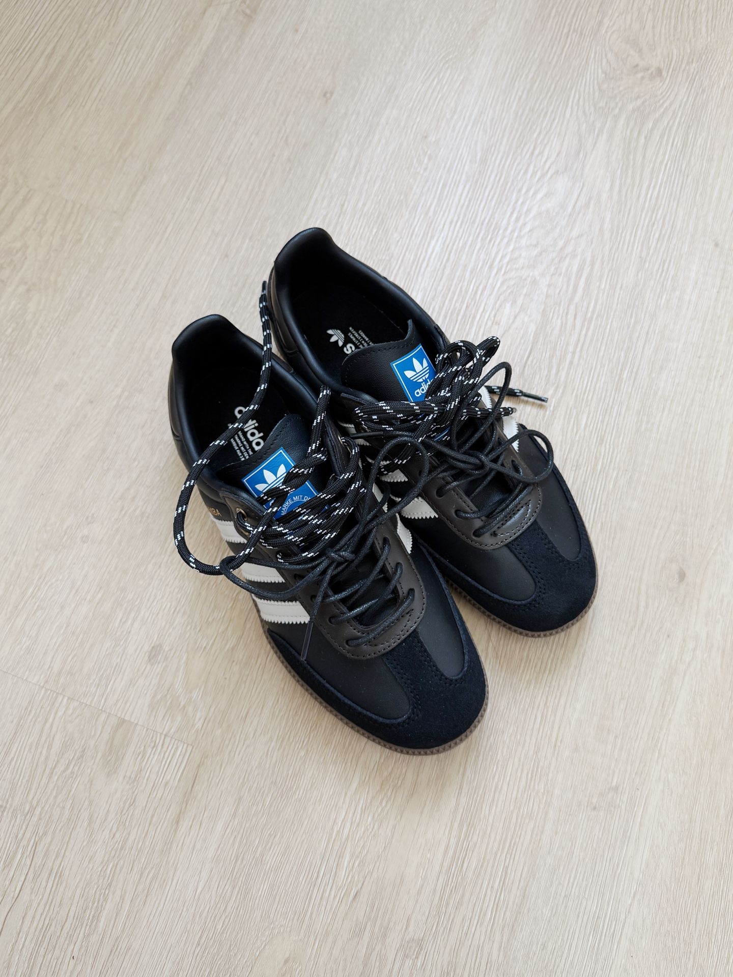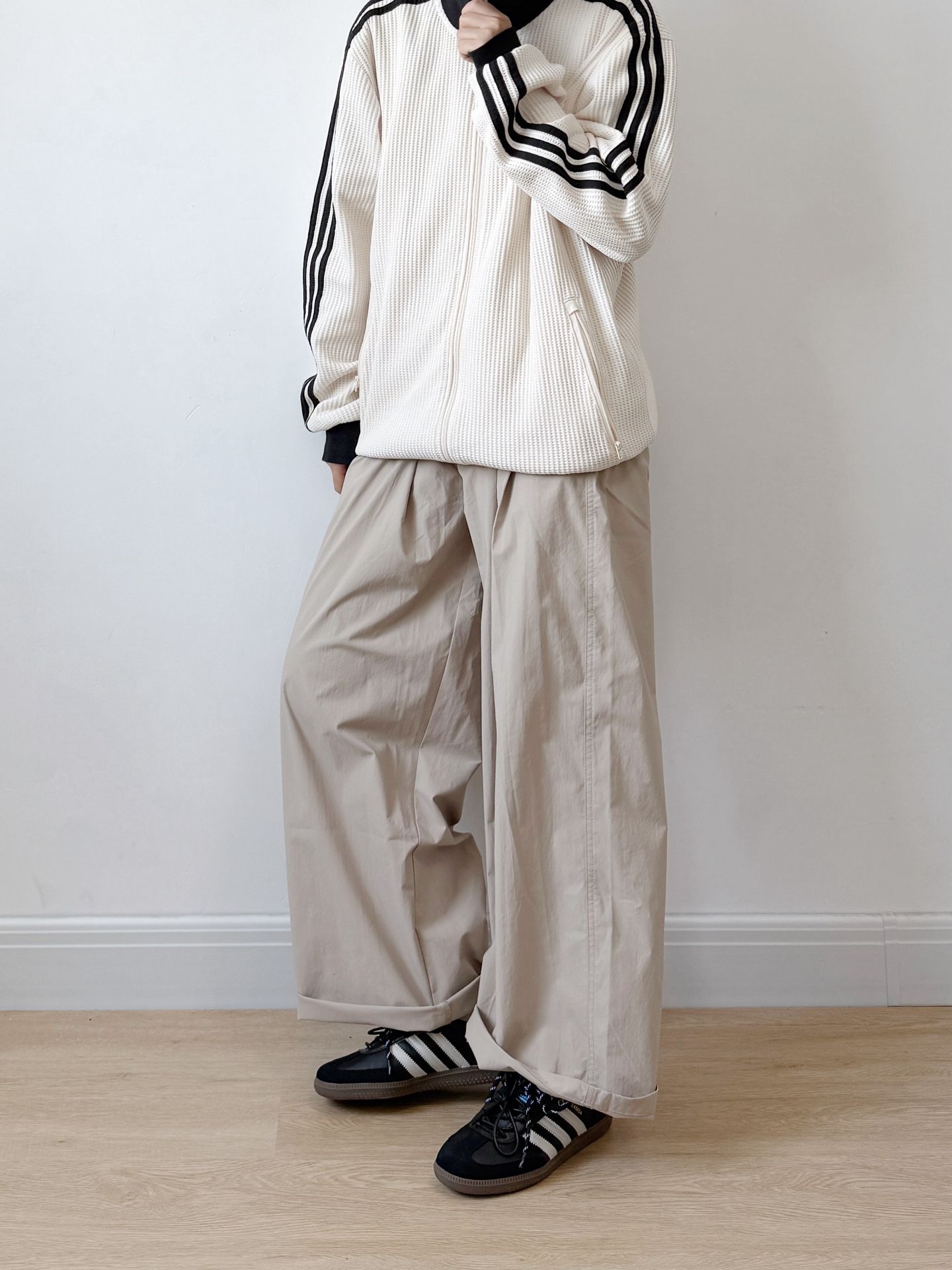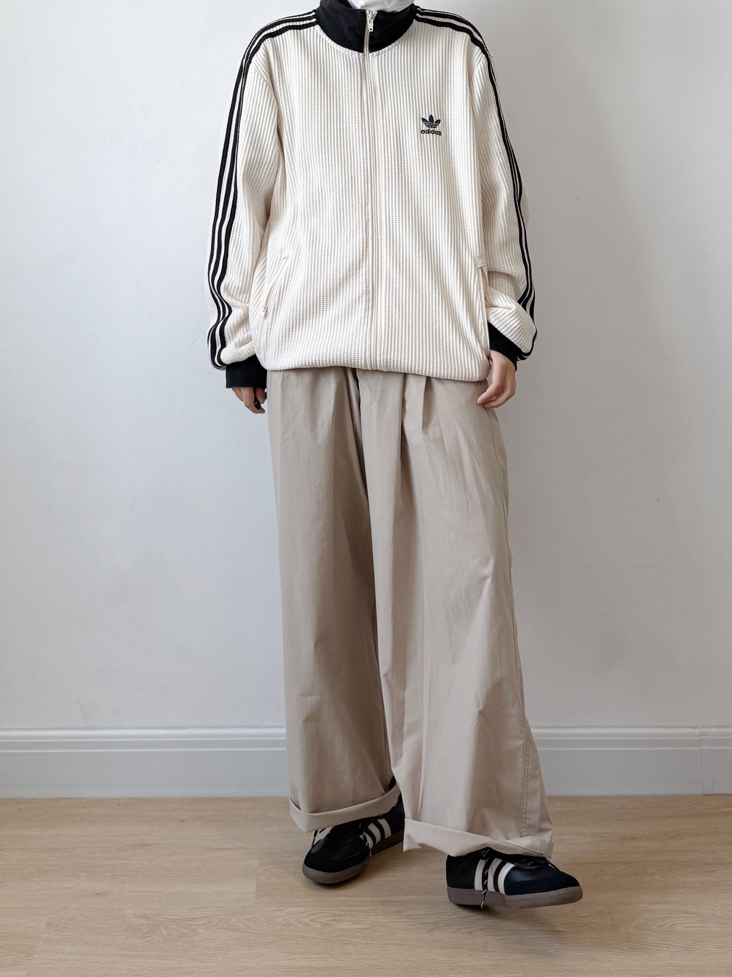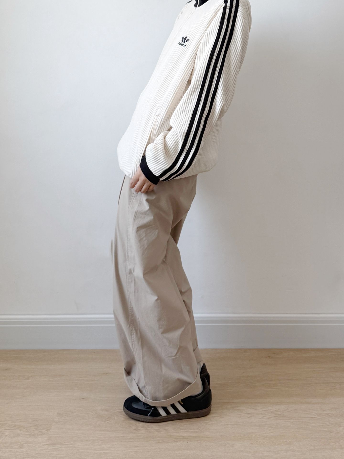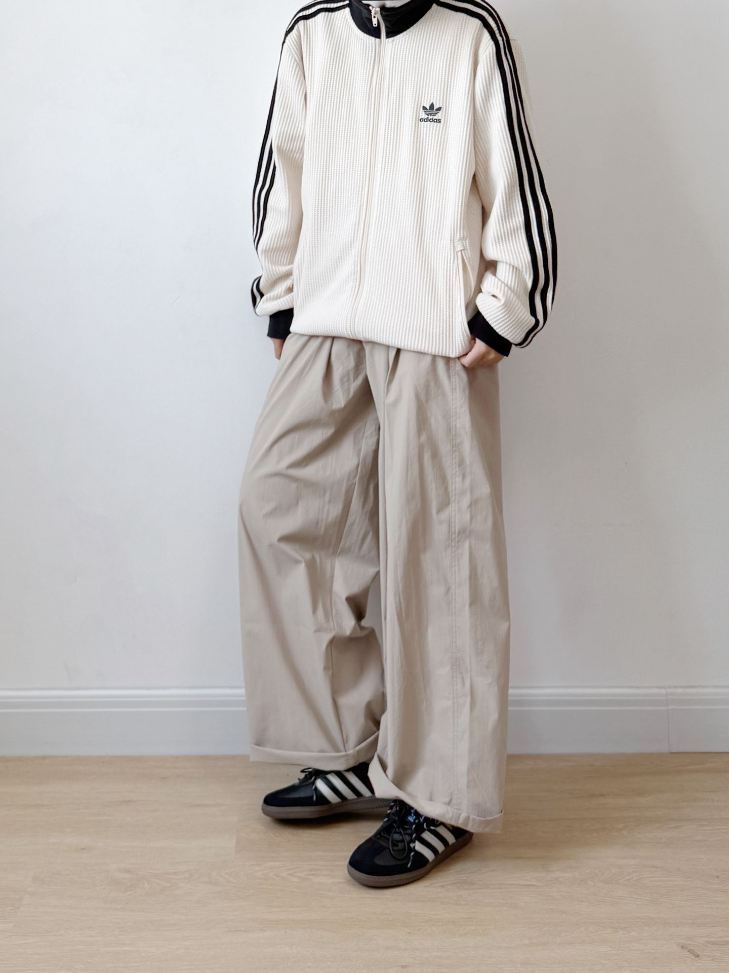 今日份阿迪穿搭来喽 上衣是一件米白色的华夫格 很软的材质松弛感满满 搭配一双复古samba太是那味了 双鞋带和鞋侧的金属扣有点个性了[机智_blue] 码数不偏 正常码就ok #恭喜我的鞋品进阶 #520新随鞋动