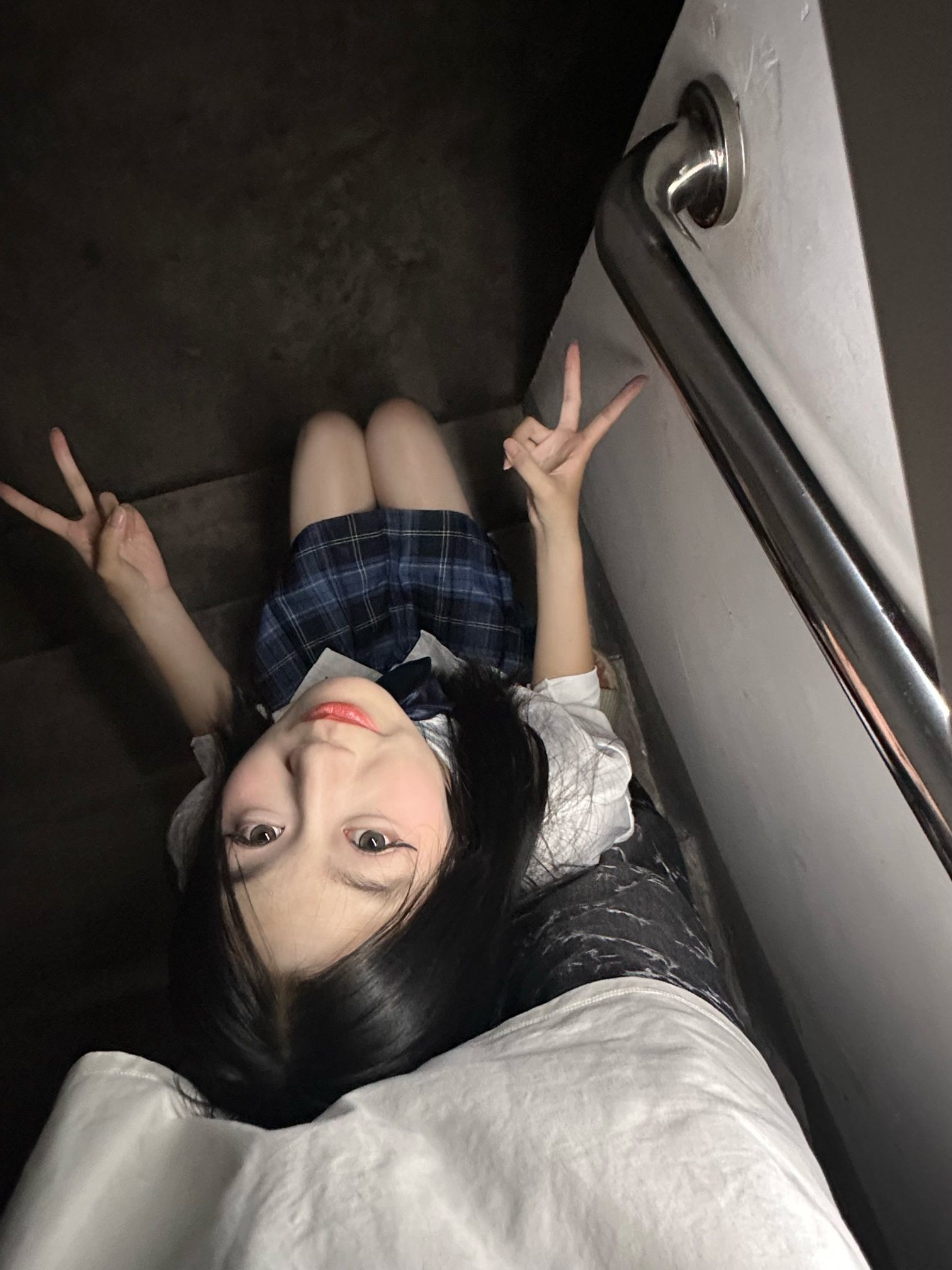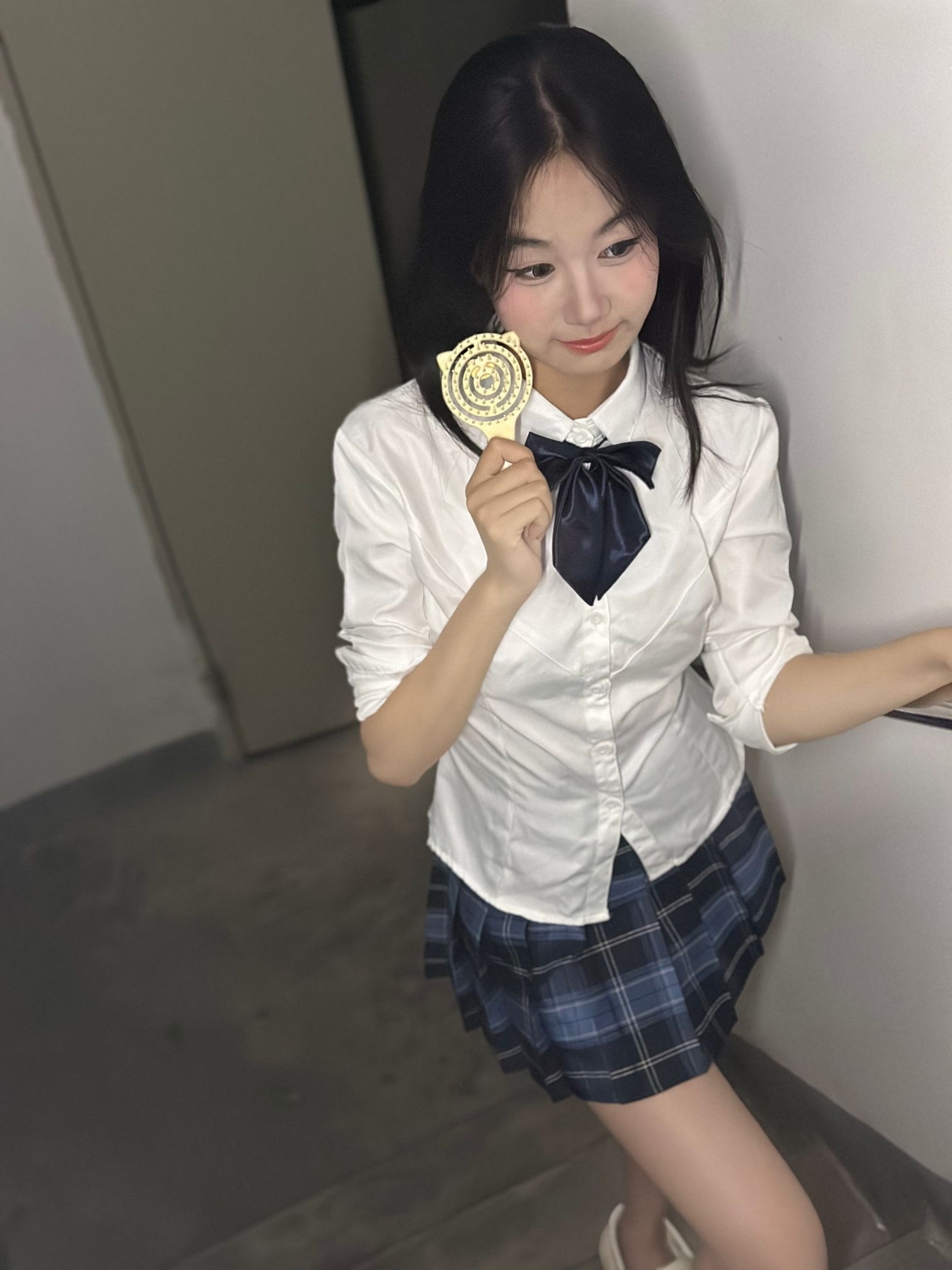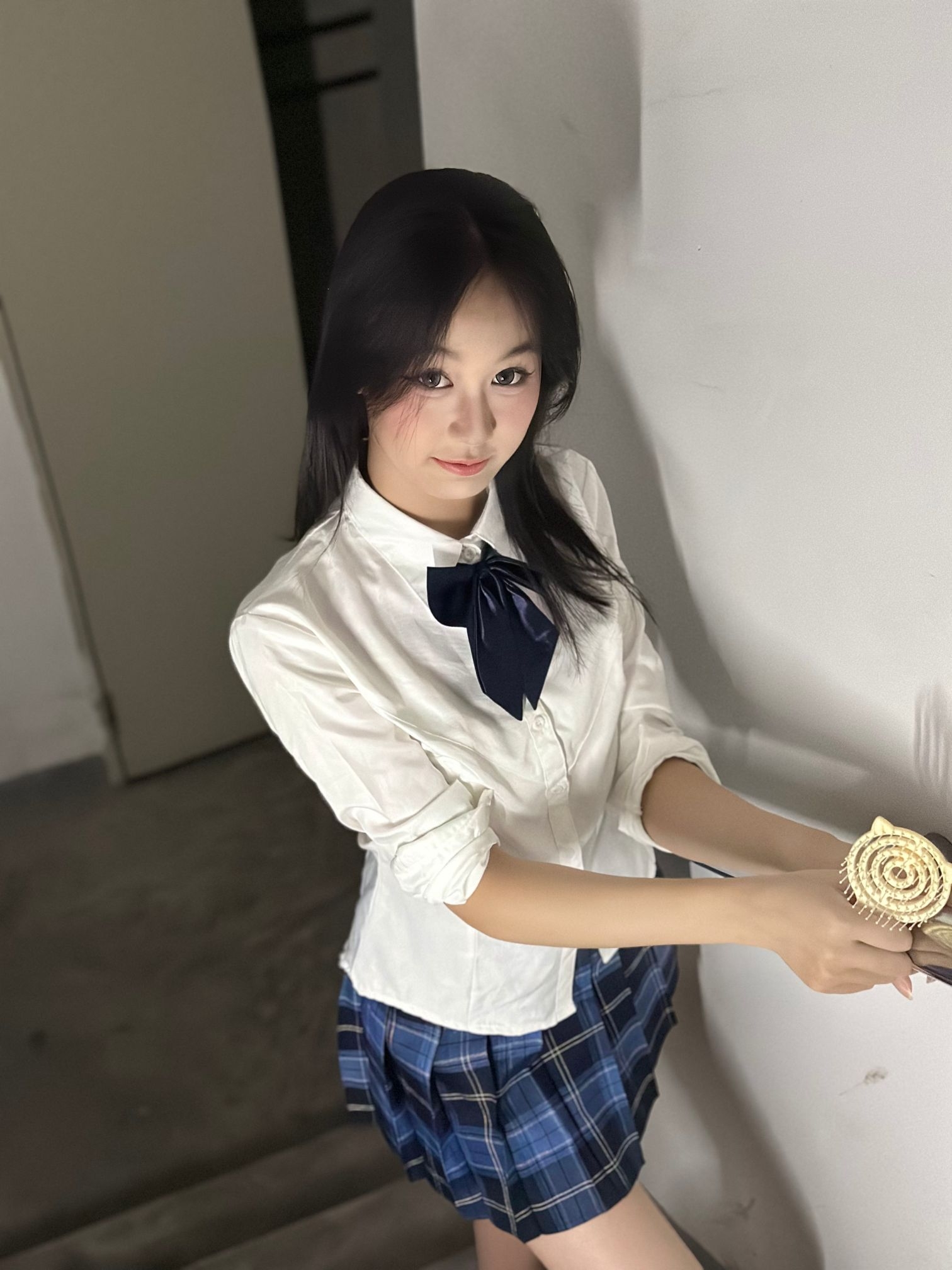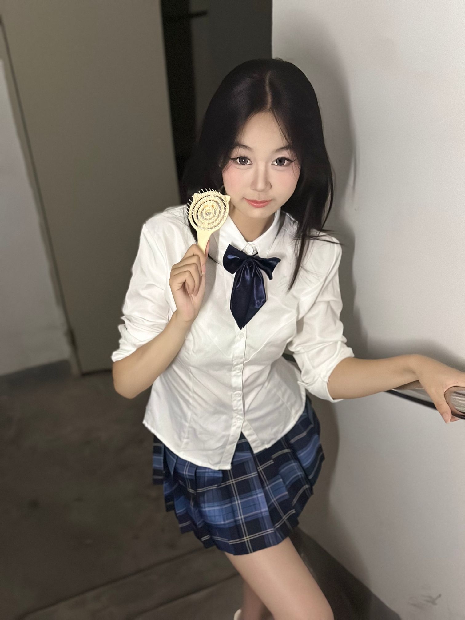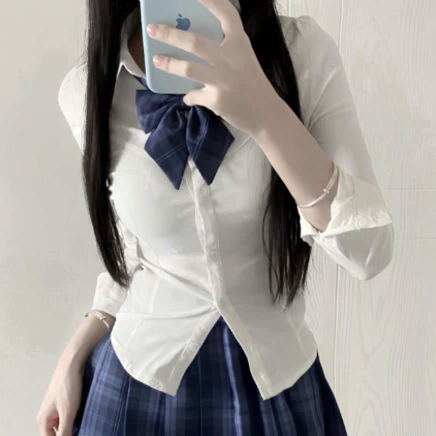 这是一套学院风的穿搭,整体风格清新减龄,很有青春活力感。 - 上衣:是一件白色的衬衫,简约干净,搭配了深蓝色的蝴蝶结领结,增添了学院风的精致感,同时也中和了白衬衫的单调,让上衣部分更有亮点。 - 下装:是一条蓝黑格纹的百褶短裙,格纹元素是学院风的经典元素之一,百褶裙的版型则进一步强化了青春活泼的感觉,短裙的长度也能很好地展现腿部线条,让整体造型更显利落。 - 整体搭配:上衣的简约与领结的精致、格纹...