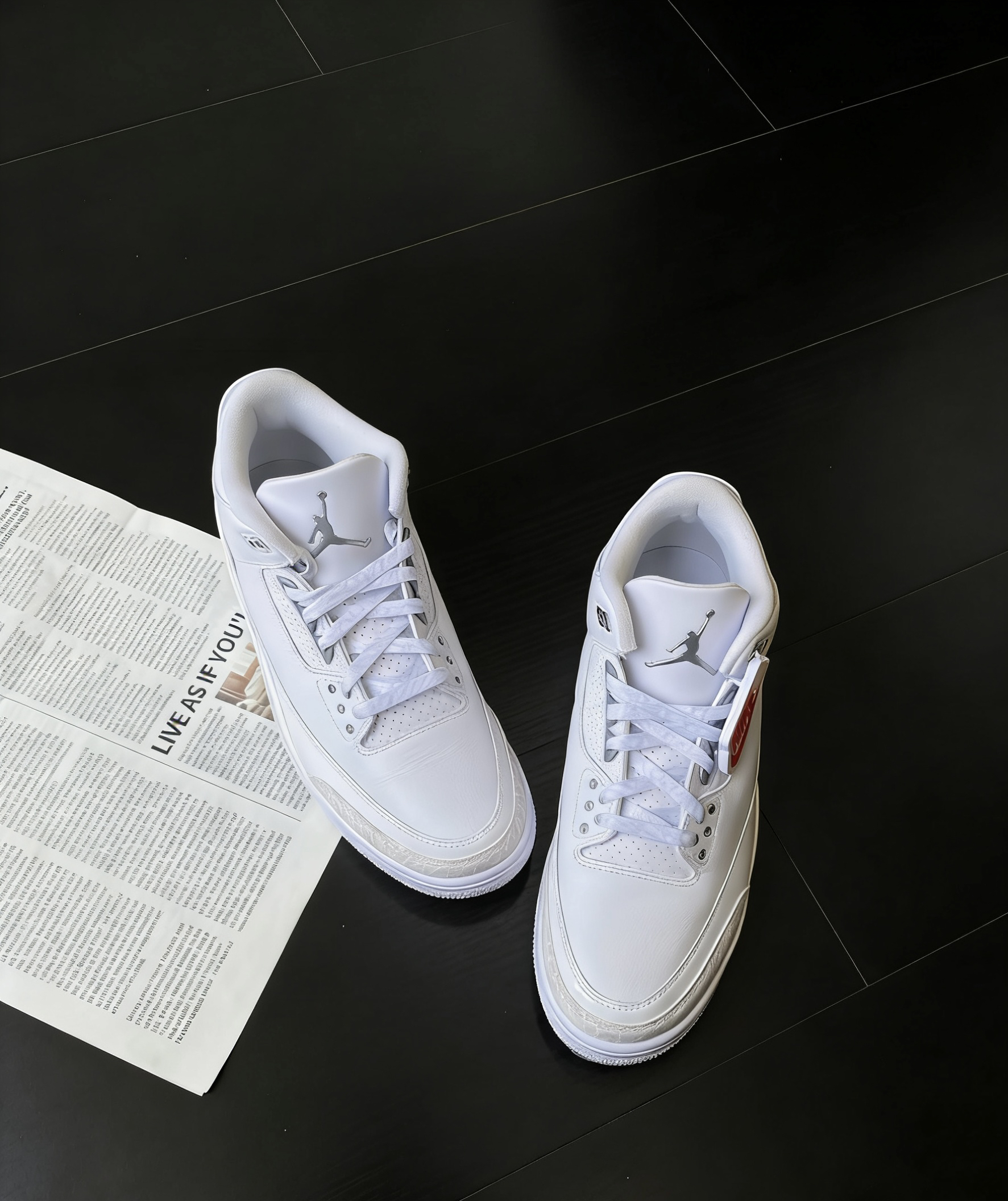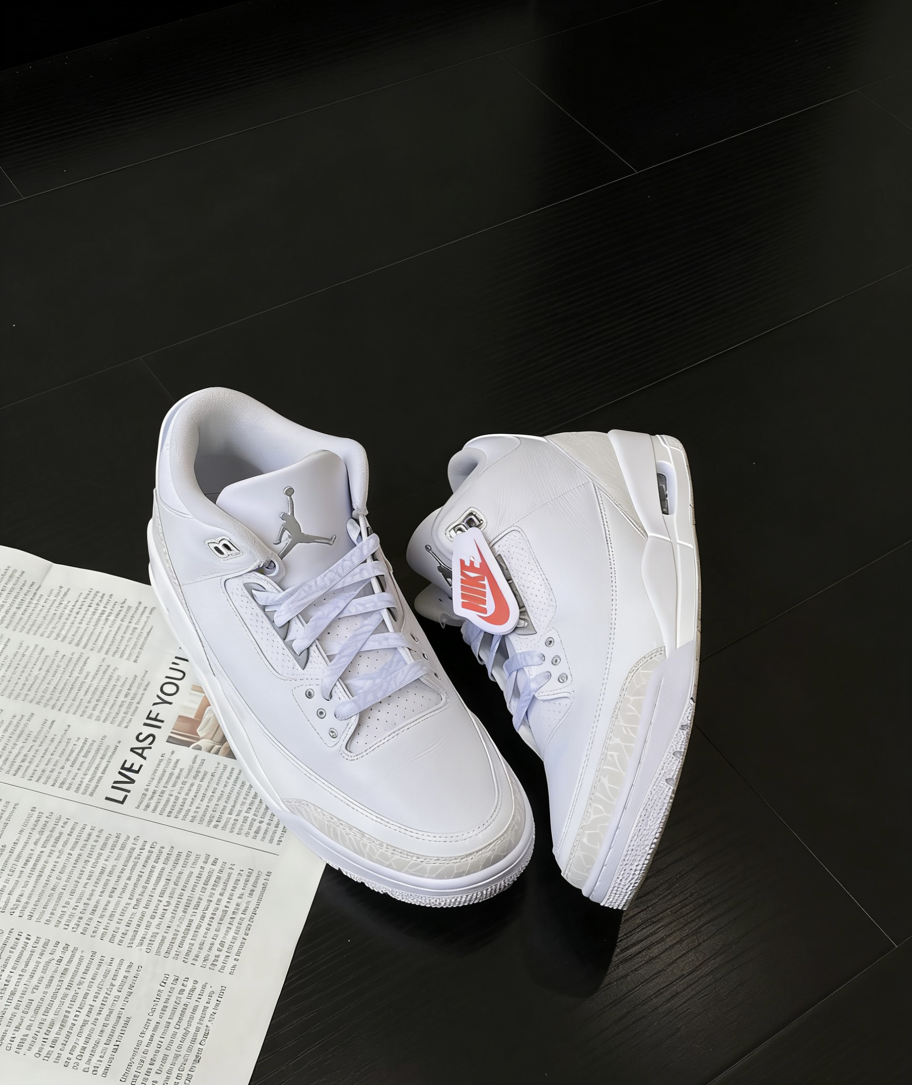 • 纯白爆裂纹设计:全白皮革鞋面搭配标志性的浅灰色爆裂纹,完美复刻AJ3经典配色,上脚辨识度拉满,男女同款适配情侣出街。 • AJ3 OG基因:标志性的爆裂纹、后跟Air气垫与中帮版型,还原OG篮球鞋基因,兼顾复古情怀与潮流属性。 • 质感细节拉满:鞋面采用优质荔枝纹皮革,触感细腻且层次丰富;爆裂纹采用特殊工艺,不易脱落且质感高级,低调彰显身份。