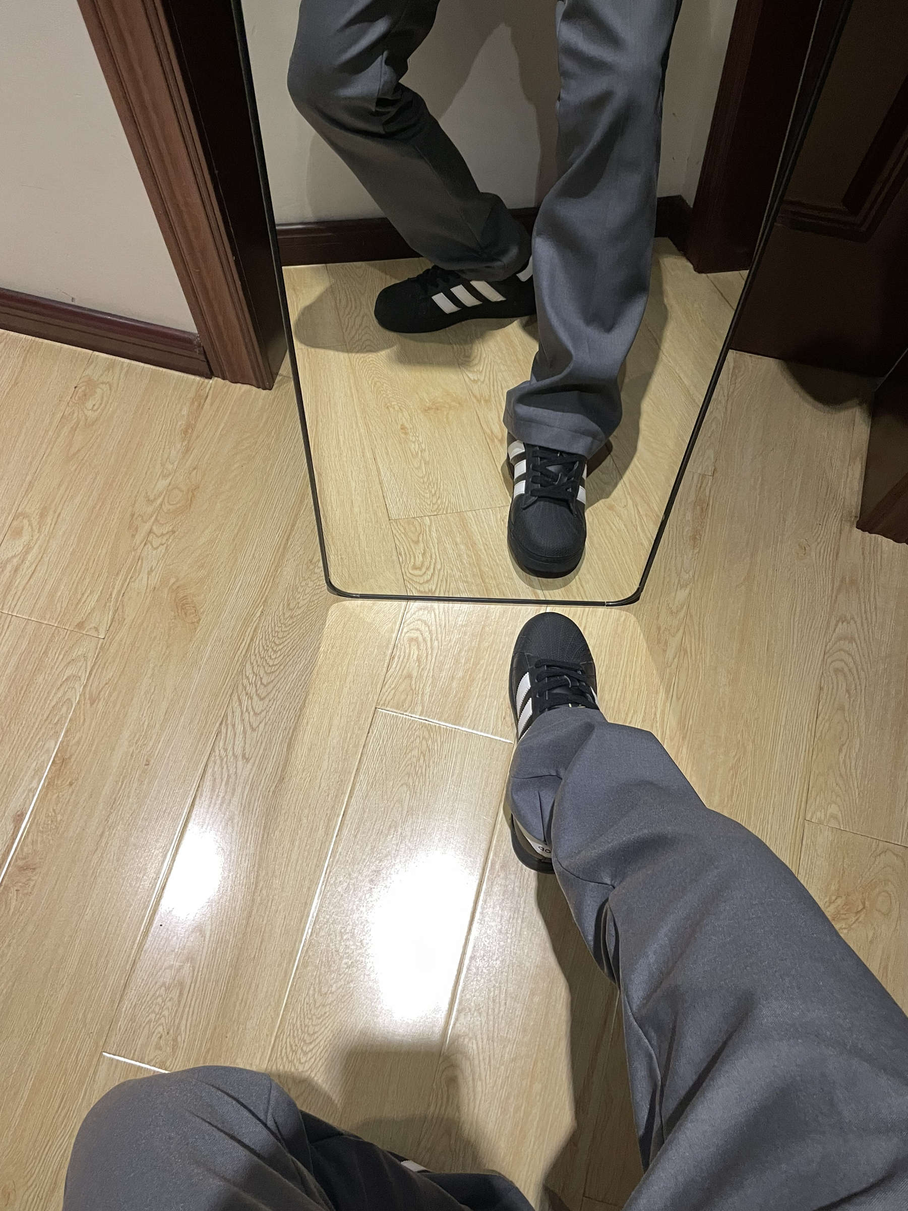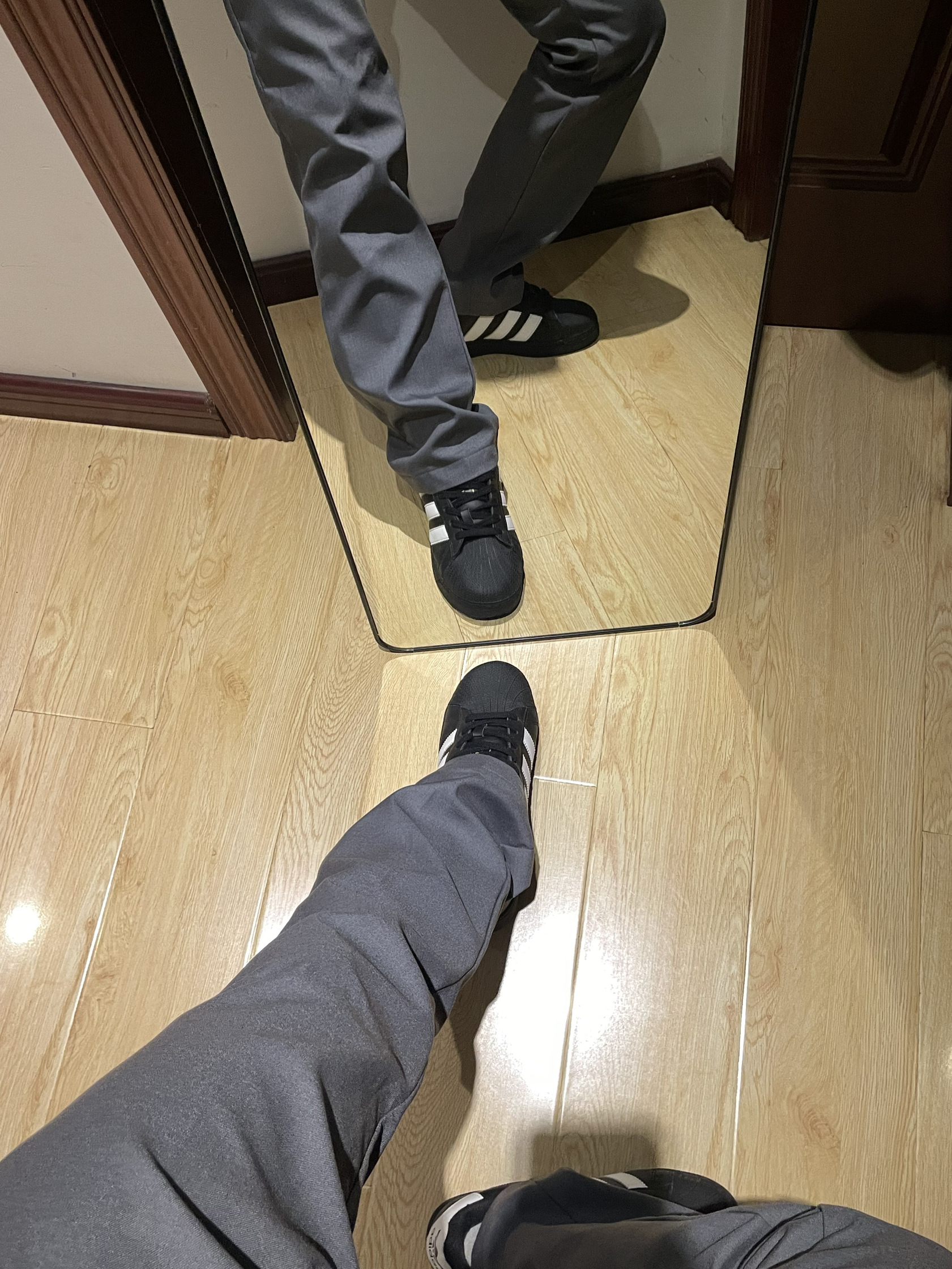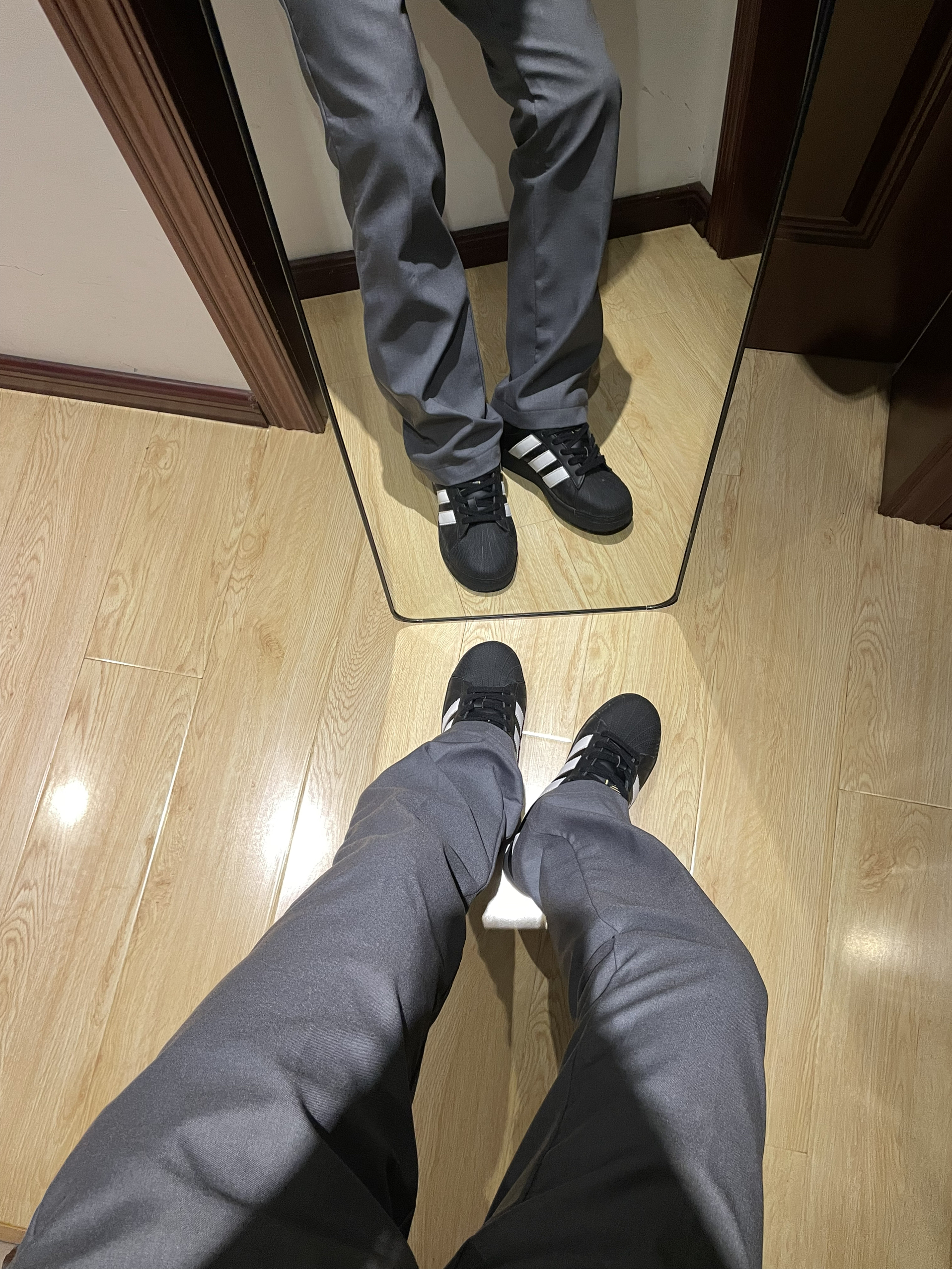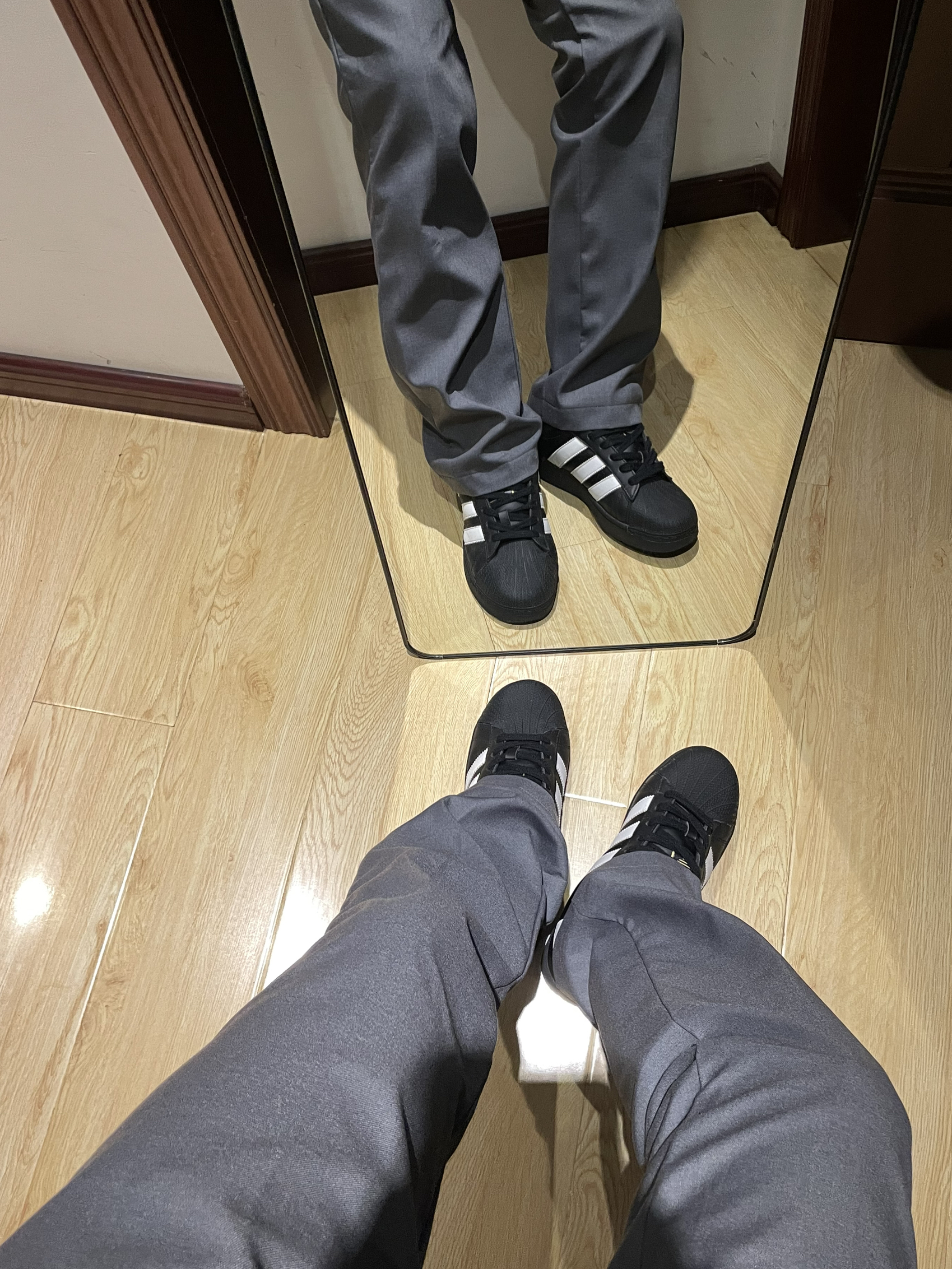 灰西裤上身效果有种意想不到的顶!加上百搭的adidas黑贝壳头直接顶满!