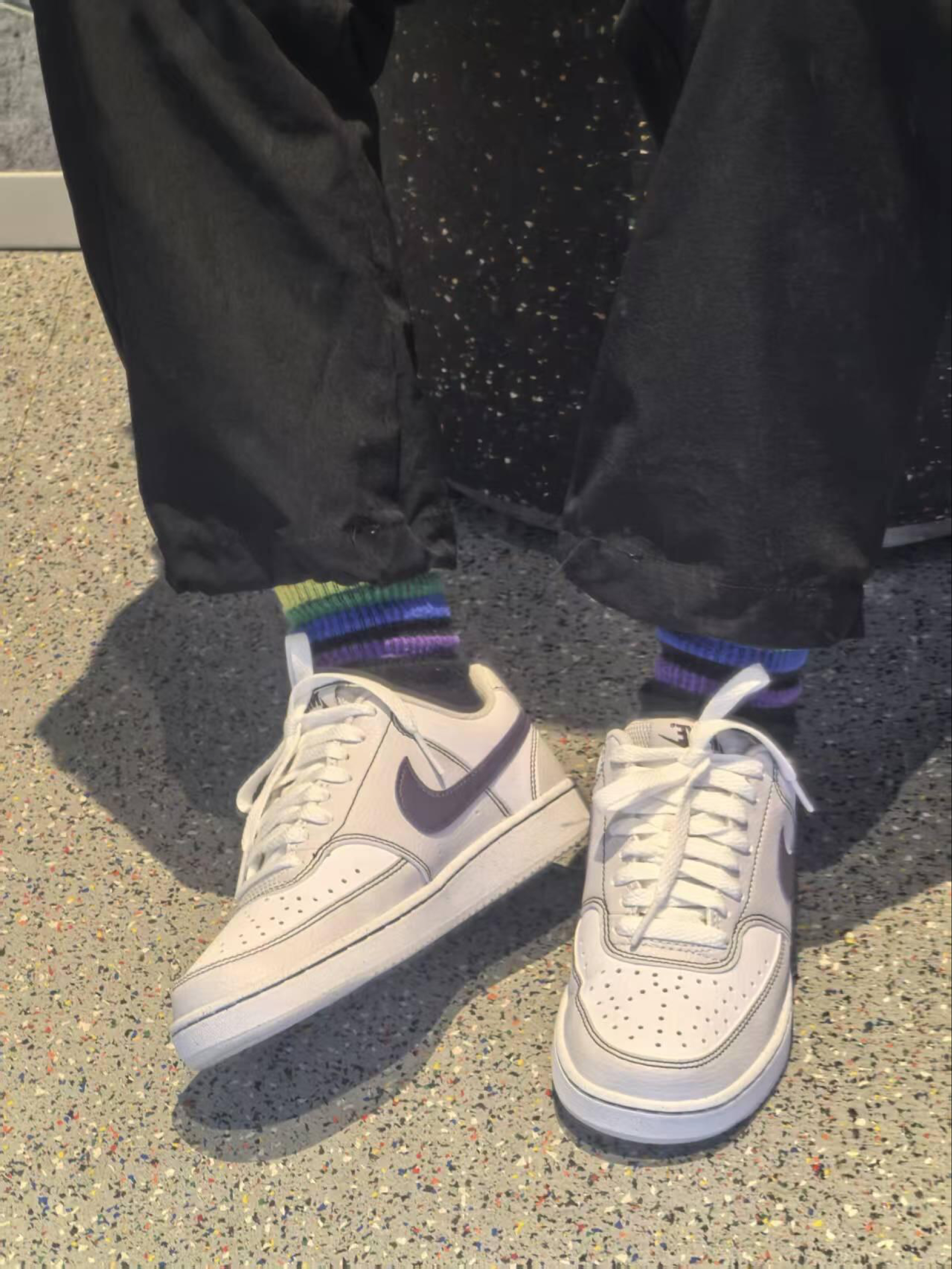 谁能拒绝一双简约又耐看的白紫Nike板鞋啊!🤍💜 奶白鞋身搭深紫勾子,配色温柔又高级,日常搭牛仔裤、运动裤都超适配~ 皮质软乎乎的,上脚脚感也很舒服,百元价位能拿下这种颜值和质感,真的太值了! 鞋盒的几何图案设计也超有格调,摆拍发圈氛围感直接拉满~