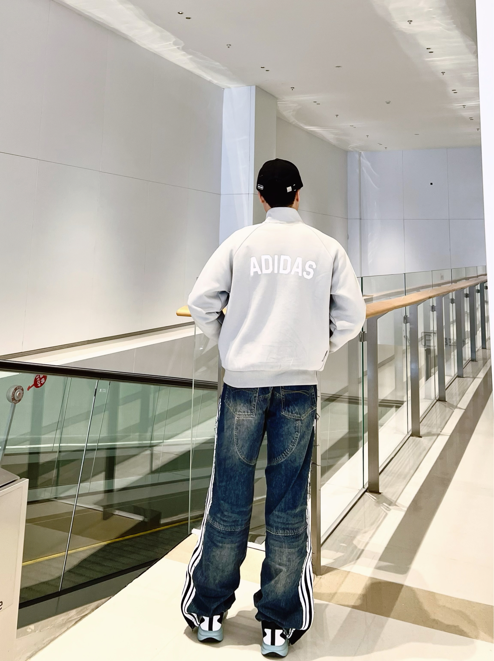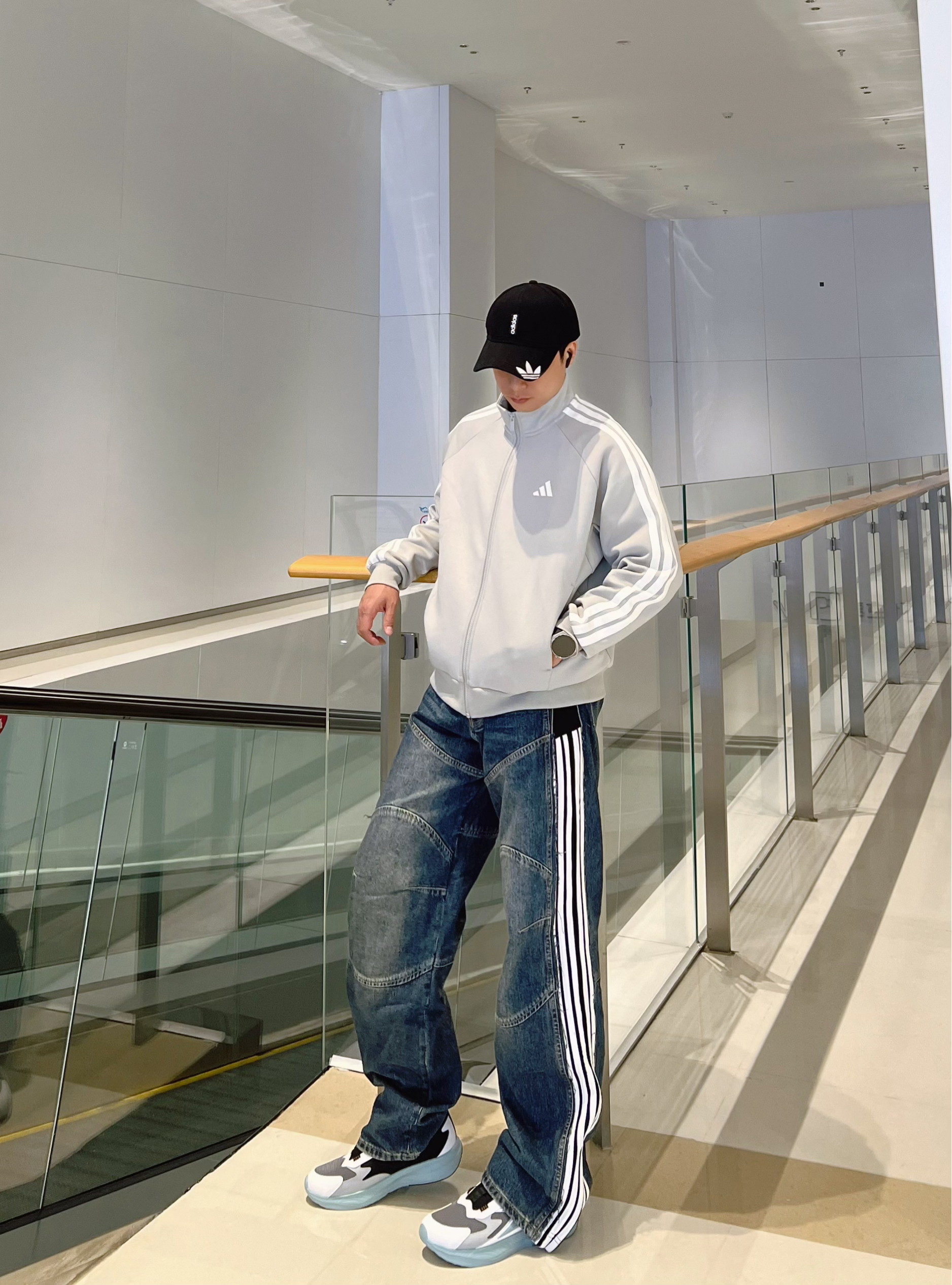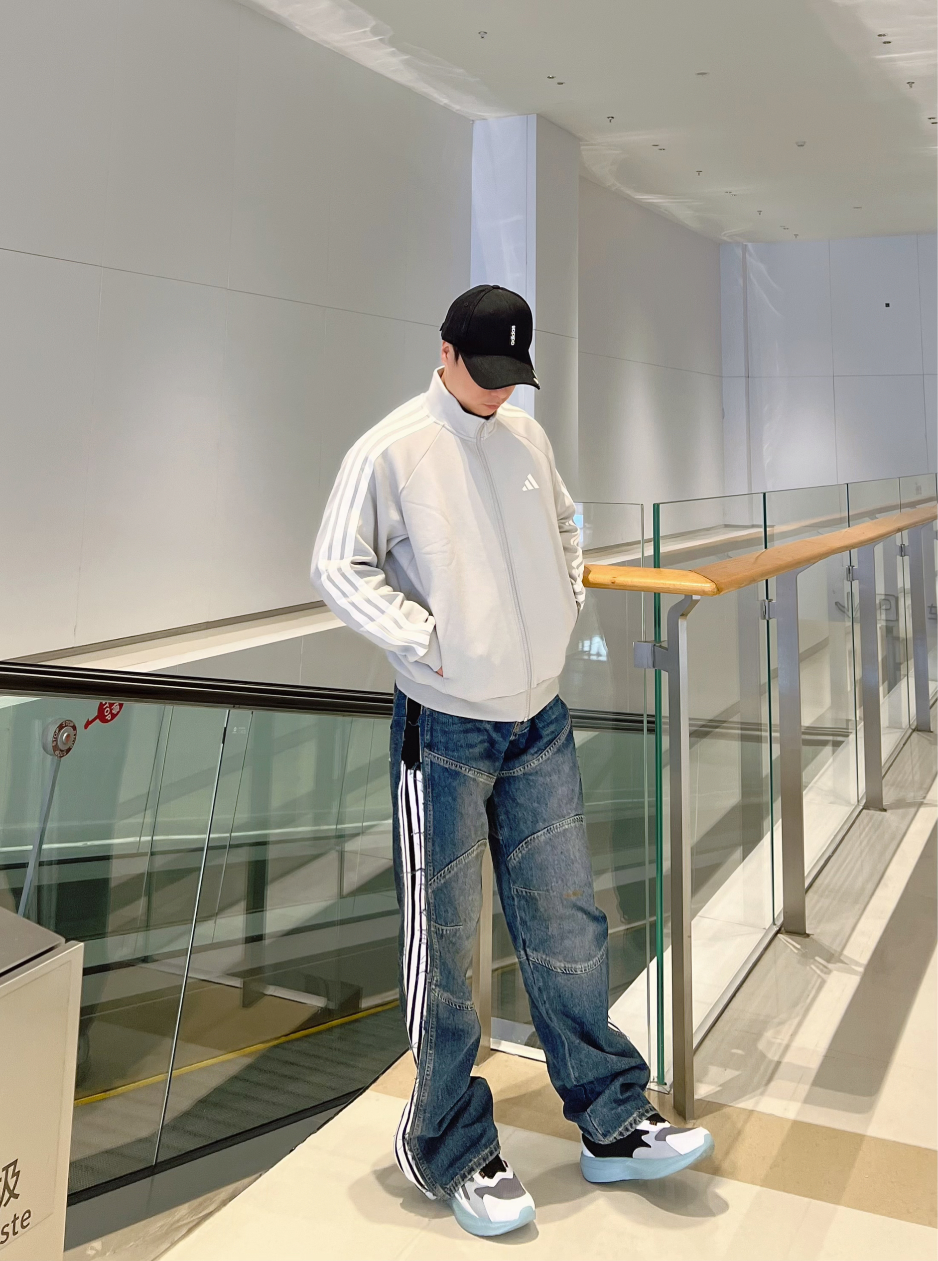 开春男生通勤真的不用穿得太复杂😎 浅灰色立领外套自带干净利落的气质,日常拉上拉链穿就很有型🔥 搭配侧边条纹牛仔裤👖中和了运动外套的正式感,多了点随性松弛的味道,整套配色统一不杂乱,上班通勤、日常出门穿都合适✨