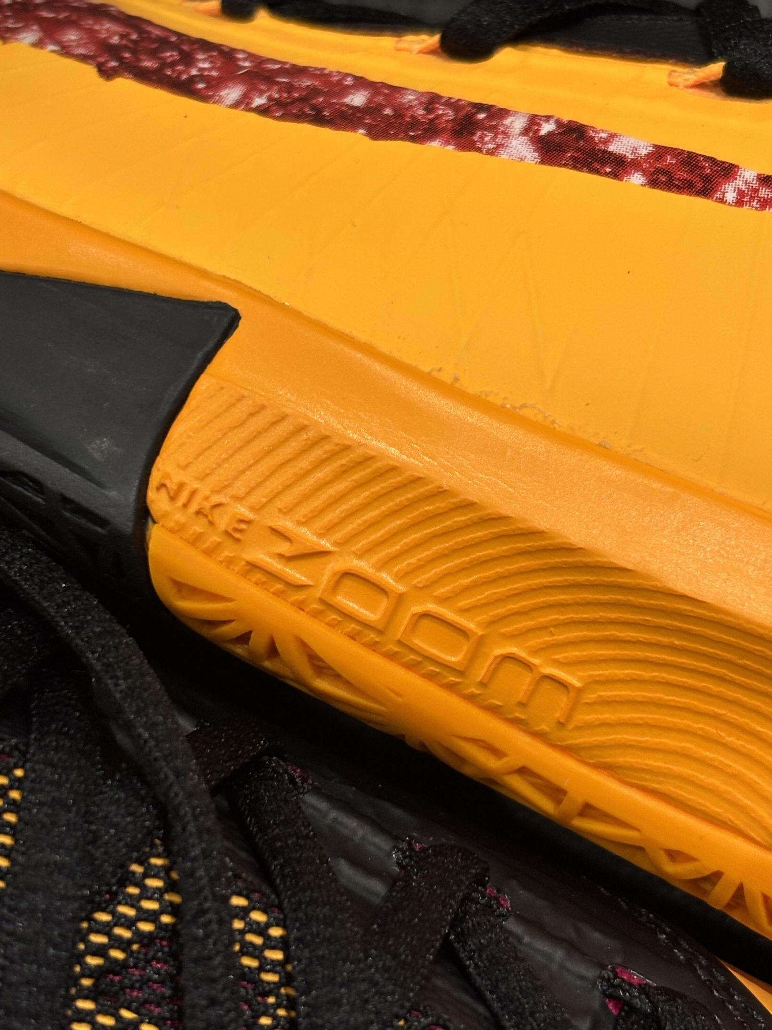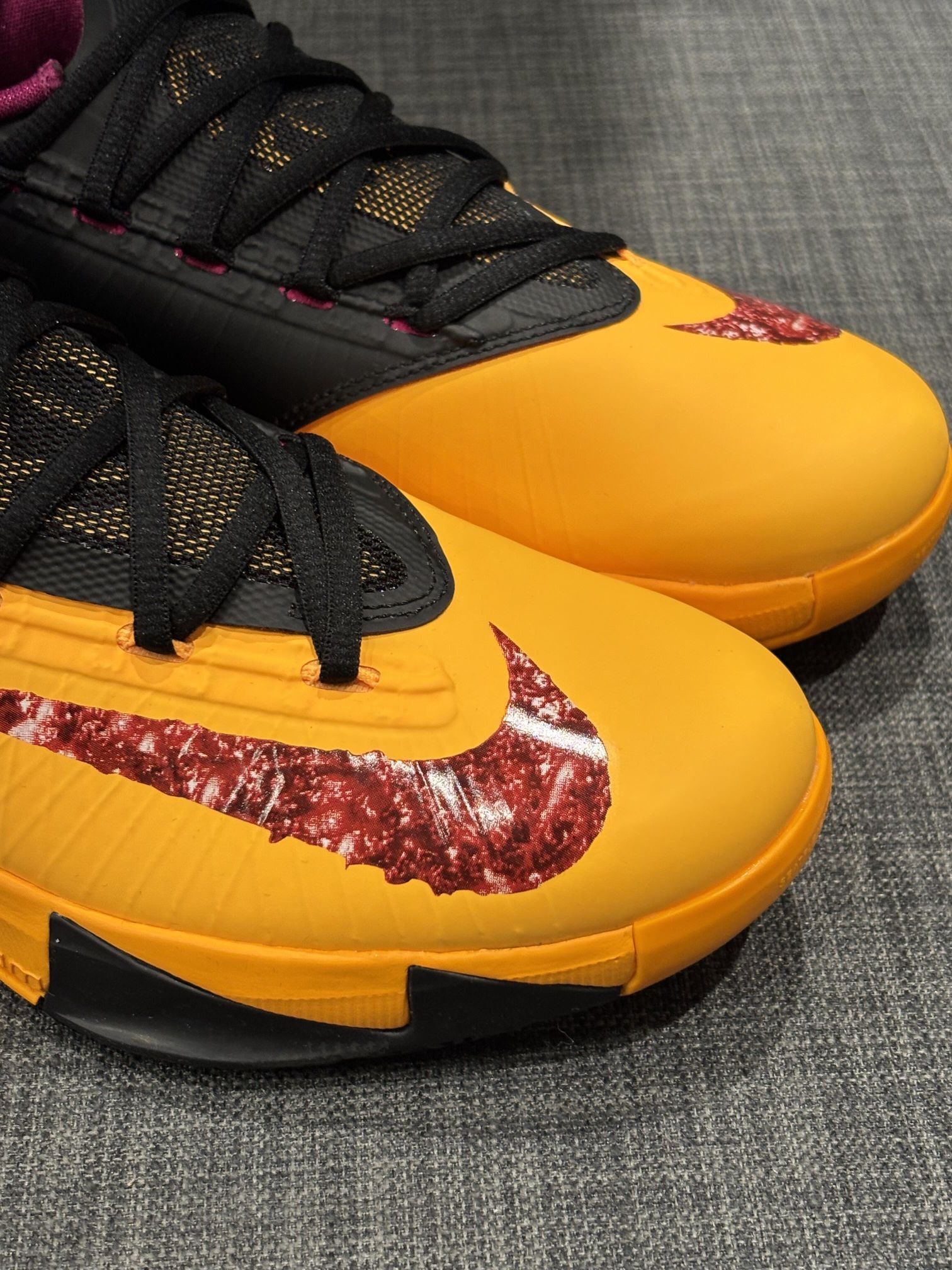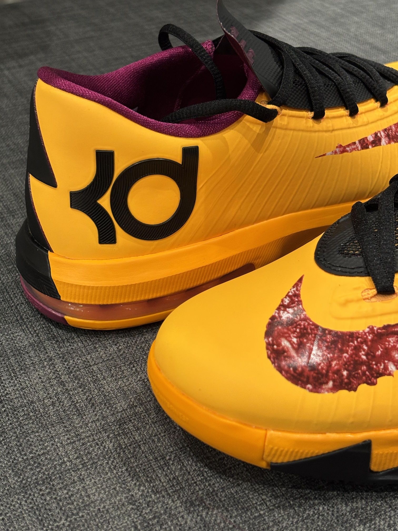 🥜KD6「花生酱果冻」 登场!谁的青春回来了? 这款鞋以激光橙色为主色调,贯穿鞋身,Swoosh 标志上点缀着果酱状图案细节,鞋垫和内衬还添加了一点覆盆子红,这些配色细节完美呼应三明治灵感;中底、鞋跟和鞋带均采用黑色设计,以此形成视觉平衡。 一只鞋的鞋面纹理好像花生酱涂抹的质感,另一双鞋侧面的果冻 Swoosh,营造了一种可以食用的错觉,十分有趣。 细节之处,翻开鞋舌,"Made in Mary...