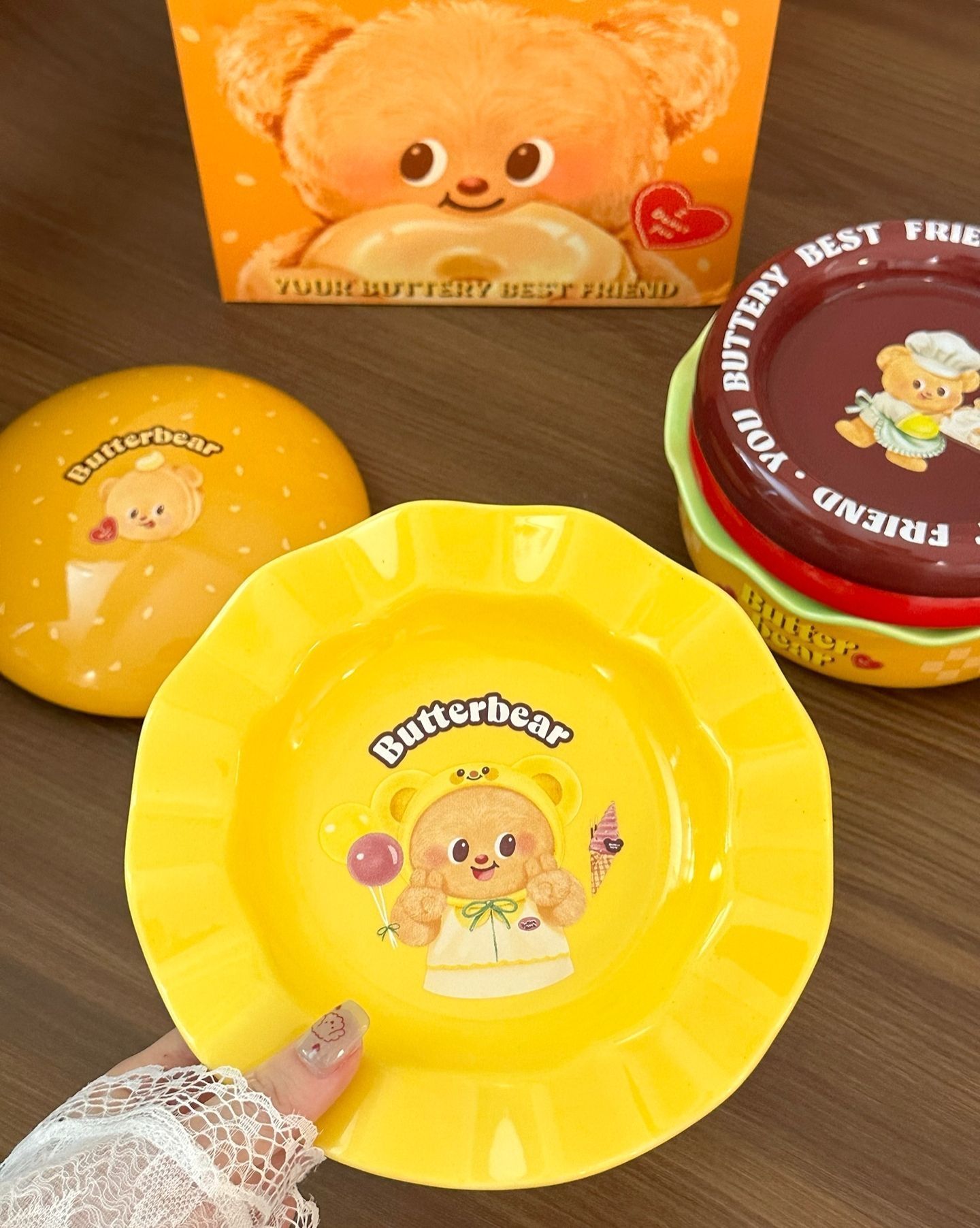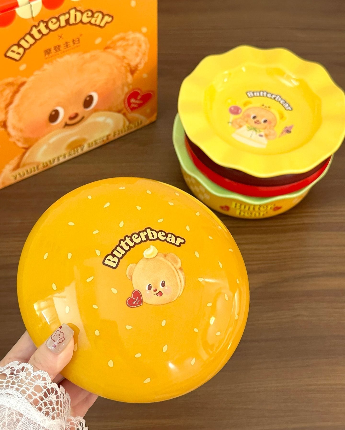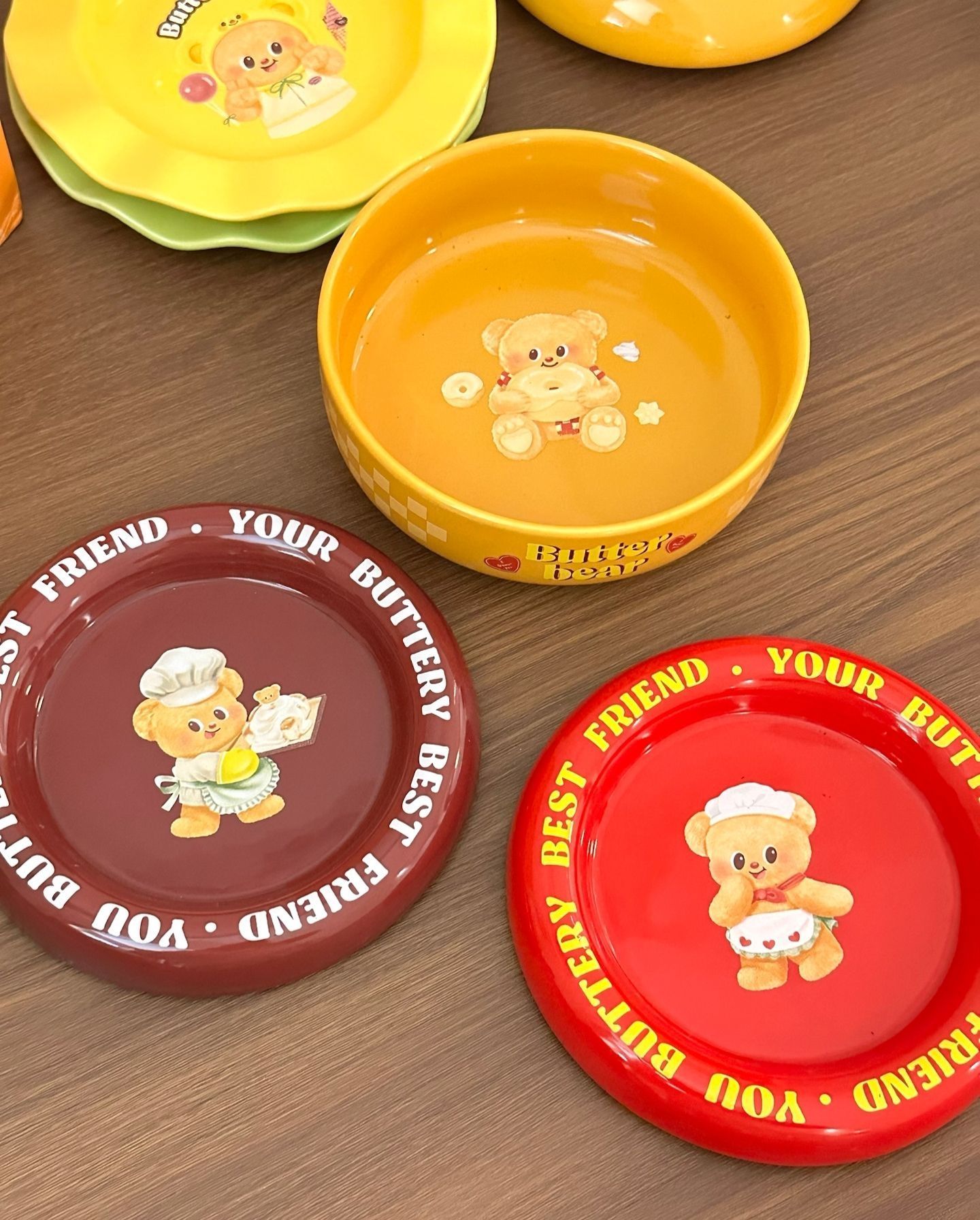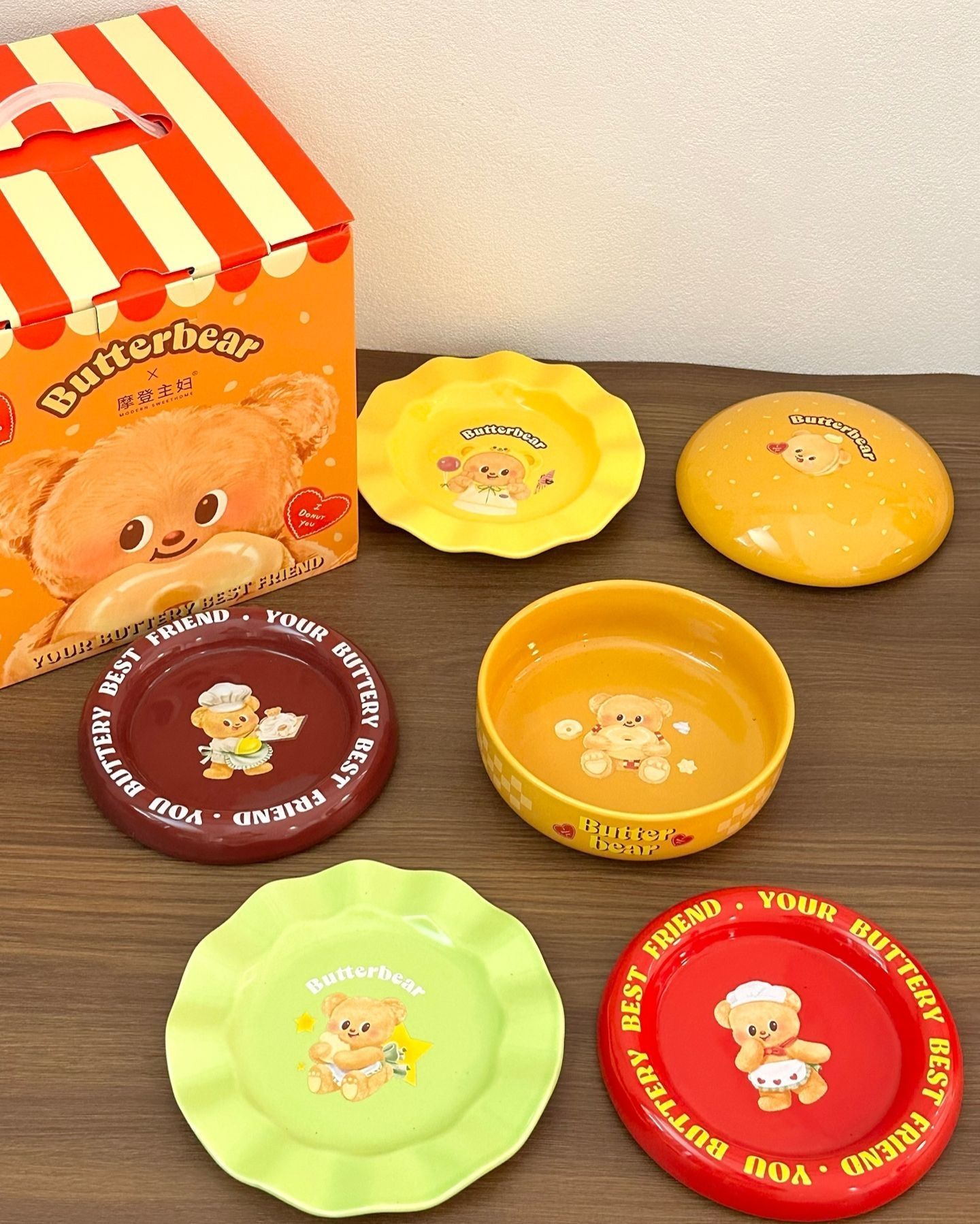 谁能拒绝吃饭的时候,被一群圆滚滚的黄油小熊围着呀! 这套和摩登主妇的联名餐具,真的是一眼就戳中我了。每一个盘子、碗上都印着不同造型的Butterbear,有的抱着曲奇,有的戴着厨师帽,软乎乎的,看着就开心。 我最喜欢那个黄色的深碗,早上盛个燕麦粥,或者晚上煮个小面,连饭都变得香了一点。还有那个绿色的花边盘,用来装水果和小蛋糕,拍照特别出片。 陶瓷的质感很厚实,拿在手里沉甸甸的,釉面也很...