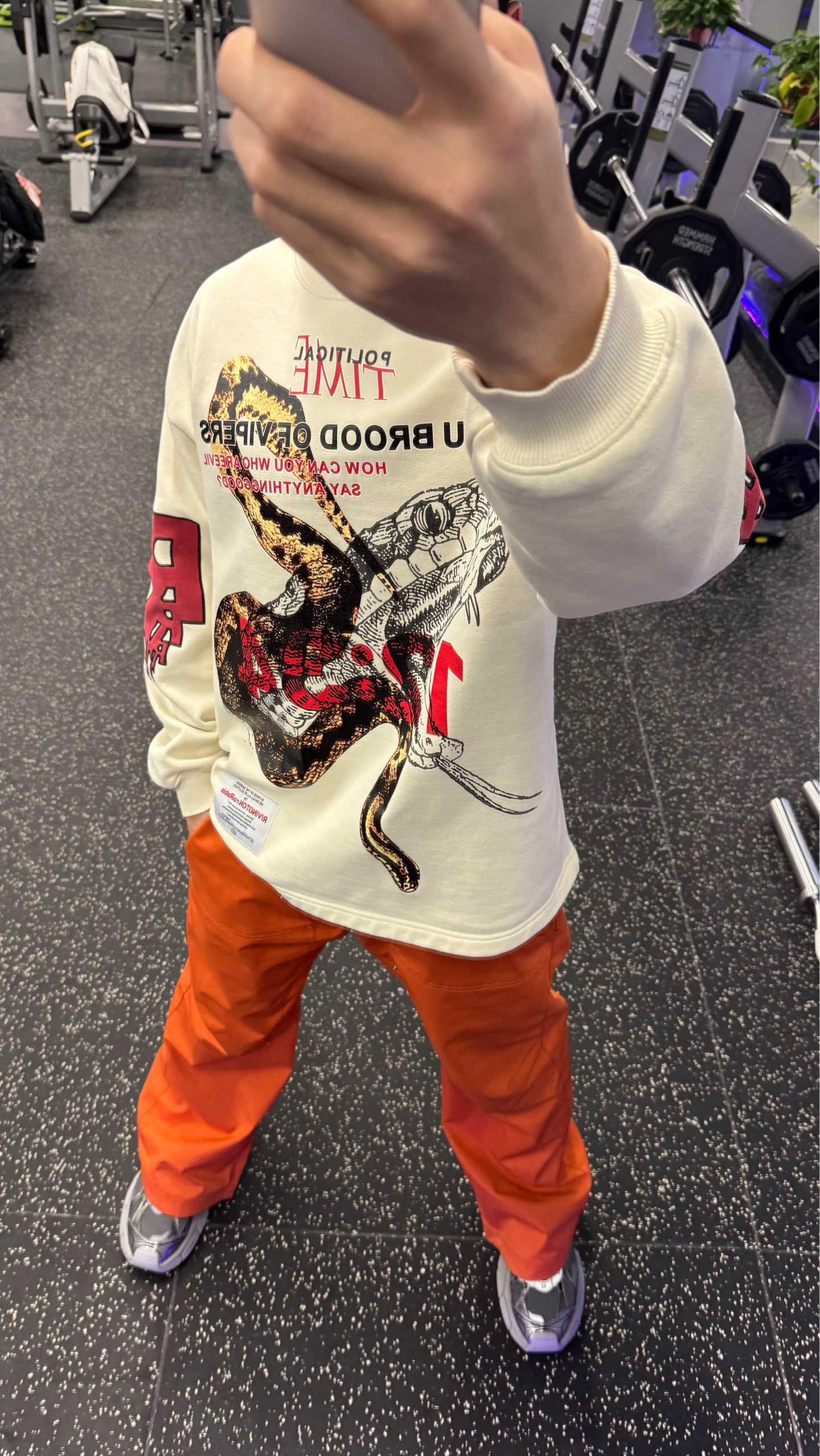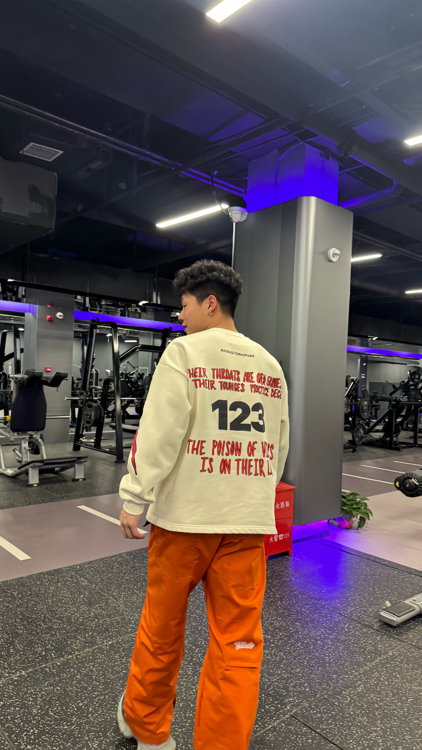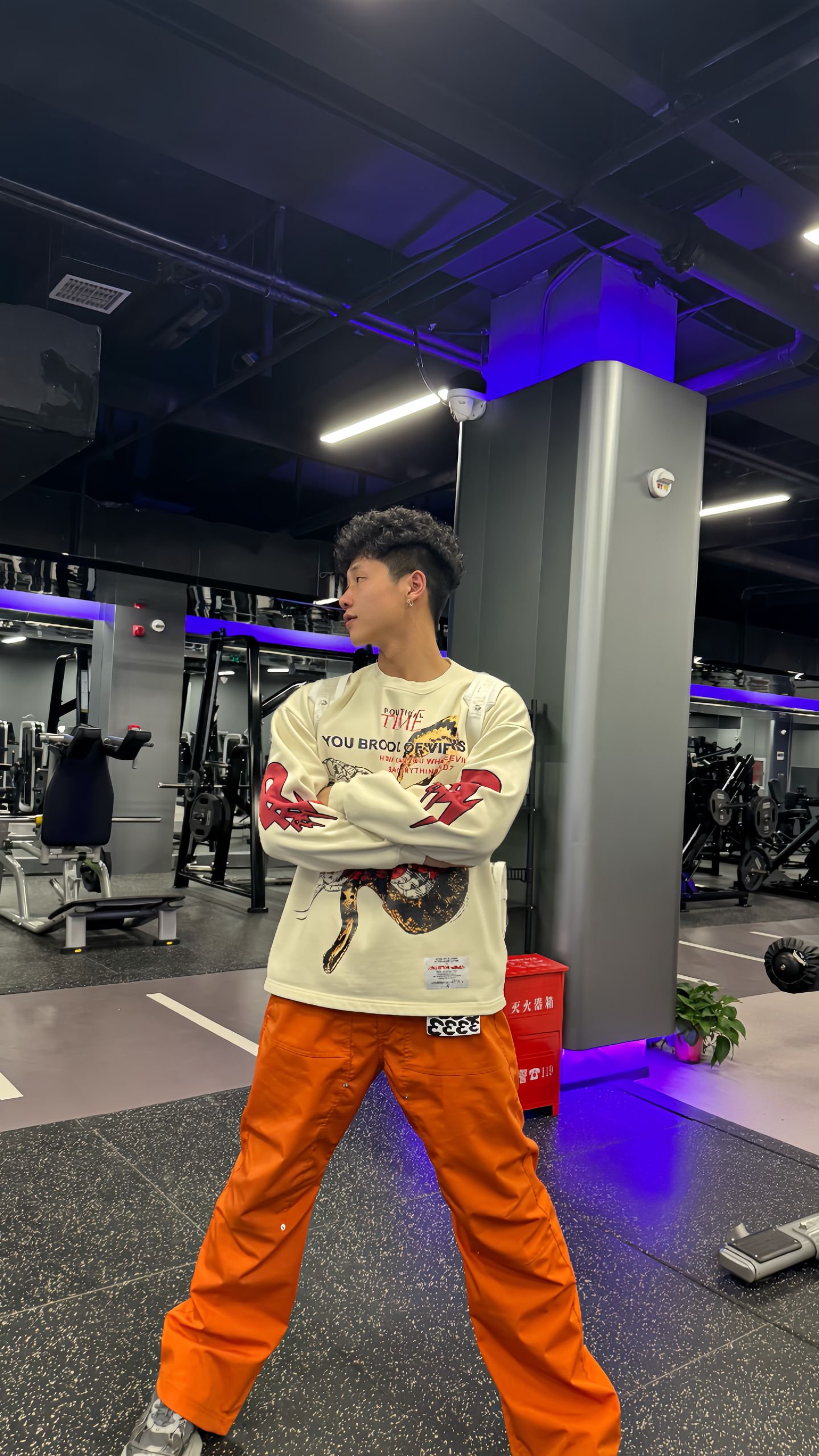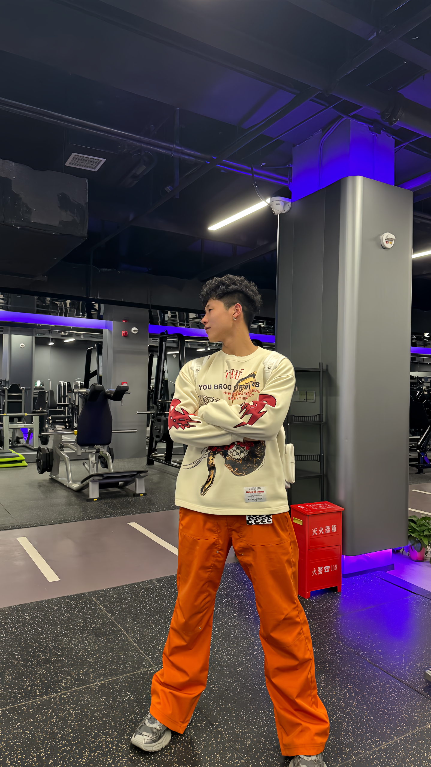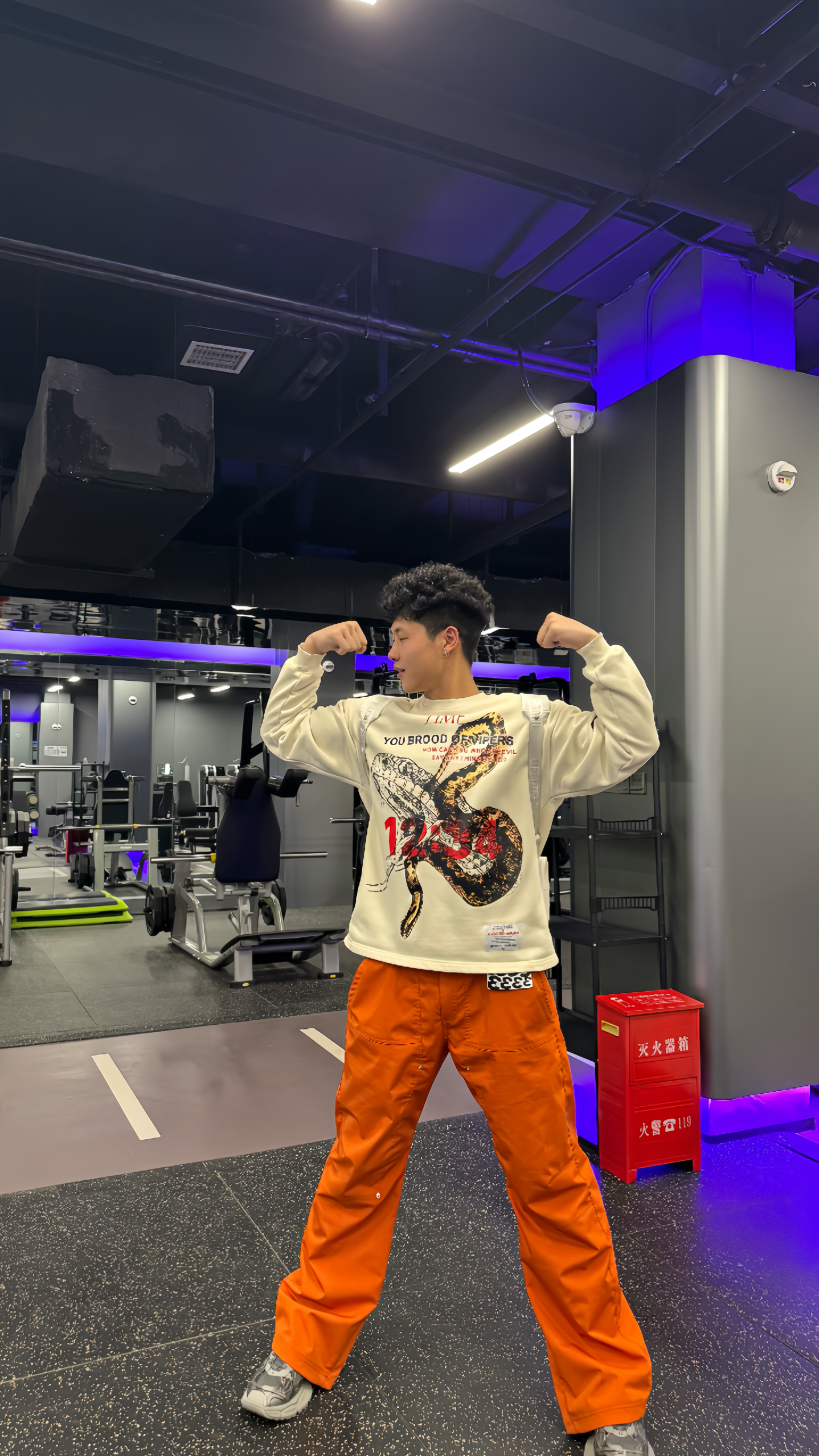 谁懂啊!健身穿搭终于跳出黑白灰,这套直接在健身房被要链接🔗 重磅蛇纹印花卫衣太有态度,复古做旧质感拉满,红黑撞色印花酷到没朋友,背后123字母印花自带潮牌buff,宽松版型藏肉又显瘦,套在健身服外完全不臃肿。 重点夸这条橙色工装裤!高饱和橘色在健身房紫光灯下巨出片,自带焦点属性📸 面料挺括耐磨,深蹲硬拉不卡裆,多口袋设计还能随手放个手机,搭配银灰色老爹鞋,街头感直接拉满。 脱了外套就是练!手...