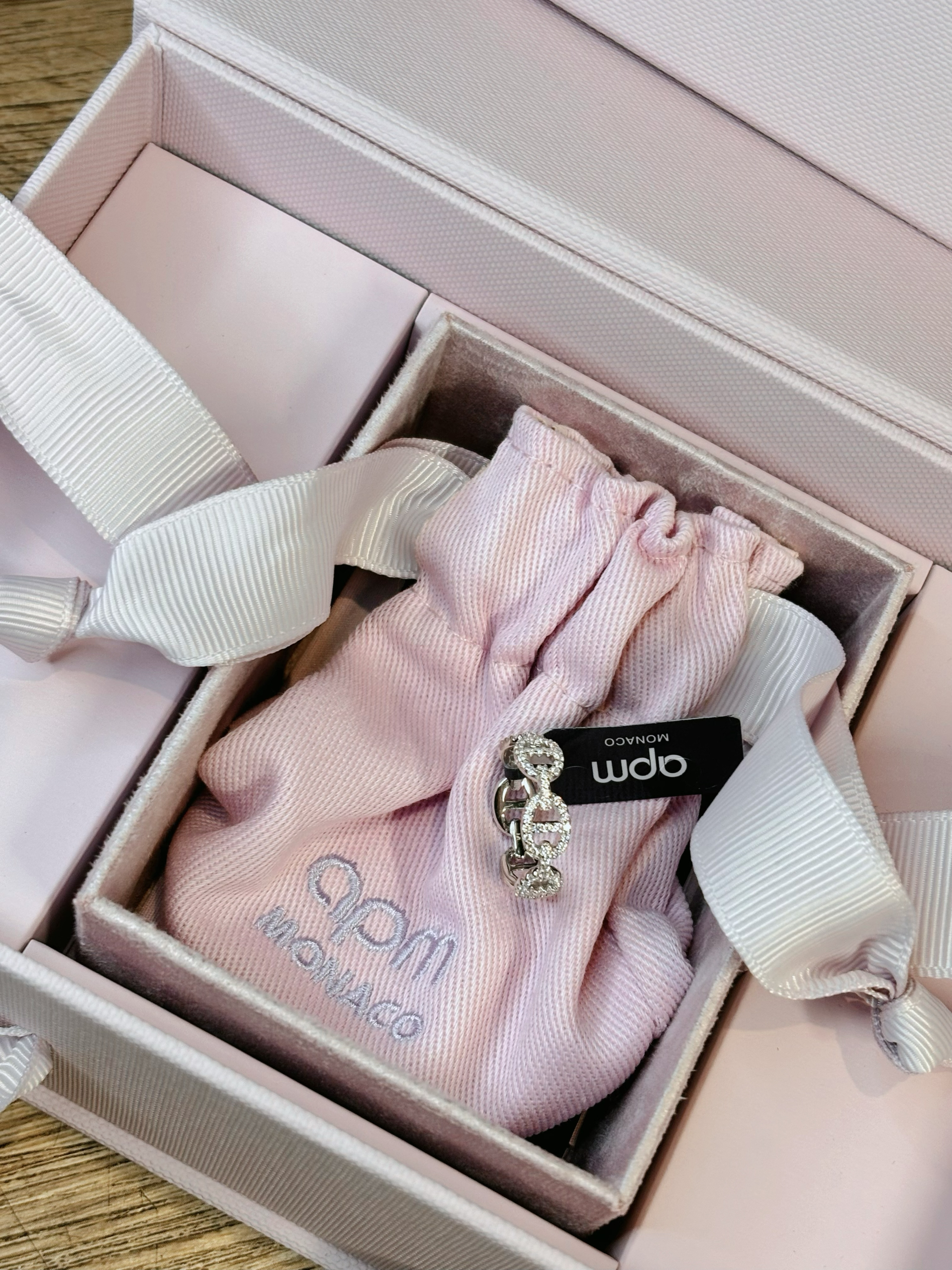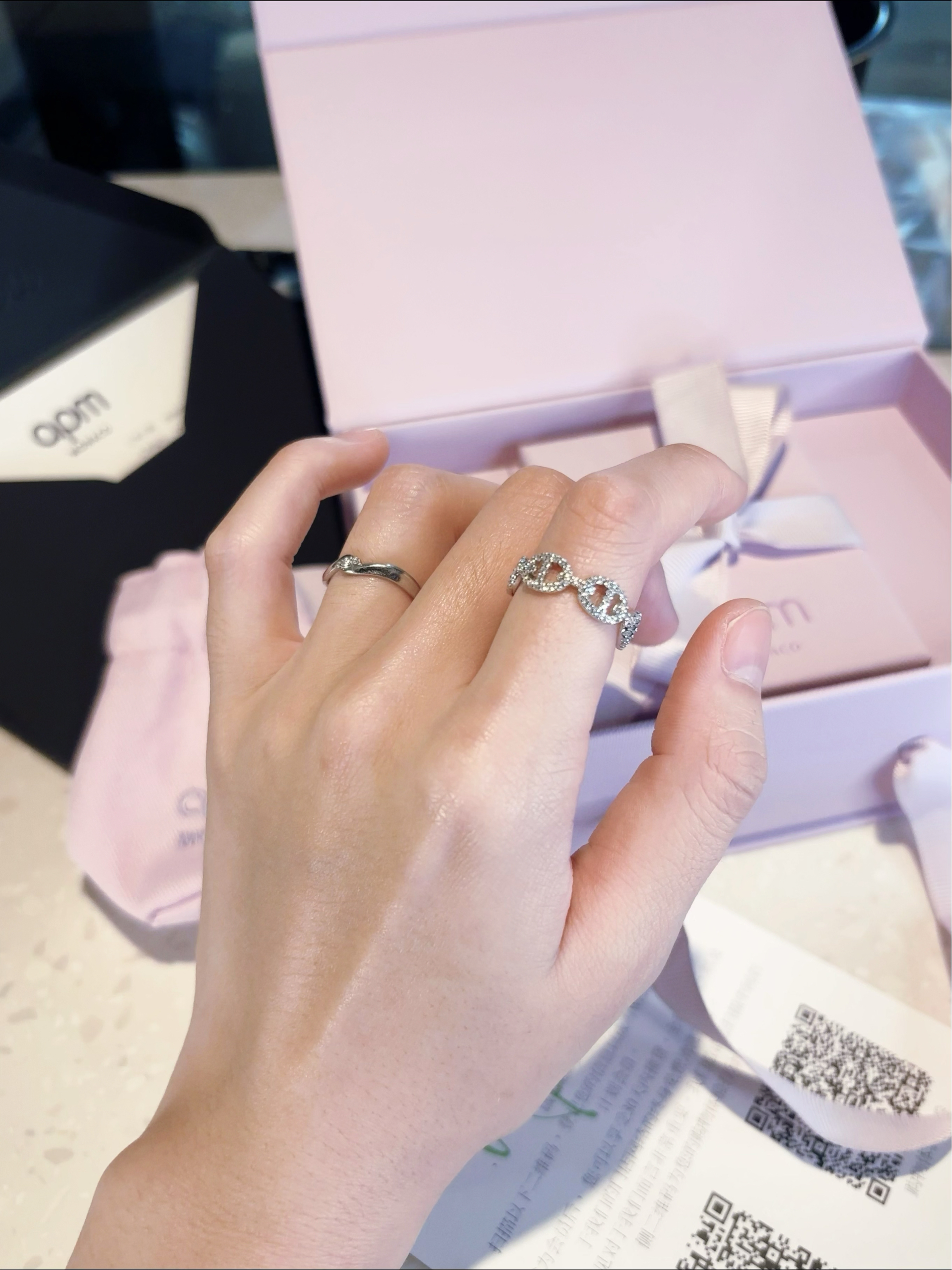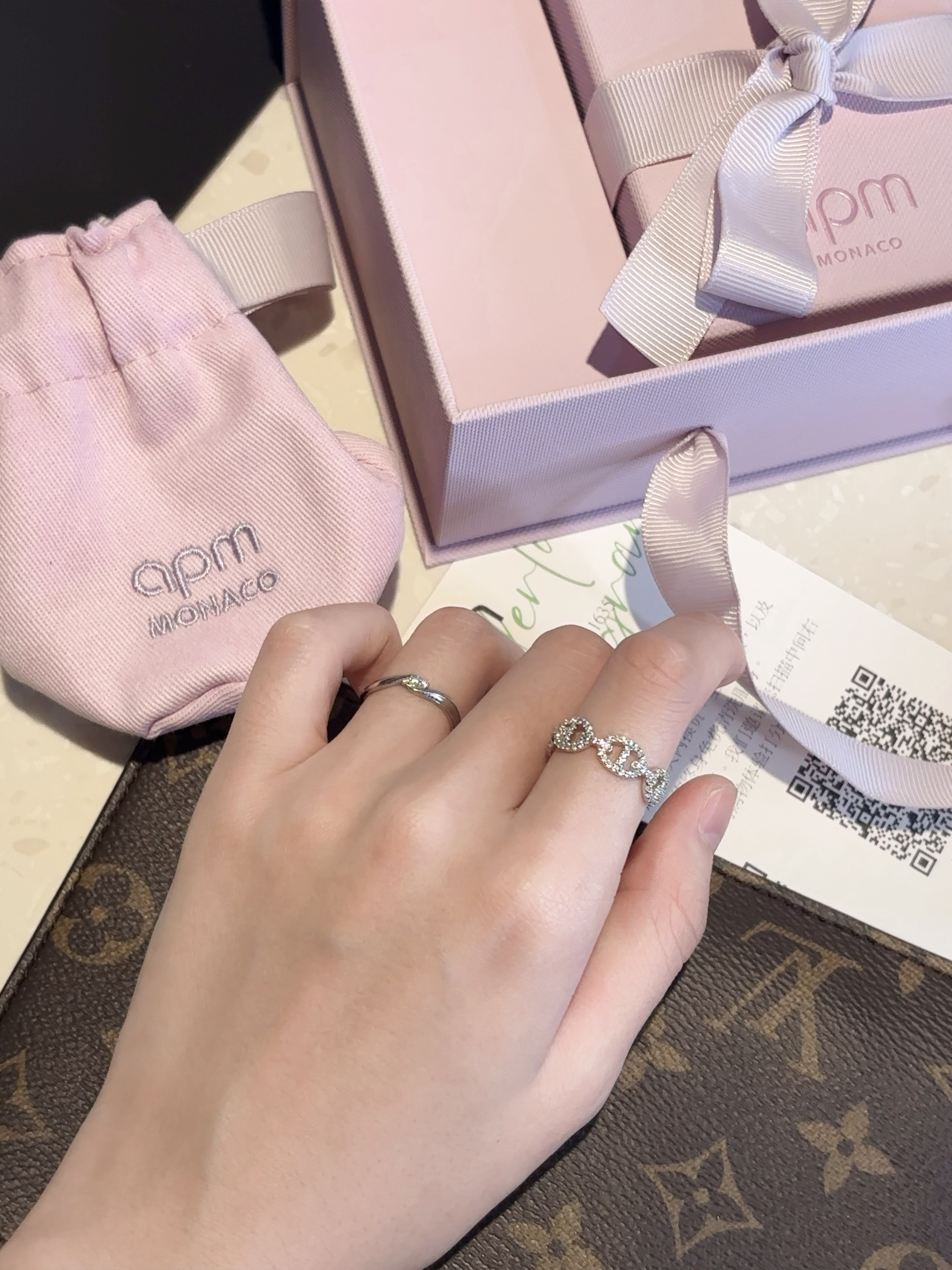 第一次购买apm的产品,不得不感叹apm对于钻石的切割做的实在是太好了,超级闪,火彩很足的一款戒指! 很简约大气。戴在食指我觉得刚刚好~并且银色的戒指就很百搭!叠搭我的婚戒感觉手上好精致哈哈哈,特别贵气! 自己佩戴和送礼都很合适🫶