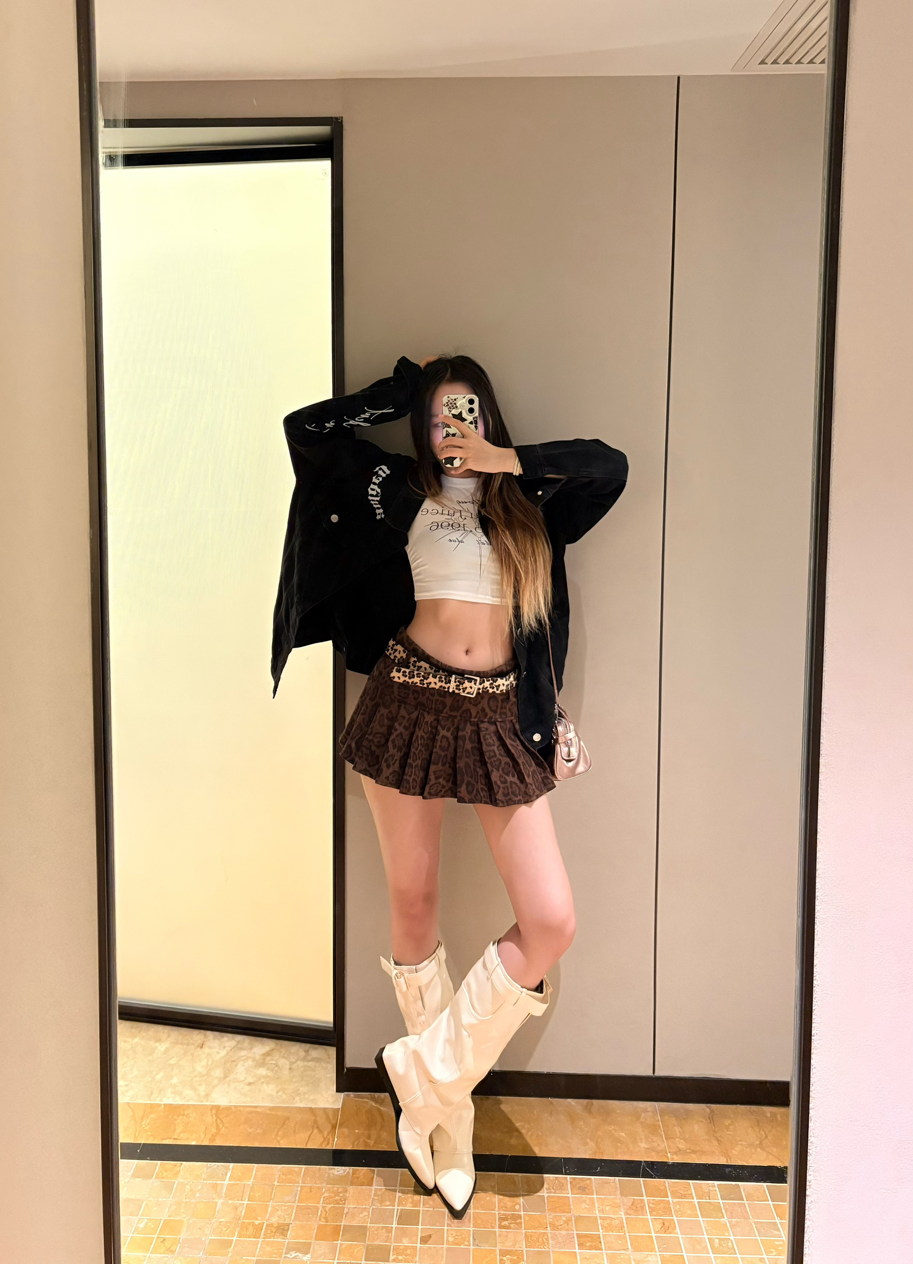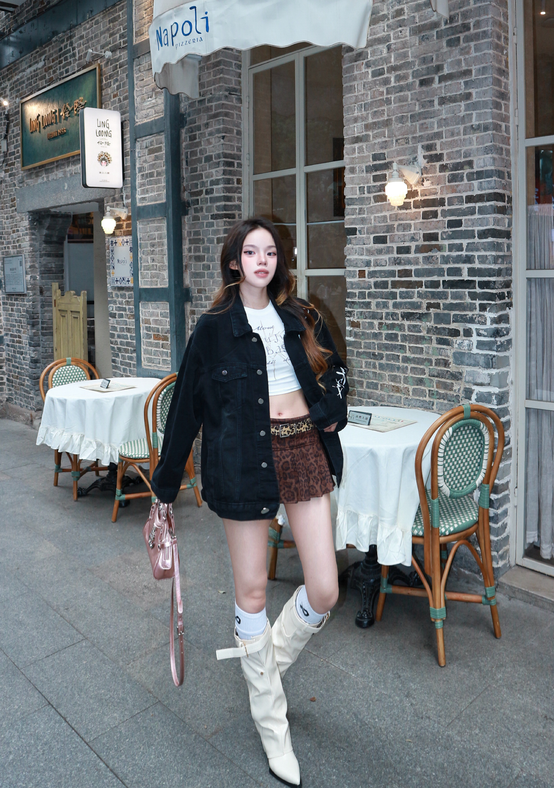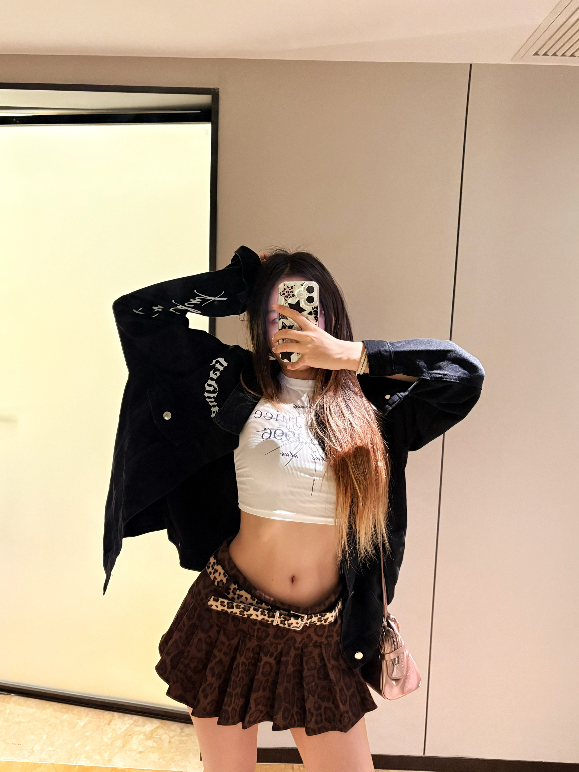 我今天的穿搭思路💡: Oversize牛仔外套 + 豹纹短裙裙 + 短款上衣 宽松牛仔外套自带街头感, 豹纹蛋糕裙增添个性,短款露腰上衣优化比例 利落又有态度,春日辣妹风拿捏 165/96 👕:m