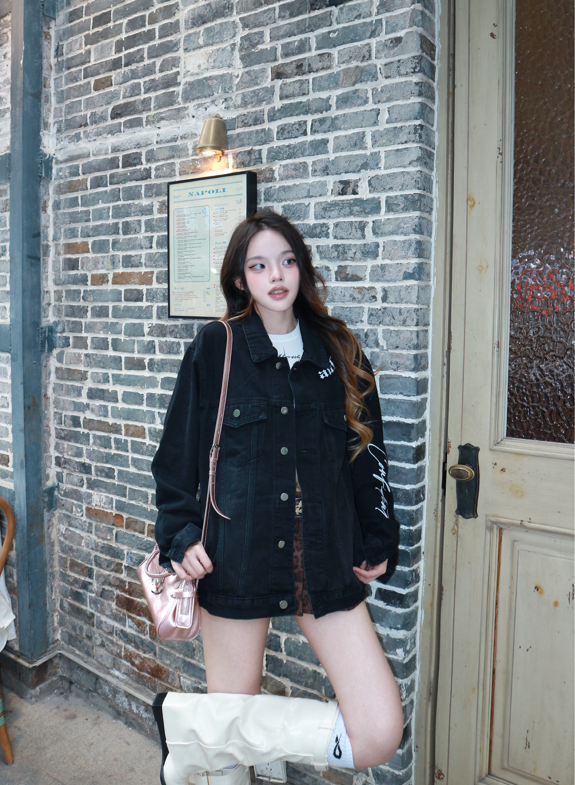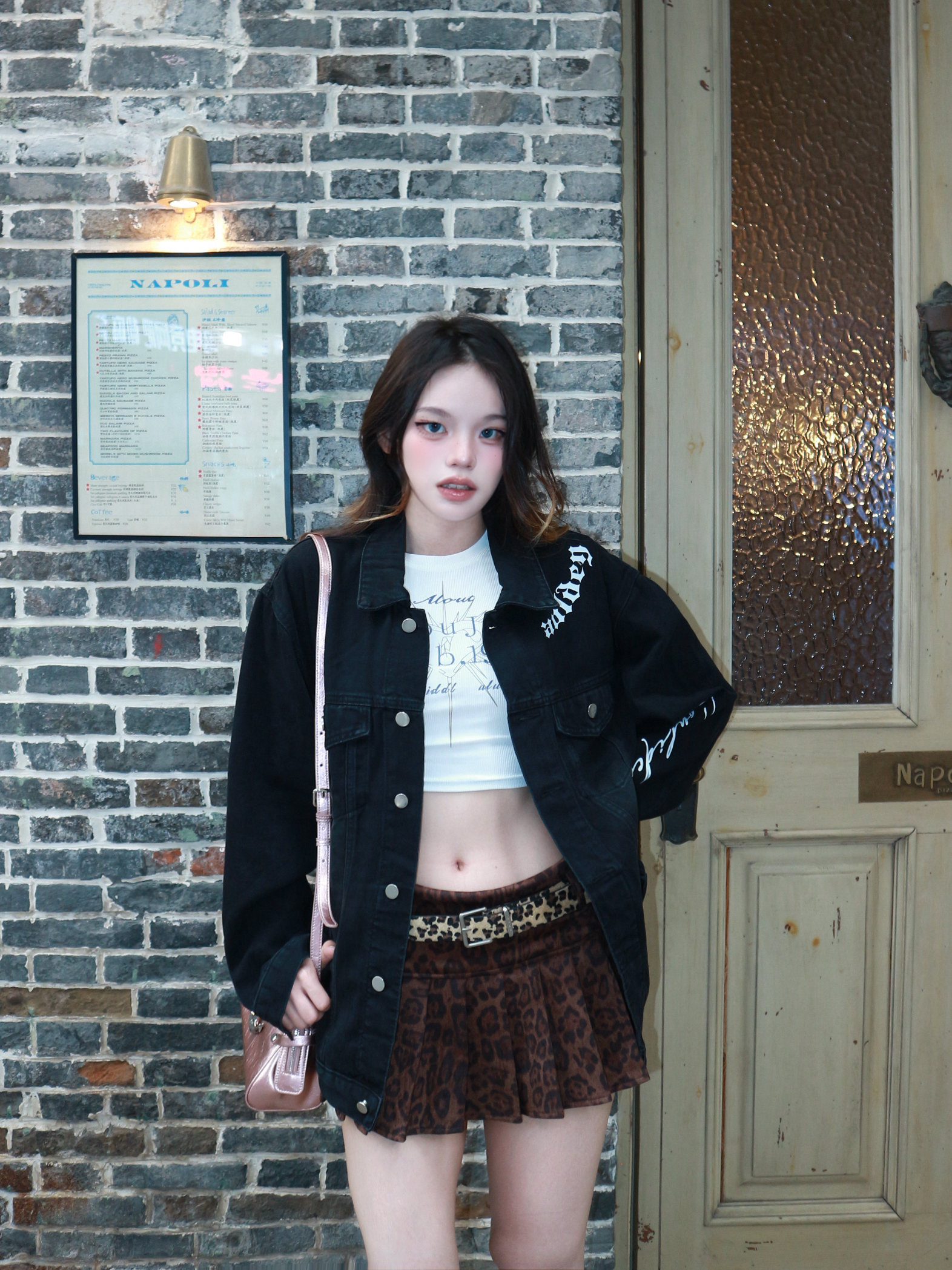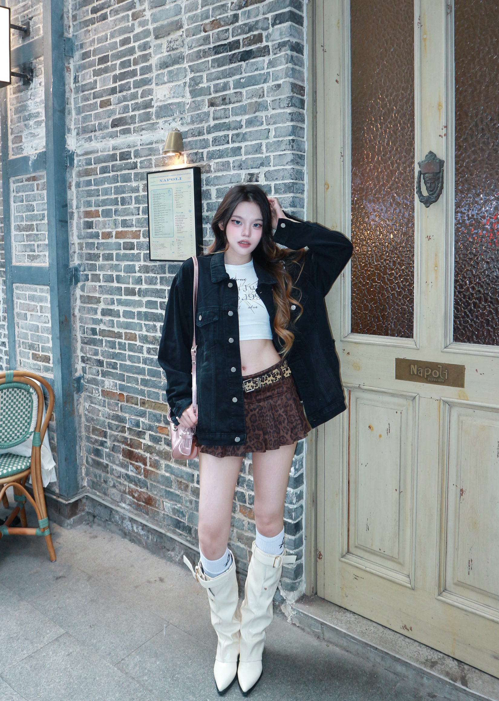 我今天的穿搭思路💡: Oversize牛仔外套 + 豹纹短裙裙 + 短款上衣 宽松牛仔外套自带街头感, 豹纹蛋糕裙增添个性,短款露腰上衣优化比例 利落又有态度,春日辣妹风拿捏 165/96 👕:m