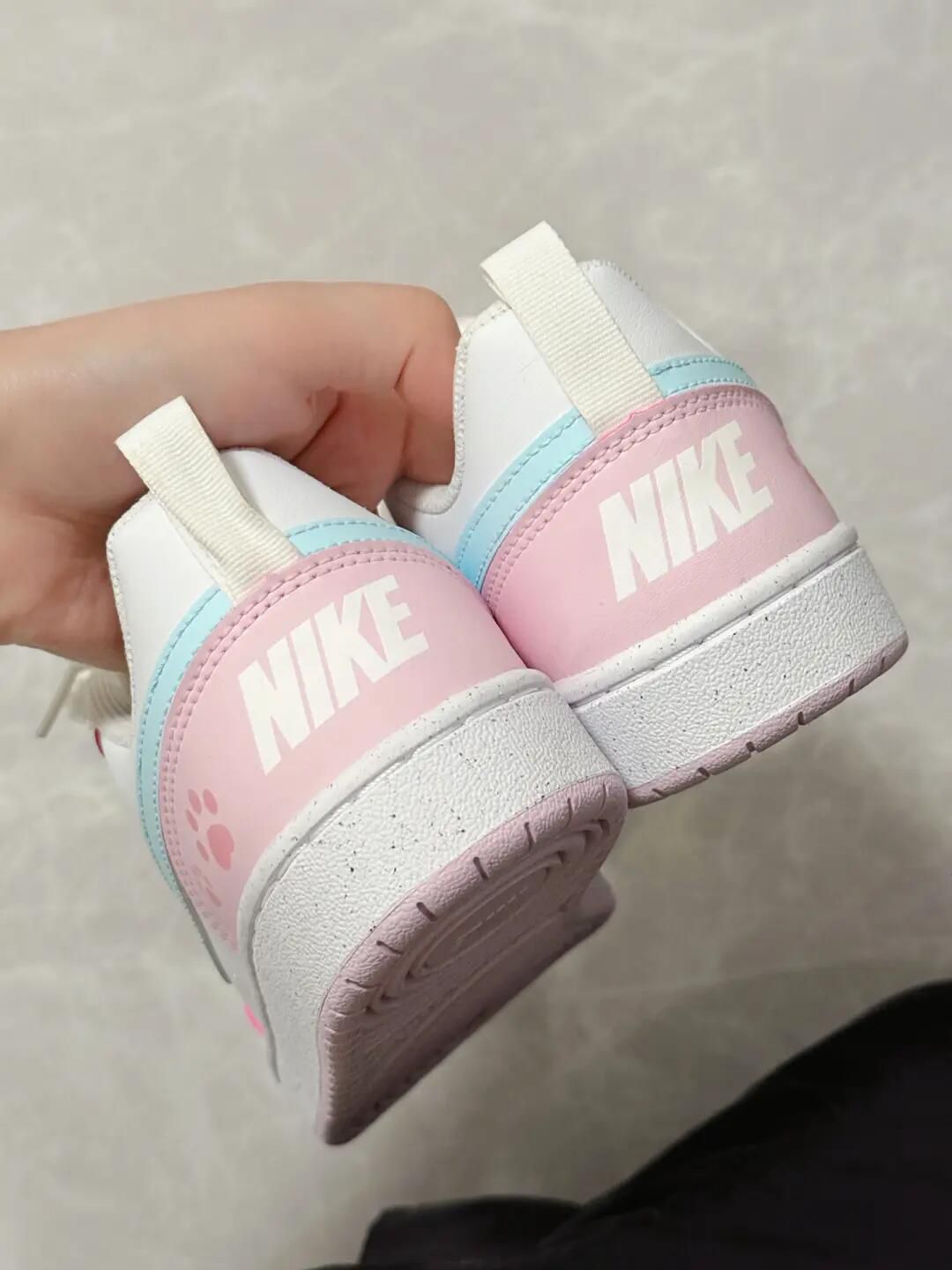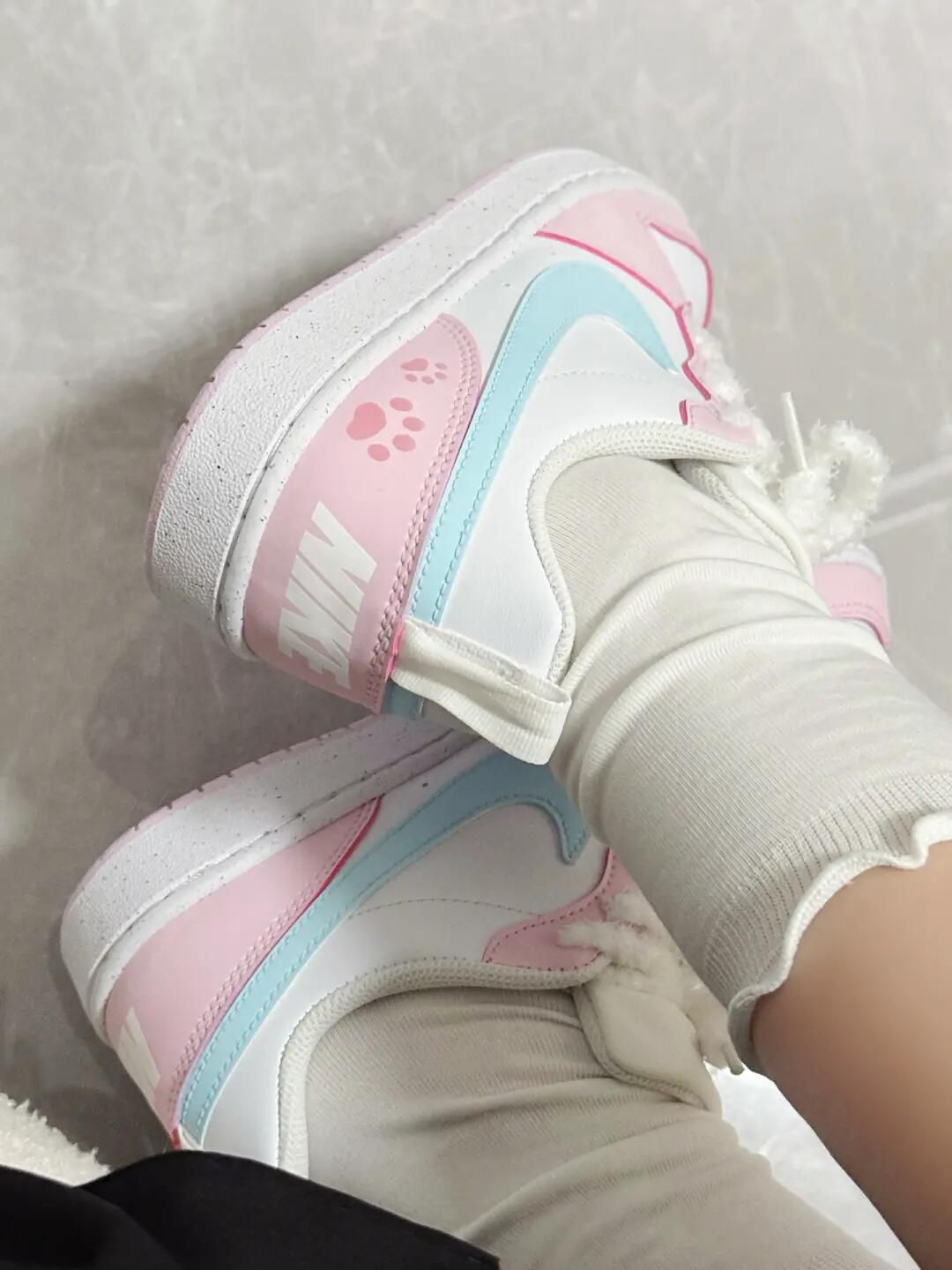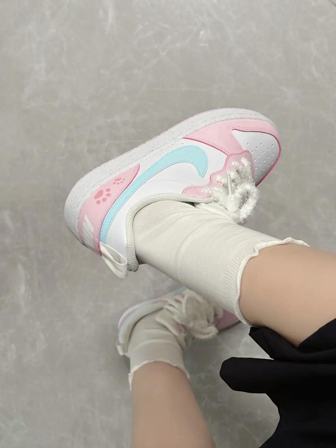 Nike你是懂少女心的!这双Court Borough直接戳中我的心巴💘 粉白蓝的配色也太清甜了吧,像把海盐樱花奶冻穿在脚上~ 鞋侧的小奶爪印花萌到犯规,配上粗粗的云朵鞋带,氛围感直接拉满!☁️ 重点是版型真的巨显腿细! 厚底设计悄悄增高,搭配堆堆袜和黑裙子,甜酷感拿捏得死死的。 暴走一天也不磨脚,颜值与舒适度双在线! 今年春天的第一双神仙板鞋,甜妹们闭眼冲就完事了!