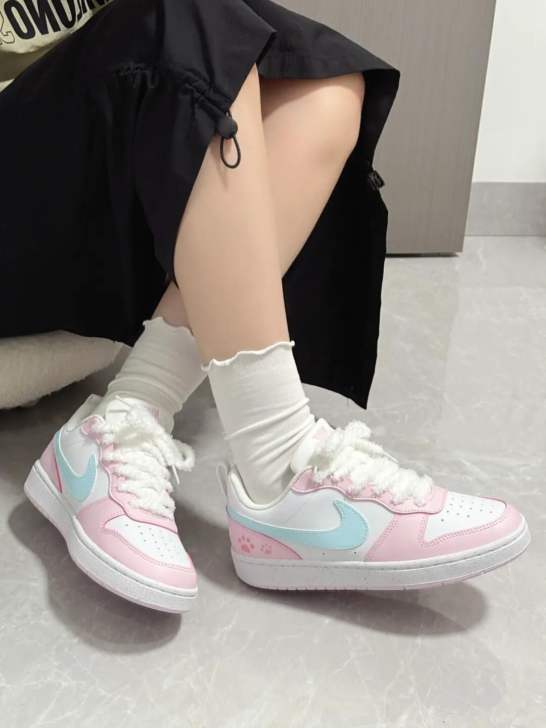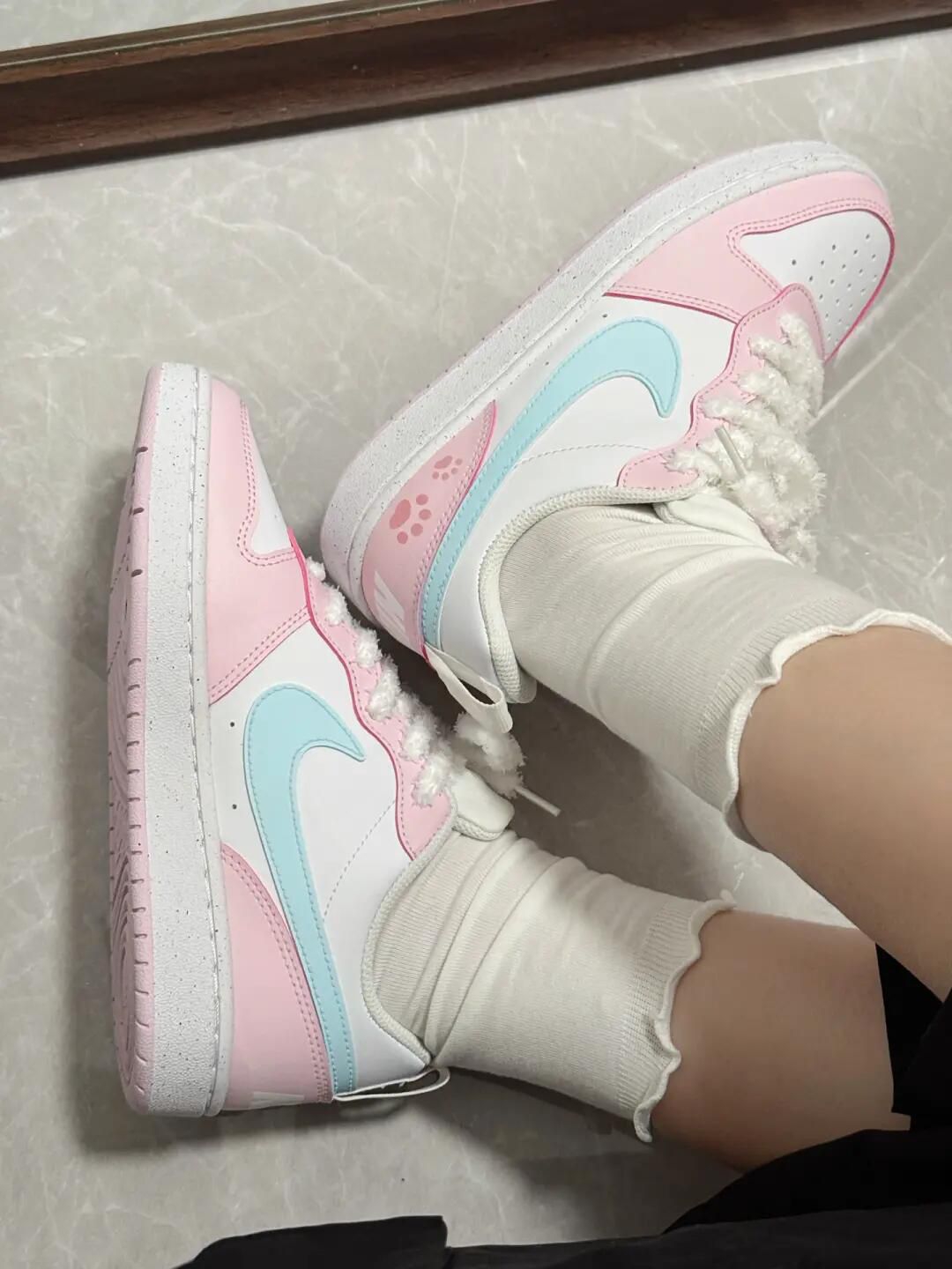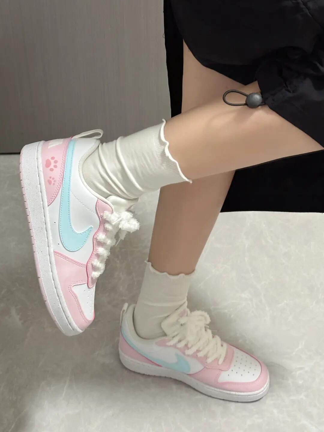Nike你是懂少女心的!这双Court Borough直接戳中我的心巴💘 粉白蓝的配色也太清甜了吧,像把海盐樱花奶冻穿在脚上~ 鞋侧的小奶爪印花萌到犯规,配上粗粗的云朵鞋带,氛围感直接拉满!☁️ 重点是版型真的巨显腿细! 厚底设计悄悄增高,搭配堆堆袜和黑裙子,甜酷感拿捏得死死的。 暴走一天也不磨脚,颜值与舒适度双在线! 今年春天的第一双神仙板鞋,甜妹们闭眼冲就完事了!
