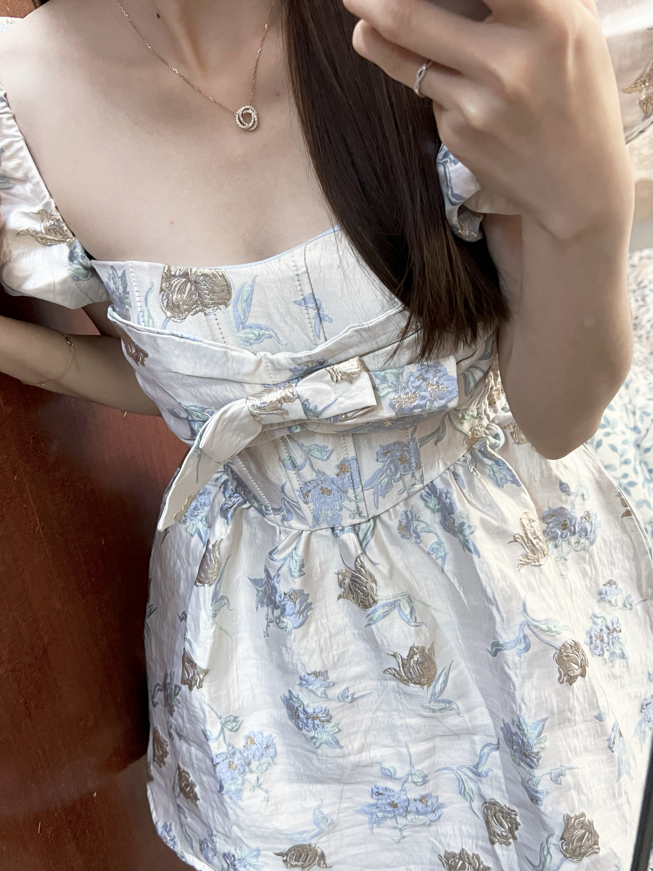 方领+泡泡袖设计,完美修饰肩颈线条,秒变直角肩✨ 腰部蝴蝶结+鱼骨收腰,把腰线掐得刚刚好,小个子也能穿出大长腿~
