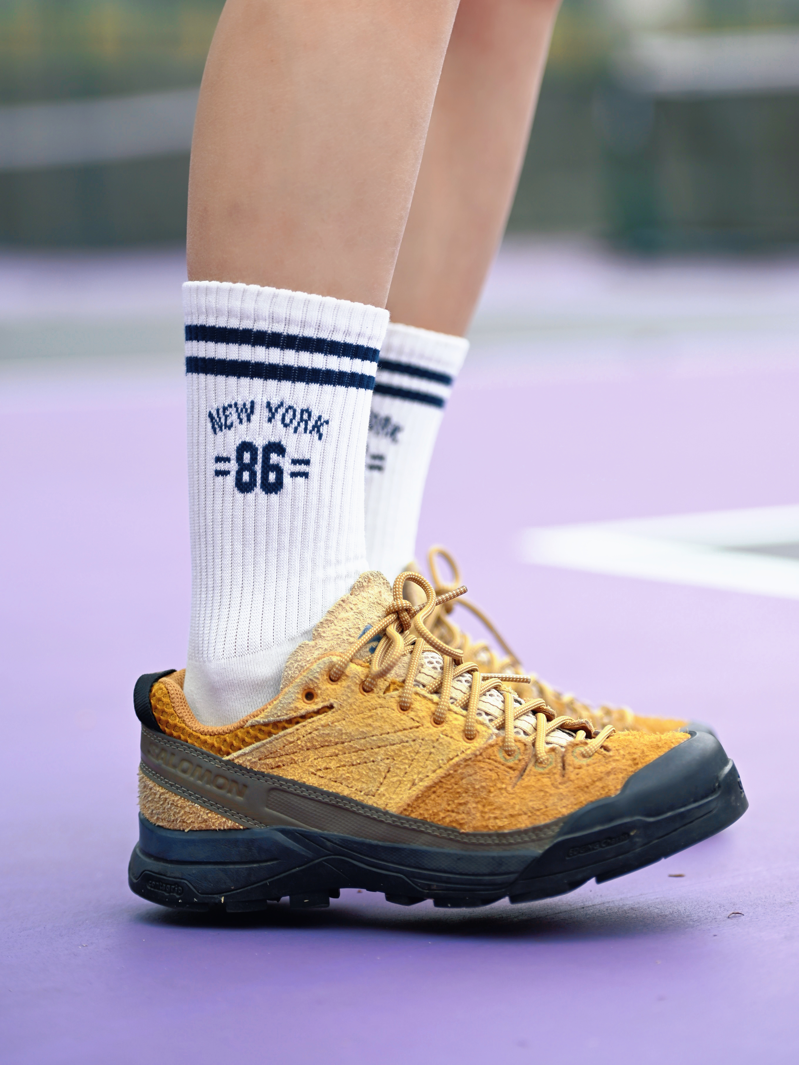 172CM|55KG 👔:m👖:m|👟:39码 春夏街头,穿上俺的有棵树中筒袜解锁美式复古松弛感~ 白色袜身印着复古数字 深蓝双杠点缀 久穿不勒不掉跟 搭配做旧棕黄徒步鞋 下身宽松格纹阔腿裤随动作堆叠出层次 上身扎染长袖叠穿黑外套 慵懒不费力的复古街头穿搭来咯~